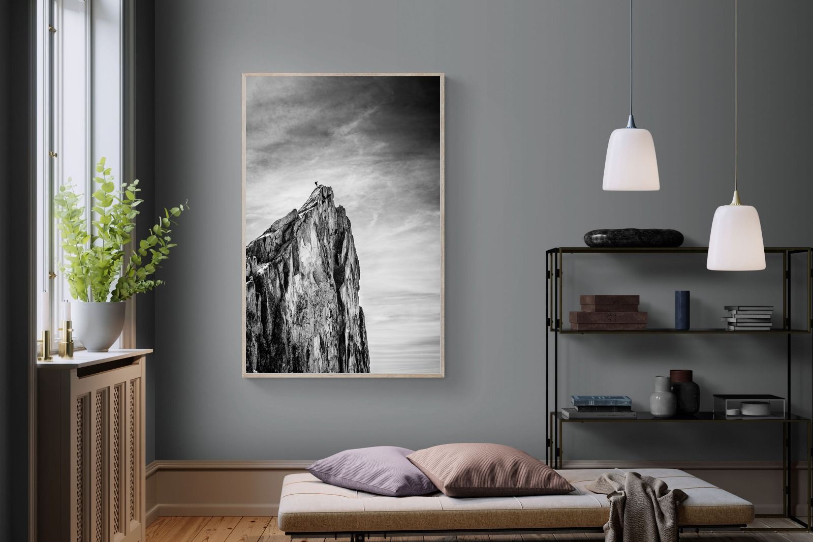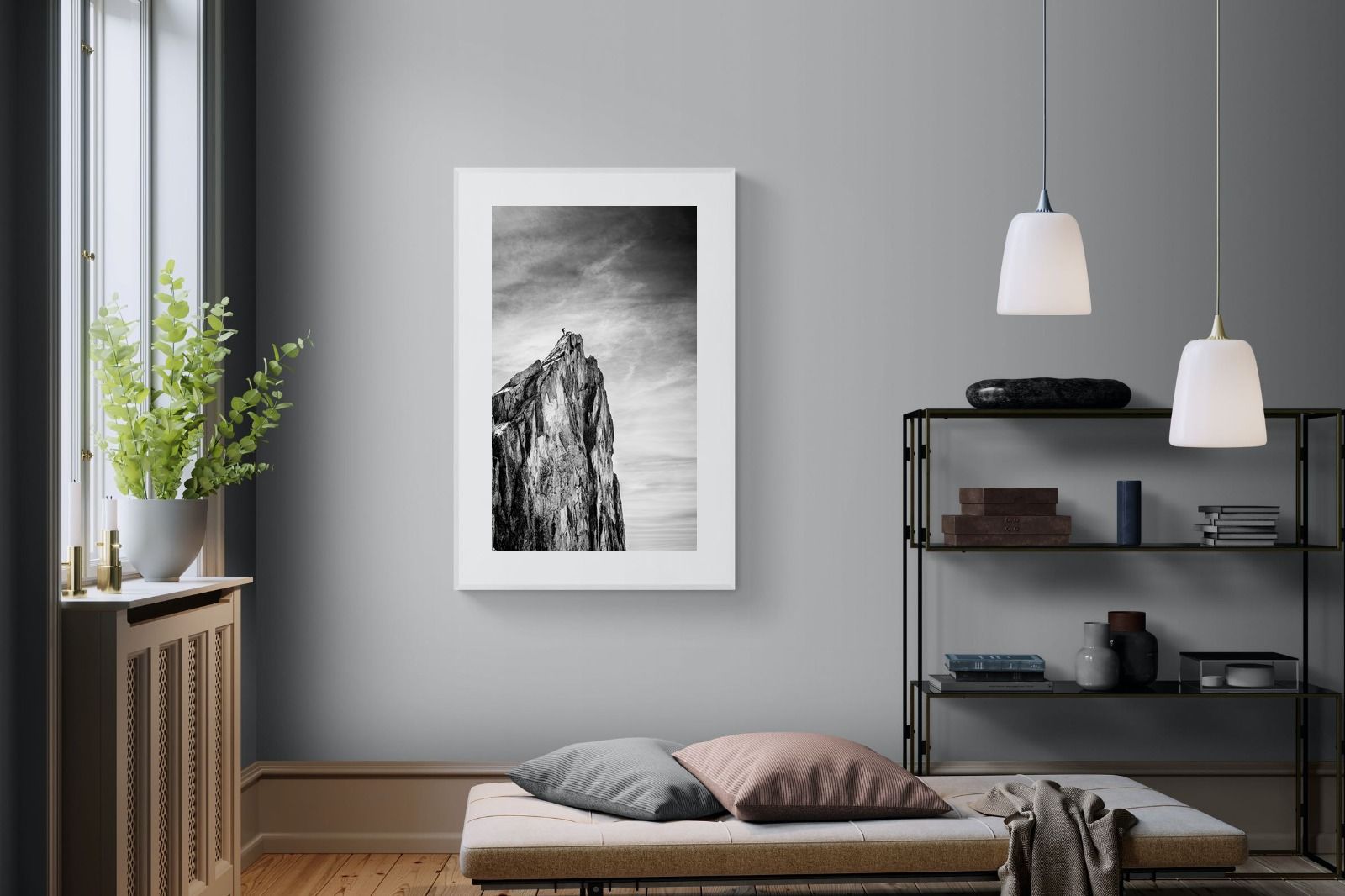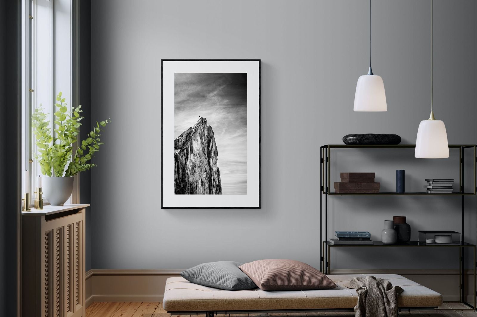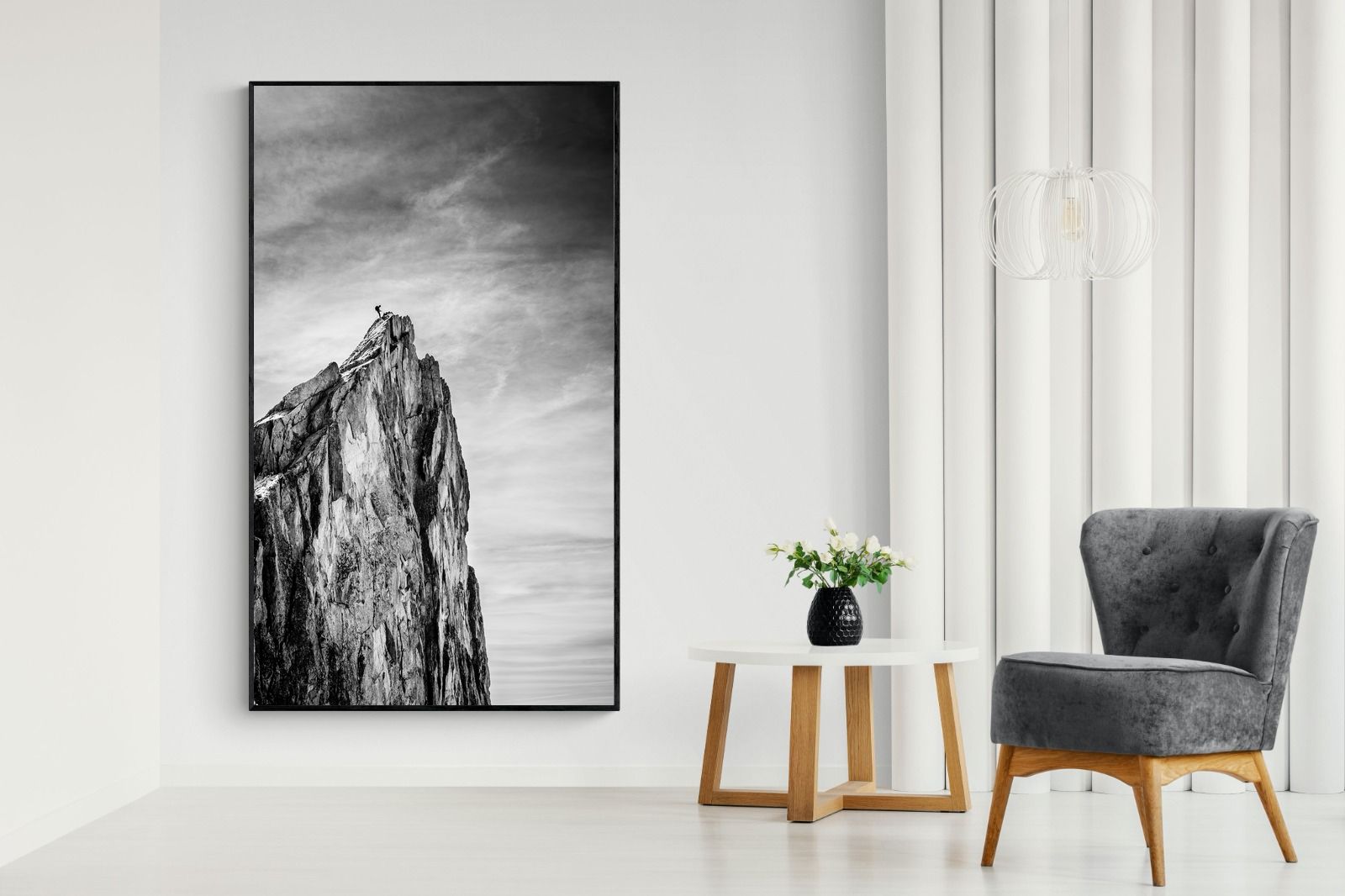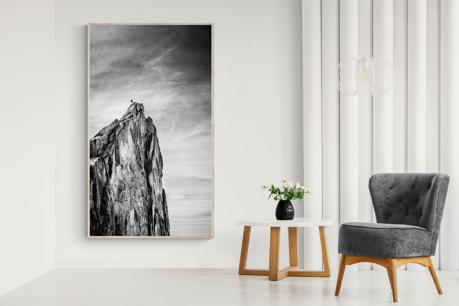 This dramatic black and white landscape captures a lone climber reaching the peak of a rugged mountain, emphasising scale, contrast, and achievement. The expansive sky and textured rock face create a powerful, minimalist composition. Ideal for contemporary interiors, offices, or statement walls, it brings a sense of ambition, adventure, and quiet strength to spaces that value bold, inspiring imagery.