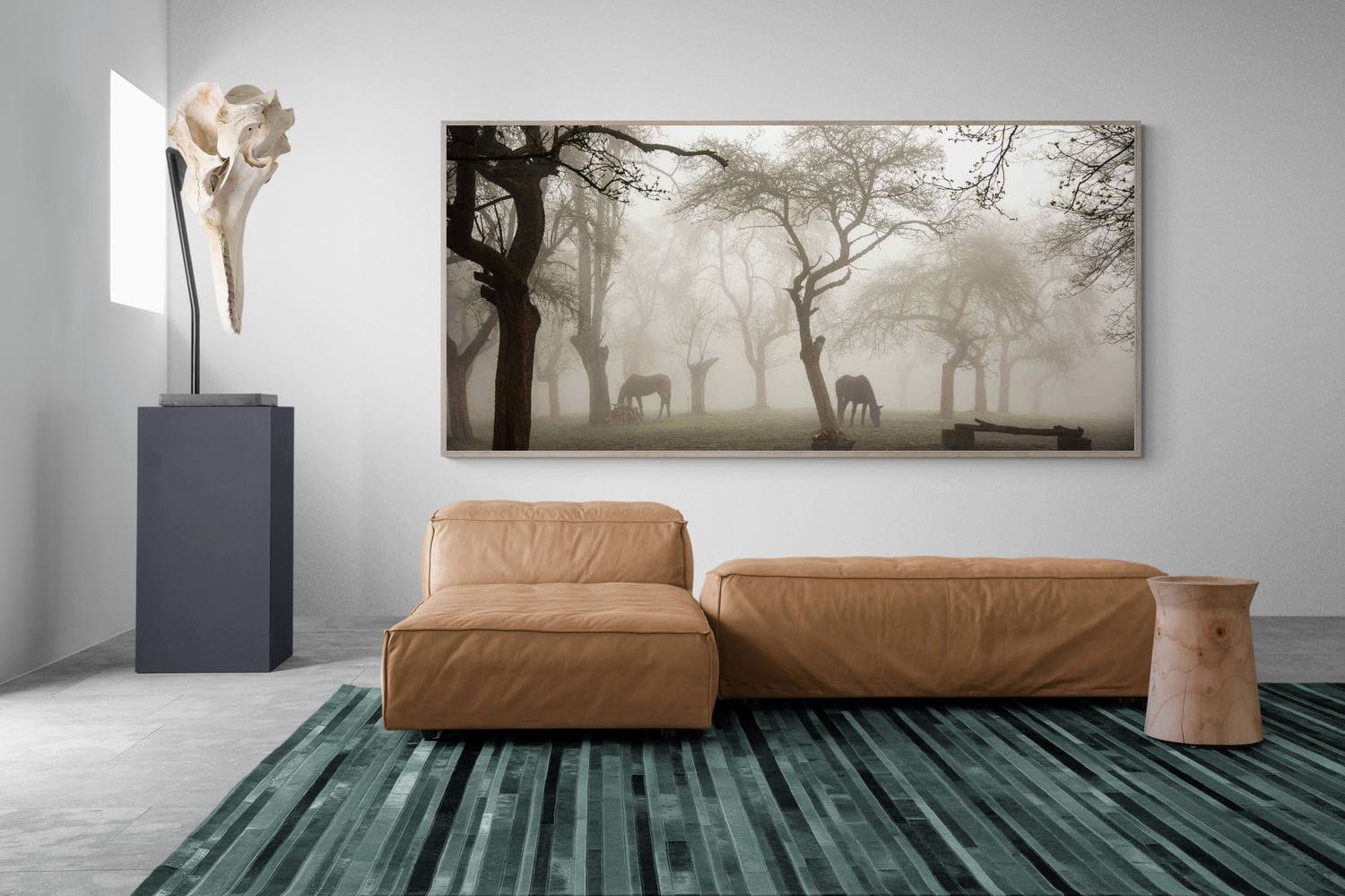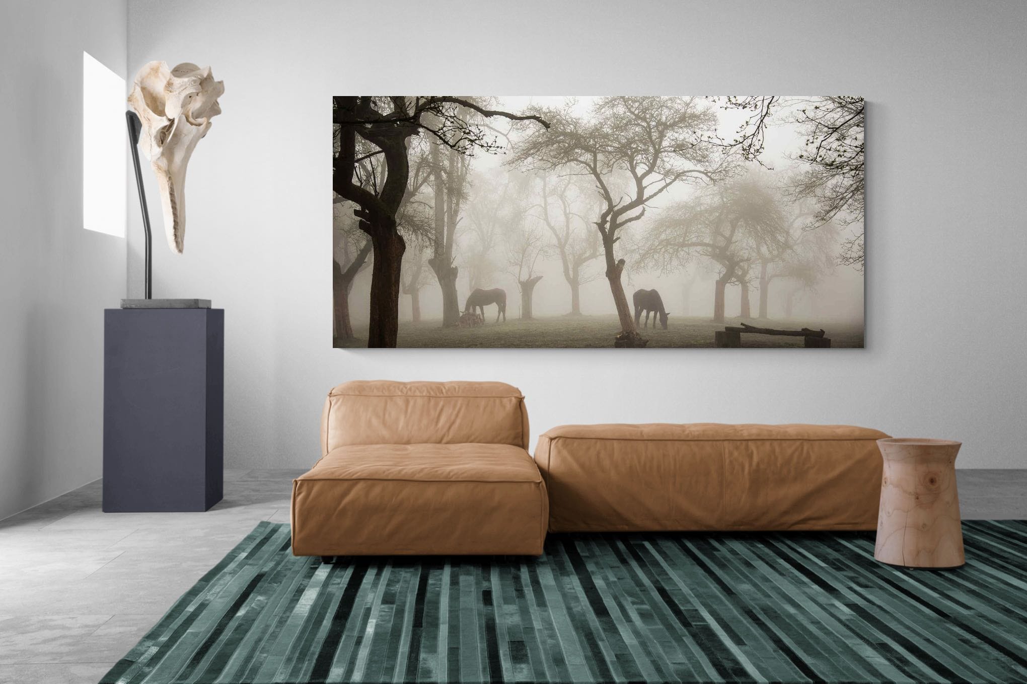 Soft morning fog drifts through a quiet woodland where horses graze beneath bare winter branches. The muted light and gentle haze create a peaceful, almost dreamlike atmosphere, while the silhouettes of the trees add depth and structure to the scene. Subtle earthy tones and natural textures give the photograph a timeless rural character. This atmospheric image works beautifully as calming wall art, perfect for bedrooms, country homes, or interiors inspired by nature and quiet landscapes.