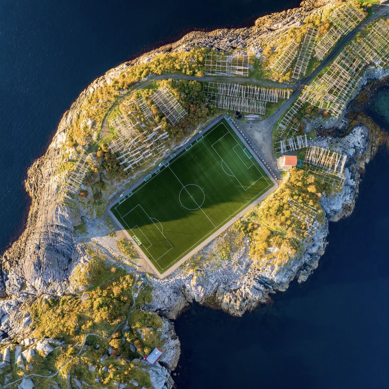 A striking aerial view reveals a football pitch carved into a rugged coastal island, surrounded by deep blue water and textured rock formations. The geometry of the pitch contrasts beautifully with the organic coastline, creating a visually compelling composition. Ideal for contemporary spaces, offices, or sports enthusiasts, it offers a unique perspective that blends sport, nature, and design in a bold, memorable way.
