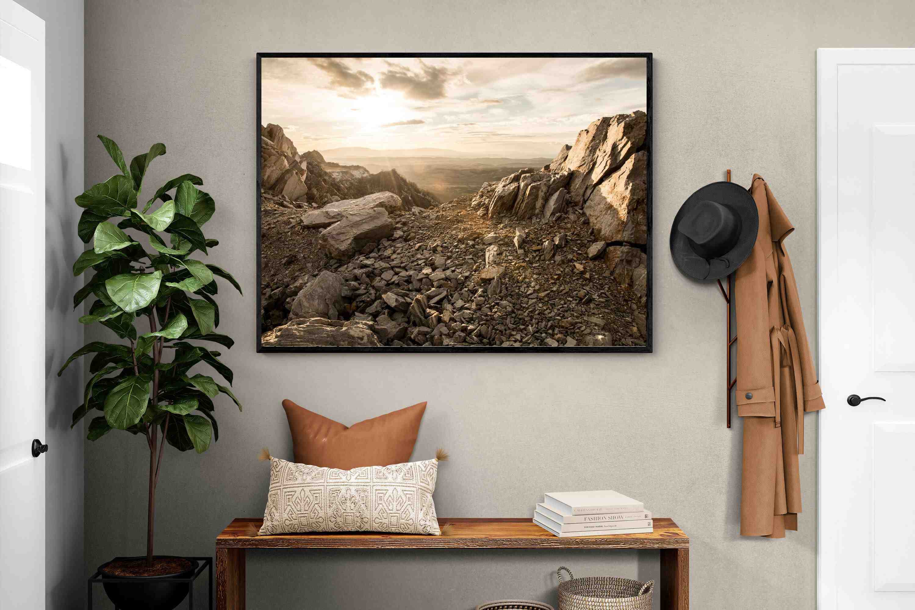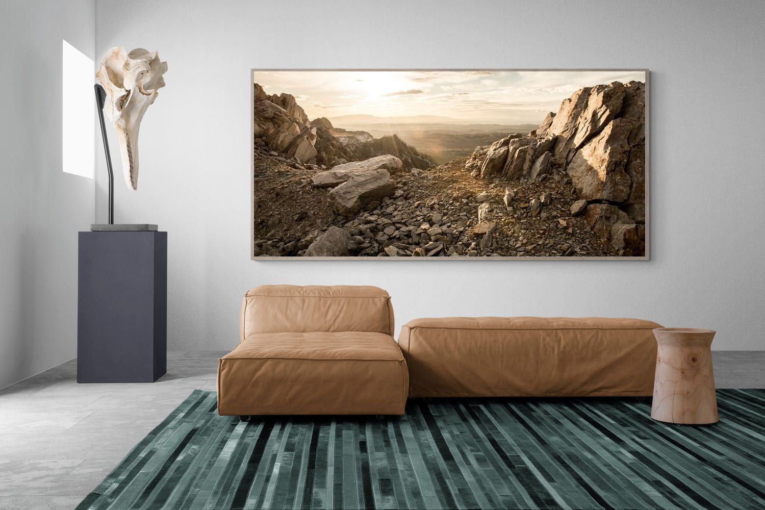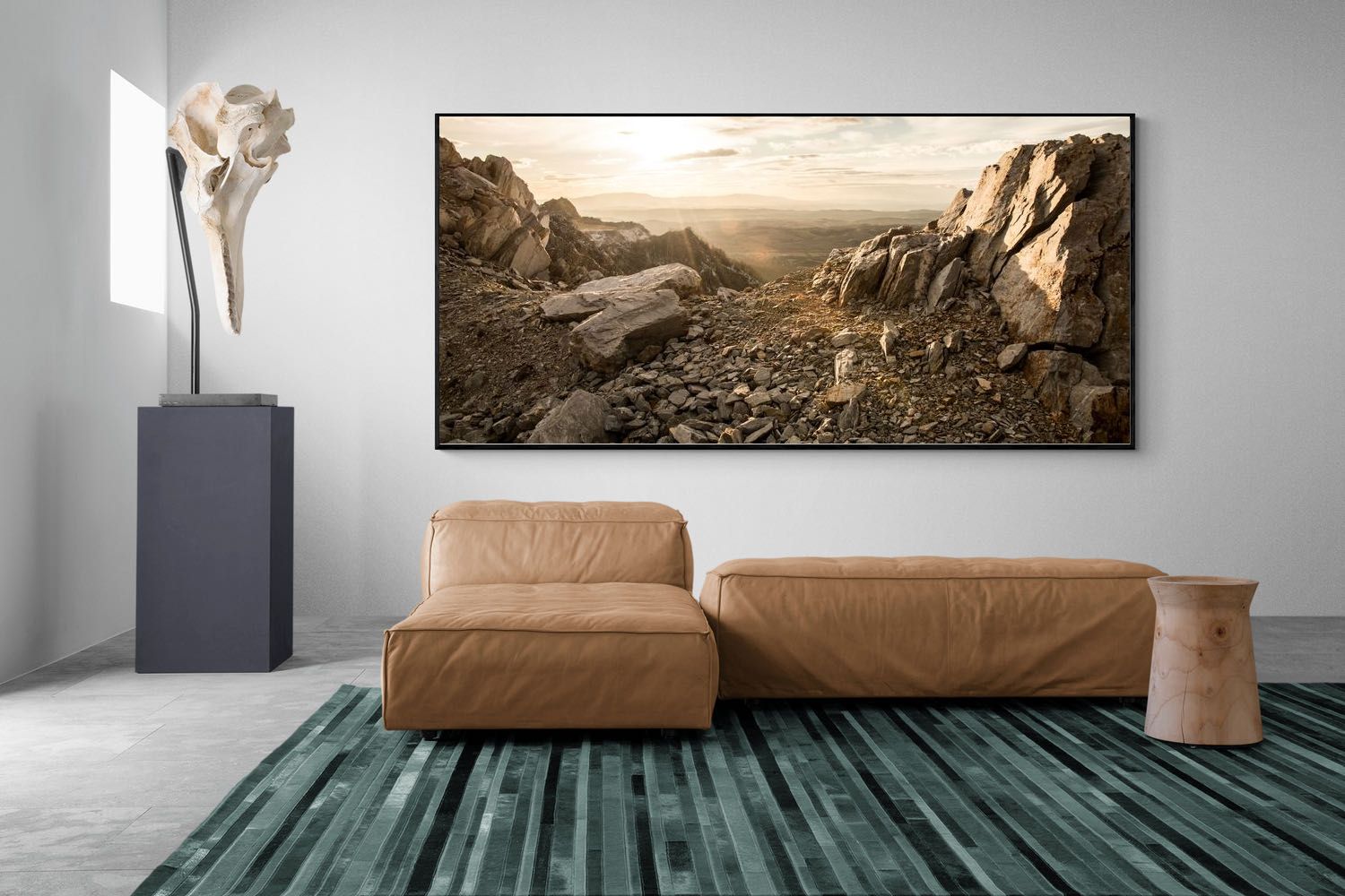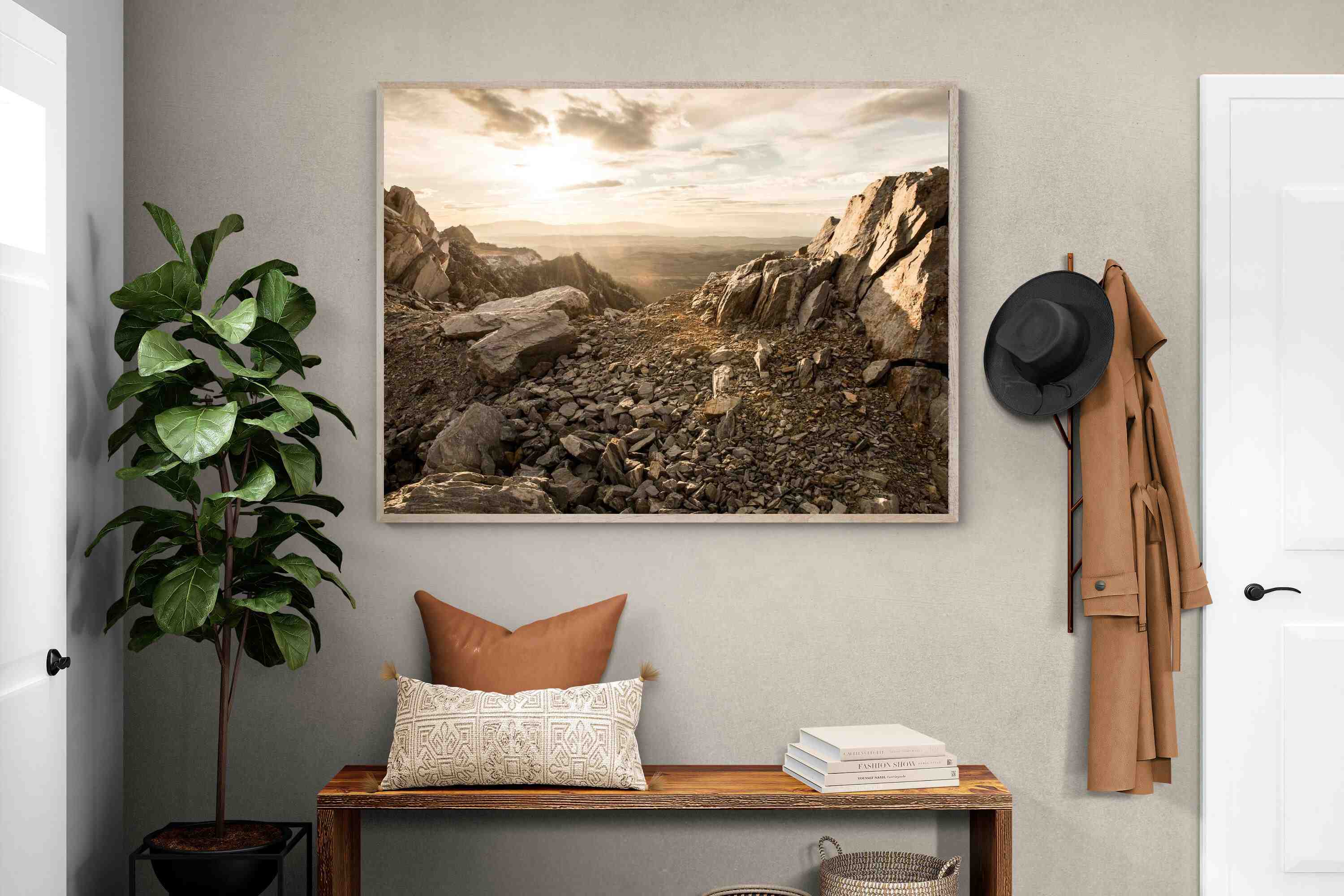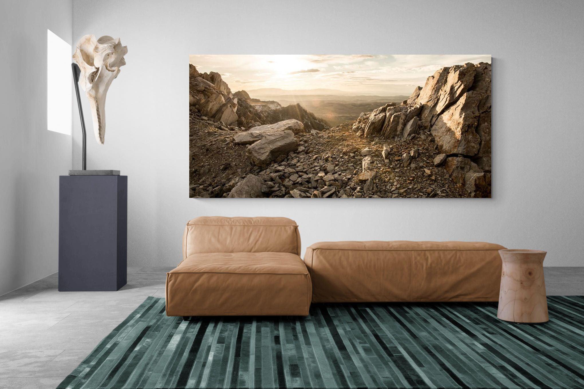 Warm and expansive, this mountain landscape captures golden light breaking over rugged terrain, creating a sense of depth and quiet grandeur. The earthy tones and dramatic textures make it ideal for rustic, contemporary or nature-inspired interiors. Perfect for living rooms, offices or large statement walls, it brings a calming, grounded presence to a space. This piece works beautifully with natural materials, enhancing warmth and visual scale.