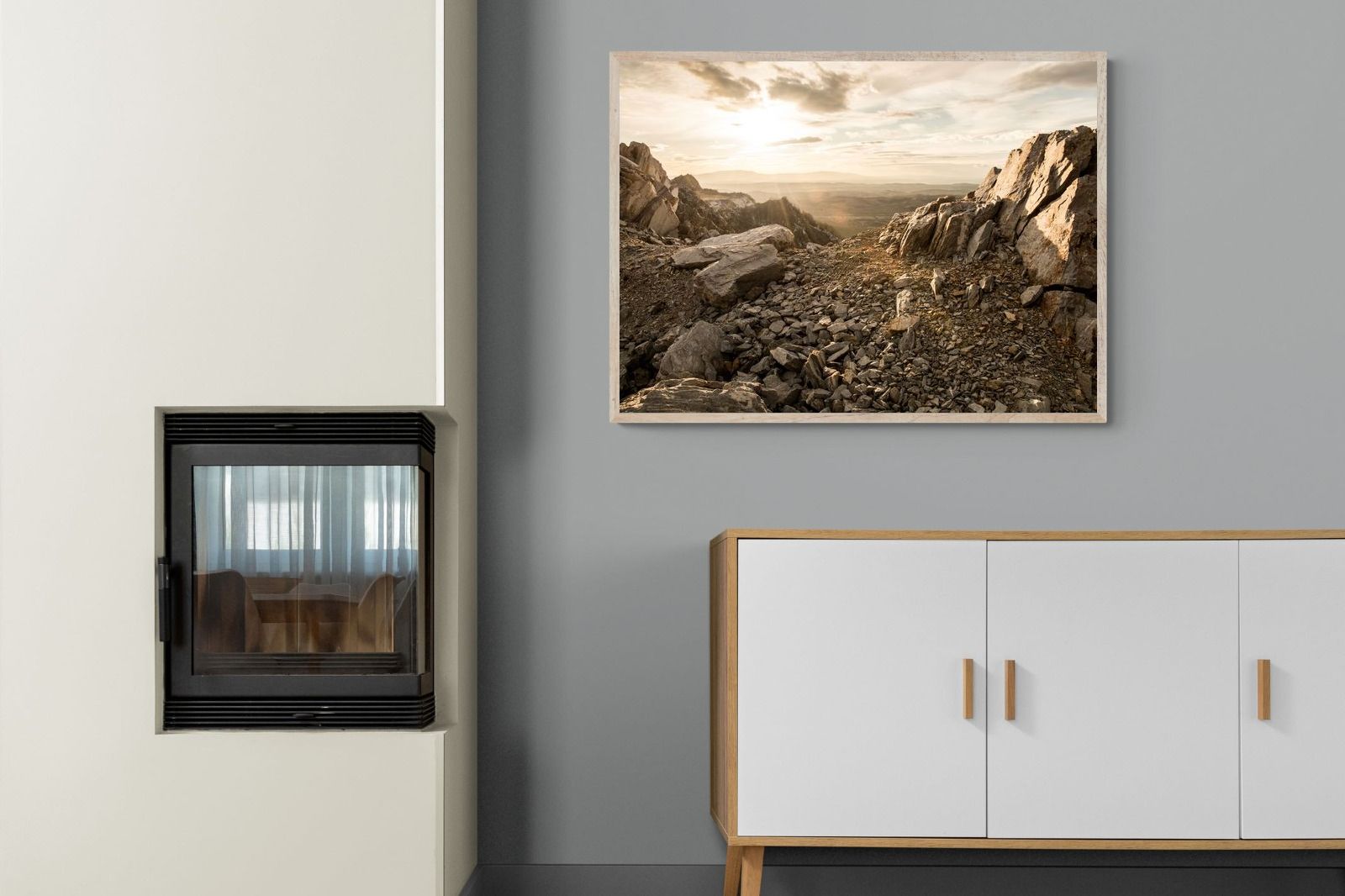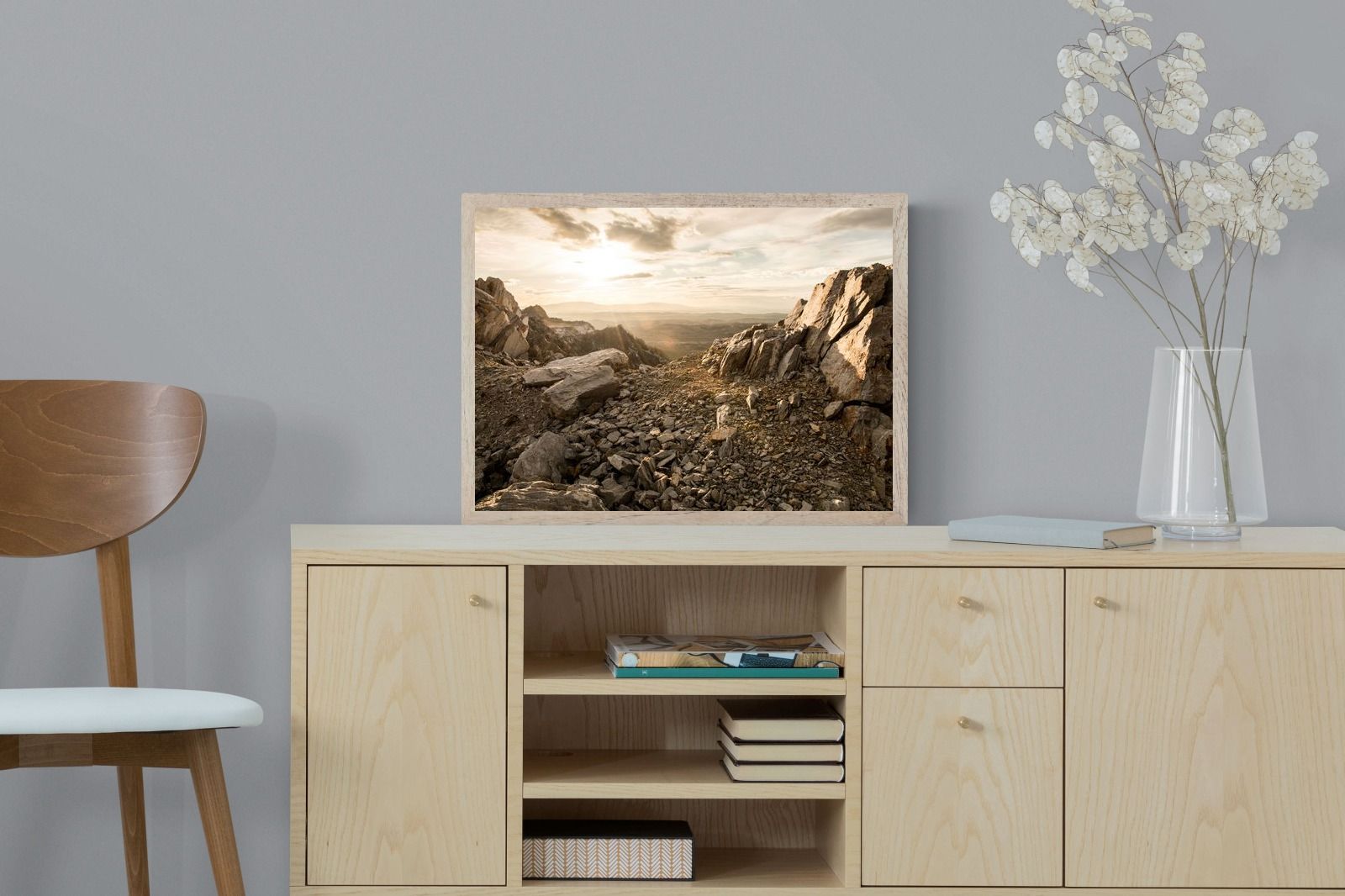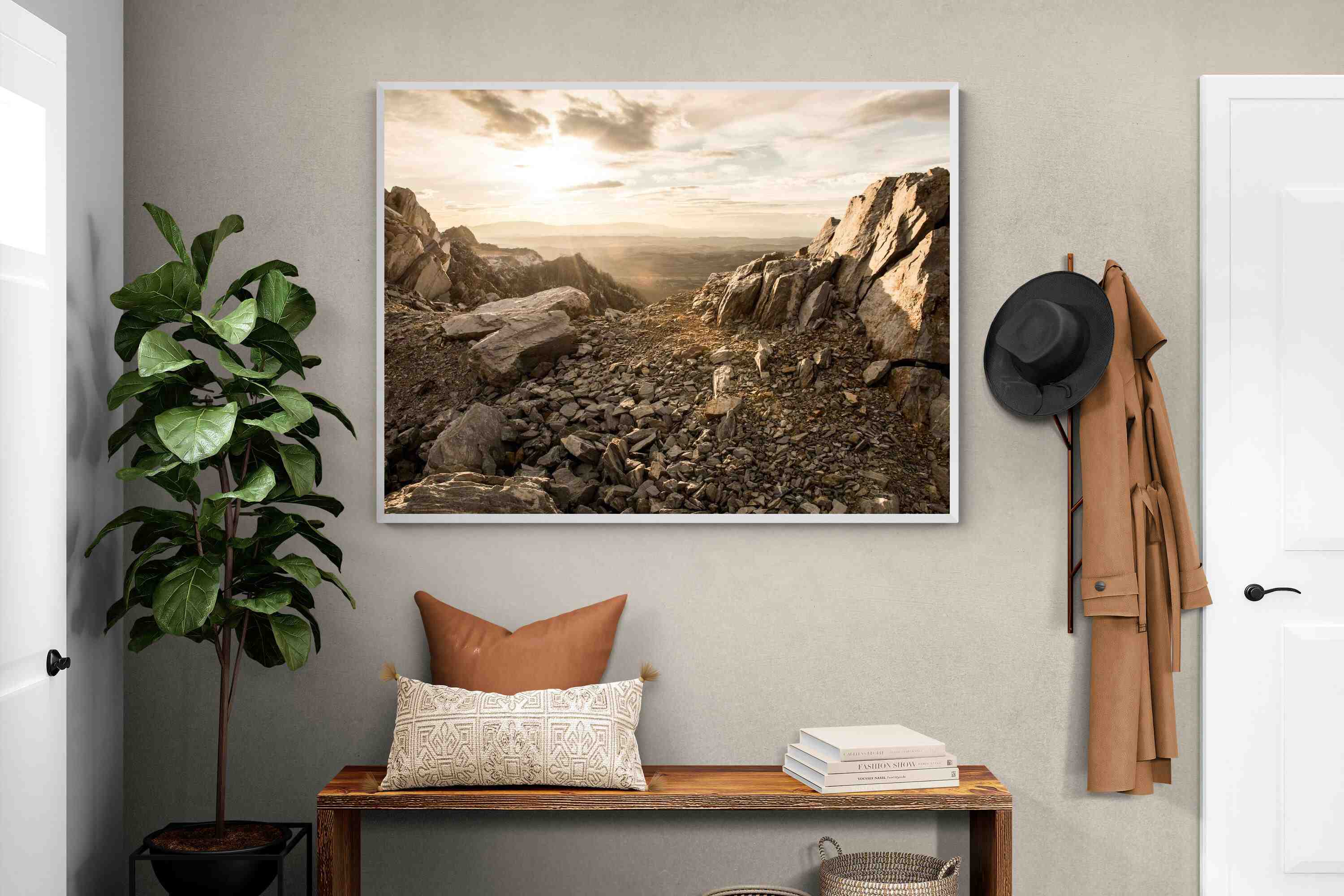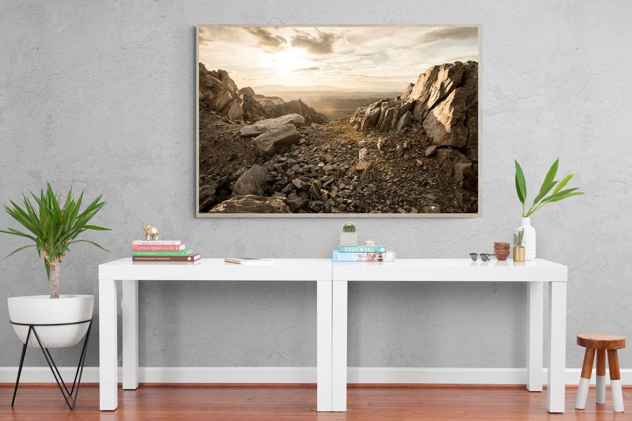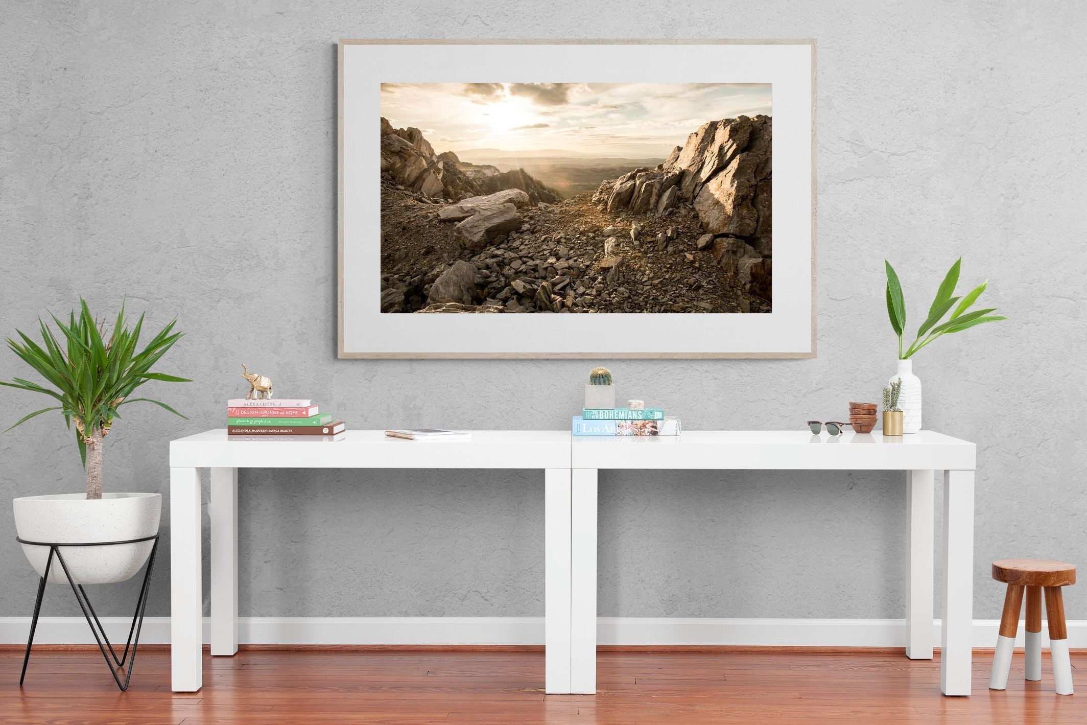 Warm and expansive, this mountain landscape captures golden light breaking over rugged terrain, creating a sense of depth and quiet grandeur. The earthy tones and dramatic textures make it ideal for rustic, contemporary or nature-inspired interiors. Perfect for living rooms, offices or large statement walls, it brings a calming, grounded presence to a space. This piece works beautifully with natural materials, enhancing warmth and visual scale.