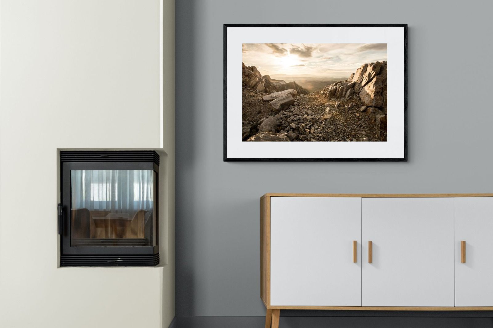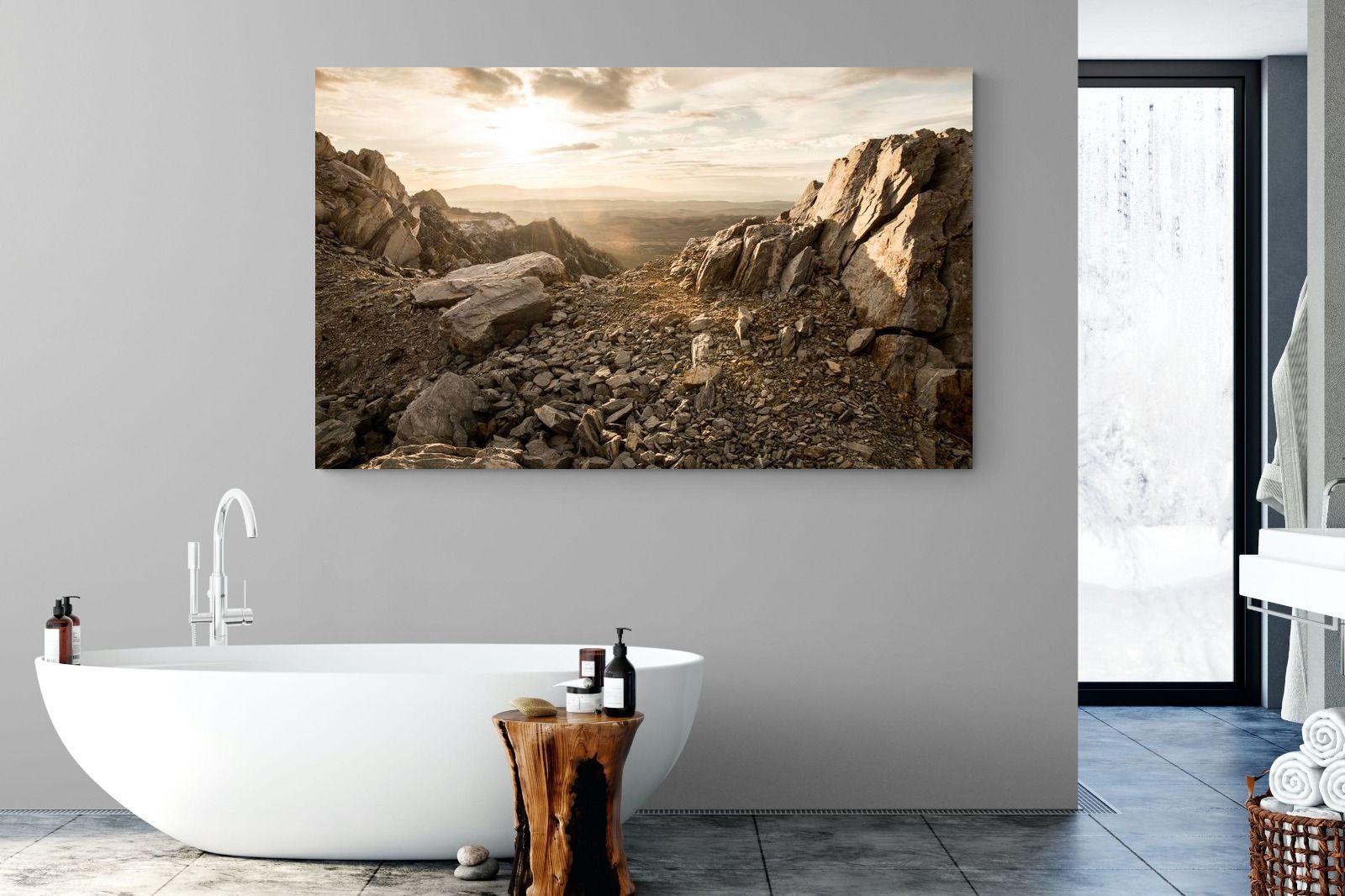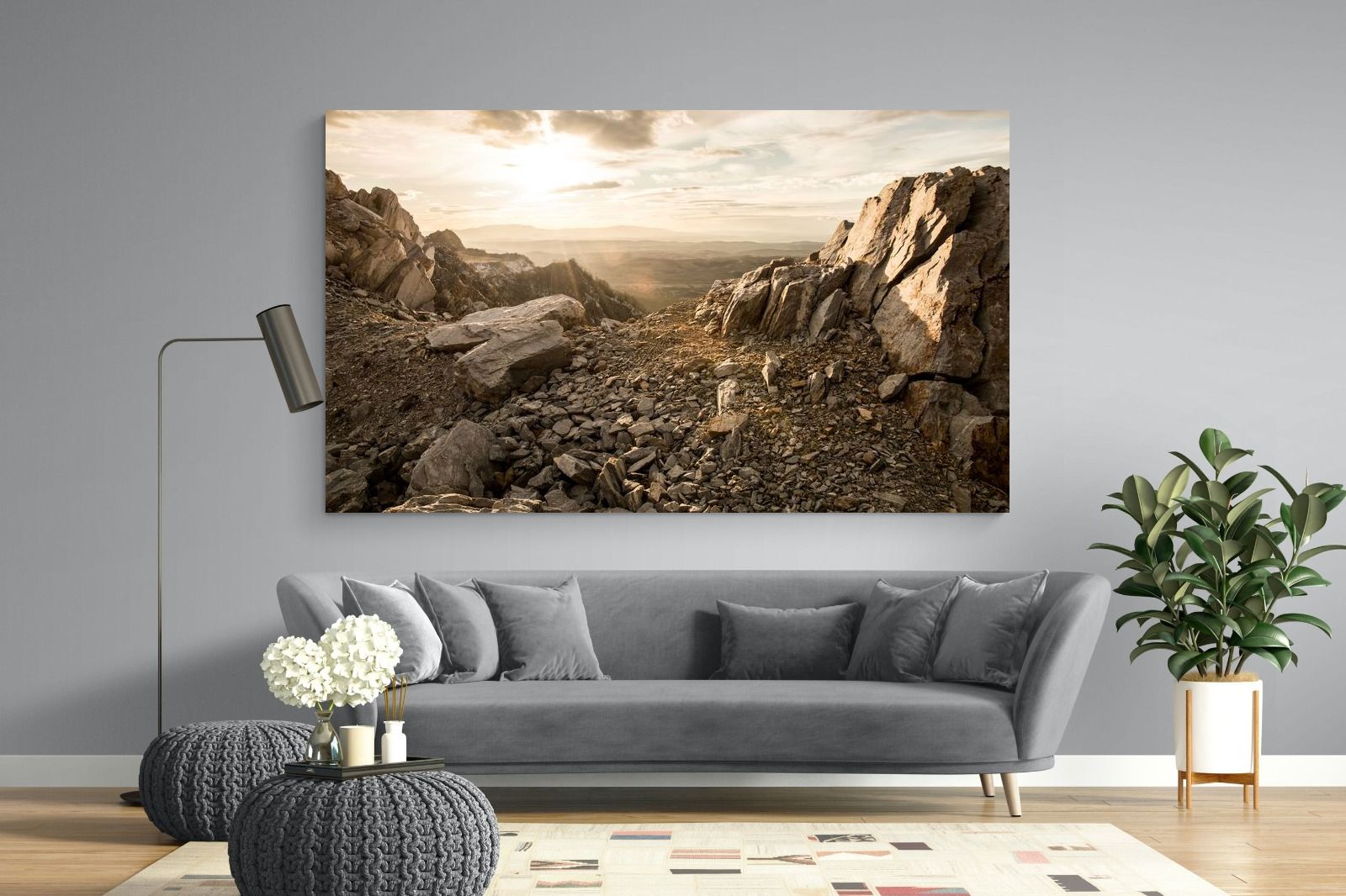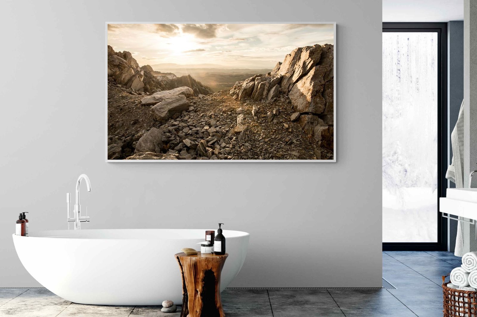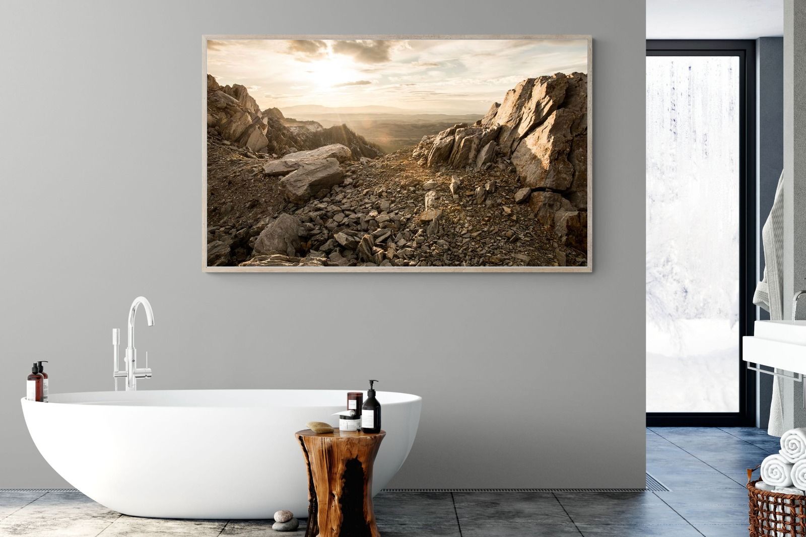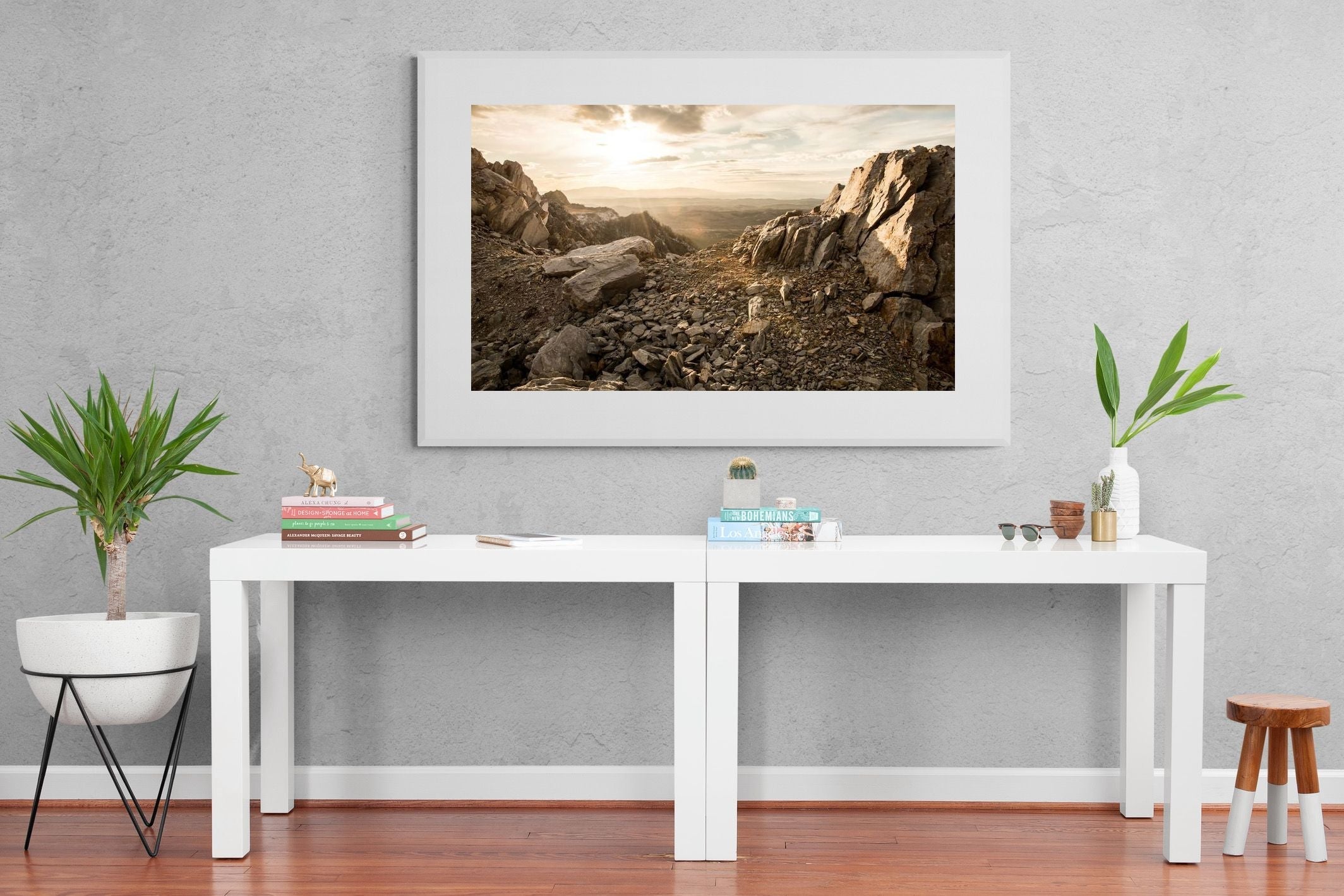 Warm and expansive, this mountain landscape captures golden light breaking over rugged terrain, creating a sense of depth and quiet grandeur. The earthy tones and dramatic textures make it ideal for rustic, contemporary or nature-inspired interiors. Perfect for living rooms, offices or large statement walls, it brings a calming, grounded presence to a space. This piece works beautifully with natural materials, enhancing warmth and visual scale.