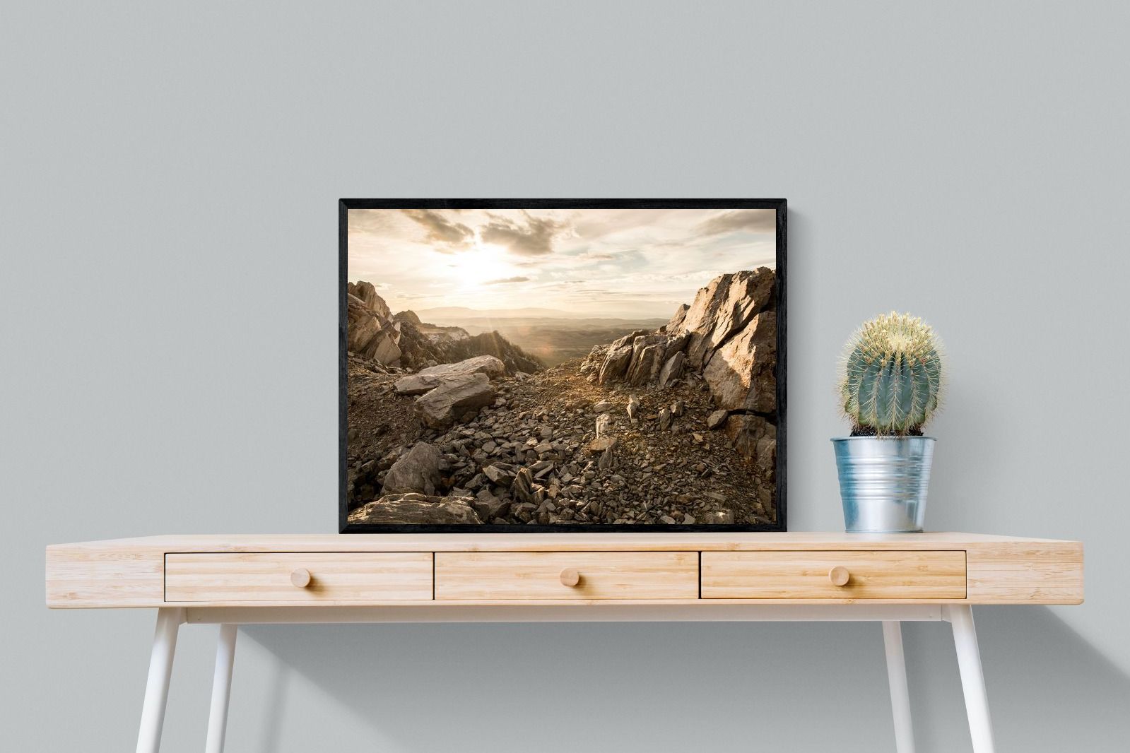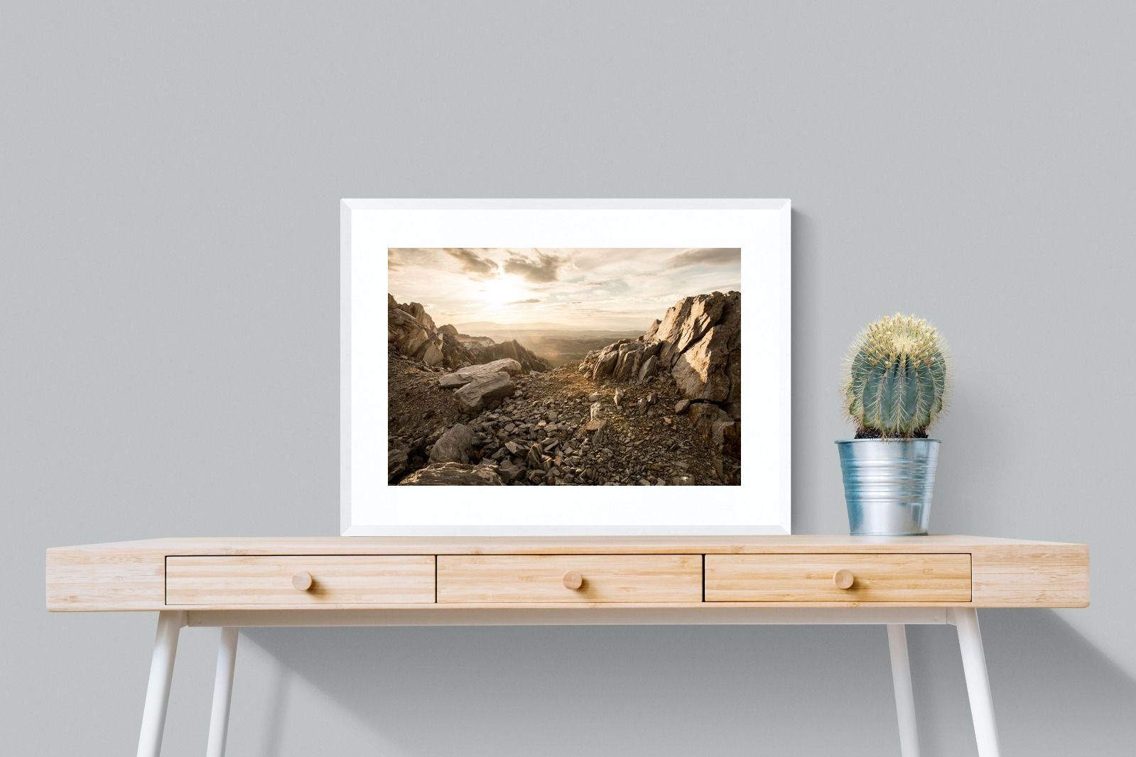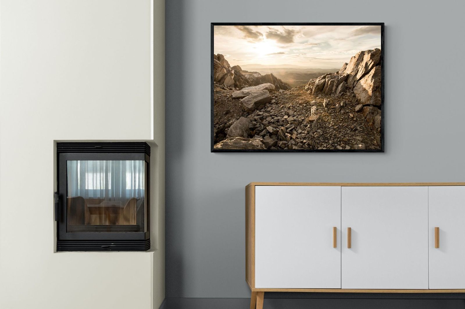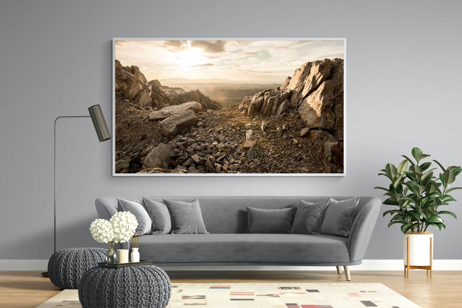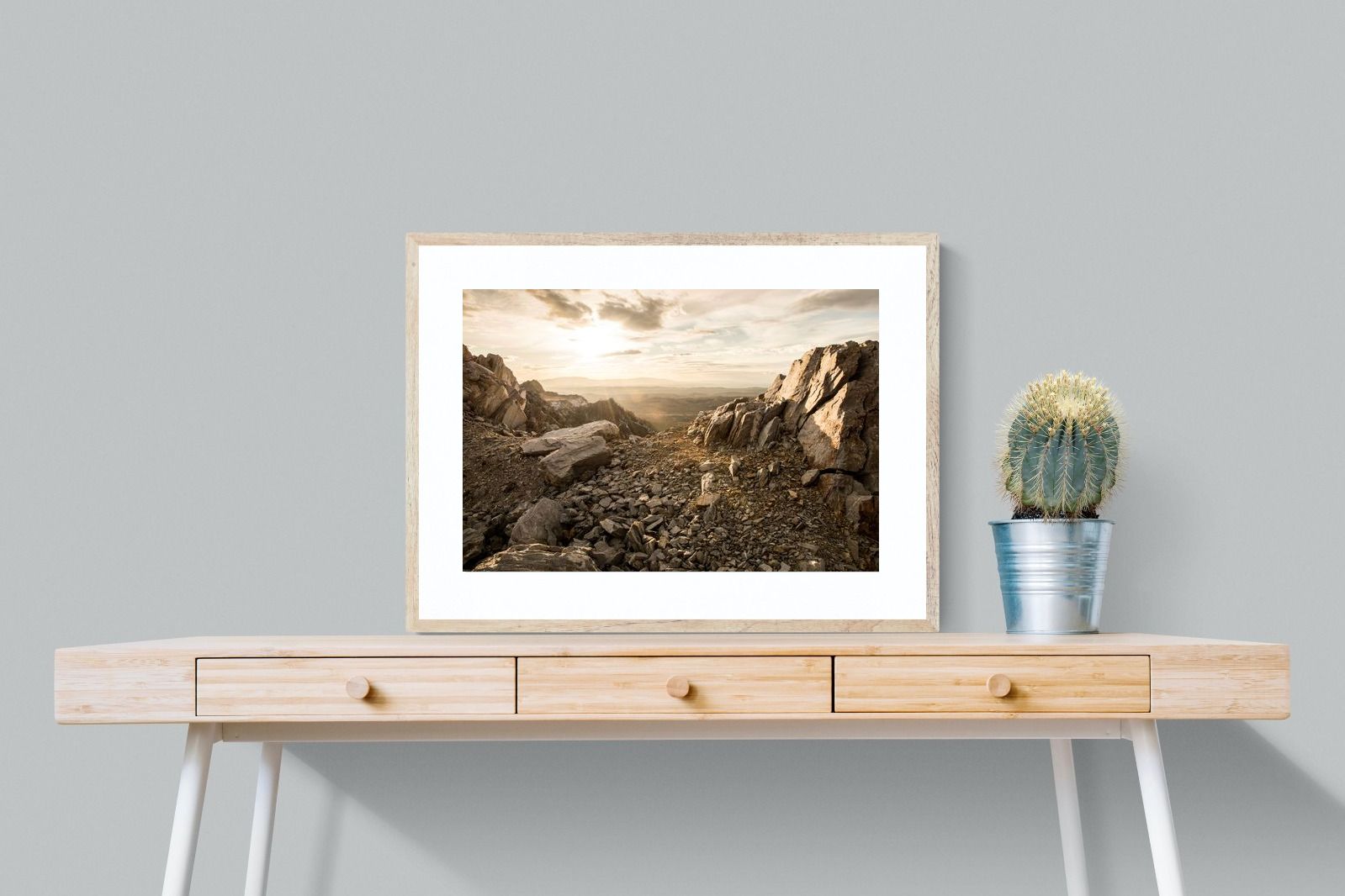 Warm and expansive, this mountain landscape captures golden light breaking over rugged terrain, creating a sense of depth and quiet grandeur. The earthy tones and dramatic textures make it ideal for rustic, contemporary or nature-inspired interiors. Perfect for living rooms, offices or large statement walls, it brings a calming, grounded presence to a space. This piece works beautifully with natural materials, enhancing warmth and visual scale.