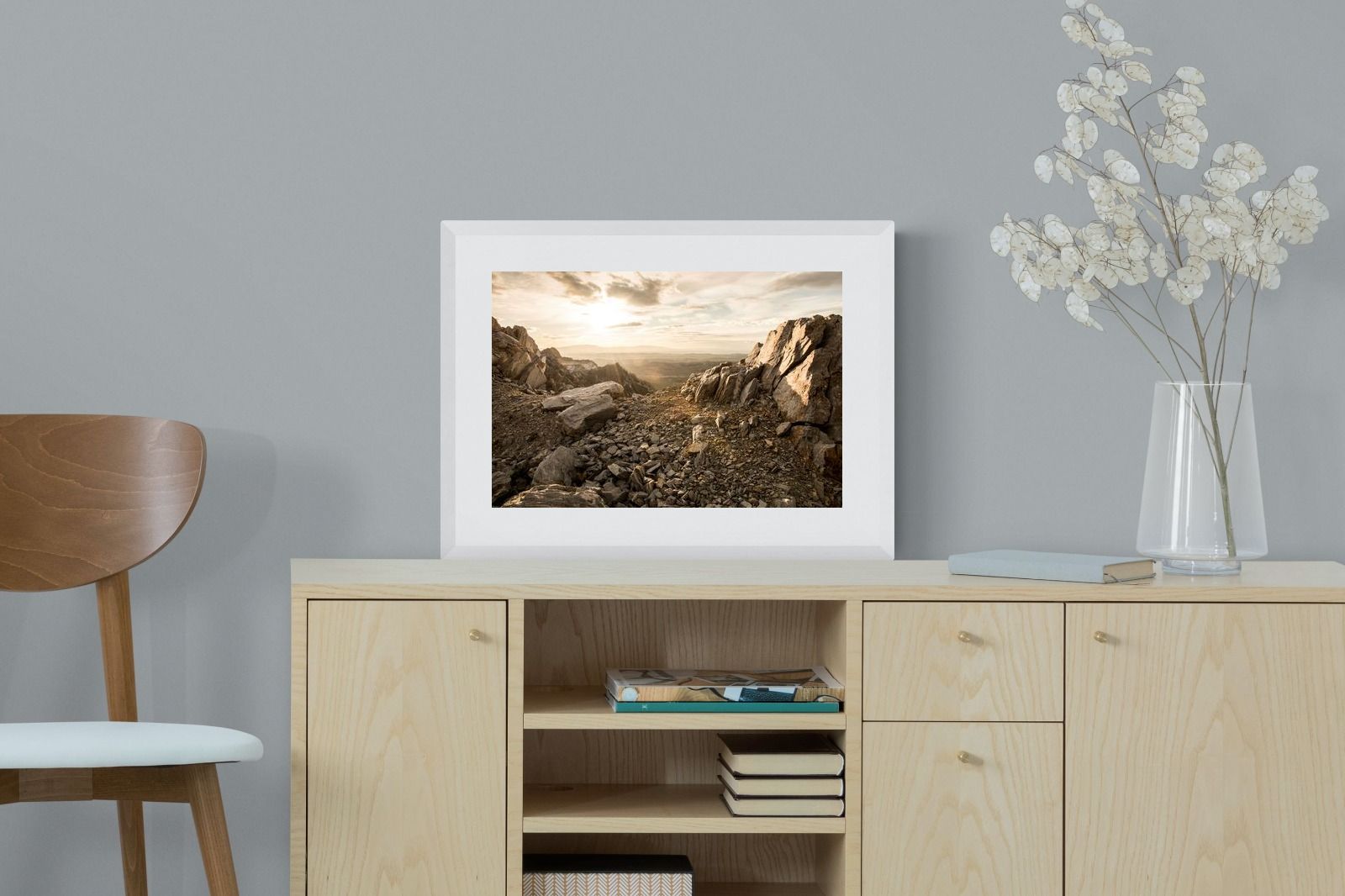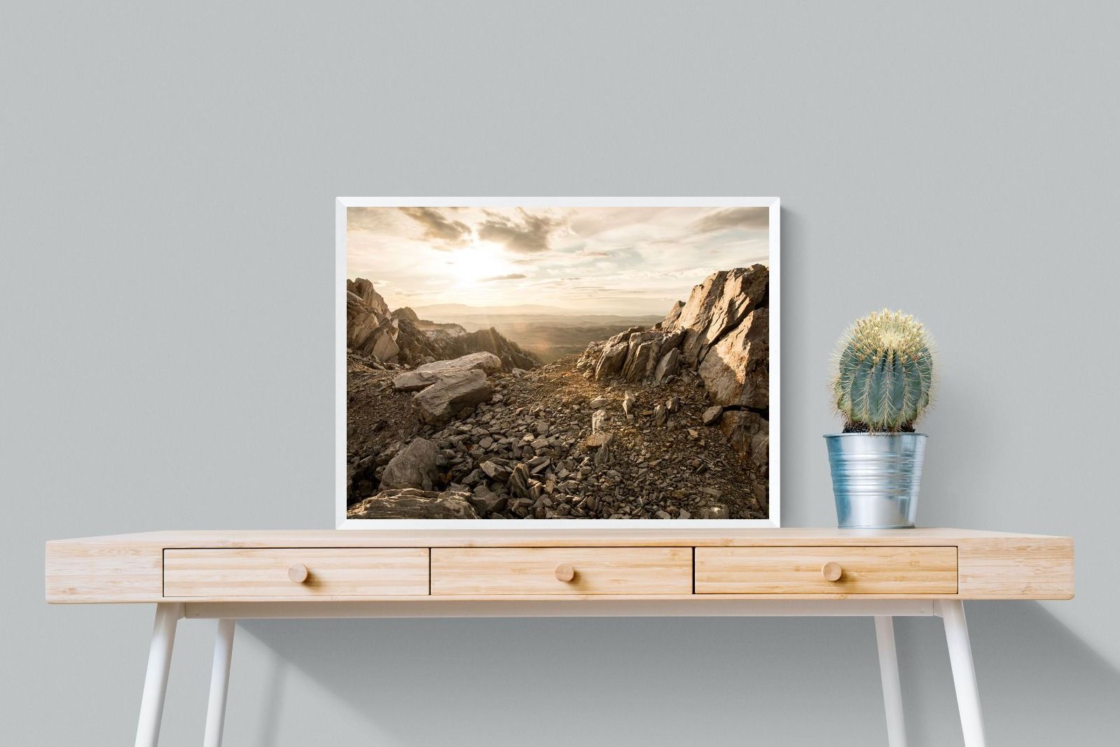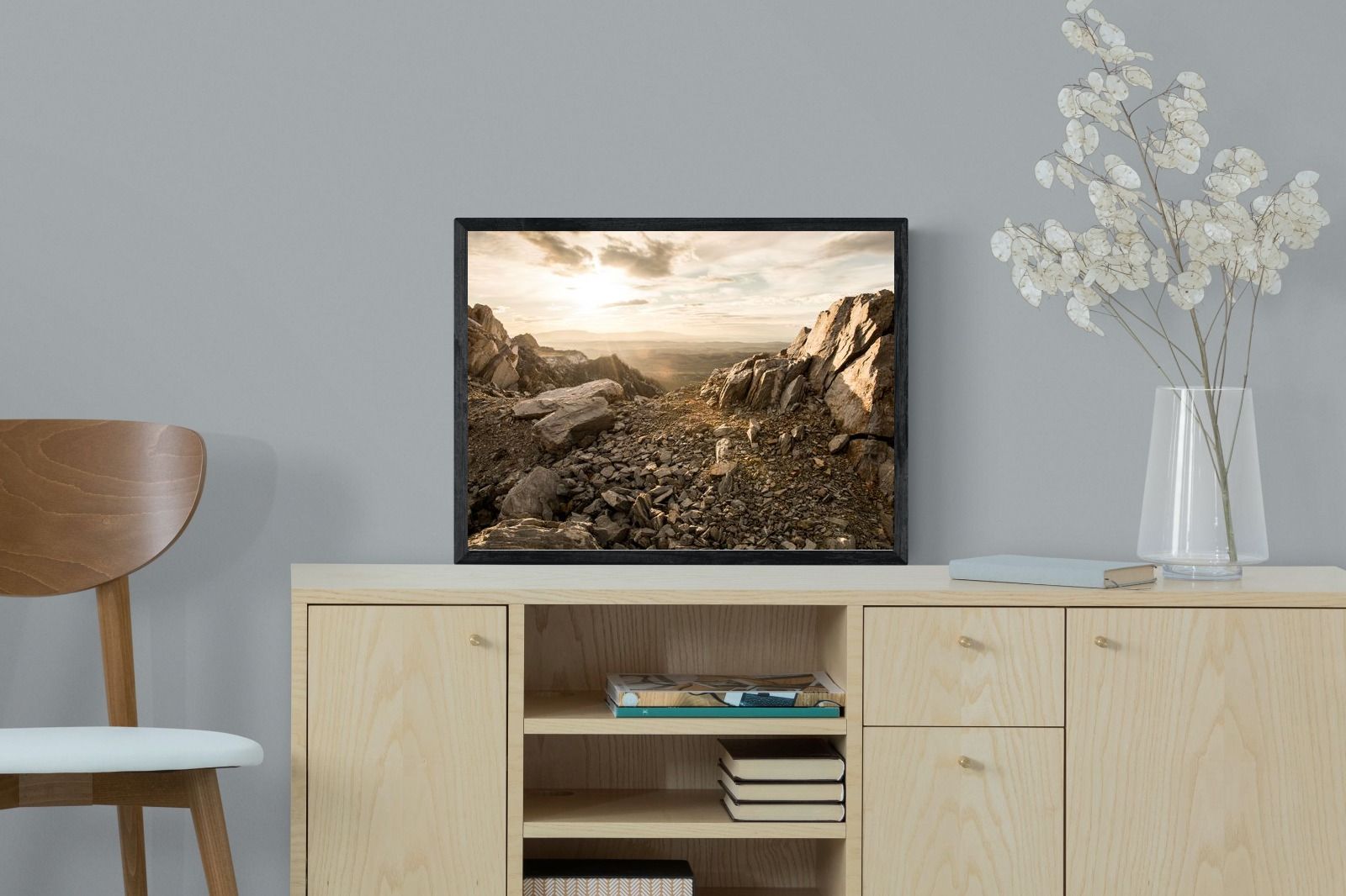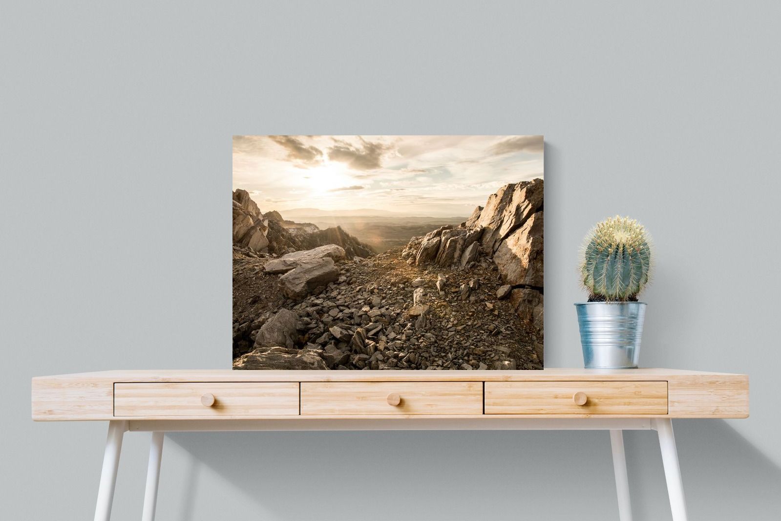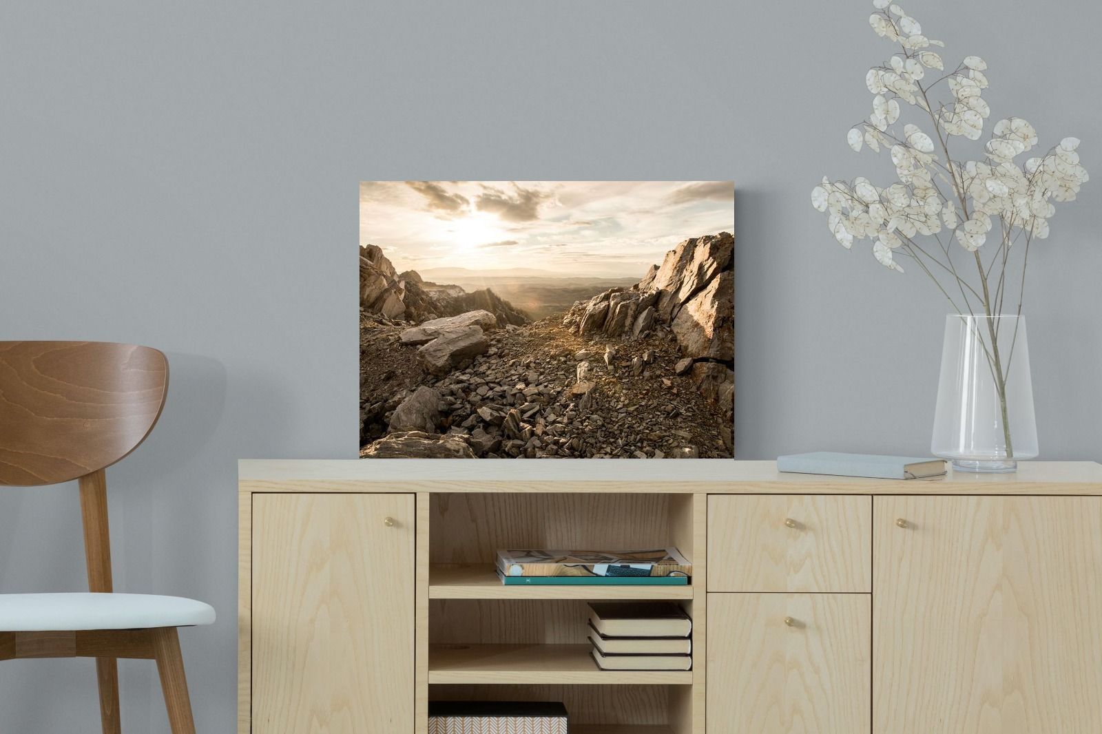 Warm and expansive, this mountain landscape captures golden light breaking over rugged terrain, creating a sense of depth and quiet grandeur. The earthy tones and dramatic textures make it ideal for rustic, contemporary or nature-inspired interiors. Perfect for living rooms, offices or large statement walls, it brings a calming, grounded presence to a space. This piece works beautifully with natural materials, enhancing warmth and visual scale.
