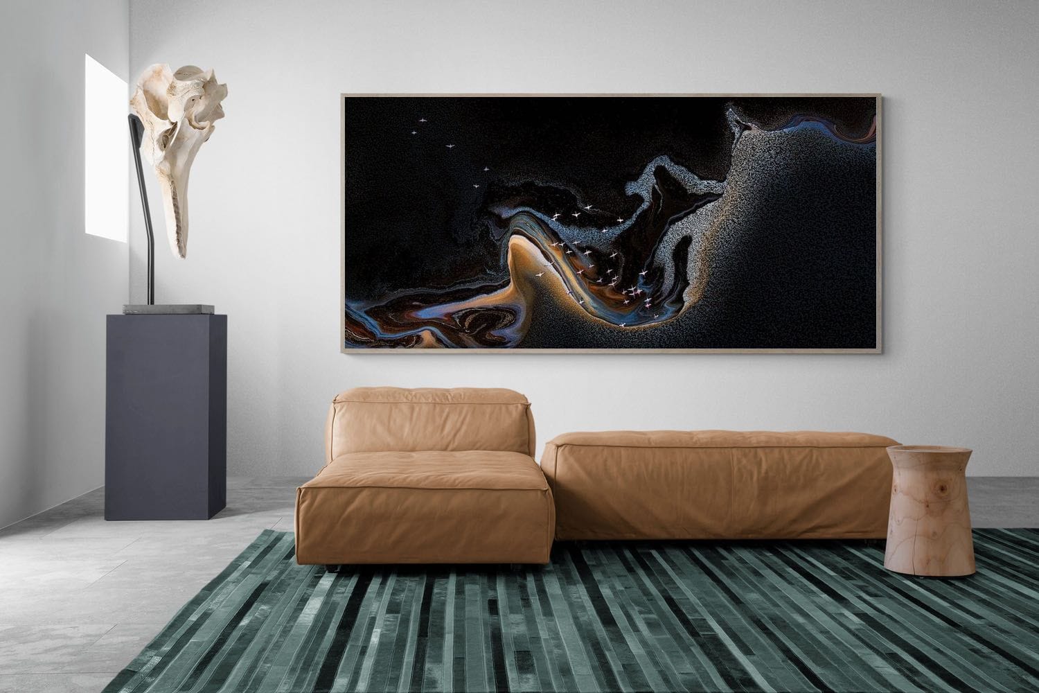 A striking aerial photograph captures a flock of flamingos gliding above an inky black lake textured with natural mineral crystals. Subtle currents of gold, bronze and deep blue ripple through the water, creating a composition that feels almost abstract while remaining entirely natural. The contrast between the delicate birds and the dark, mineral-rich landscape makes this artwork a dramatic statement piece for modern interiors and contemporary spaces.