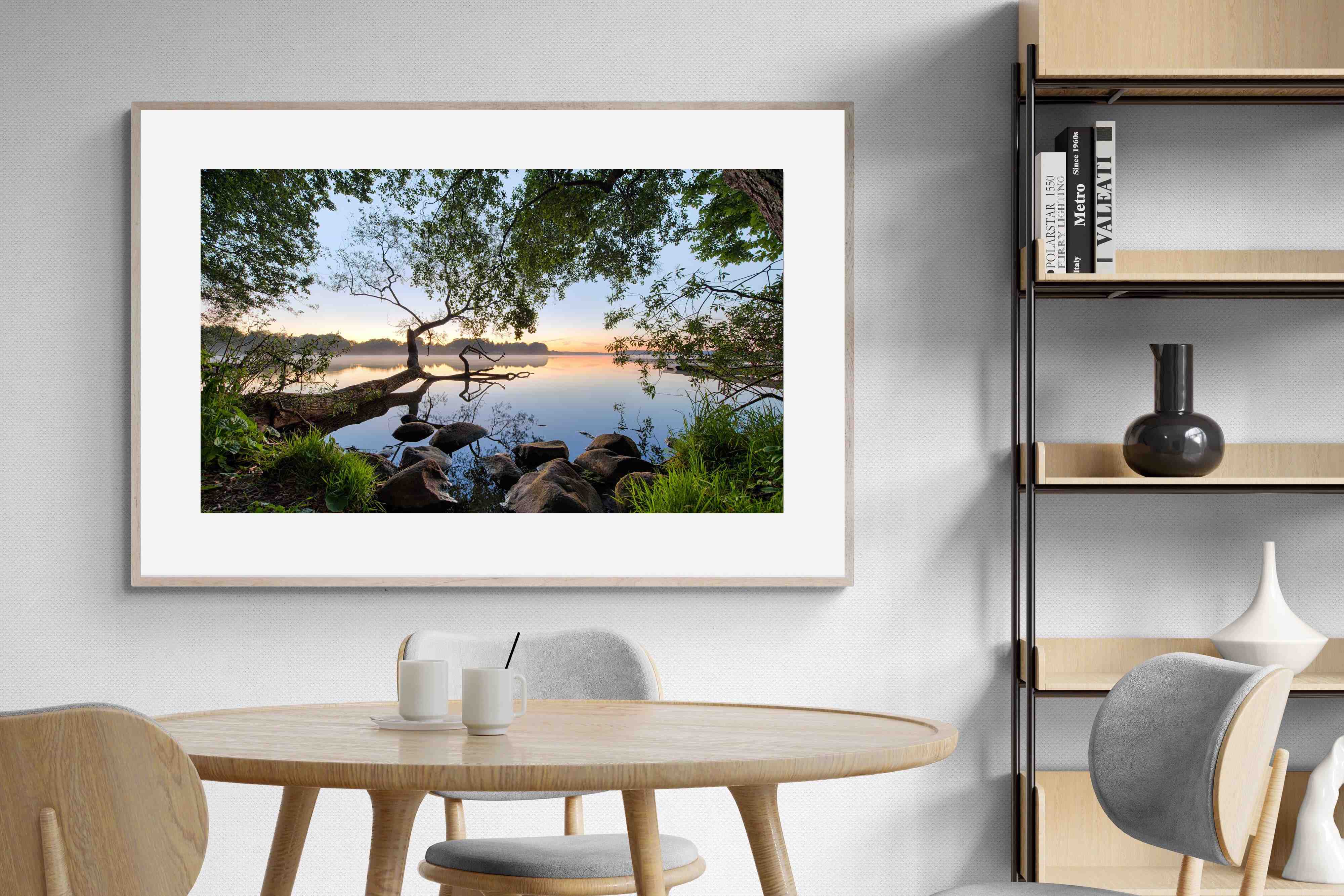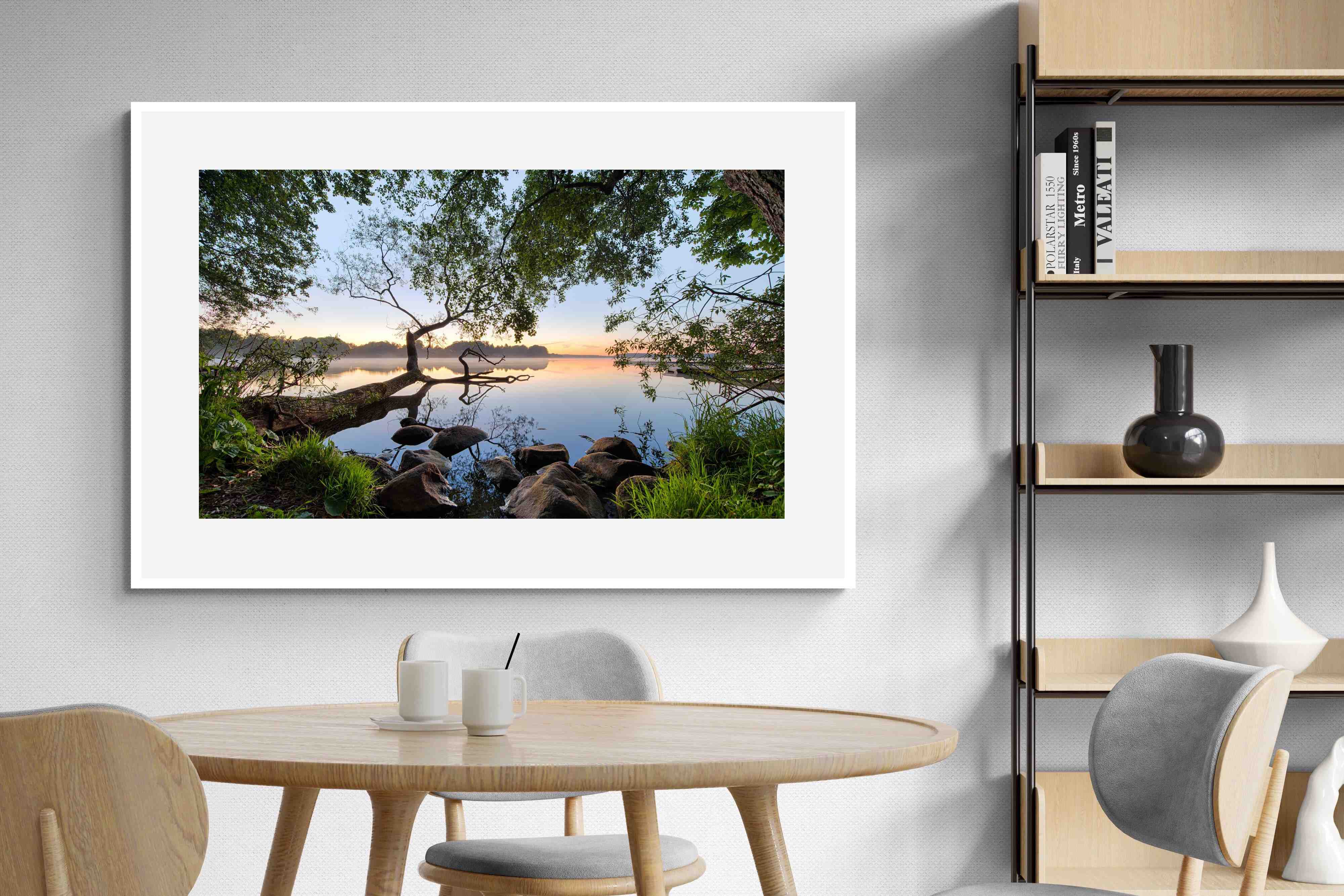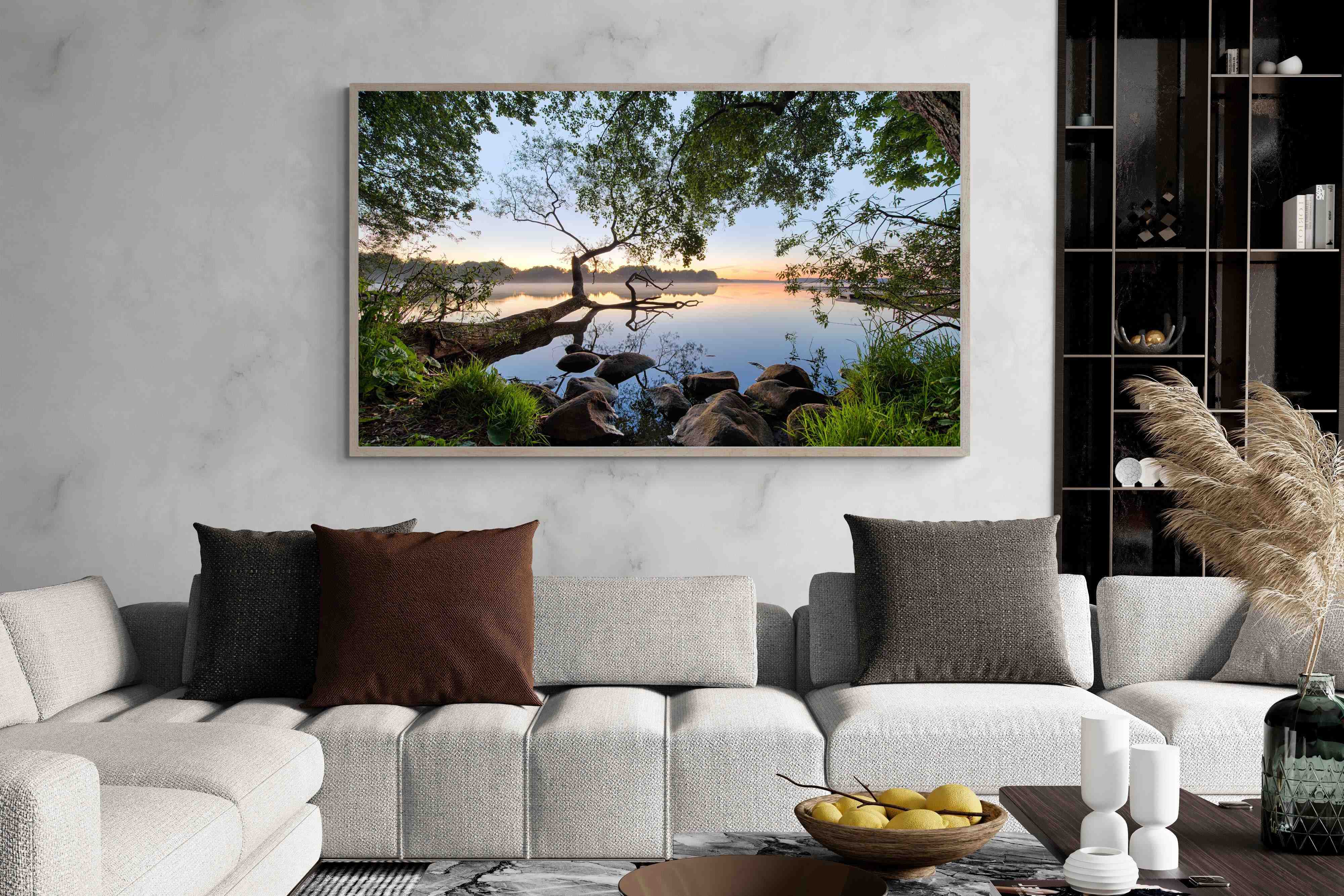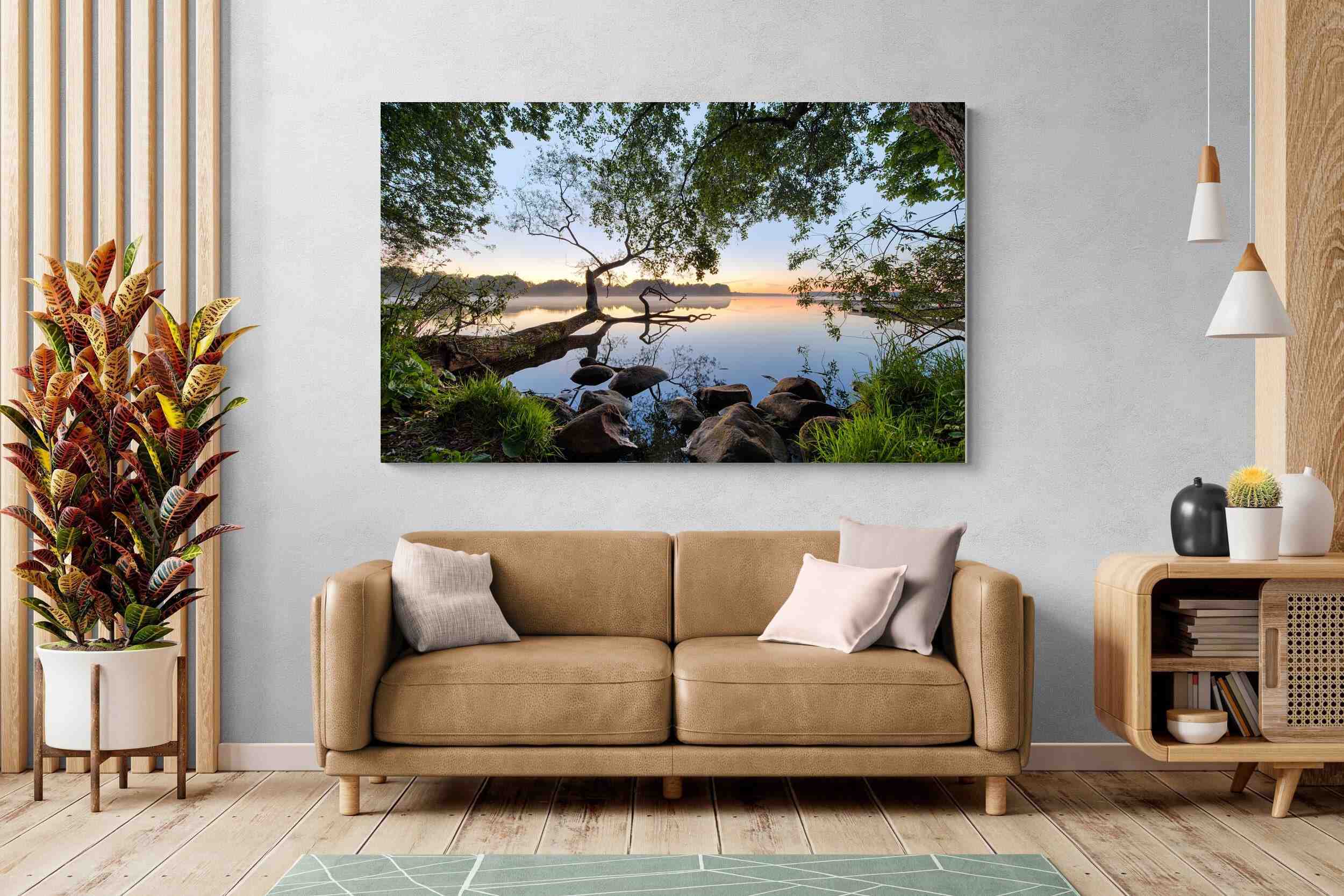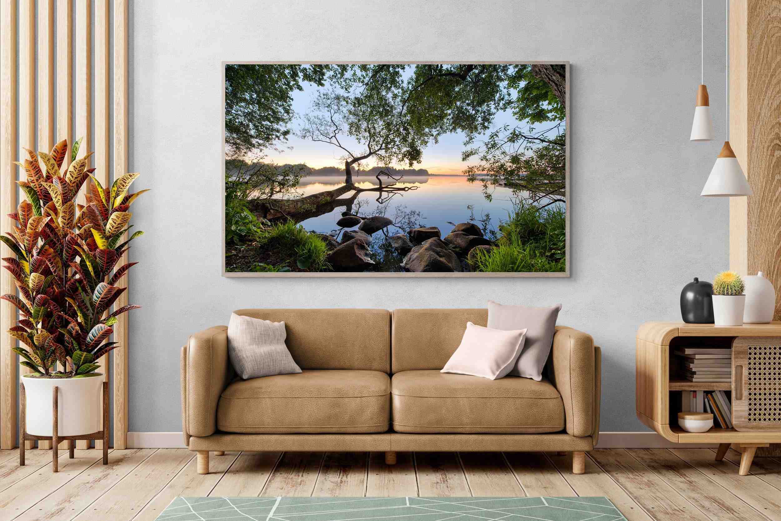 Calm and reflective, this peaceful lakeside scene captures still water, soft light and natural framing from surrounding trees. The gentle tones and balanced composition create a sense of quiet and space. Ideal for bedrooms, offices or relaxation areas, it adds depth, calm and a grounding connection to nature within contemporary interiors.