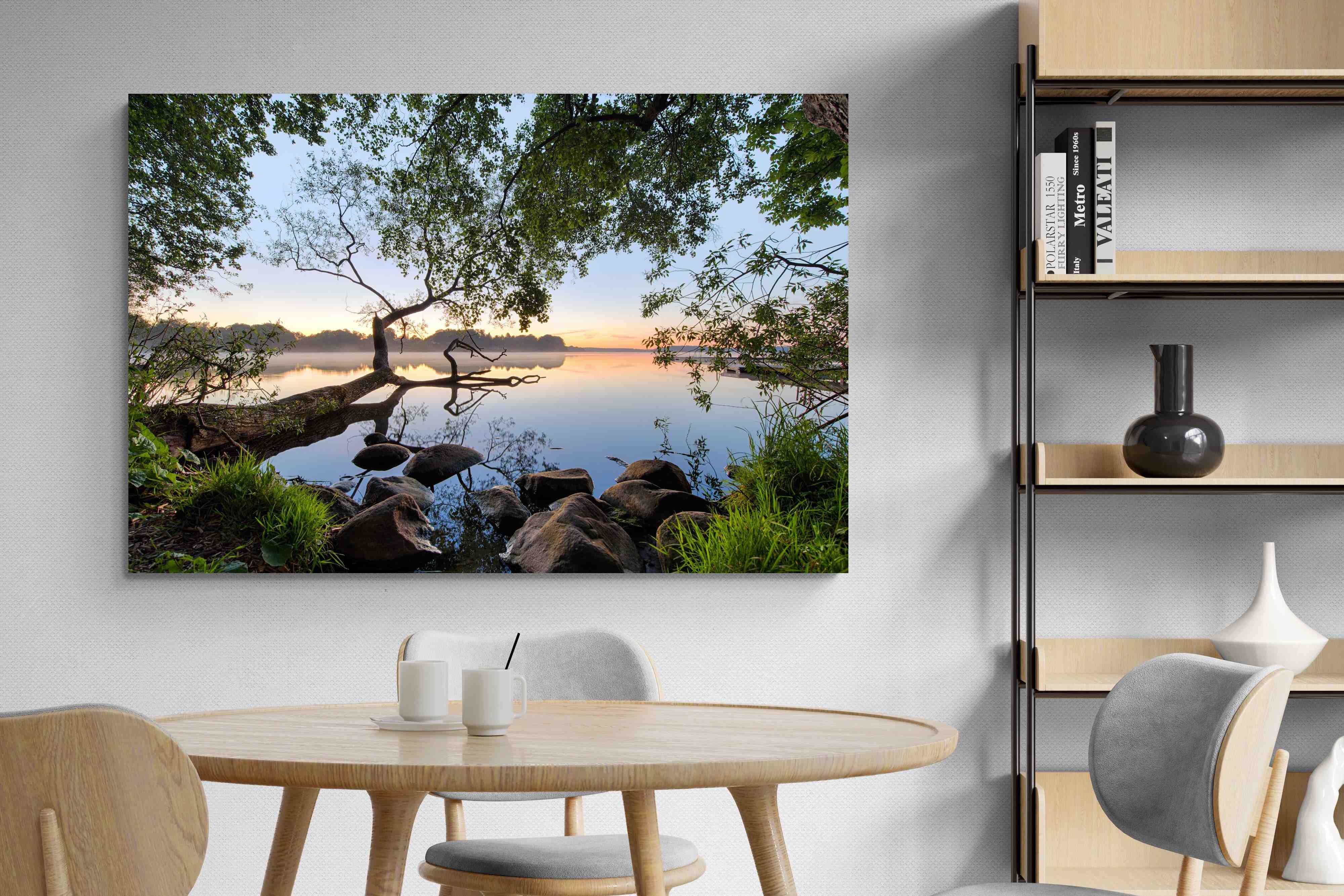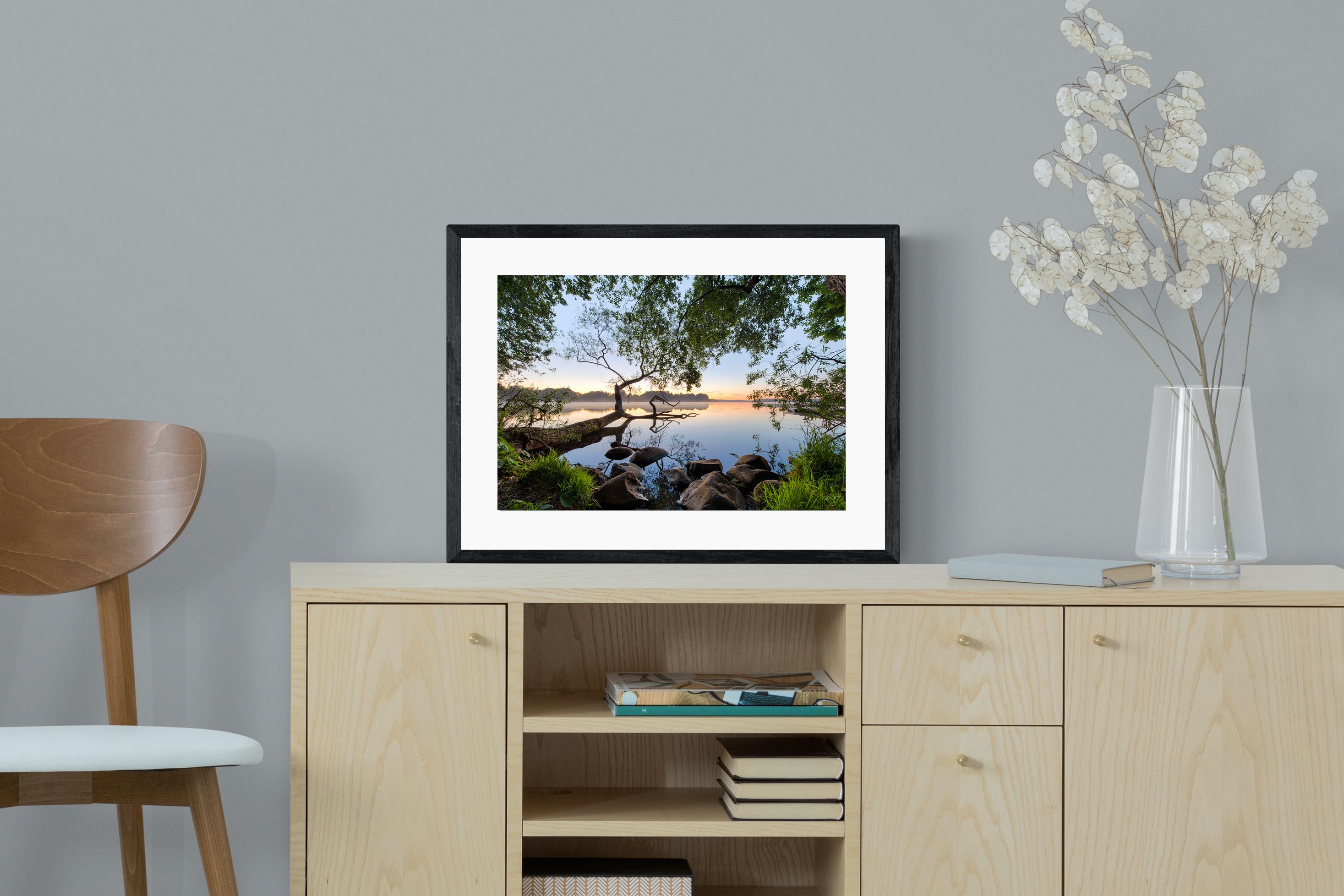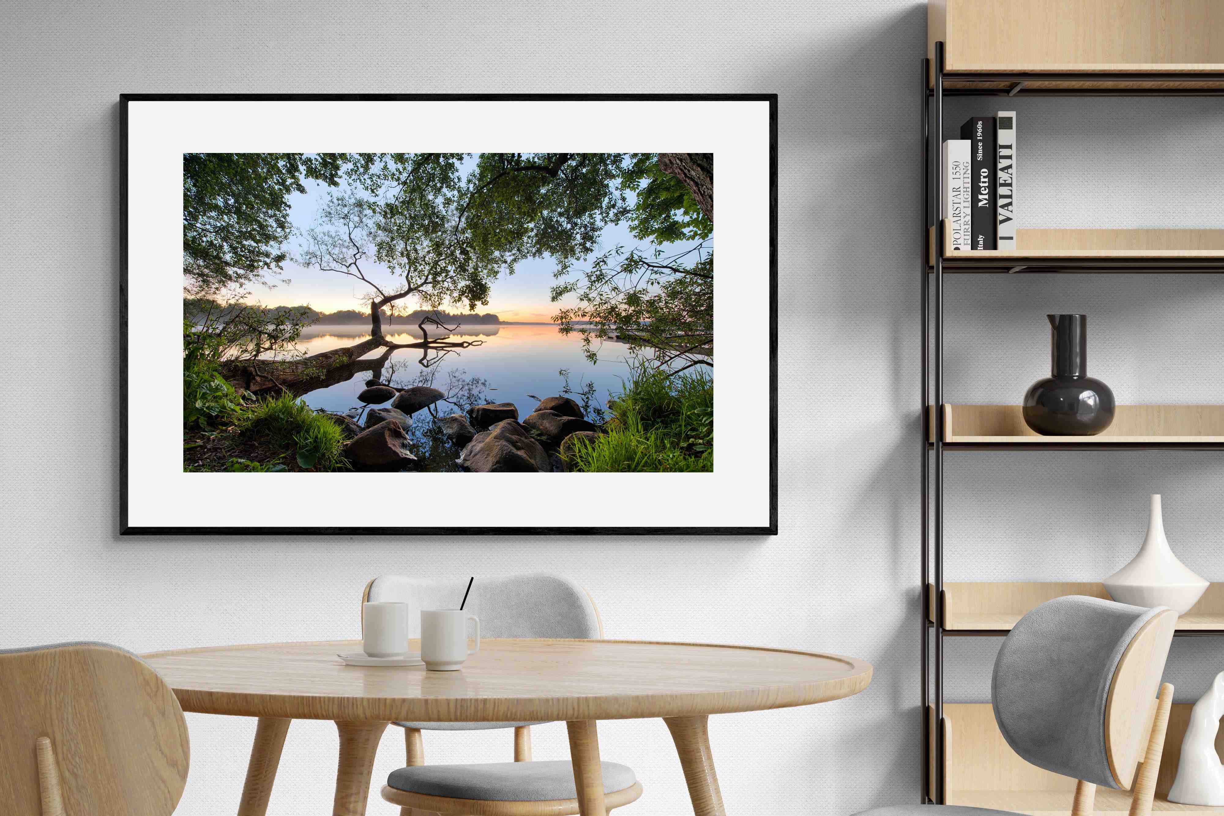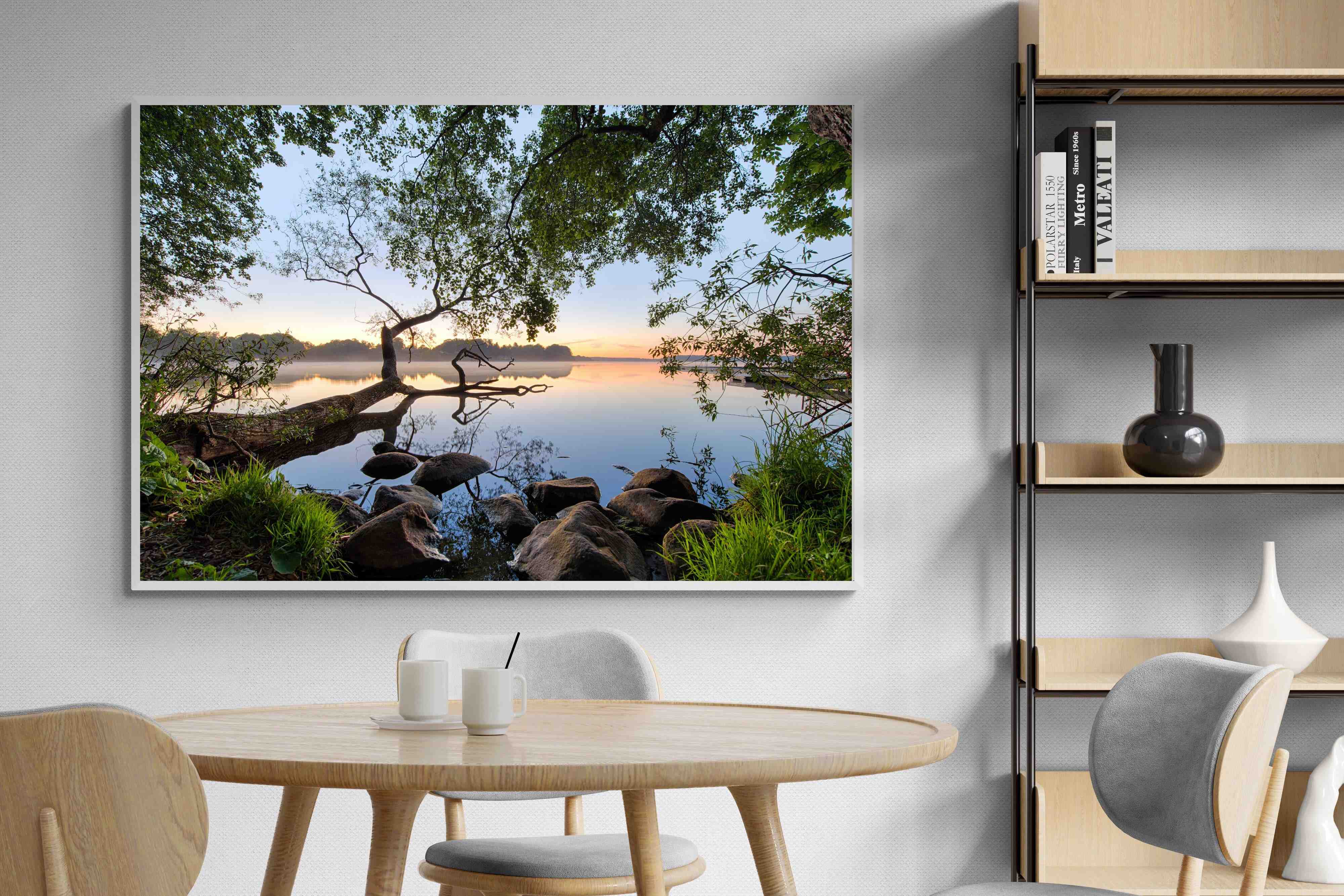 Calm and reflective, this peaceful lakeside scene captures still water, soft light and natural framing from surrounding trees. The gentle tones and balanced composition create a sense of quiet and space. Ideal for bedrooms, offices or relaxation areas, it adds depth, calm and a grounding connection to nature within contemporary interiors.