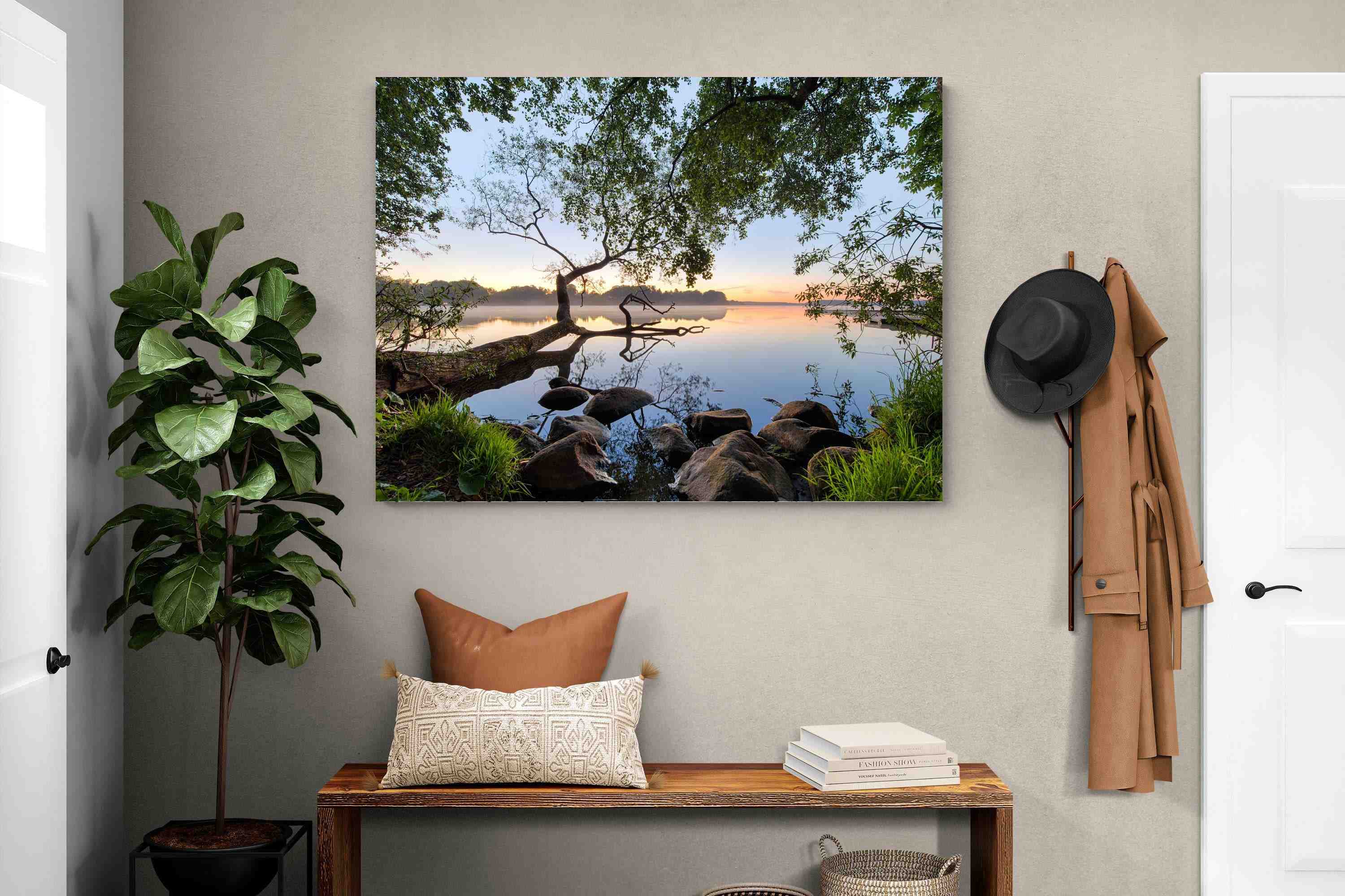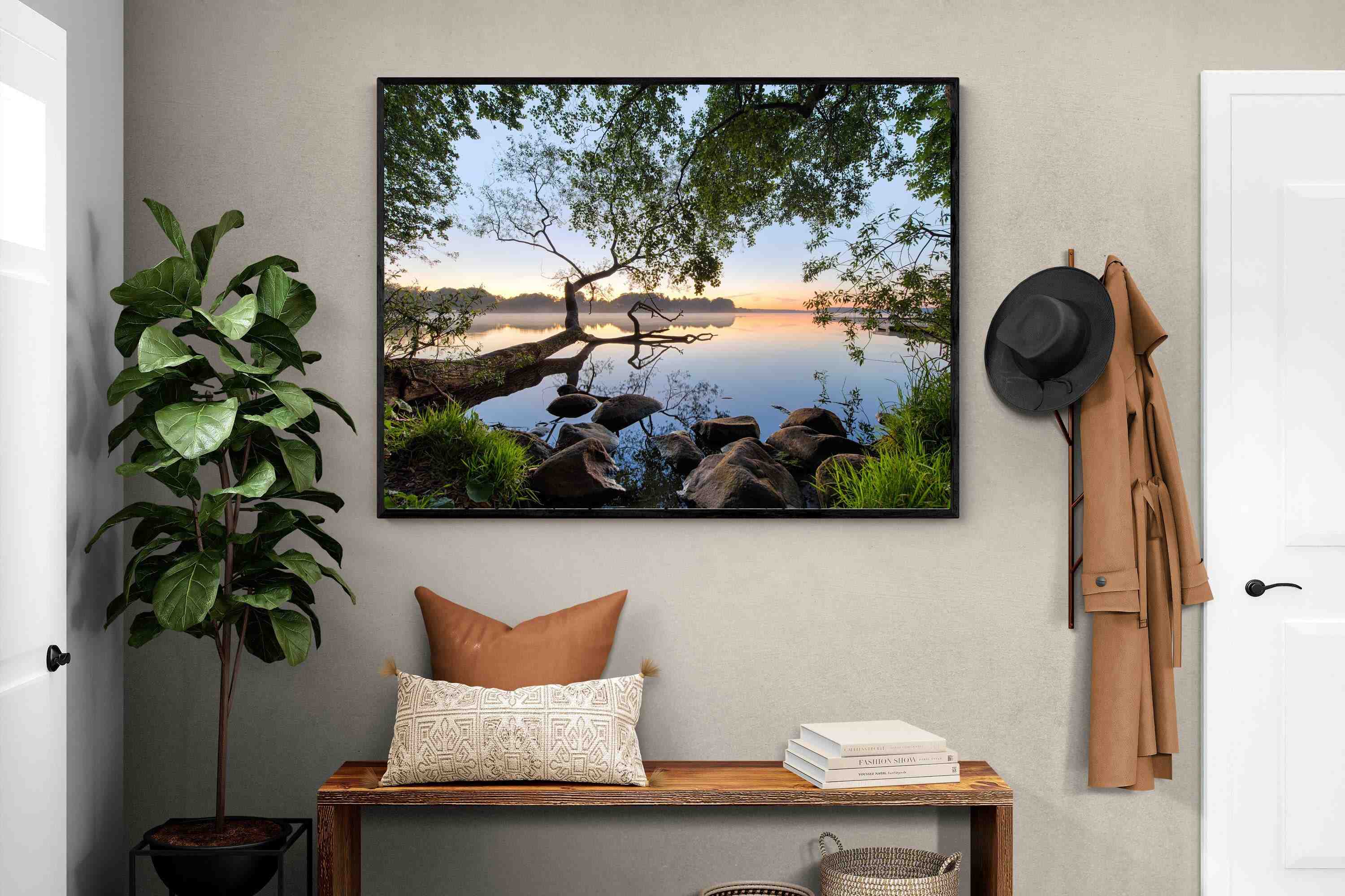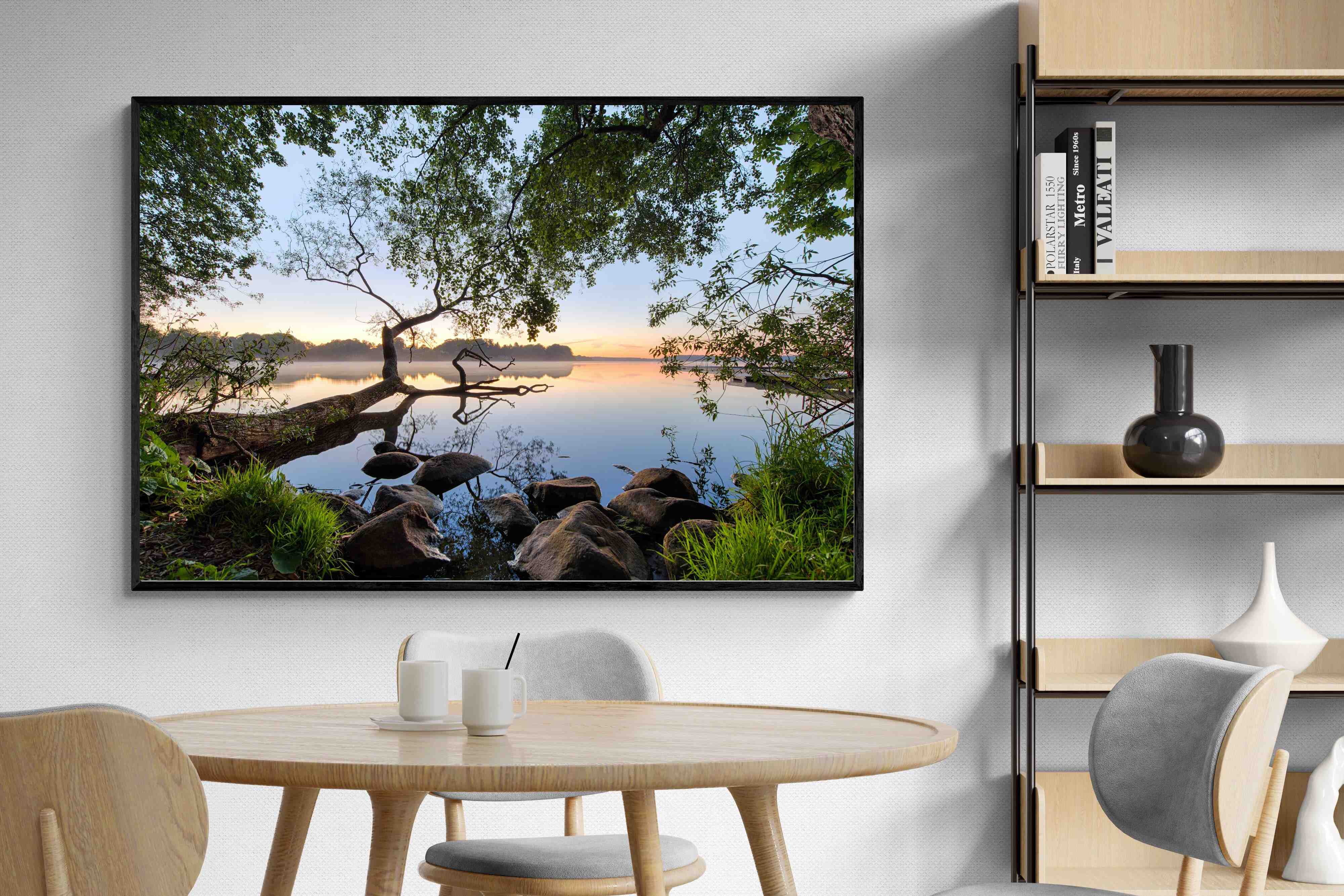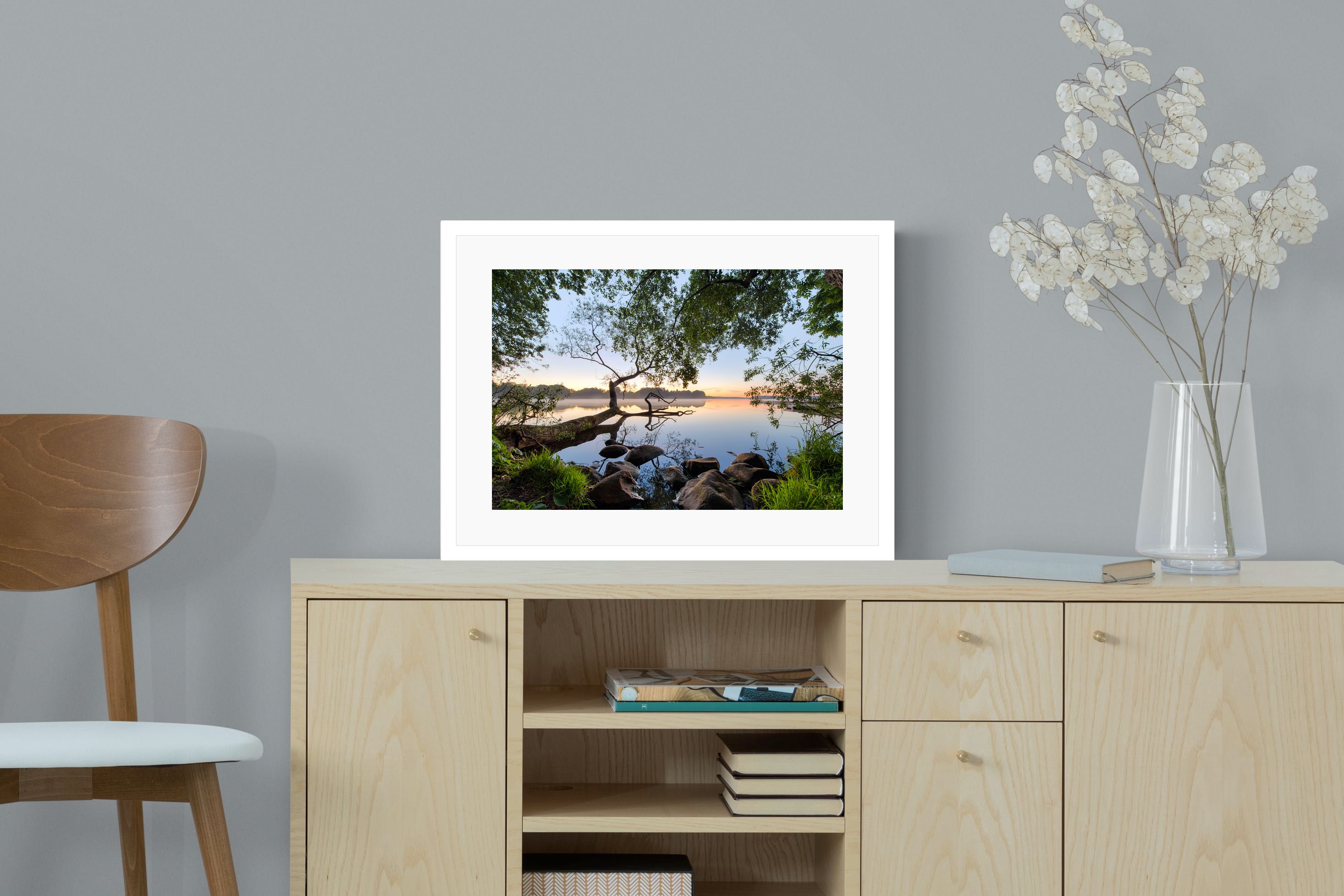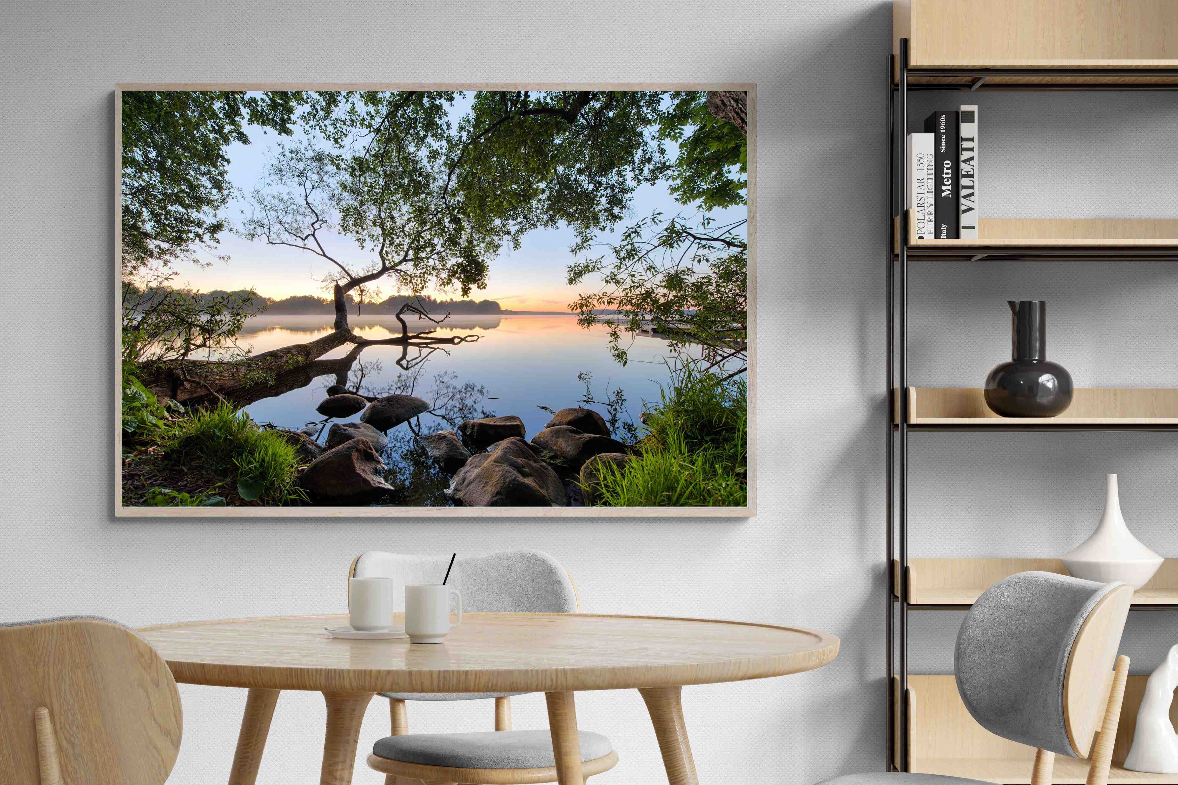 Calm and reflective, this peaceful lakeside scene captures still water, soft light and natural framing from surrounding trees. The gentle tones and balanced composition create a sense of quiet and space. Ideal for bedrooms, offices or relaxation areas, it adds depth, calm and a grounding connection to nature within contemporary interiors.