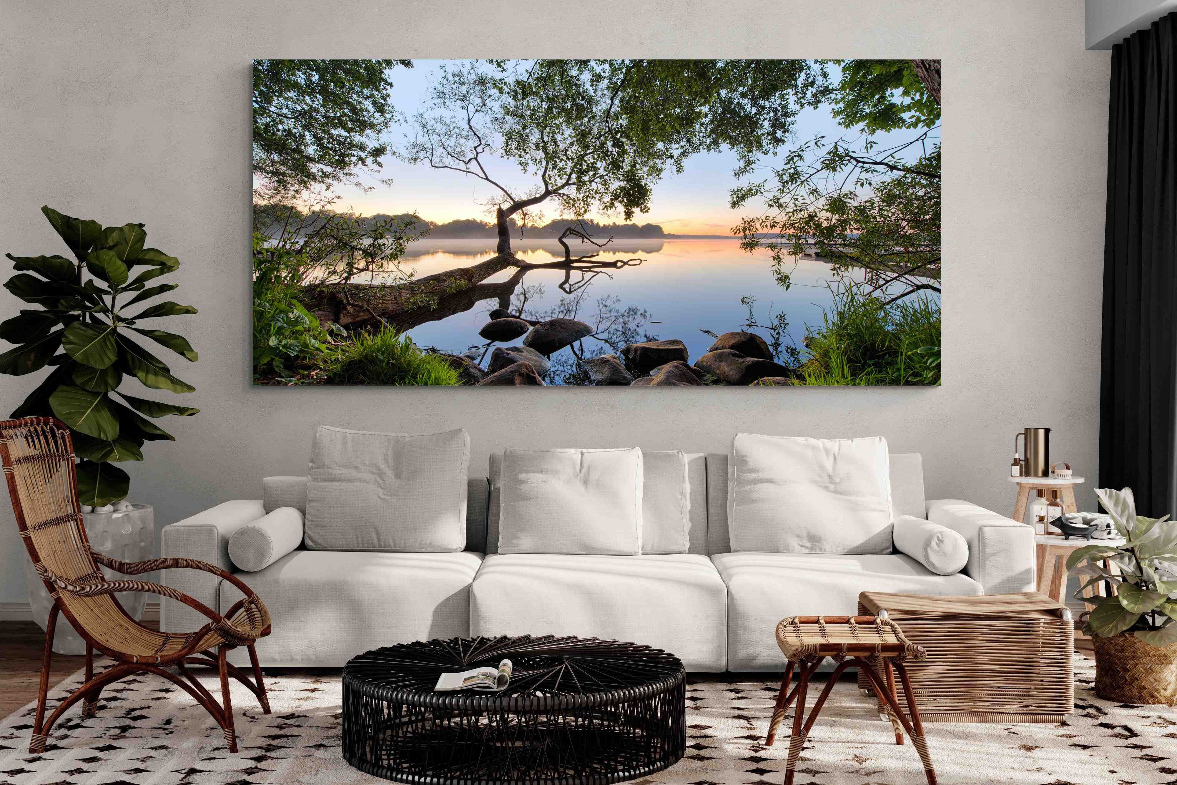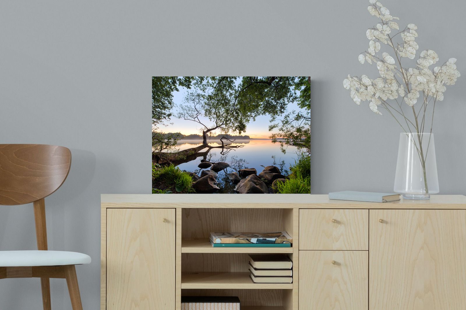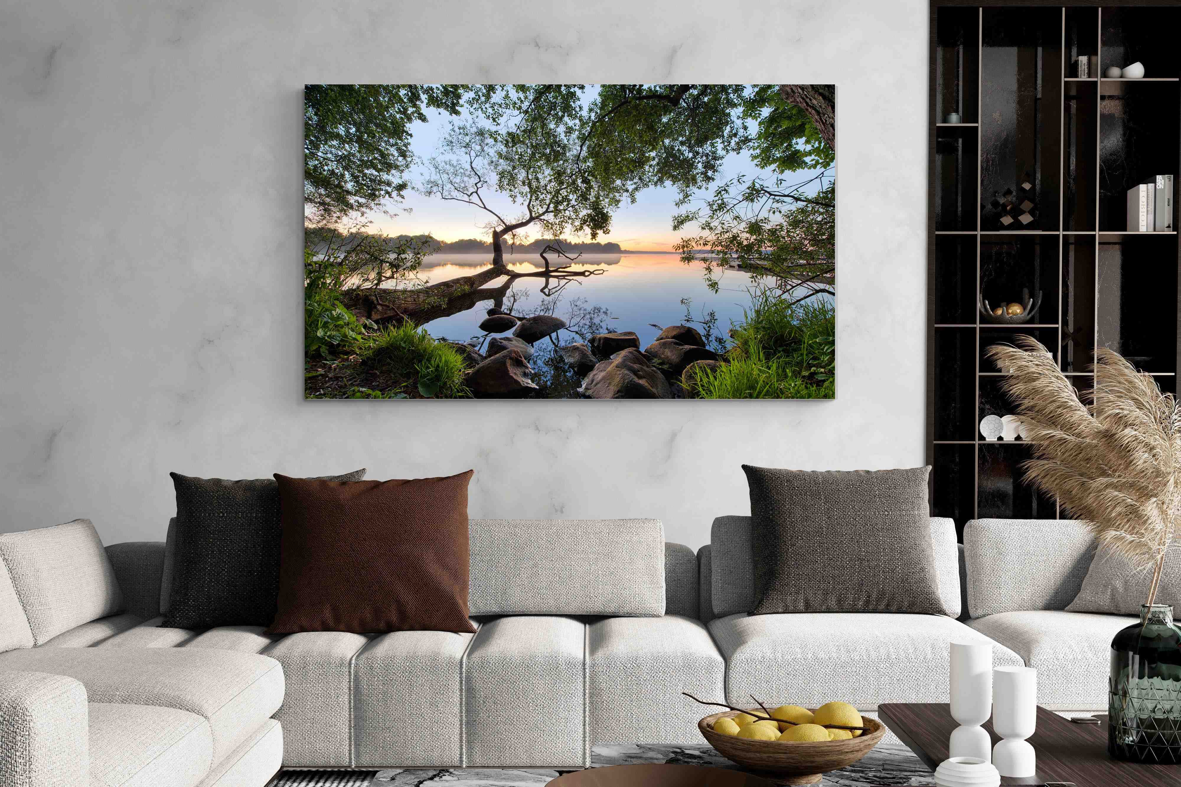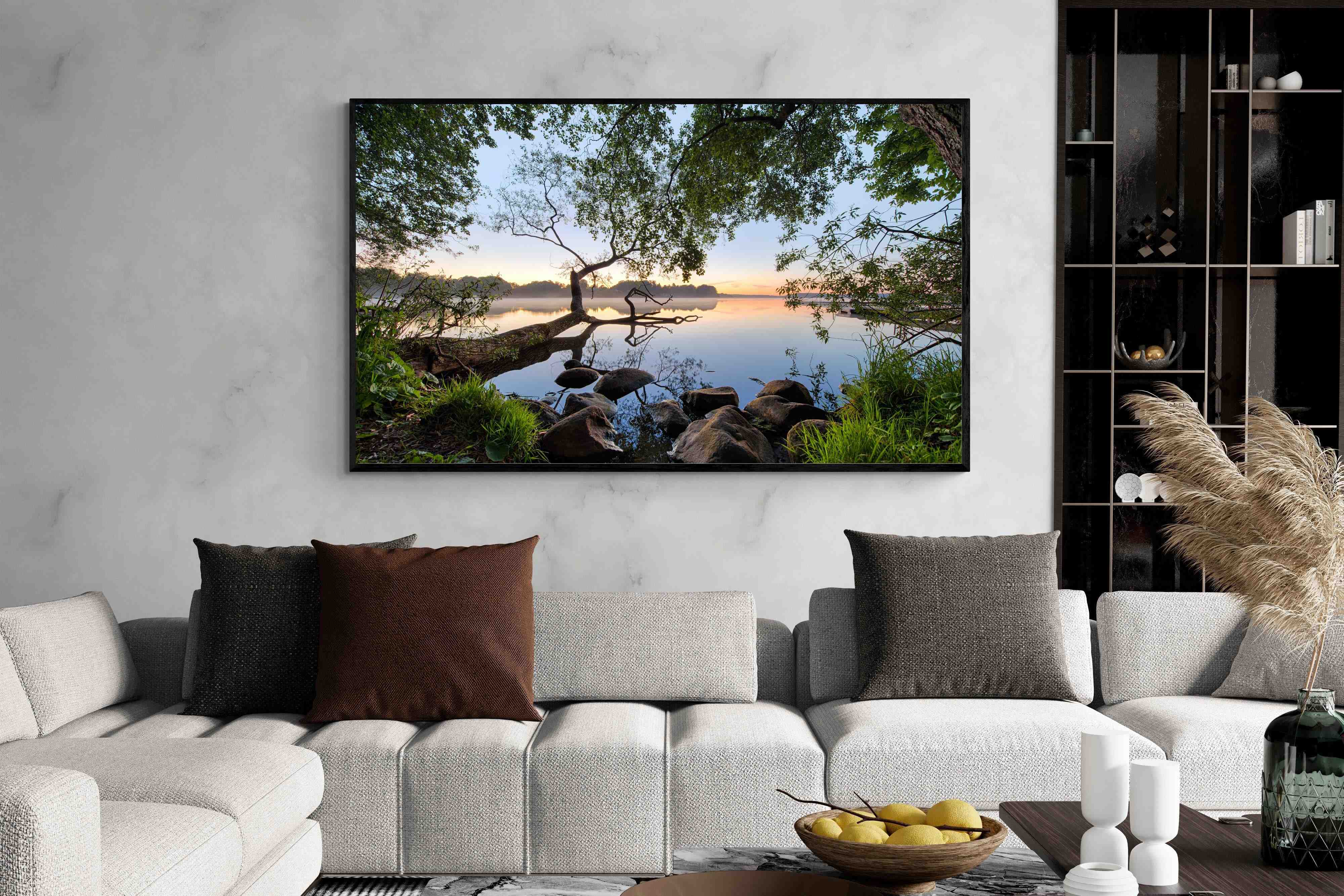 Calm and reflective, this peaceful lakeside scene captures still water, soft light and natural framing from surrounding trees. The gentle tones and balanced composition create a sense of quiet and space. Ideal for bedrooms, offices or relaxation areas, it adds depth, calm and a grounding connection to nature within contemporary interiors.