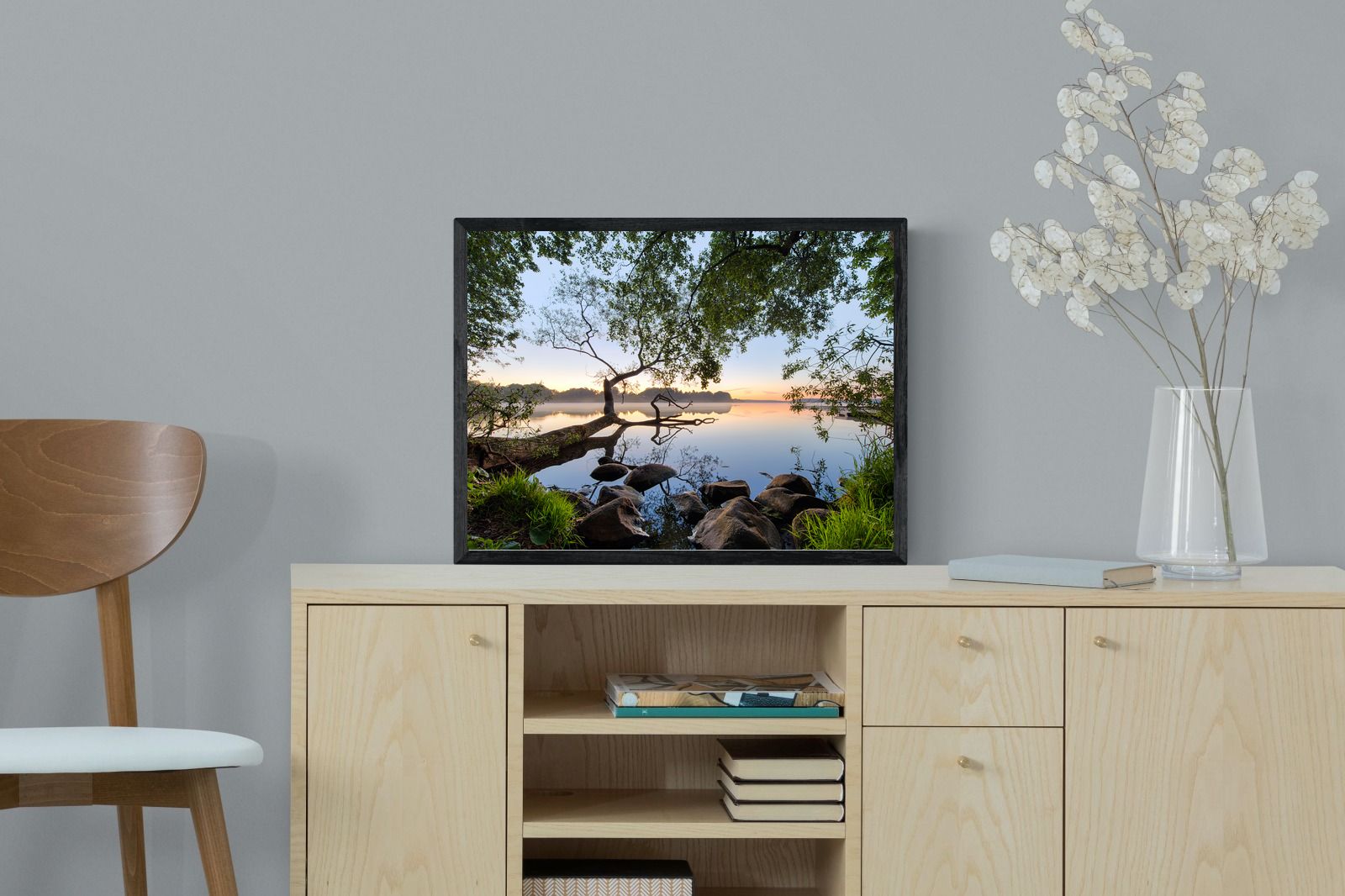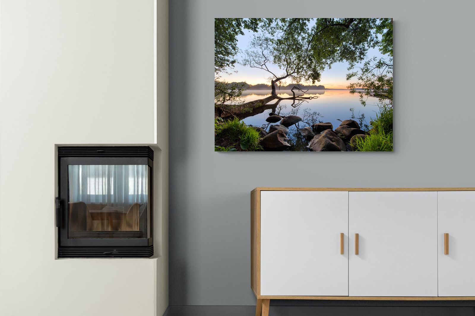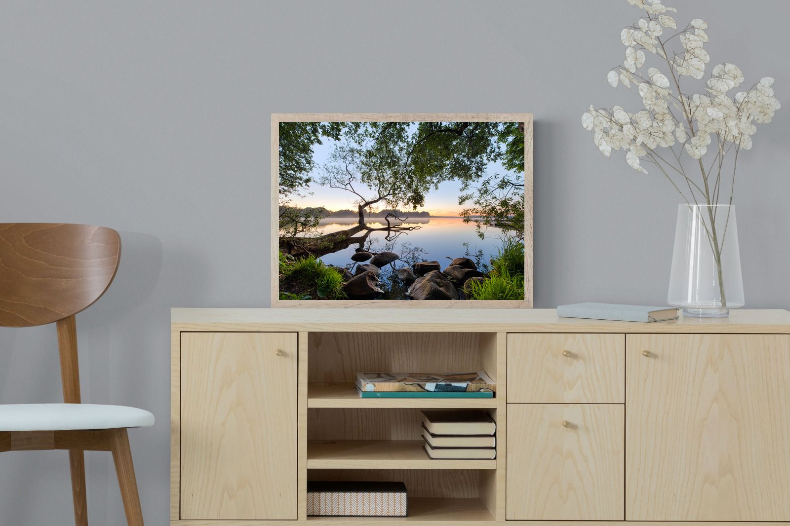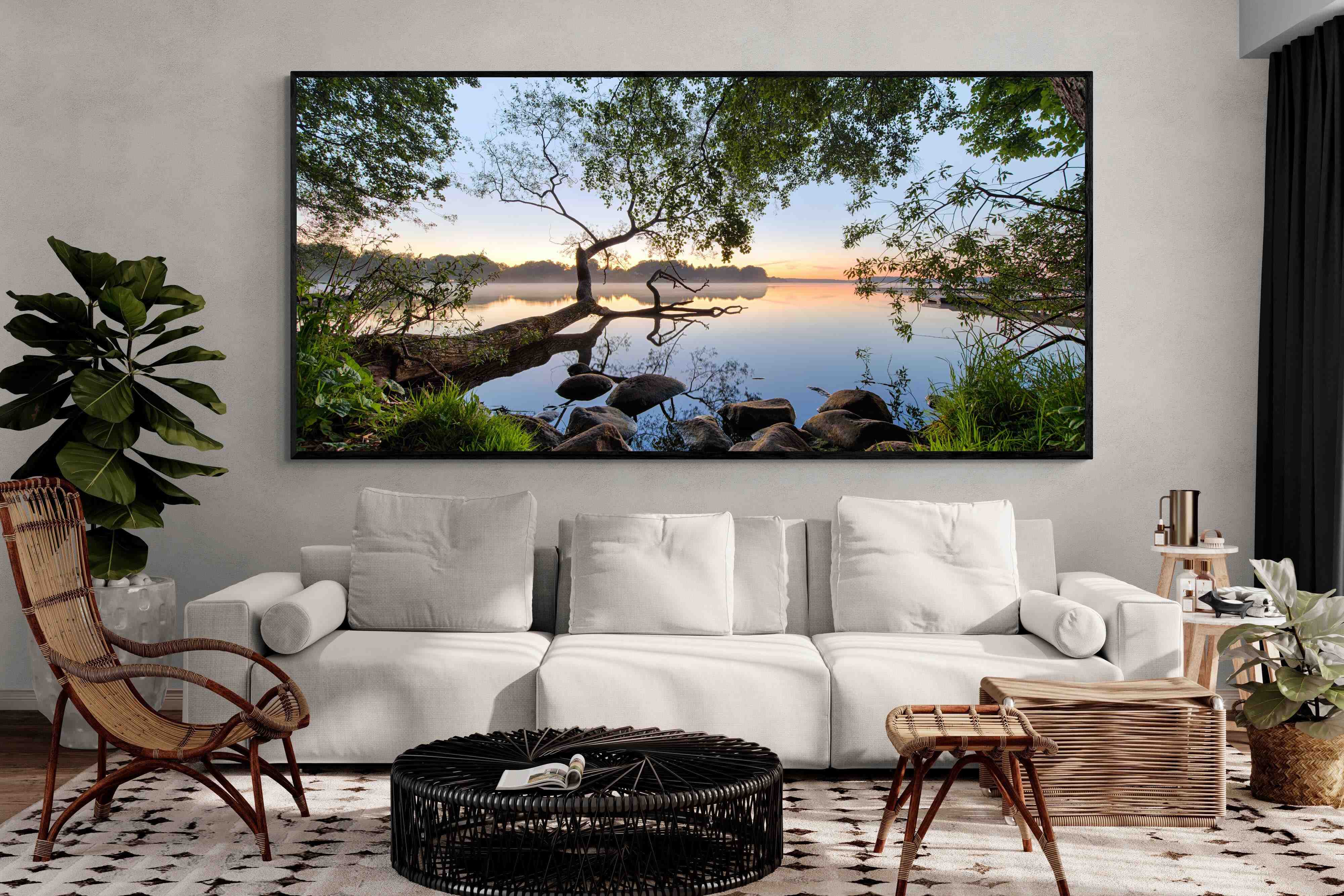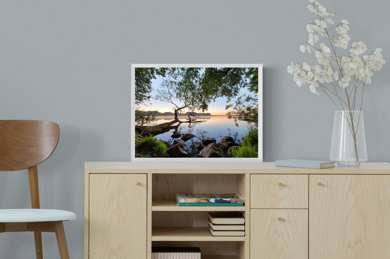 Calm and reflective, this peaceful lakeside scene captures still water, soft light and natural framing from surrounding trees. The gentle tones and balanced composition create a sense of quiet and space. Ideal for bedrooms, offices or relaxation areas, it adds depth, calm and a grounding connection to nature within contemporary interiors.