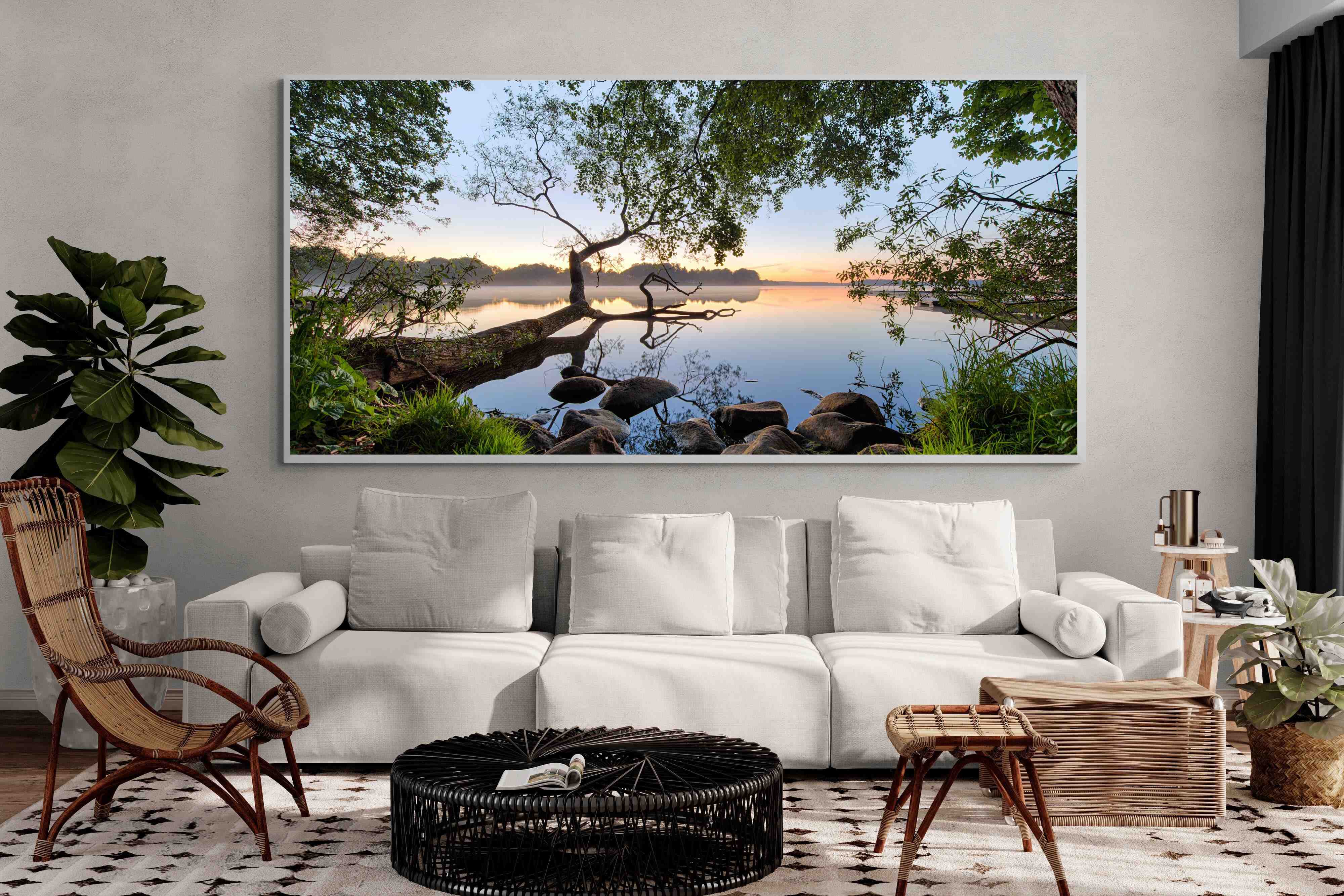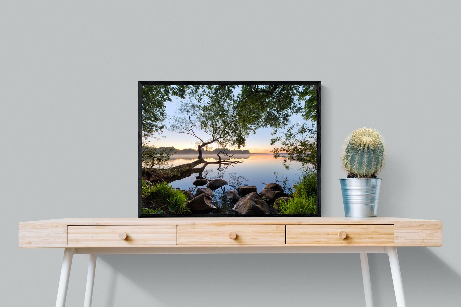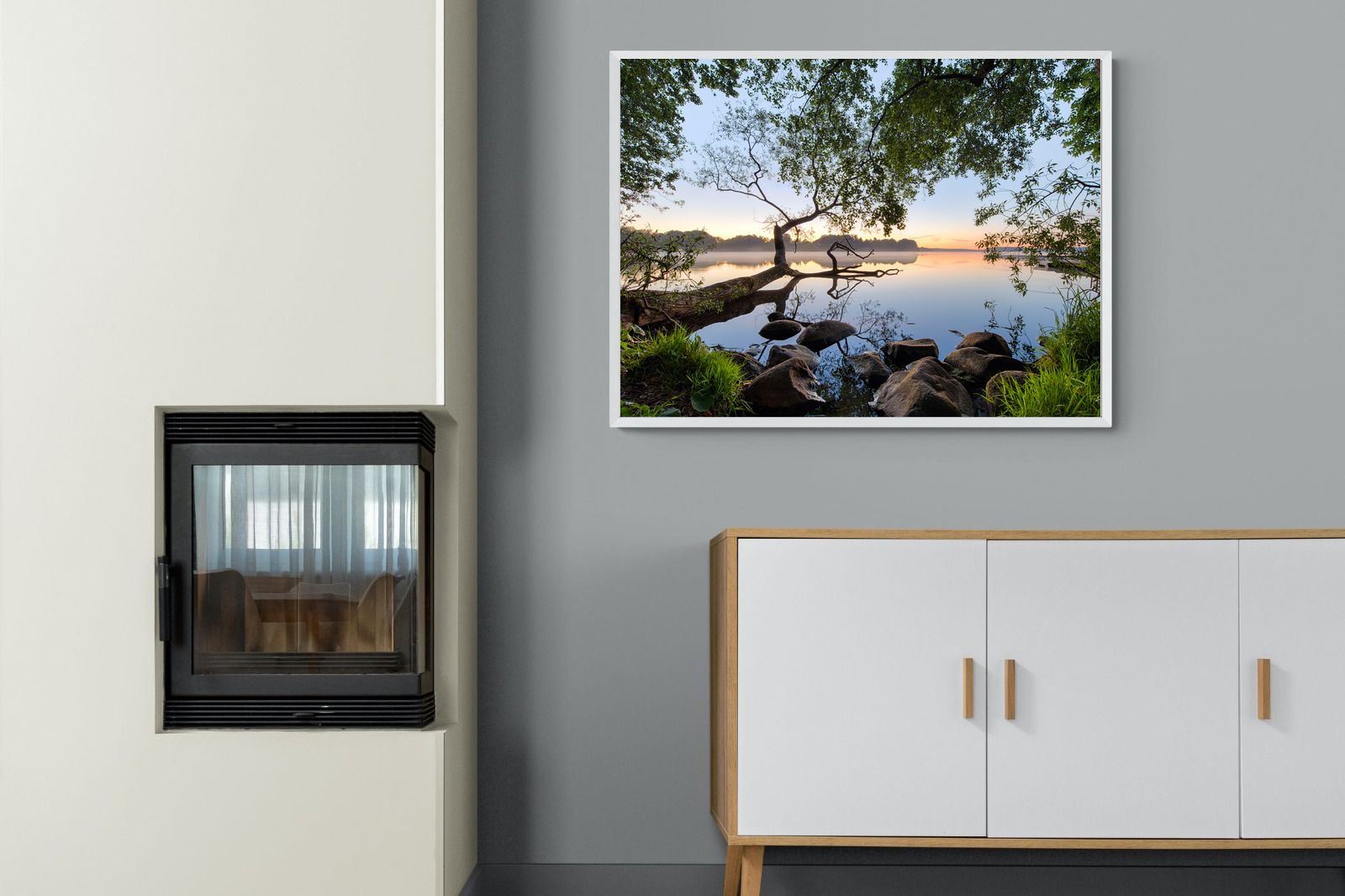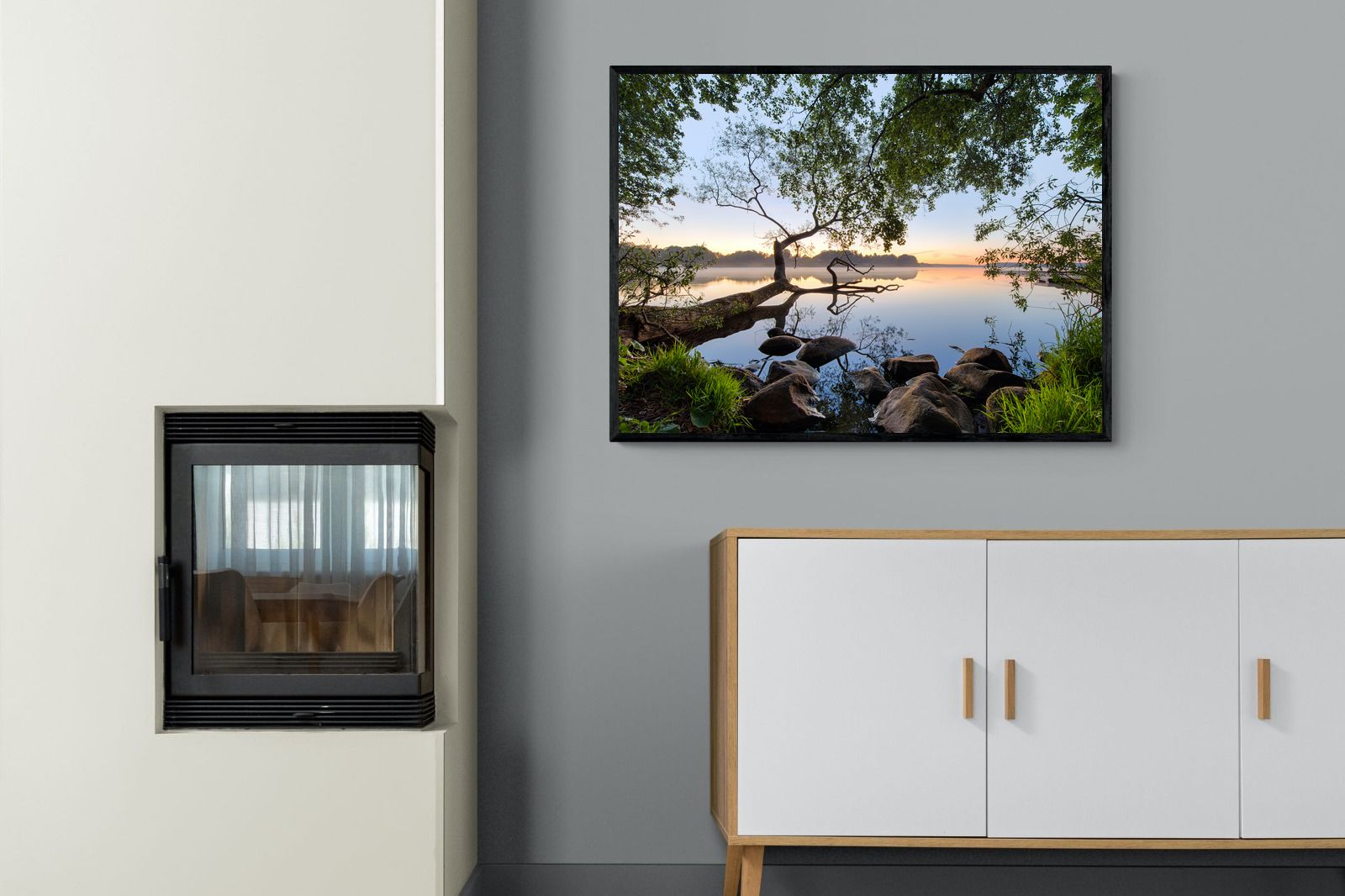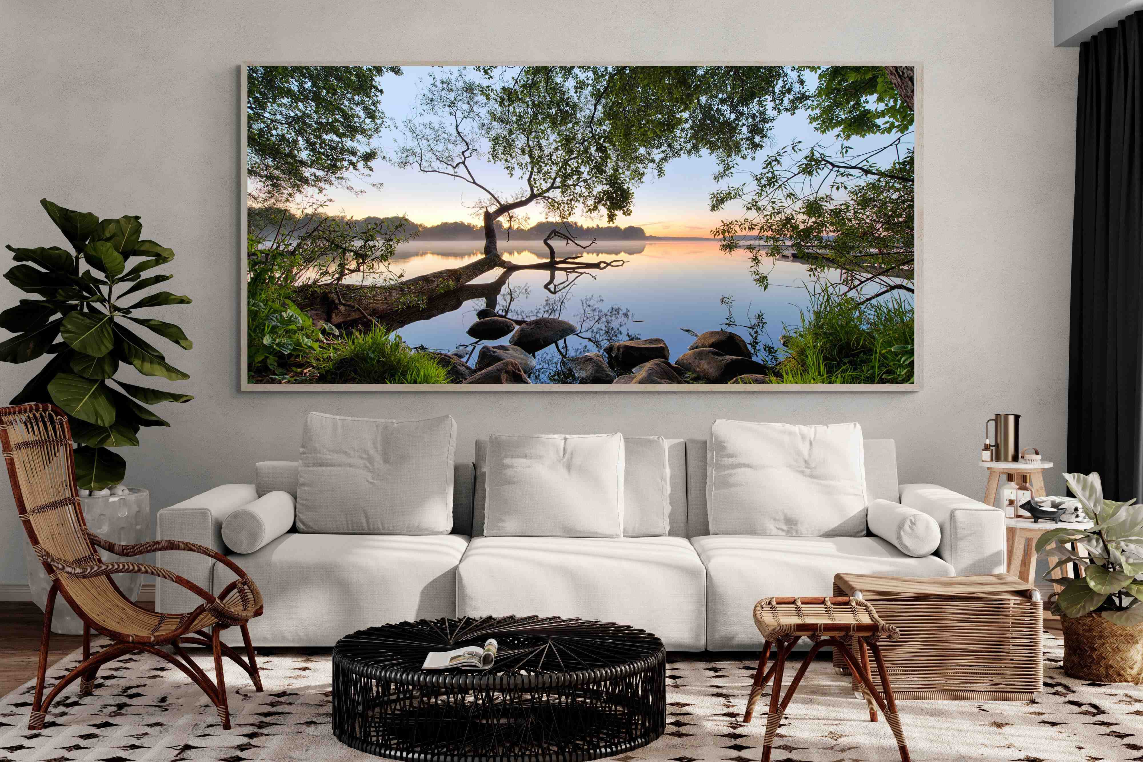 Calm and reflective, this peaceful lakeside scene captures still water, soft light and natural framing from surrounding trees. The gentle tones and balanced composition create a sense of quiet and space. Ideal for bedrooms, offices or relaxation areas, it adds depth, calm and a grounding connection to nature within contemporary interiors.