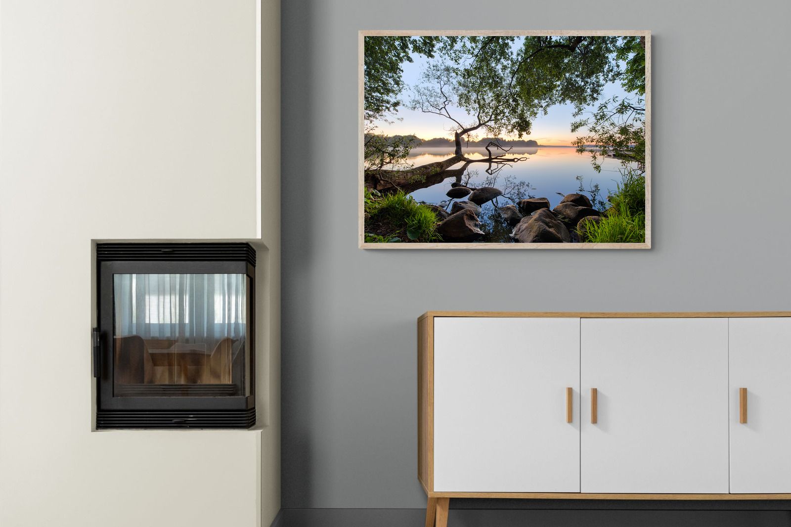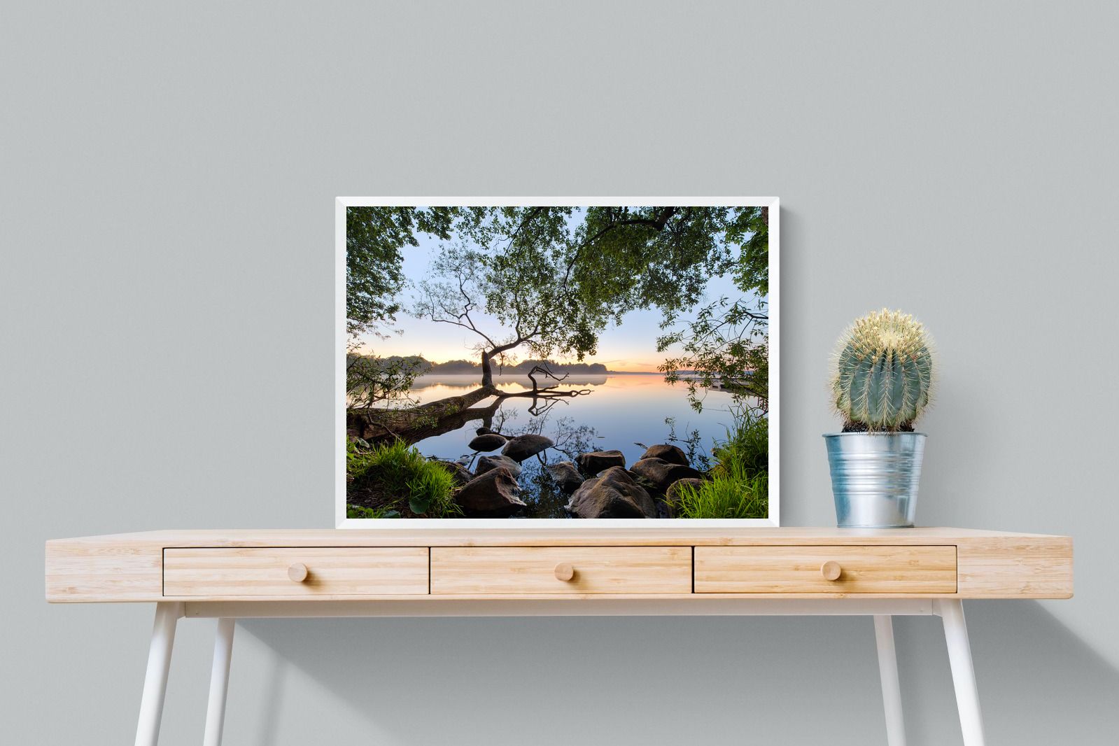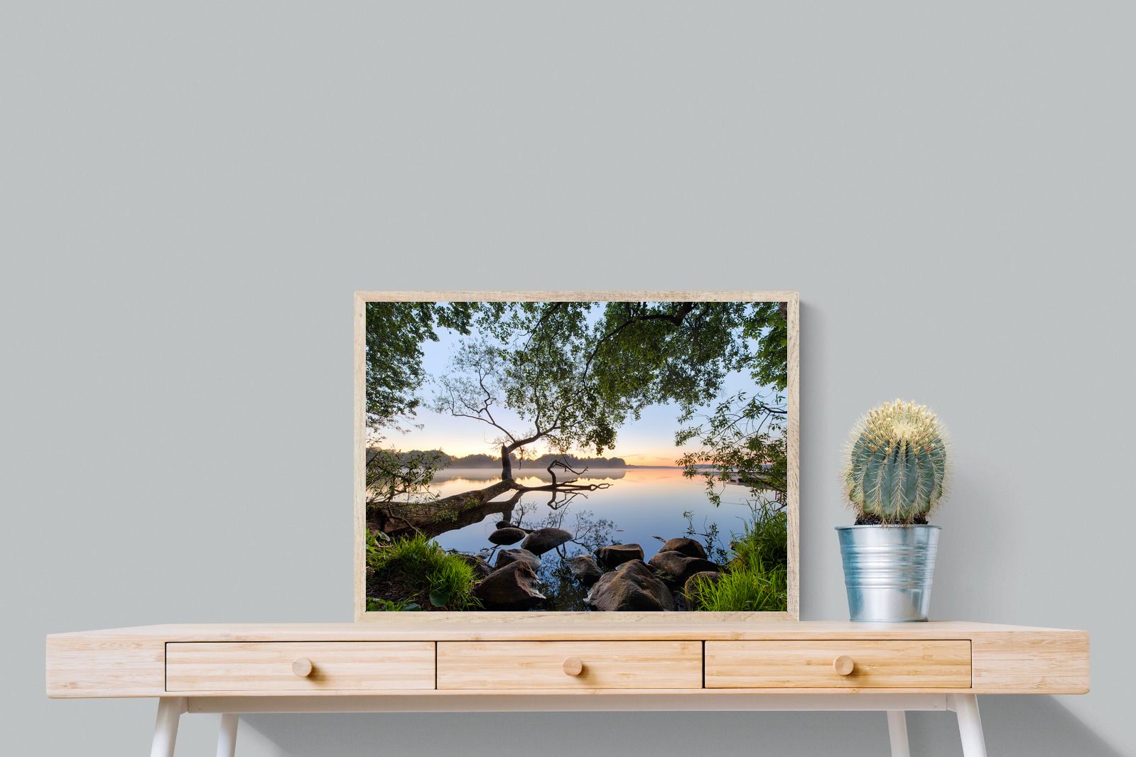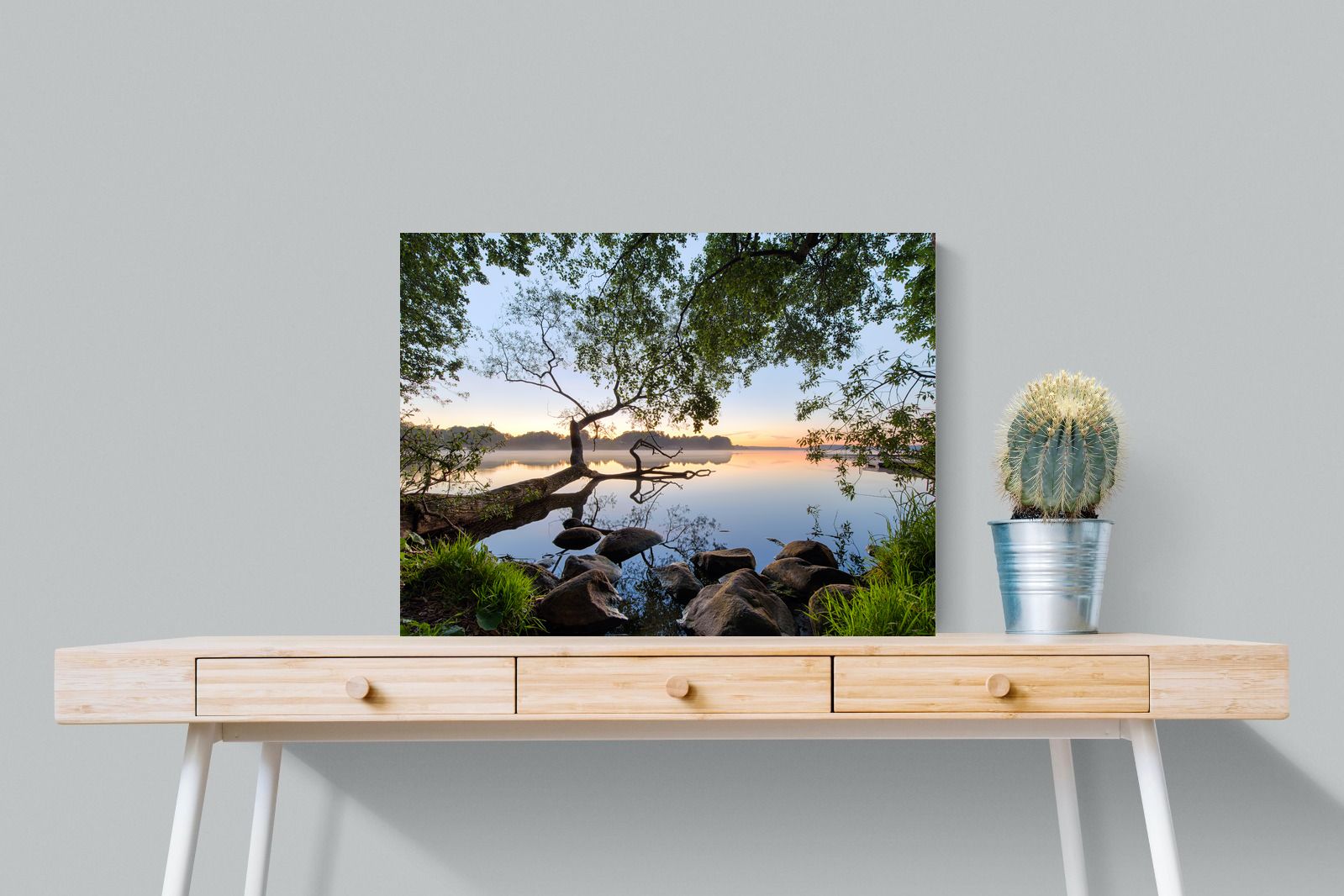 Calm and reflective, this peaceful lakeside scene captures still water, soft light and natural framing from surrounding trees. The gentle tones and balanced composition create a sense of quiet and space. Ideal for bedrooms, offices or relaxation areas, it adds depth, calm and a grounding connection to nature within contemporary interiors.