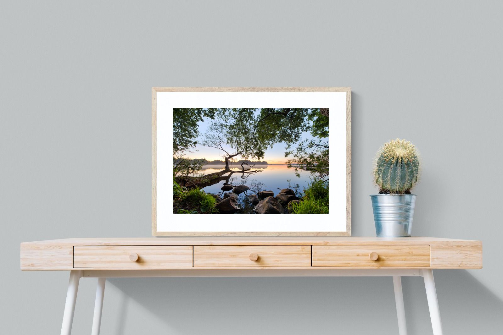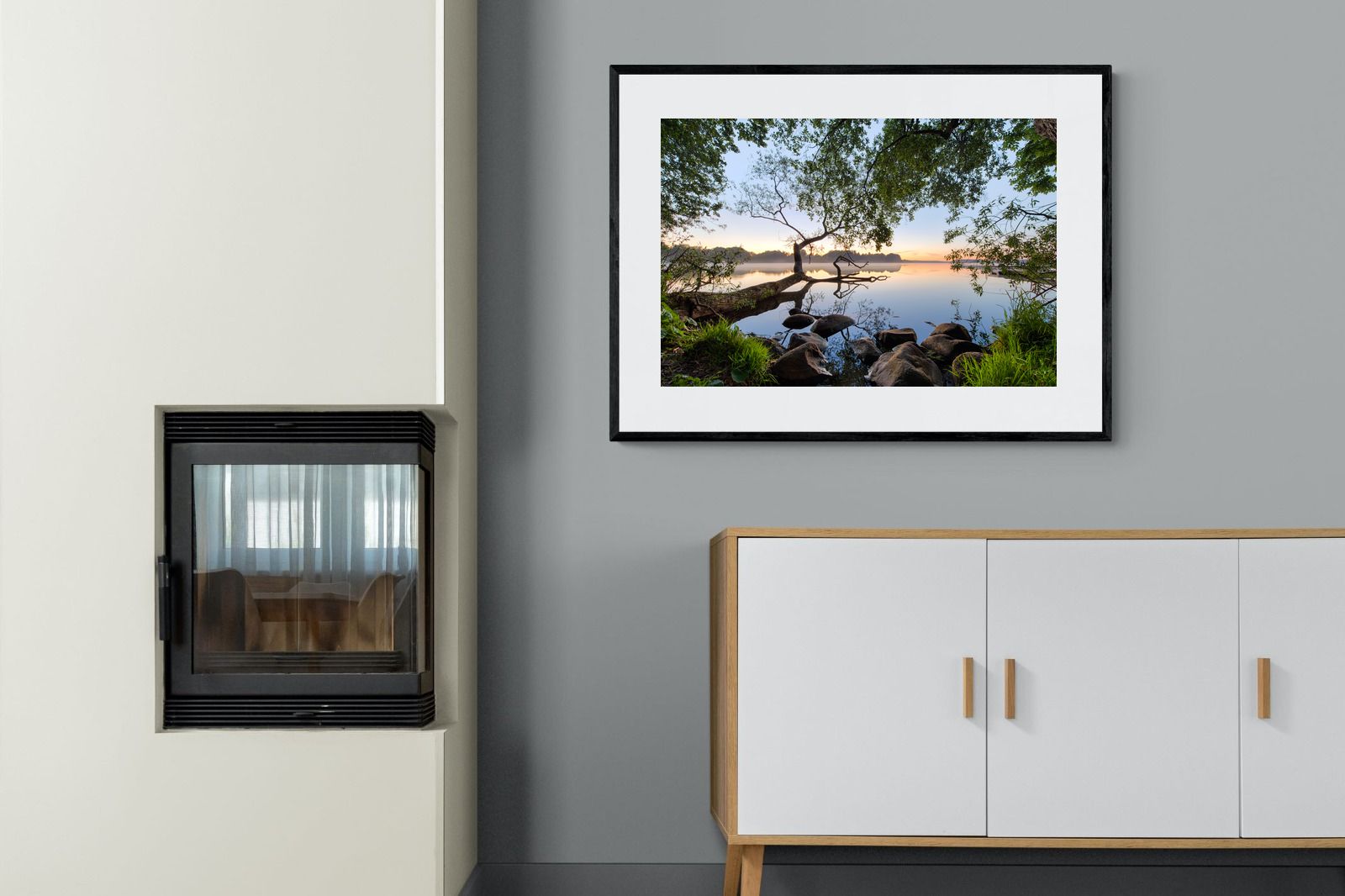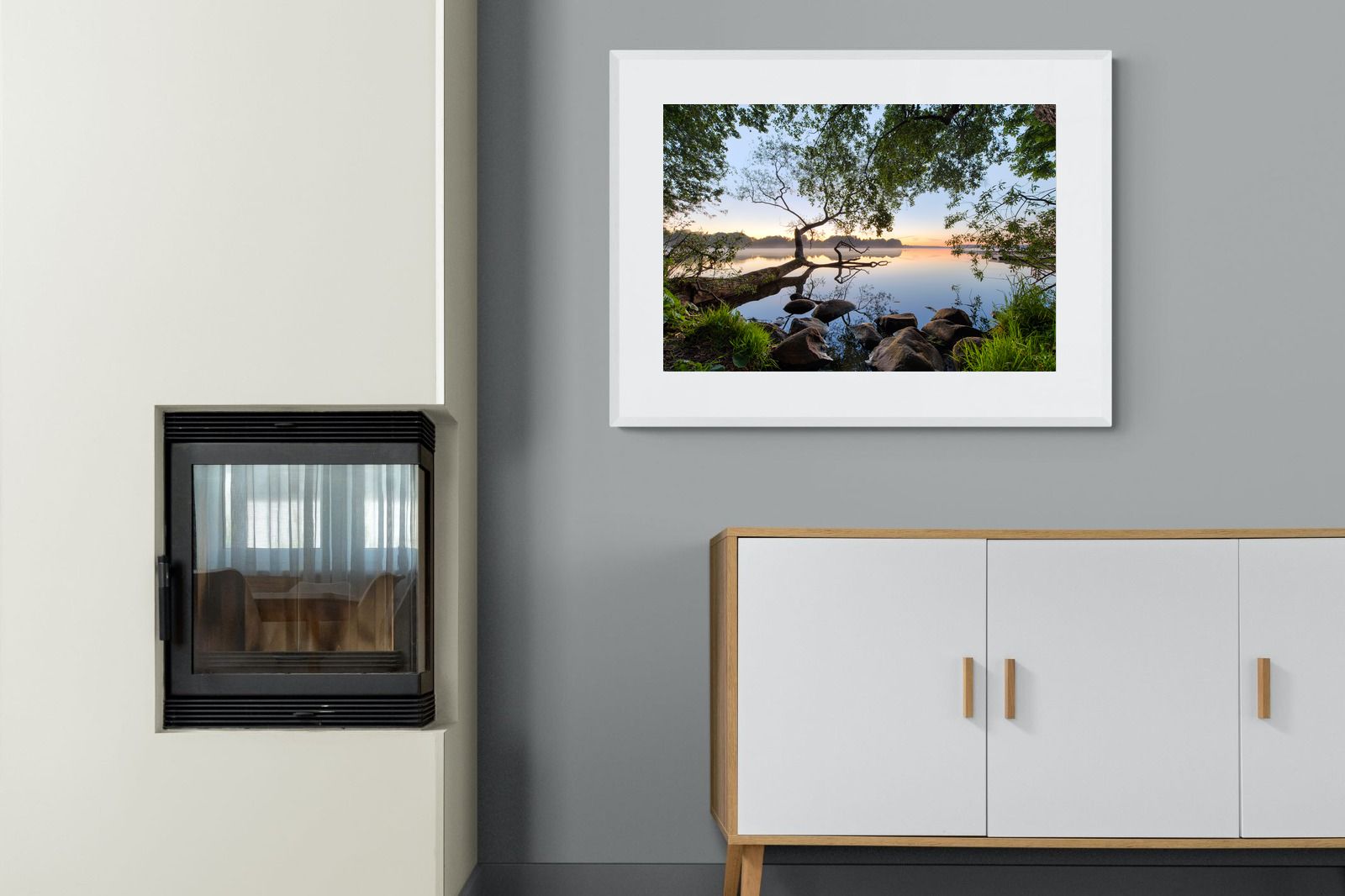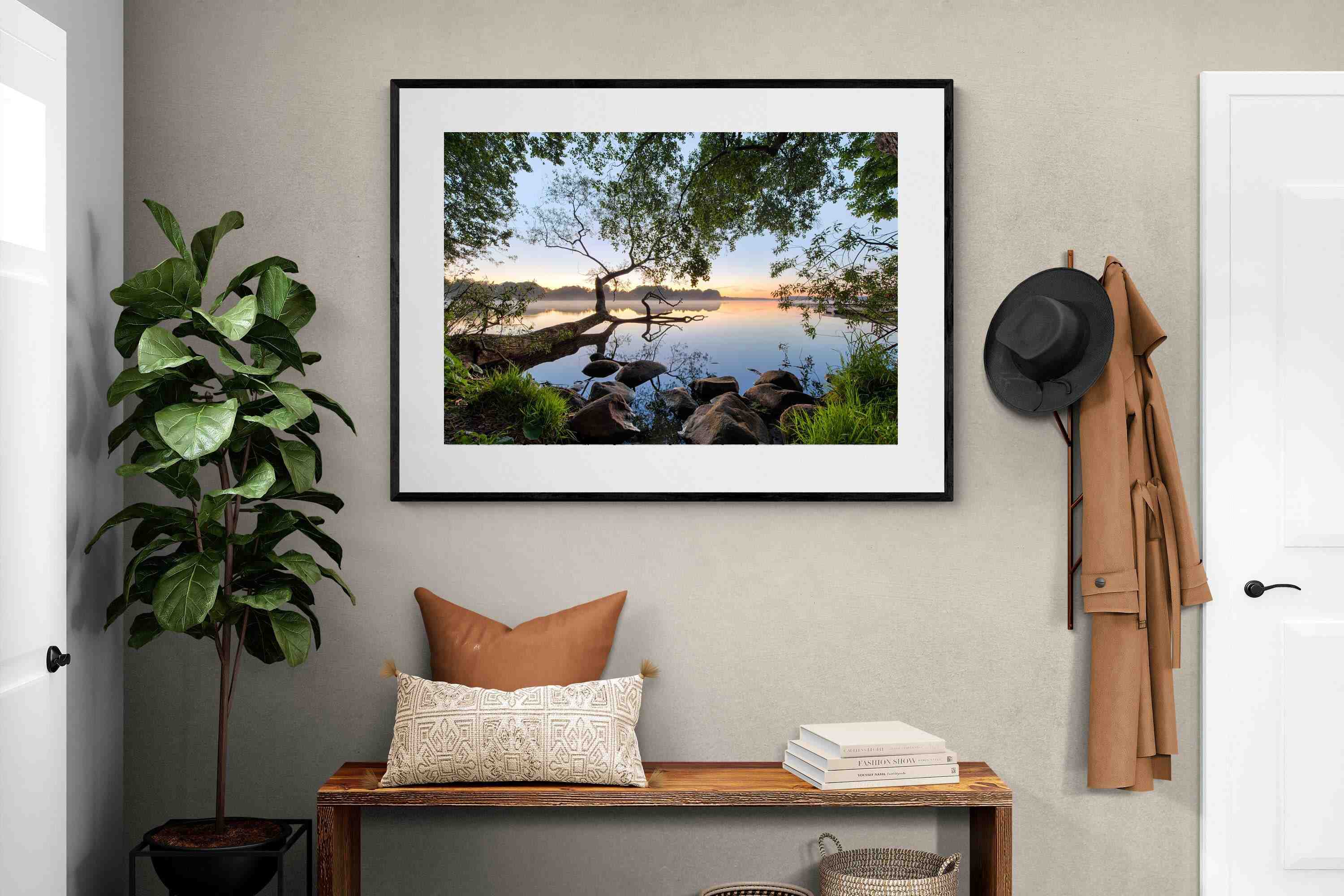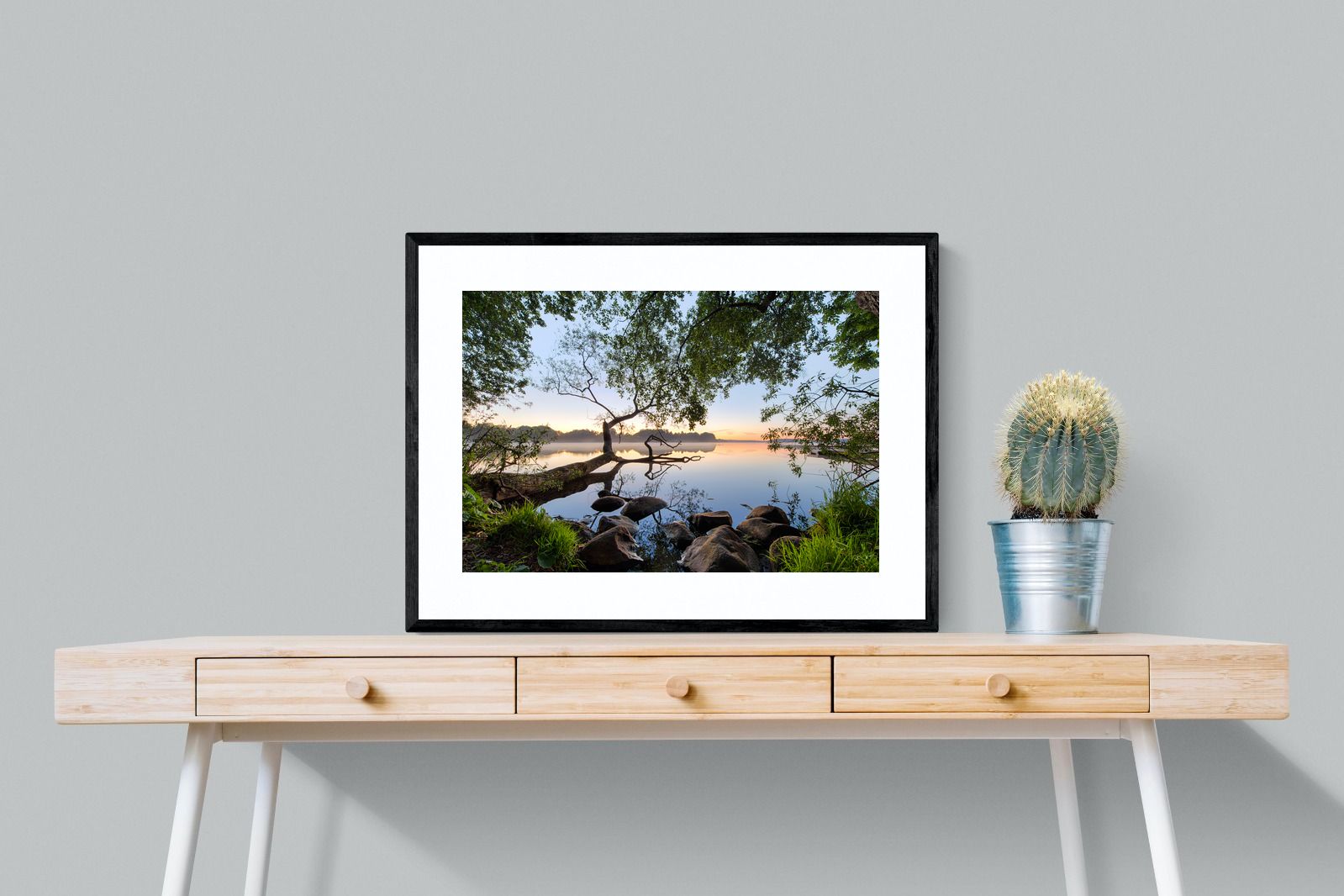 Calm and reflective, this peaceful lakeside scene captures still water, soft light and natural framing from surrounding trees. The gentle tones and balanced composition create a sense of quiet and space. Ideal for bedrooms, offices or relaxation areas, it adds depth, calm and a grounding connection to nature within contemporary interiors.