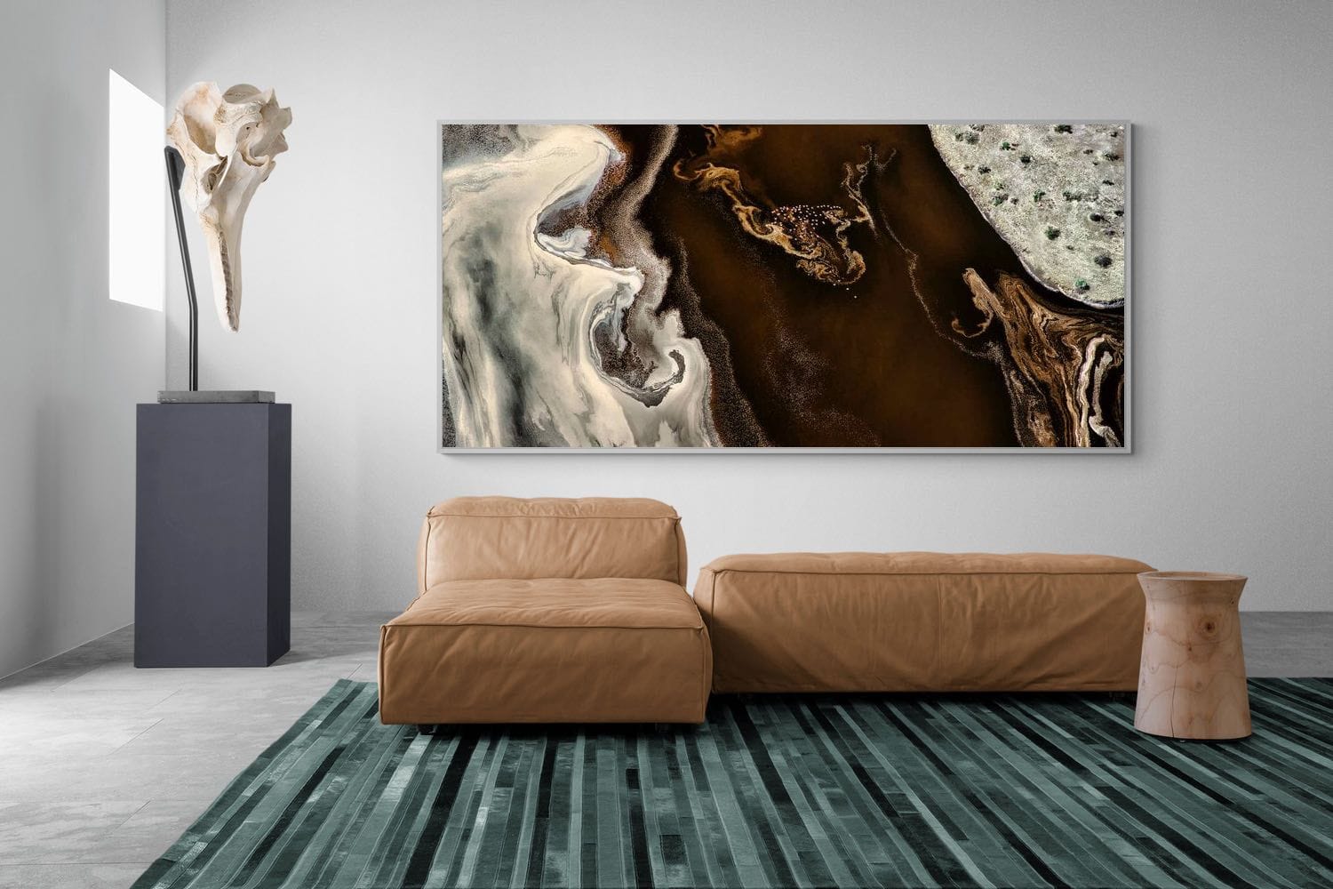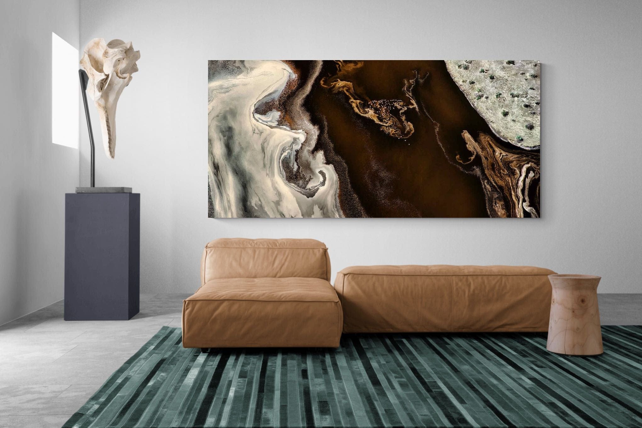 From above, Kenyan rivers of dark earth and pale sand create swirling patterns that resemble brushstrokes across the landscape. Deep browns, warm creams and subtle textures form an abstract composition shaped entirely by nature. This aerial photograph transforms natural terrain into contemporary visual art. Perfect for modern homes, offices or creative spaces, it brings rich earthy tones and a sense of organic movement to interior walls.