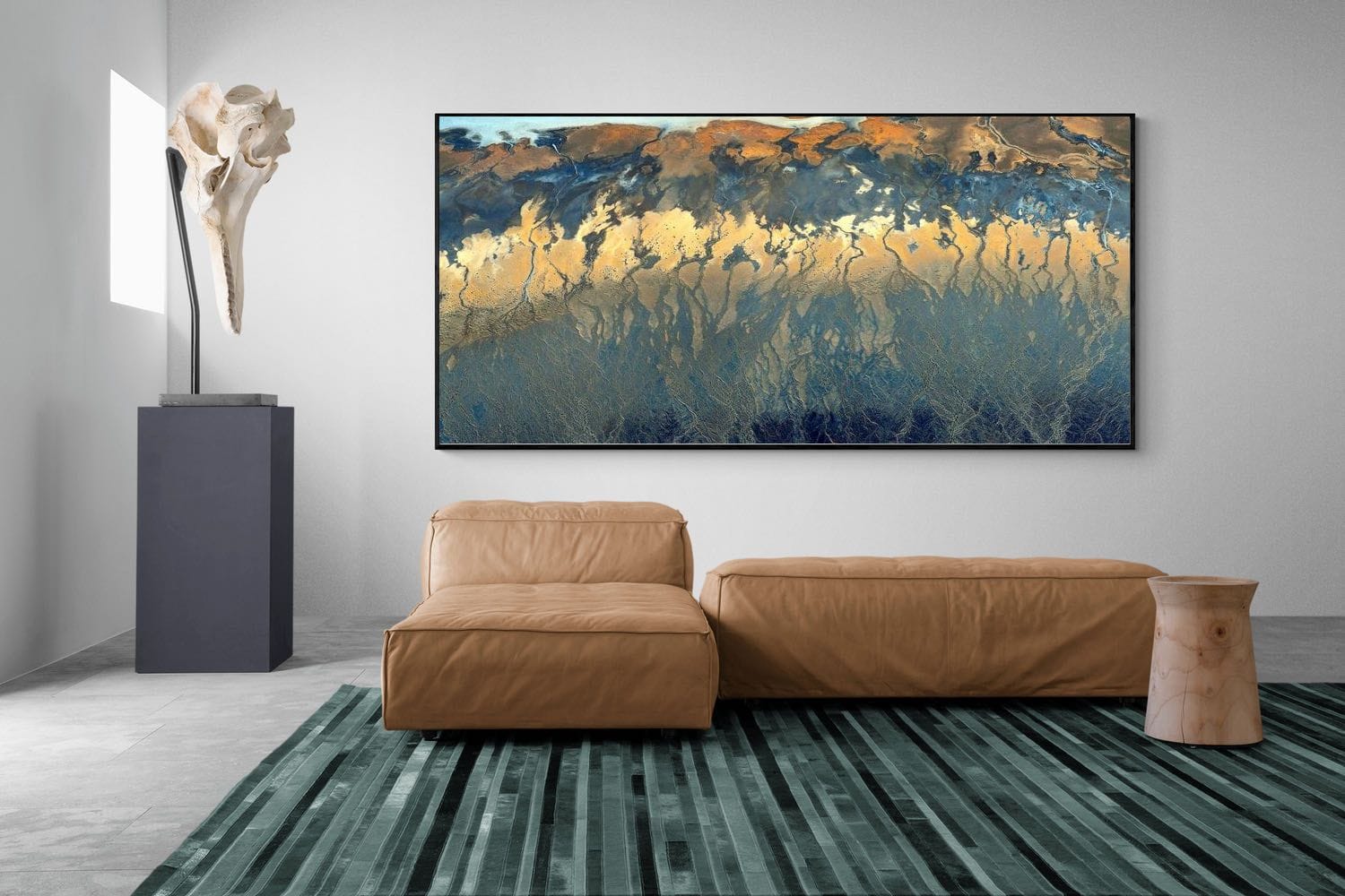 Branching waterways carve intricate paths through layers of earth, sand and mineral-rich sediment along a California delta. From above, the natural patterns resemble an elaborate tapestry, with warm ochres fading into cool blues and deep shadowed channels. The aerial perspective transforms geography into abstract art, revealing nature’s remarkable design. This striking landscape photograph adds depth, texture and a sophisticated palette to modern interiors, offices or contemporary gallery-style walls.