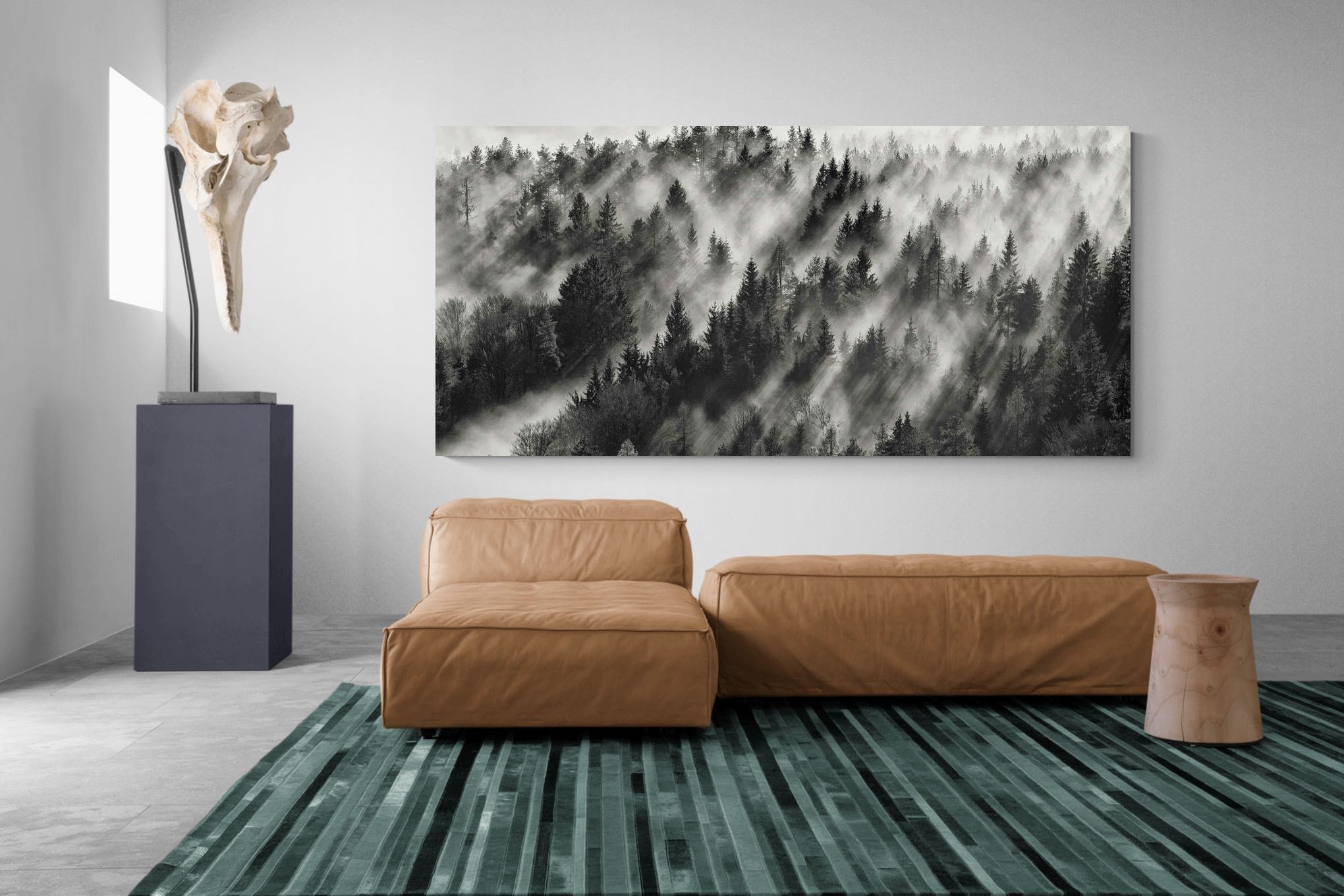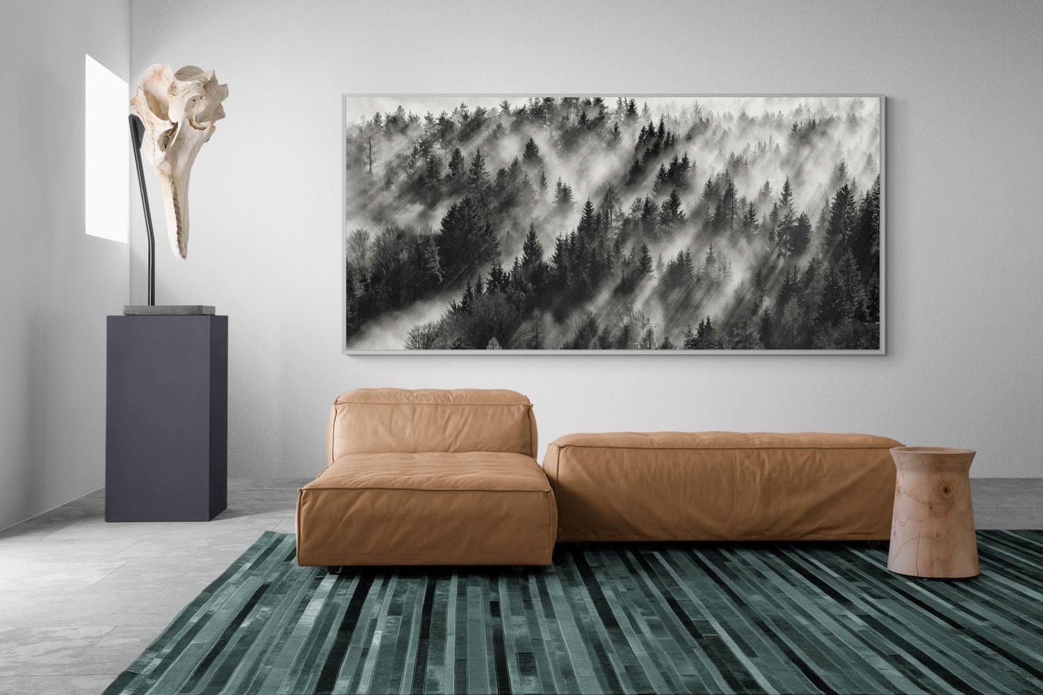 This atmospheric black-and-white landscape captures mist drifting through a dense Norwegian forest, with soft beams of light cutting across the treetops. The layered textures and tonal depth create a sense of calm, scale and quiet drama. Elegant and timeless, this piece suits minimalist, modern or Scandinavian-inspired interiors. Ideal for living rooms, bedrooms or offices, it brings a contemplative, nature-led mood without overpowering the space. Shot by Davorin Baloh