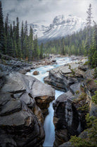 A dramatic mountain landscape captures a fast-flowing river cutting through rugged rock, framed by dense pine forest and snow-capped peaks beyond. The movement of water contrasts with the stillness of the surrounding terrain, creating depth and energy. Ideal for living rooms, offices, or nature-inspired interiors, it brings a sense of scale and calm. Its cool tones and layered composition make it a strong statement piece for spaces that favour natural, expansive scenery.