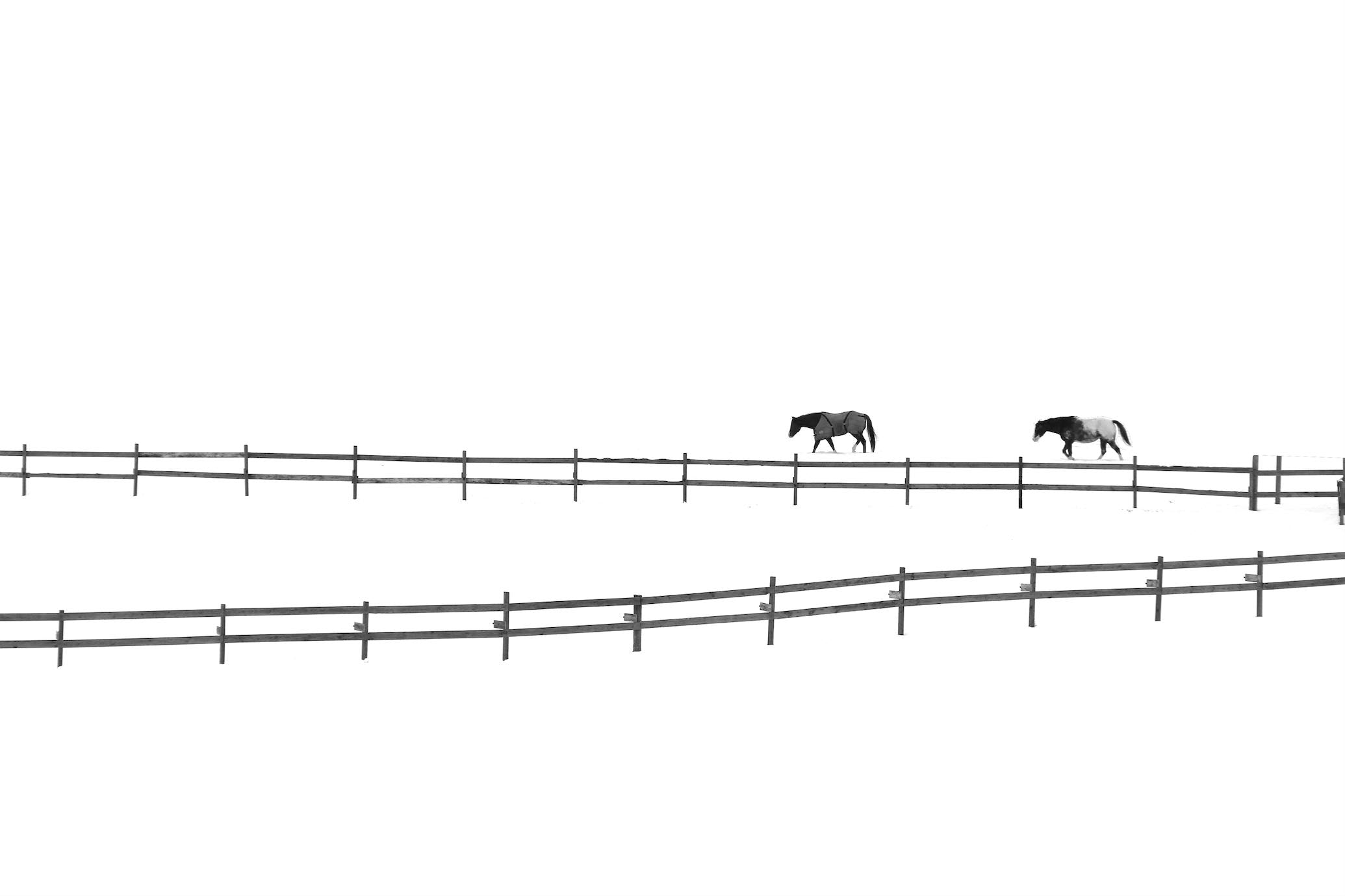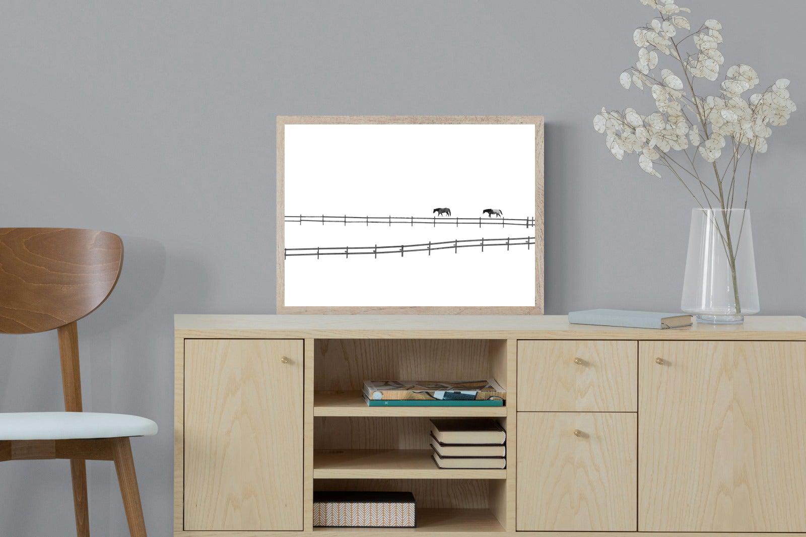A sparse, high-key landscape features two horses moving quietly along a fence line, reduced to simple shapes against a bright, open backdrop. The composition emphasises space, rhythm and stillness, creating a calm, almost abstract scene. Ideal for modern or minimalist interiors, this piece introduces a sense of openness and balance, working well in living areas, hallways or bedrooms seeking a restrained focal point.
