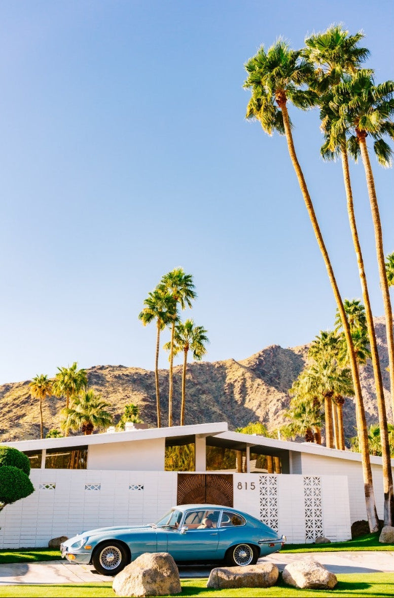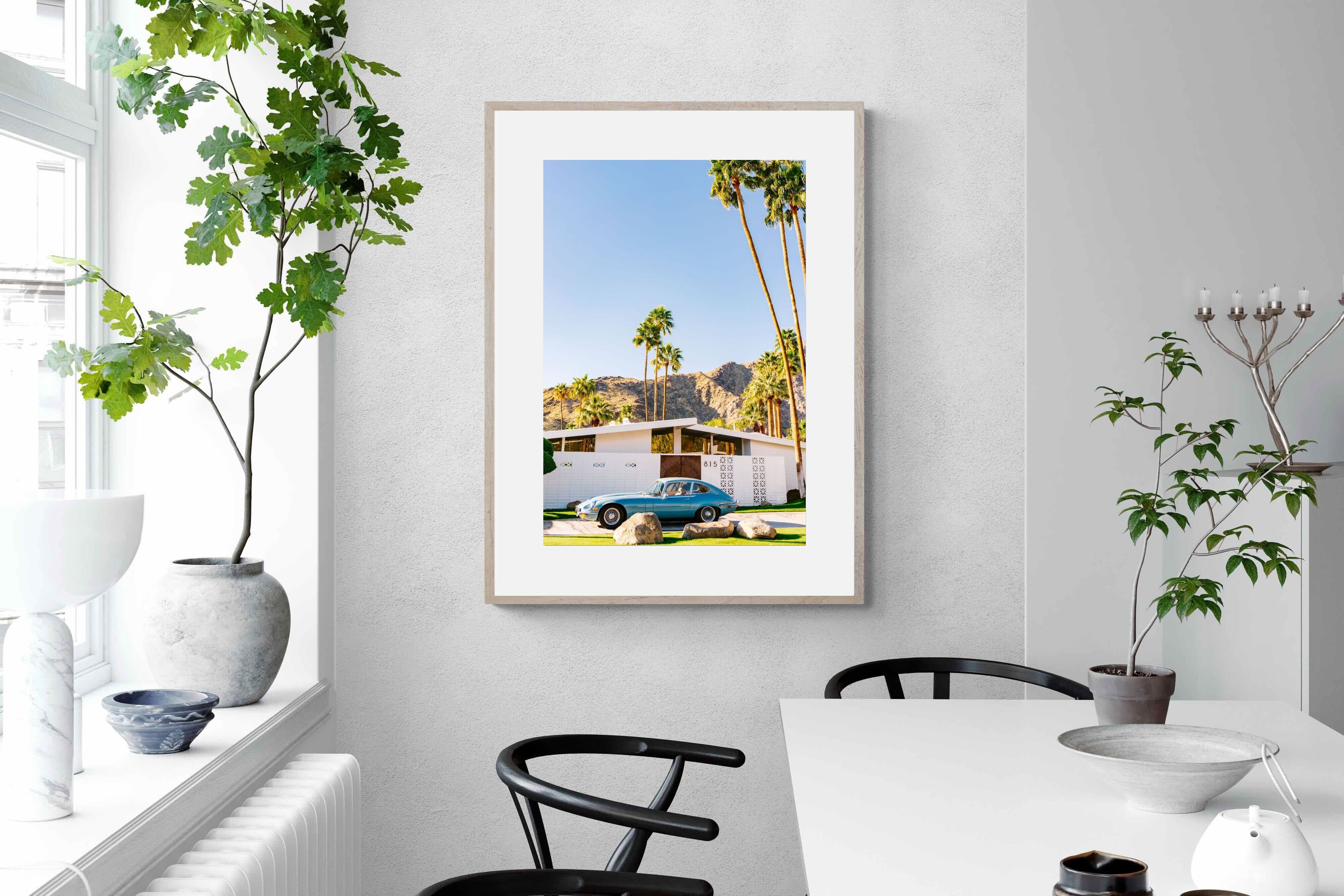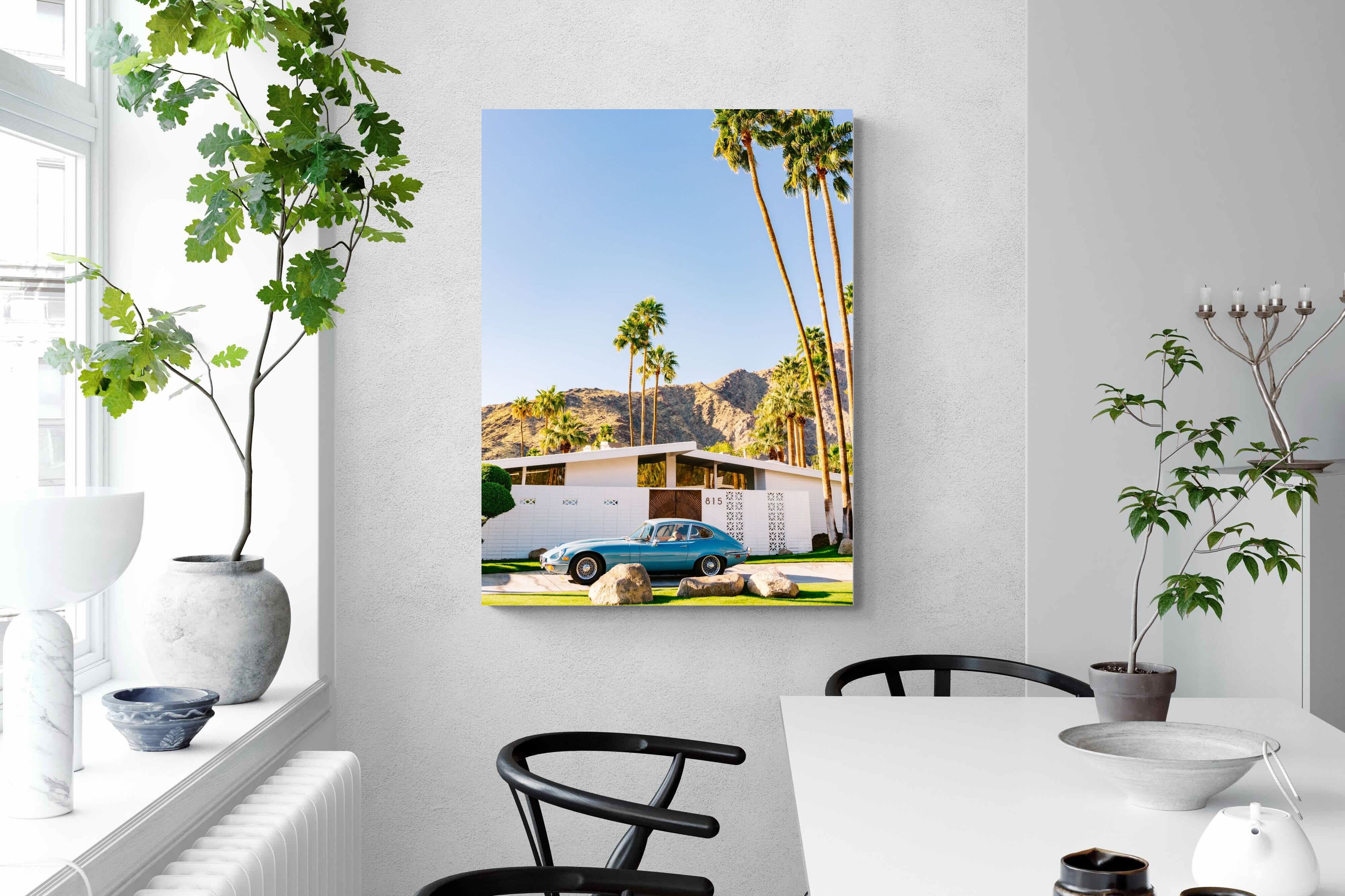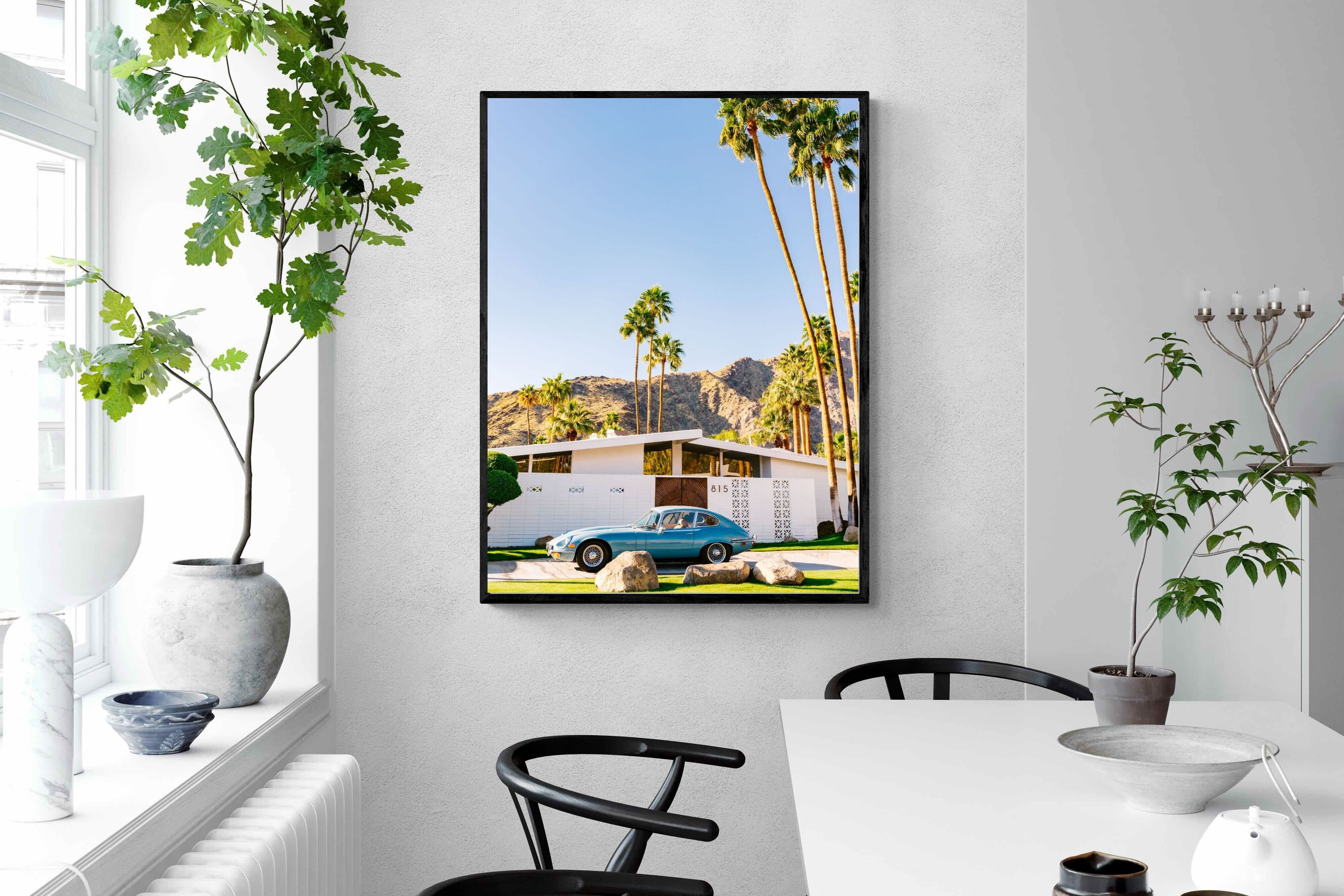 This vibrant photograph captures a vintage sports car parked before a mid-century modern home in sun-soaked Palm Springs. The clear blue sky and towering palms evoke timeless Californian glamour, perfect for retro, modern, or travel-inspired interiors. Ideal for living rooms, studies, or hallways, this print pairs beautifully with clean lines and warm wood tones. It’s a stylish nod to mid-century architecture and classic design, bringing sophisticated nostalgia and sunshine charm into your home.