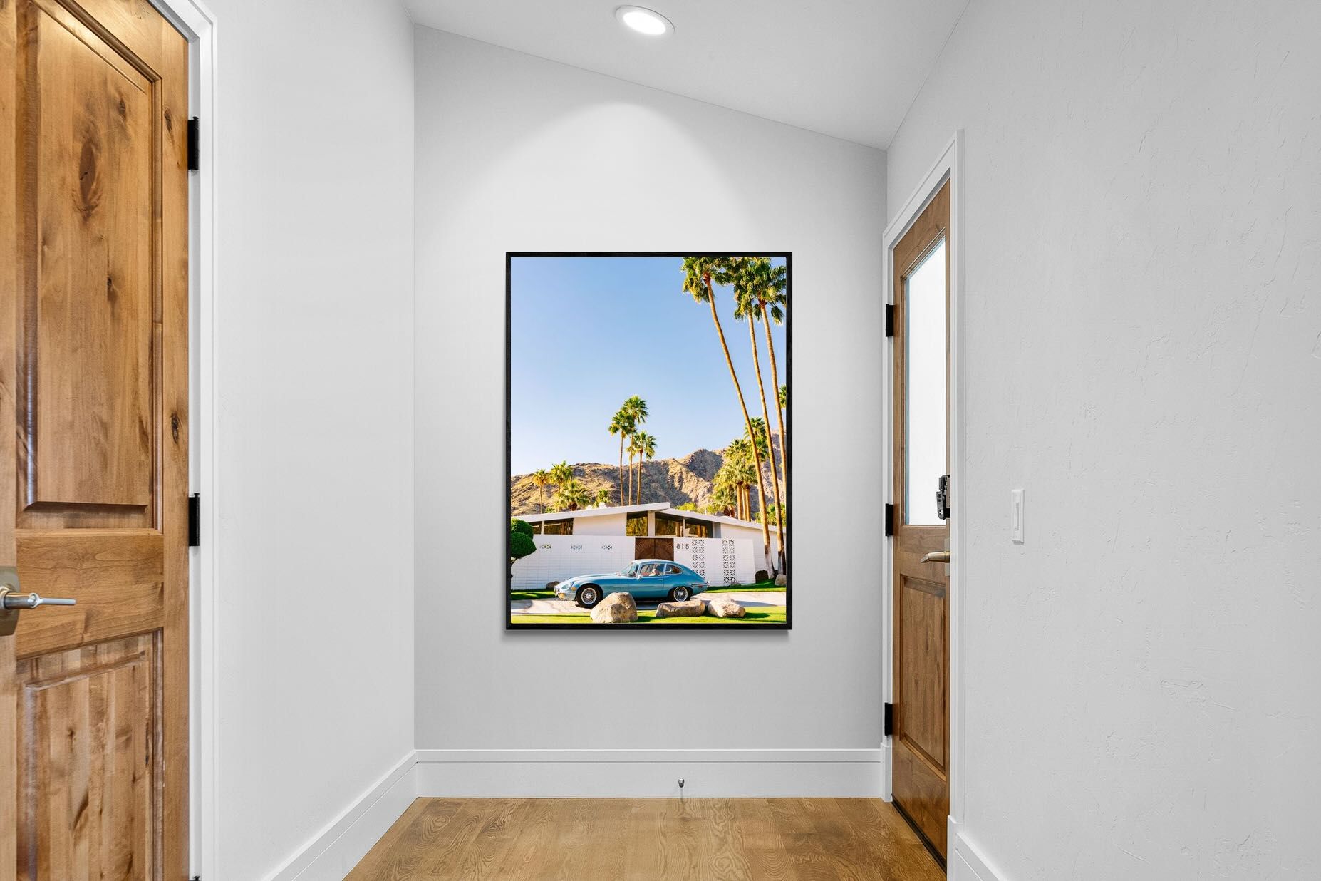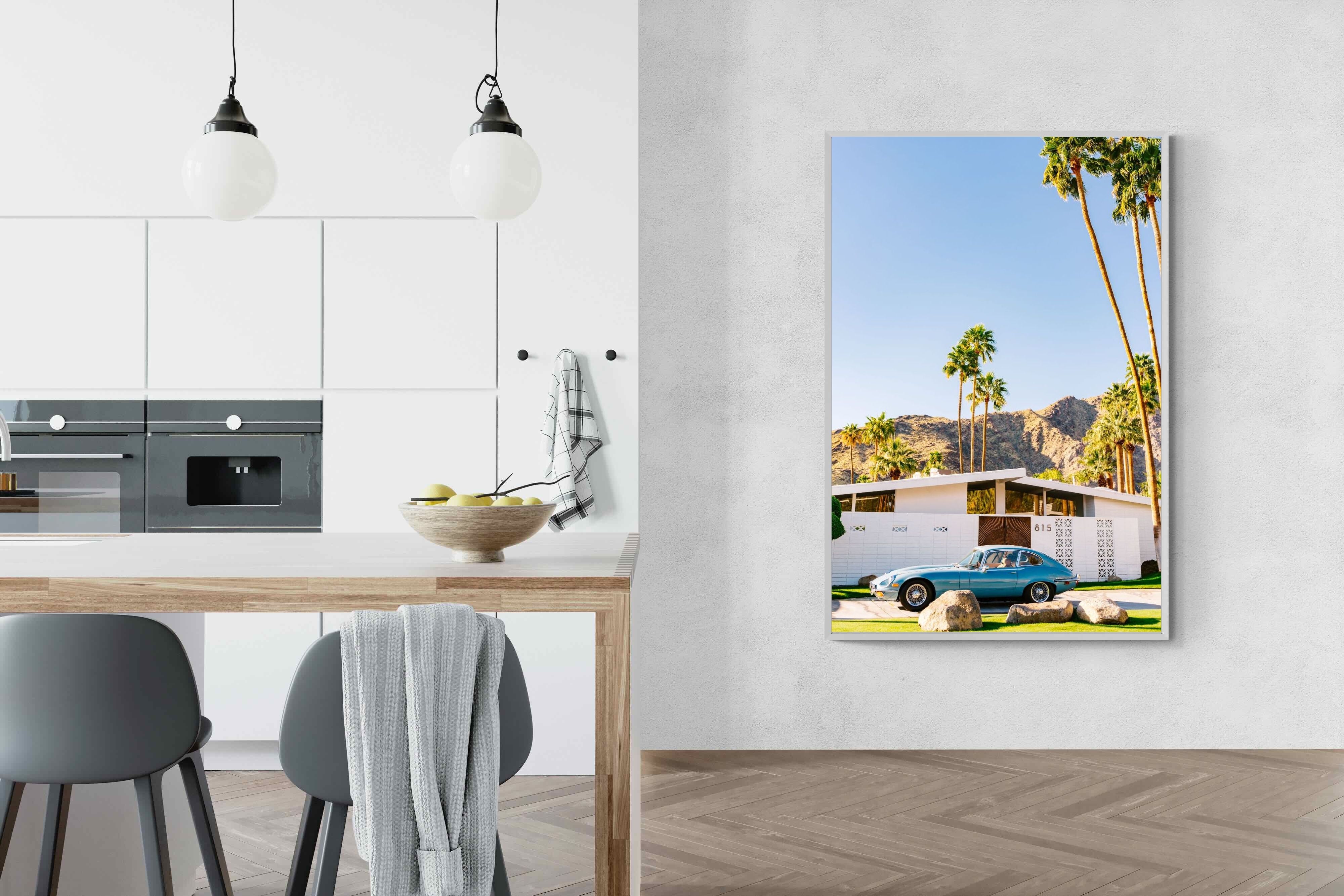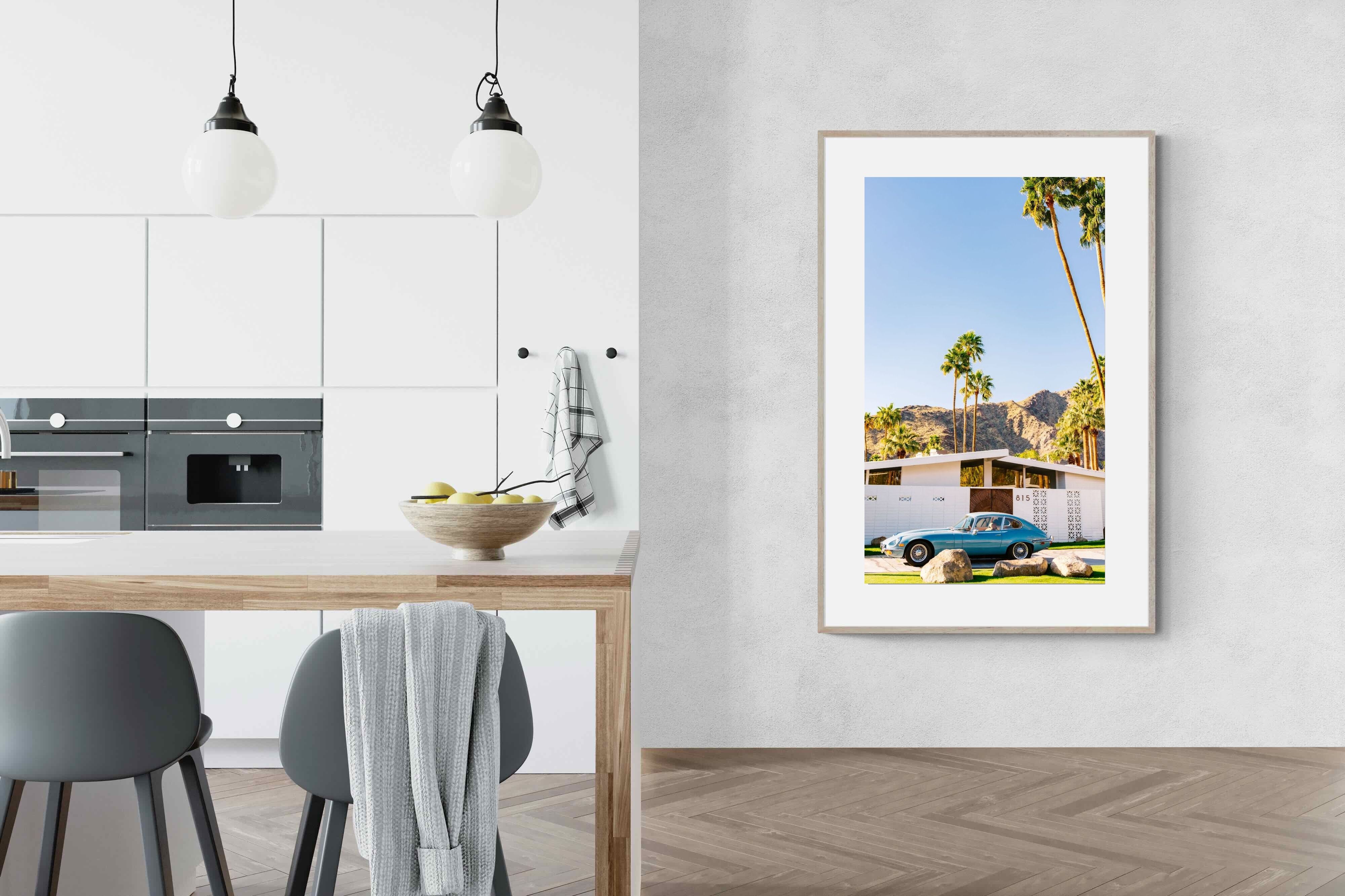 This vibrant photograph captures a vintage sports car parked before a mid-century modern home in sun-soaked Palm Springs. The clear blue sky and towering palms evoke timeless Californian glamour, perfect for retro, modern, or travel-inspired interiors. Ideal for living rooms, studies, or hallways, this print pairs beautifully with clean lines and warm wood tones. It’s a stylish nod to mid-century architecture and classic design, bringing sophisticated nostalgia and sunshine charm into your home.