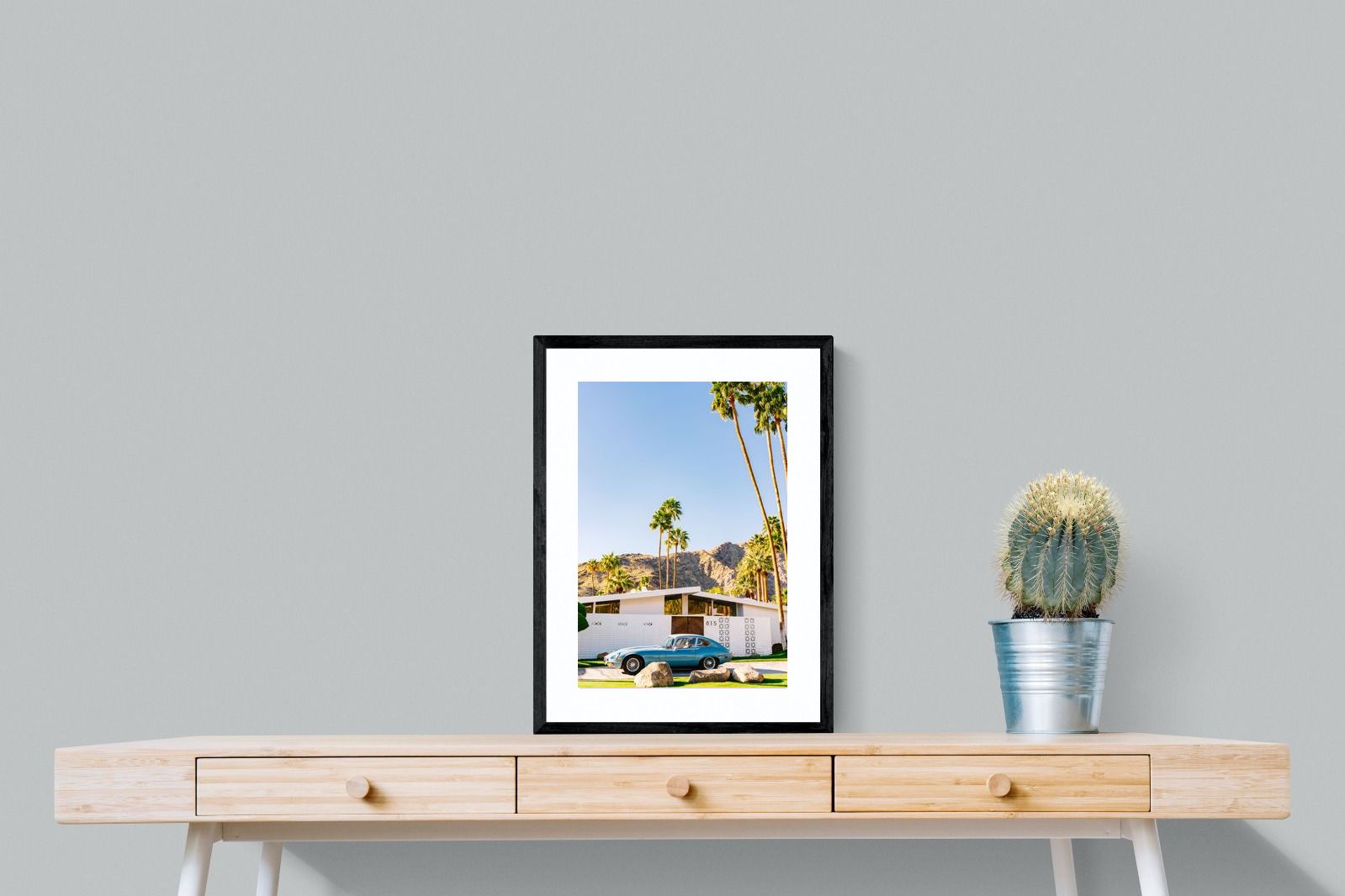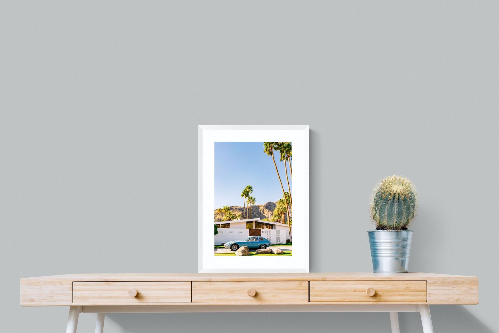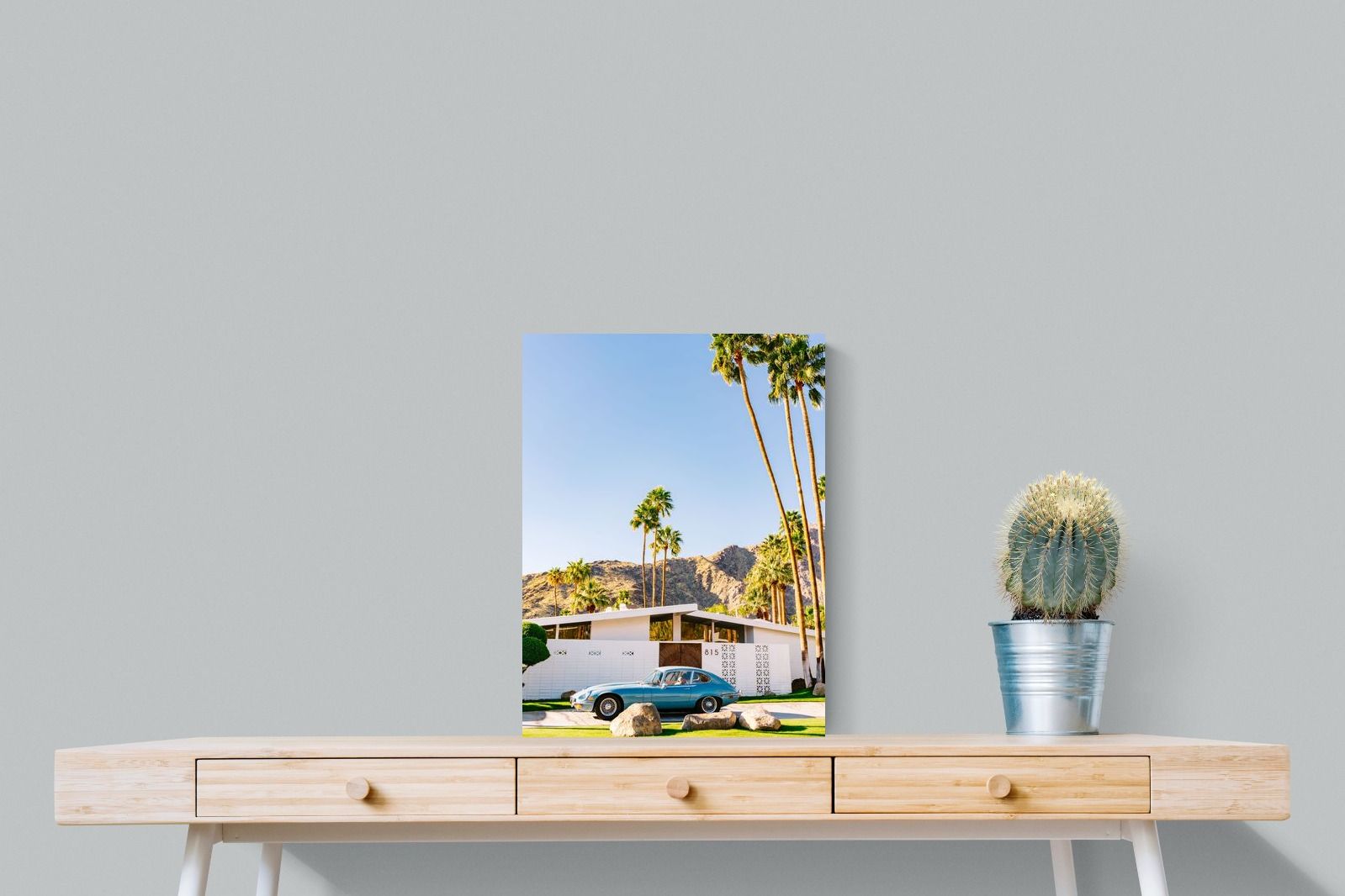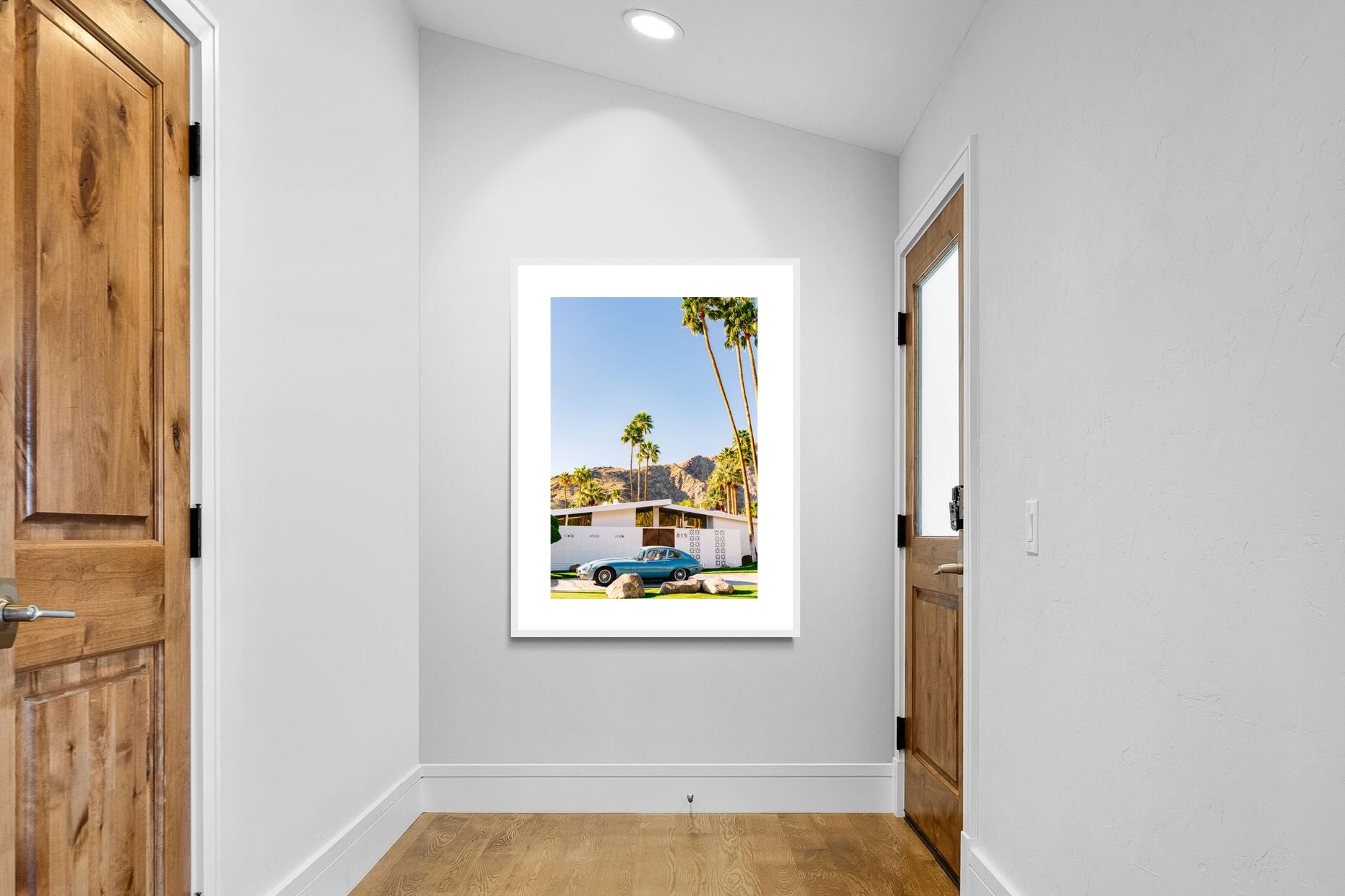This vibrant photograph captures a vintage sports car parked before a mid-century modern home in sun-soaked Palm Springs. The clear blue sky and towering palms evoke timeless Californian glamour, perfect for retro, modern, or travel-inspired interiors. Ideal for living rooms, studies, or hallways, this print pairs beautifully with clean lines and warm wood tones. It’s a stylish nod to mid-century architecture and classic design, bringing sophisticated nostalgia and sunshine charm into your home.