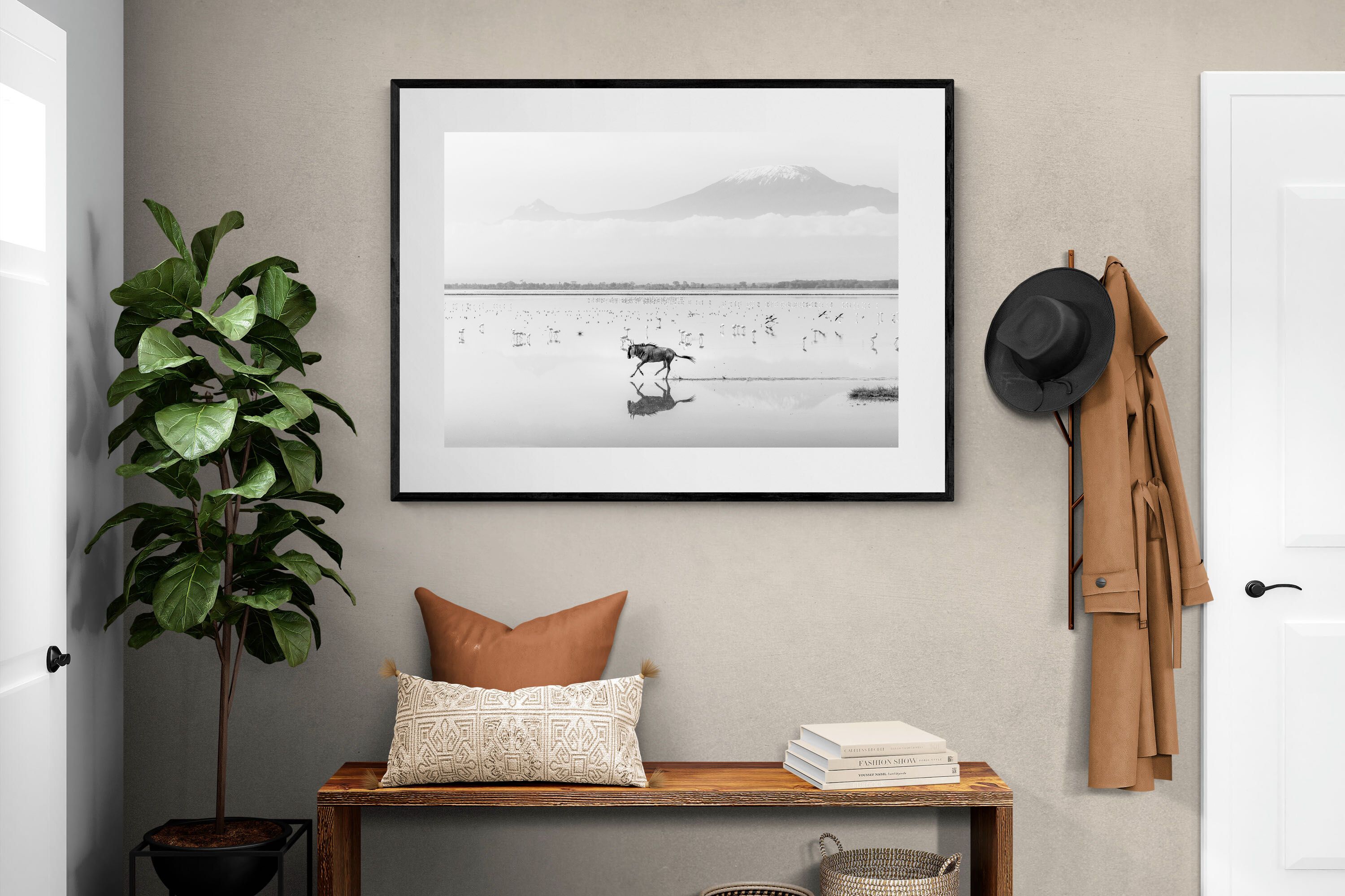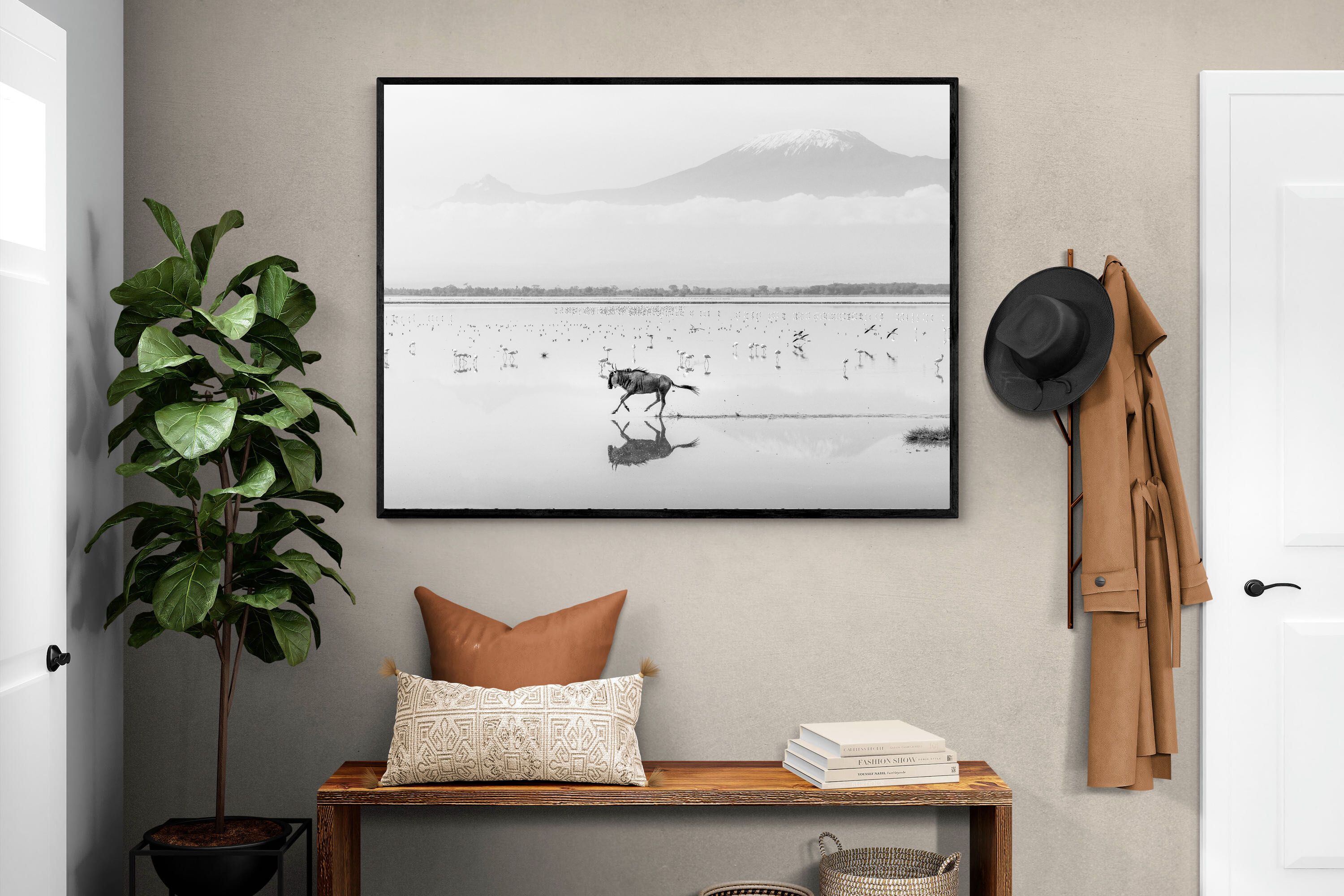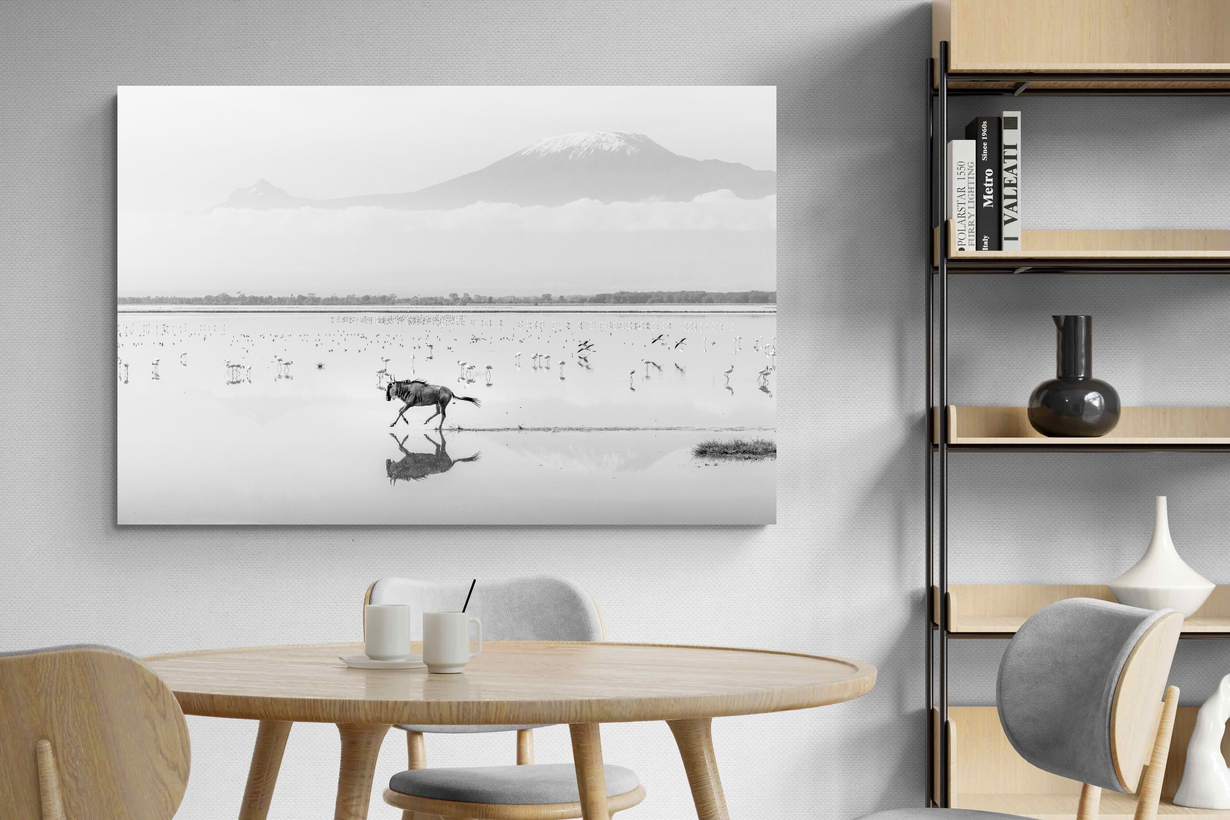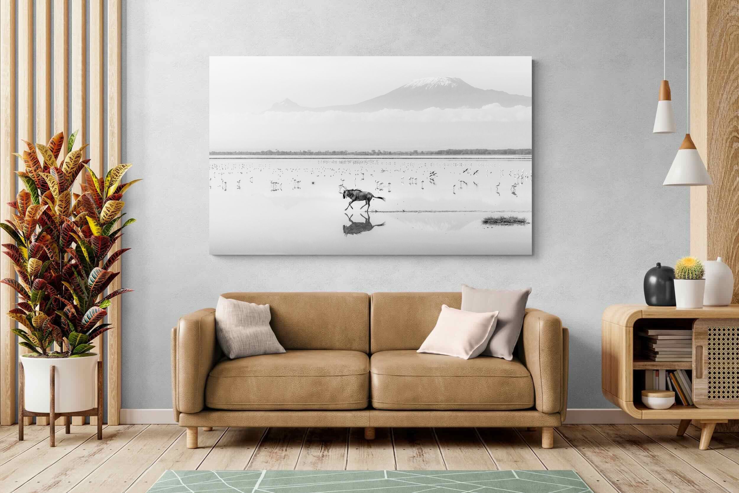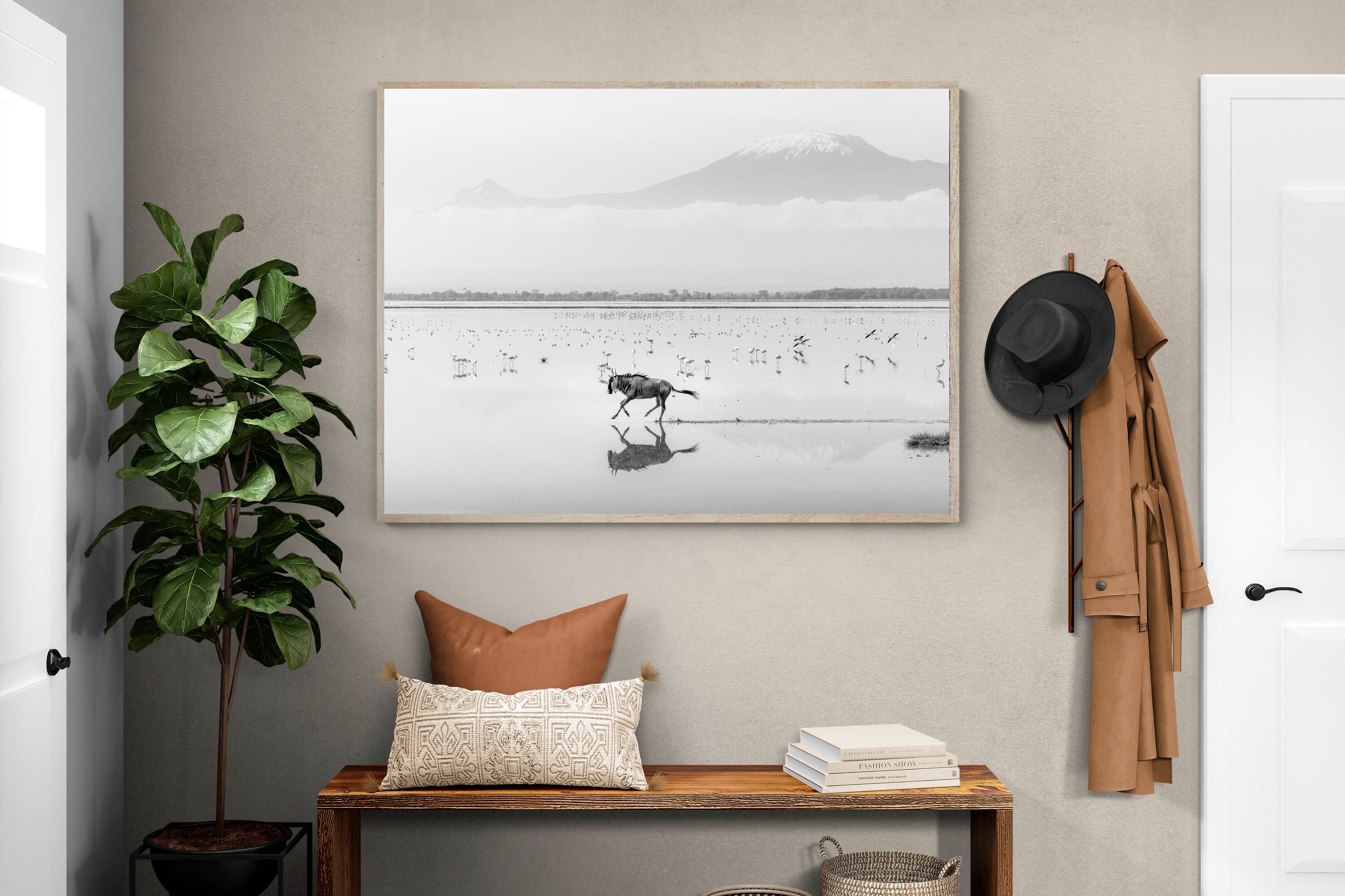 A lone wildebeest strides across a mirrored lake surrounded by flamingos, with the majestic Mount Kilimanjaro rising in the distance. Captured in black and white, the scene is both serene and powerful, blending stillness with motion. Perfect for contemporary spaces, this artwork offers a sense of scale, solitude, and wild beauty—ideal for minimalist interiors or calm statement walls.