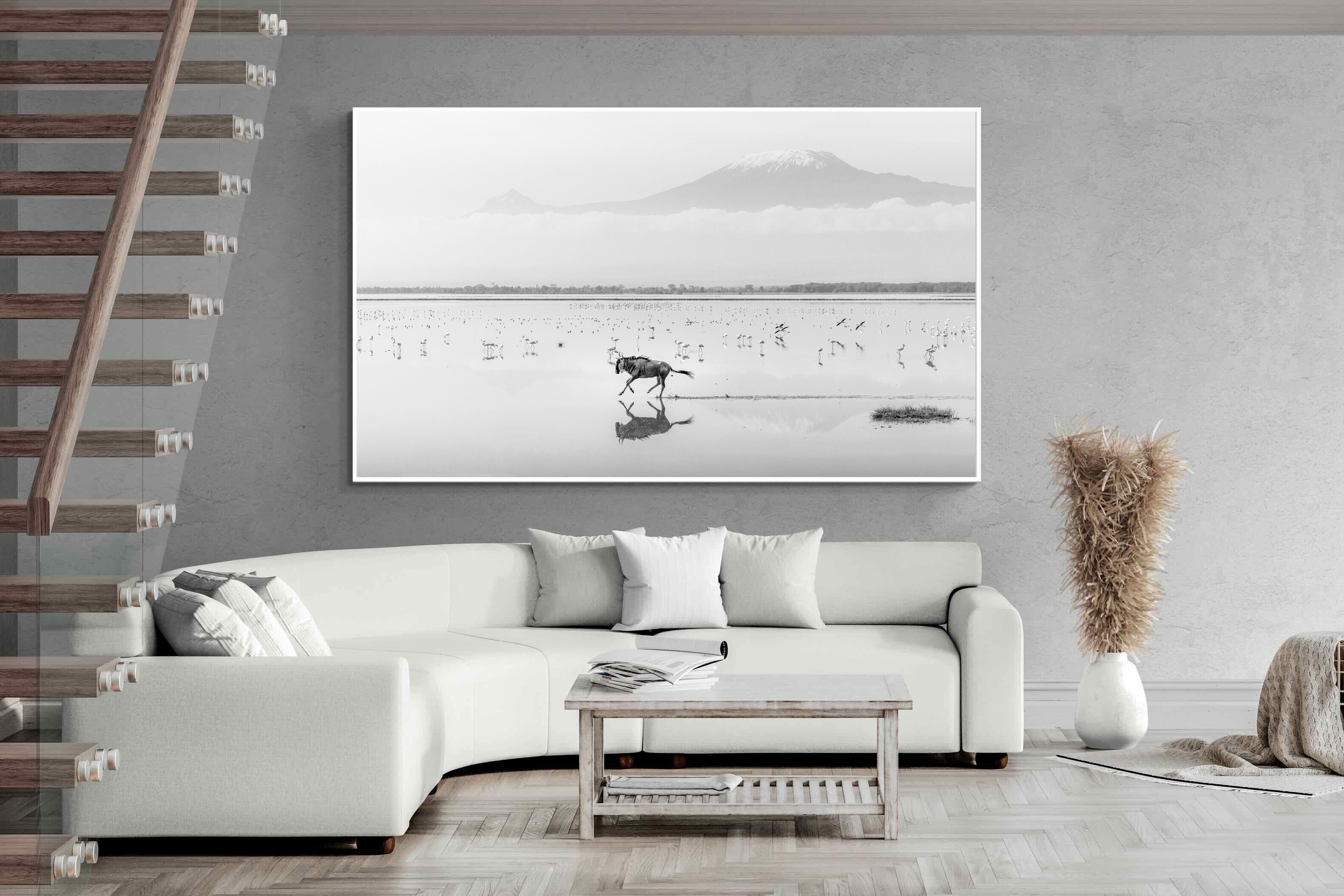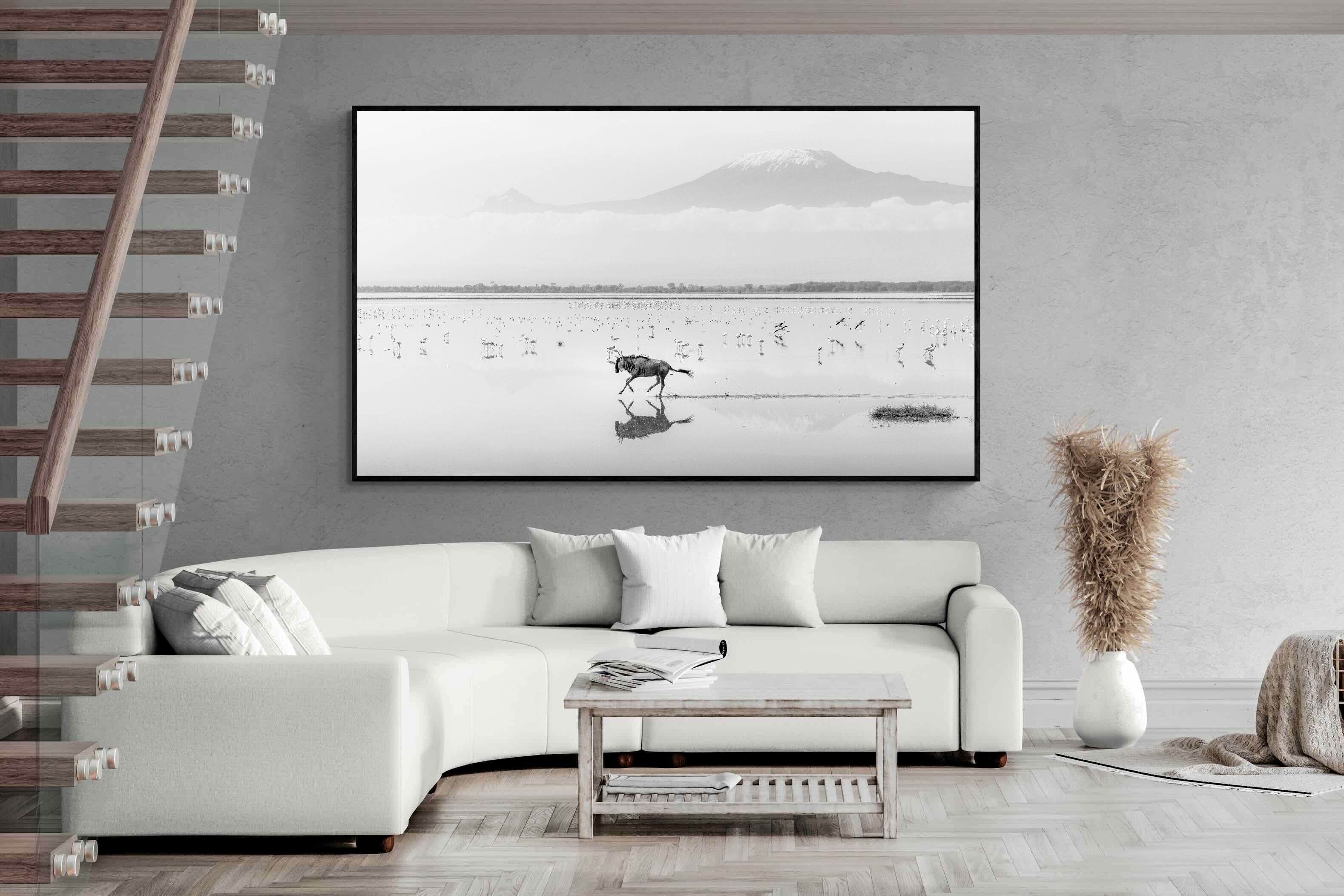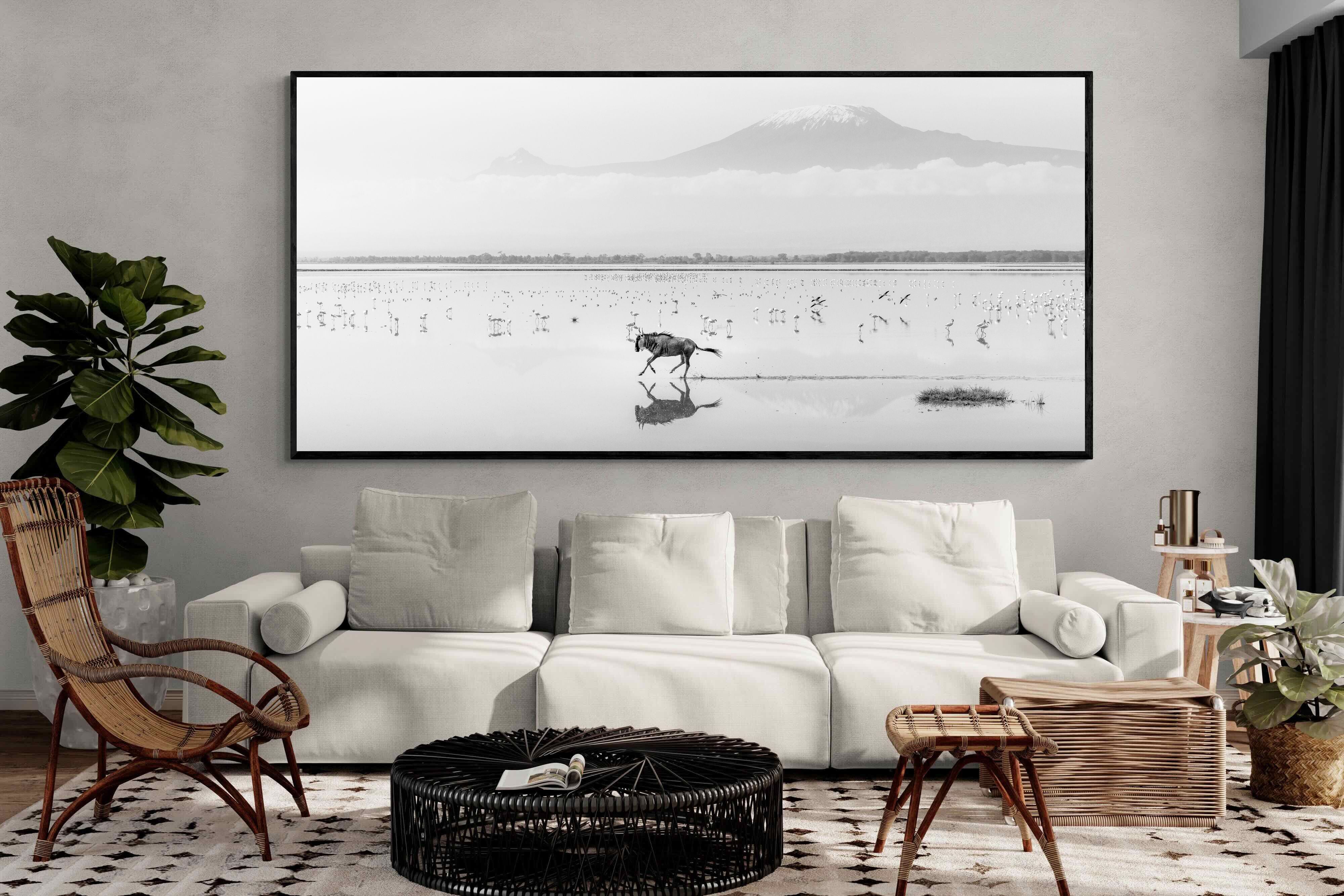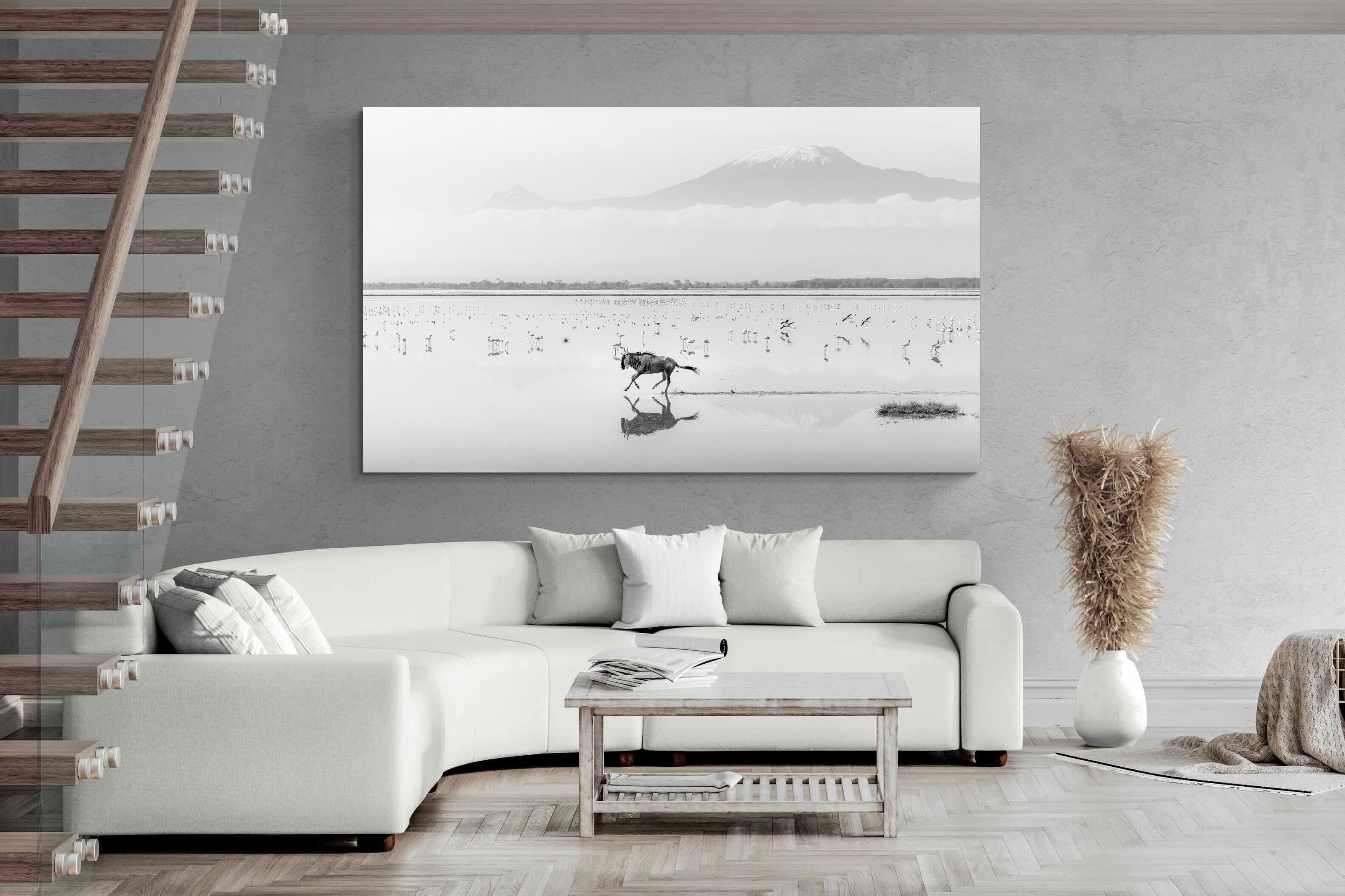 A lone wildebeest strides across a mirrored lake surrounded by flamingos, with the majestic Mount Kilimanjaro rising in the distance. Captured in black and white, the scene is both serene and powerful, blending stillness with motion. Perfect for contemporary spaces, this artwork offers a sense of scale, solitude, and wild beauty—ideal for minimalist interiors or calm statement walls.