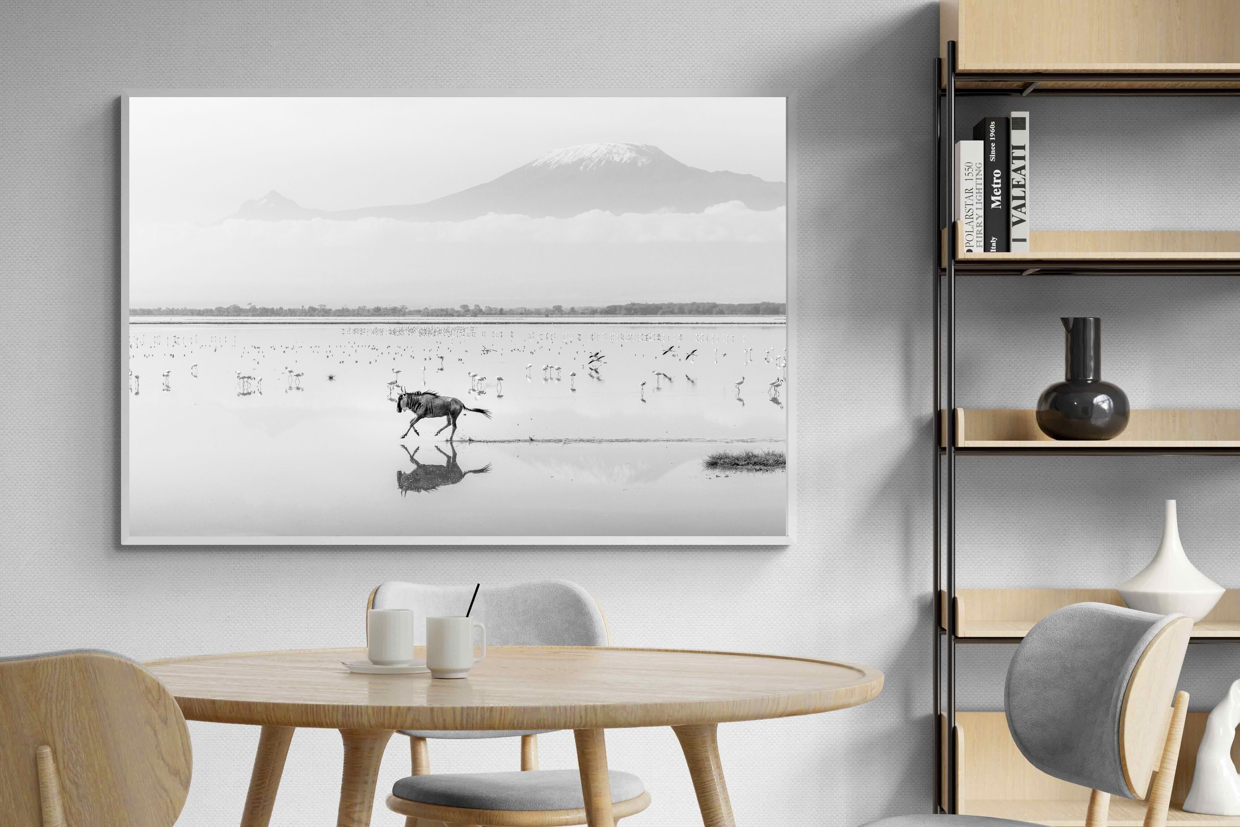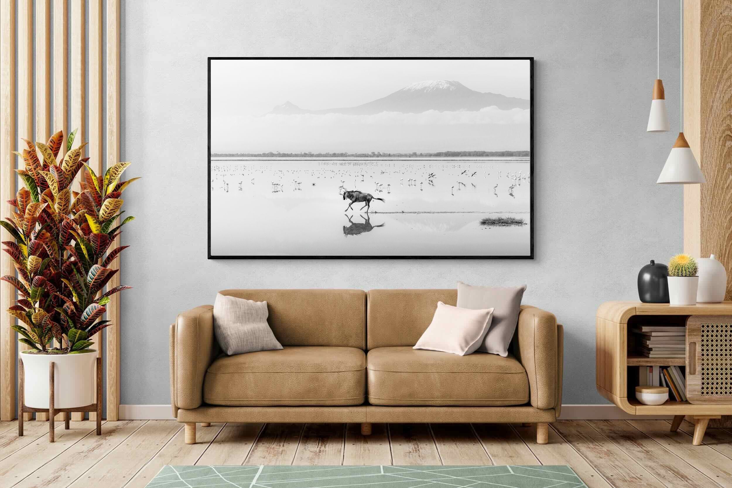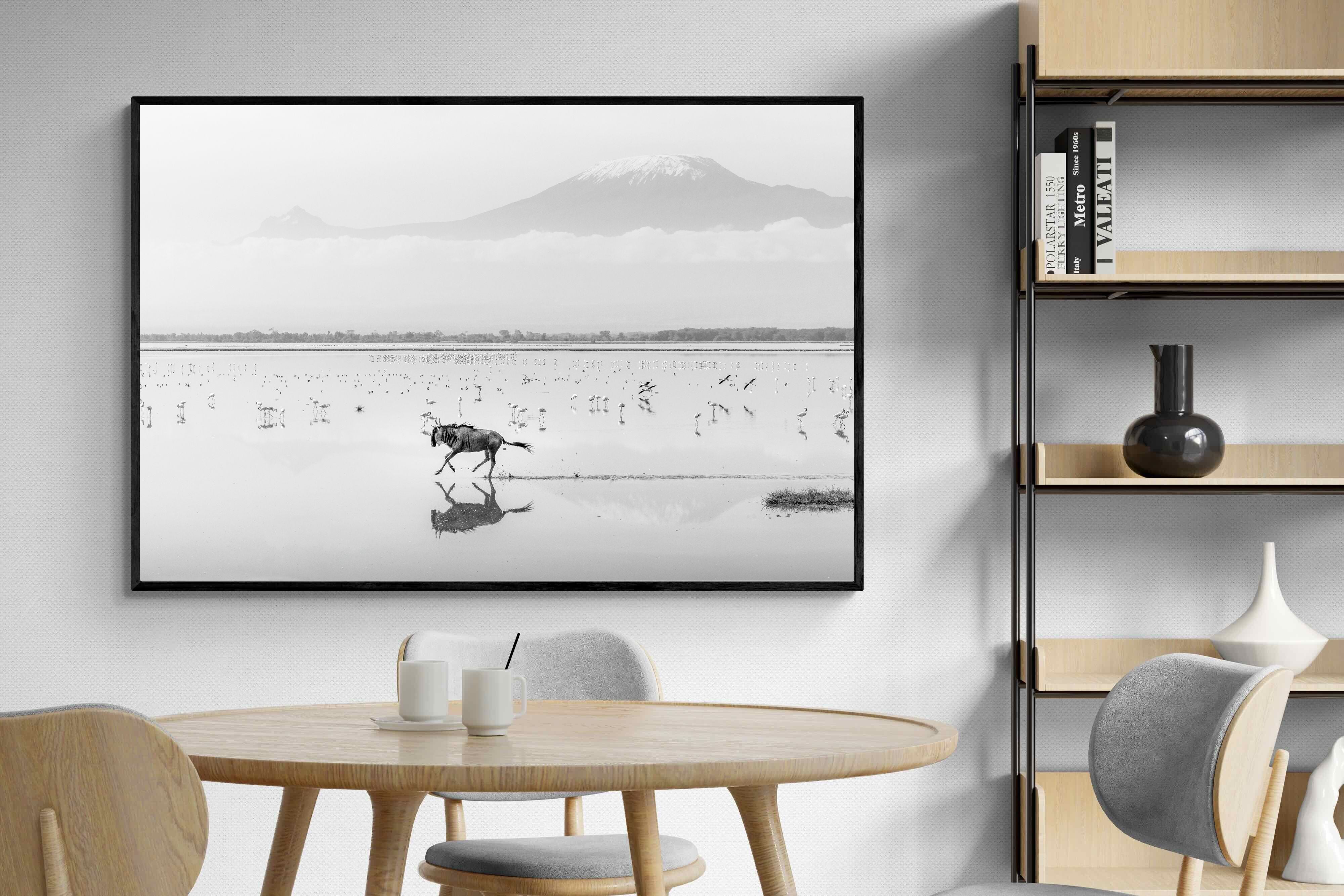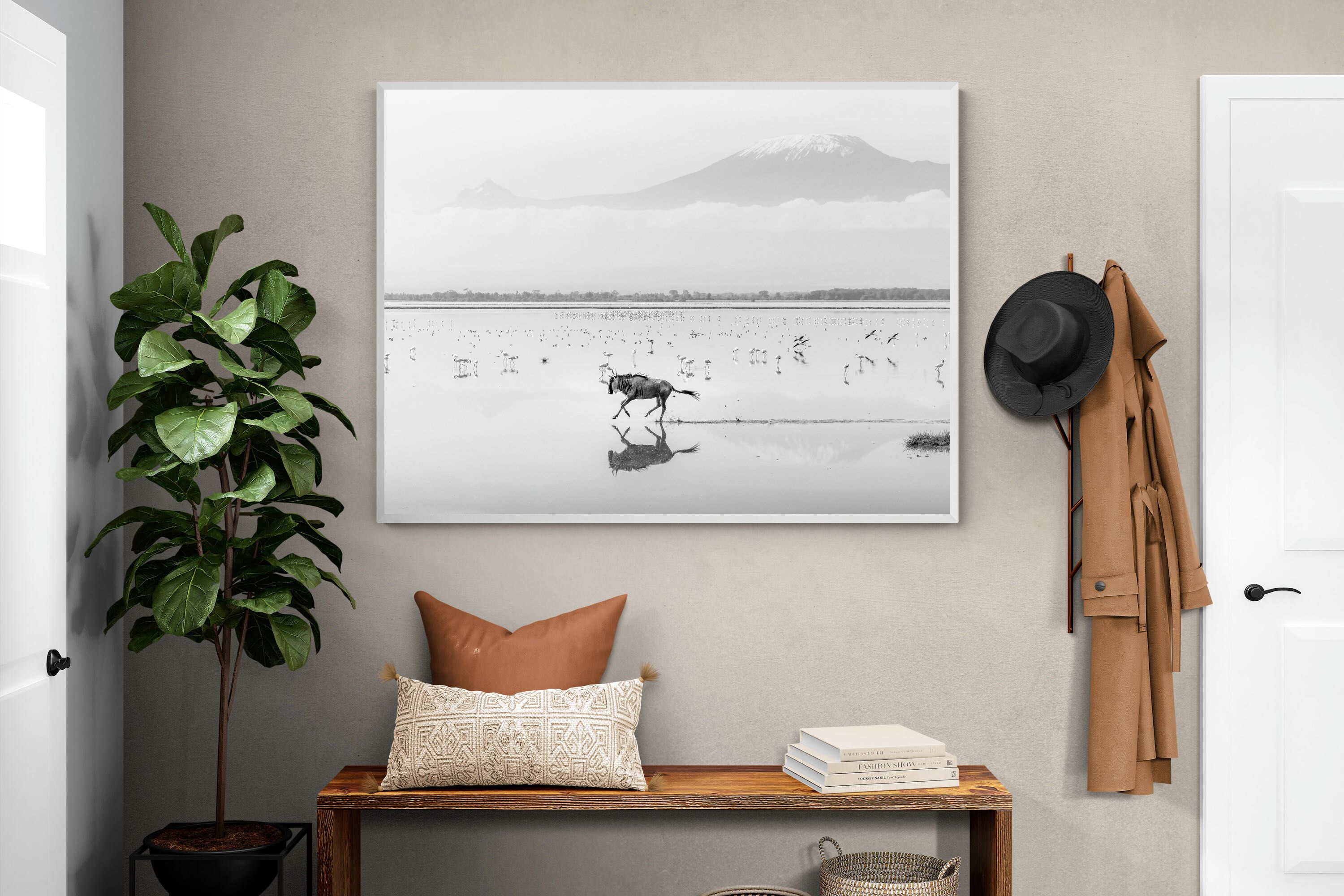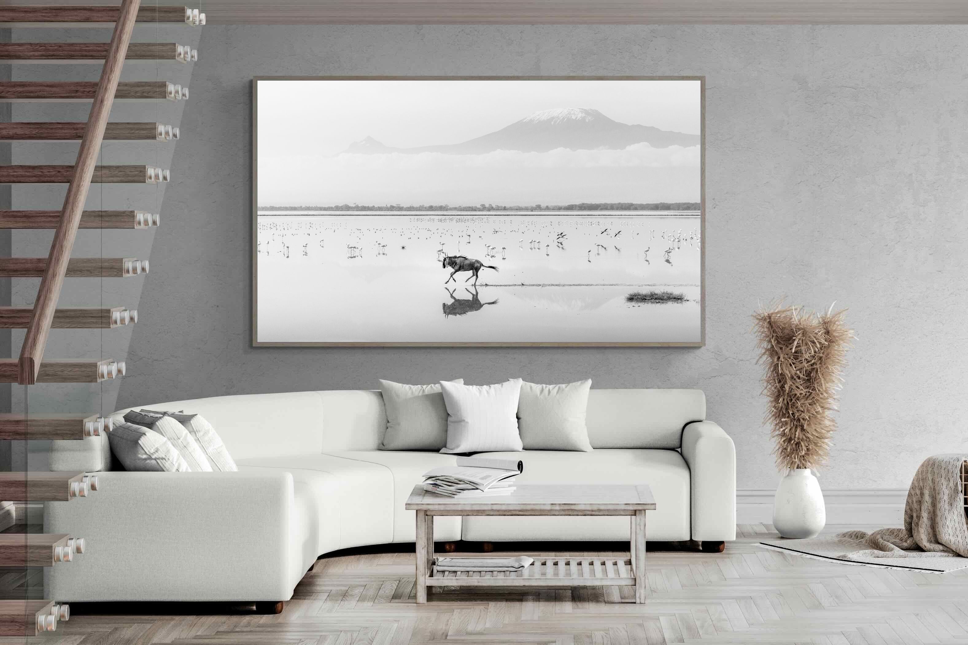 A lone wildebeest strides across a mirrored lake surrounded by flamingos, with the majestic Mount Kilimanjaro rising in the distance. Captured in black and white, the scene is both serene and powerful, blending stillness with motion. Perfect for contemporary spaces, this artwork offers a sense of scale, solitude, and wild beauty—ideal for minimalist interiors or calm statement walls.