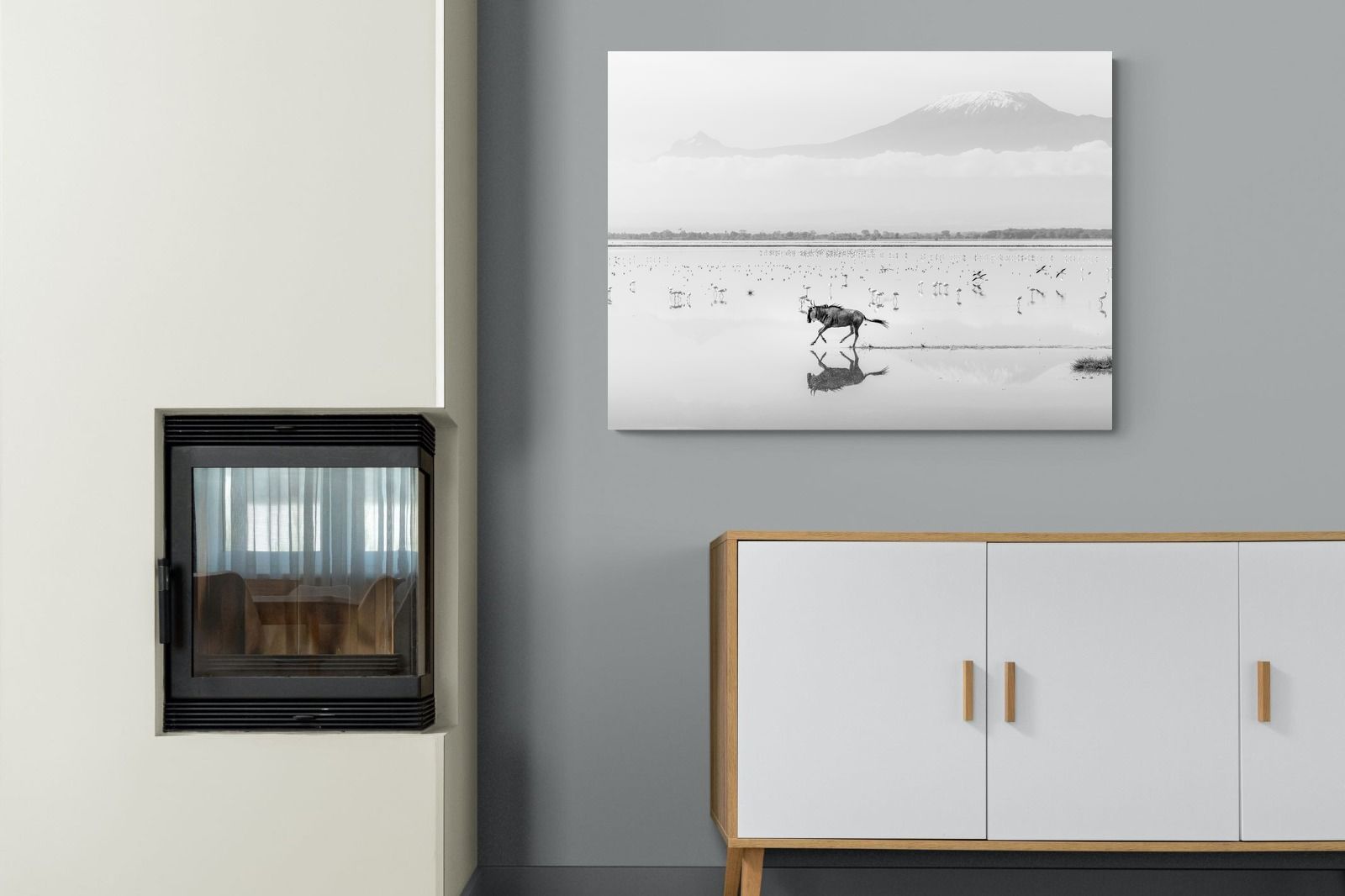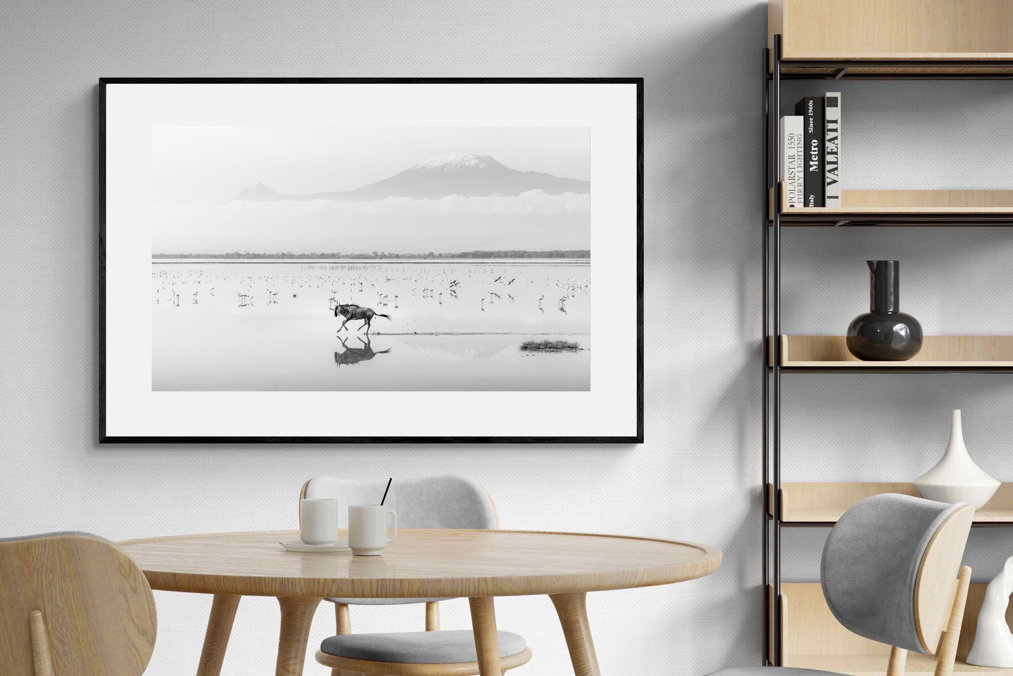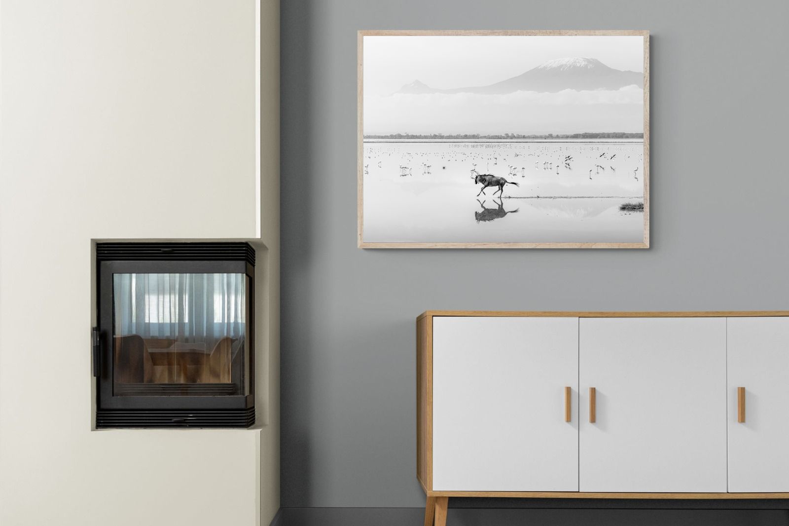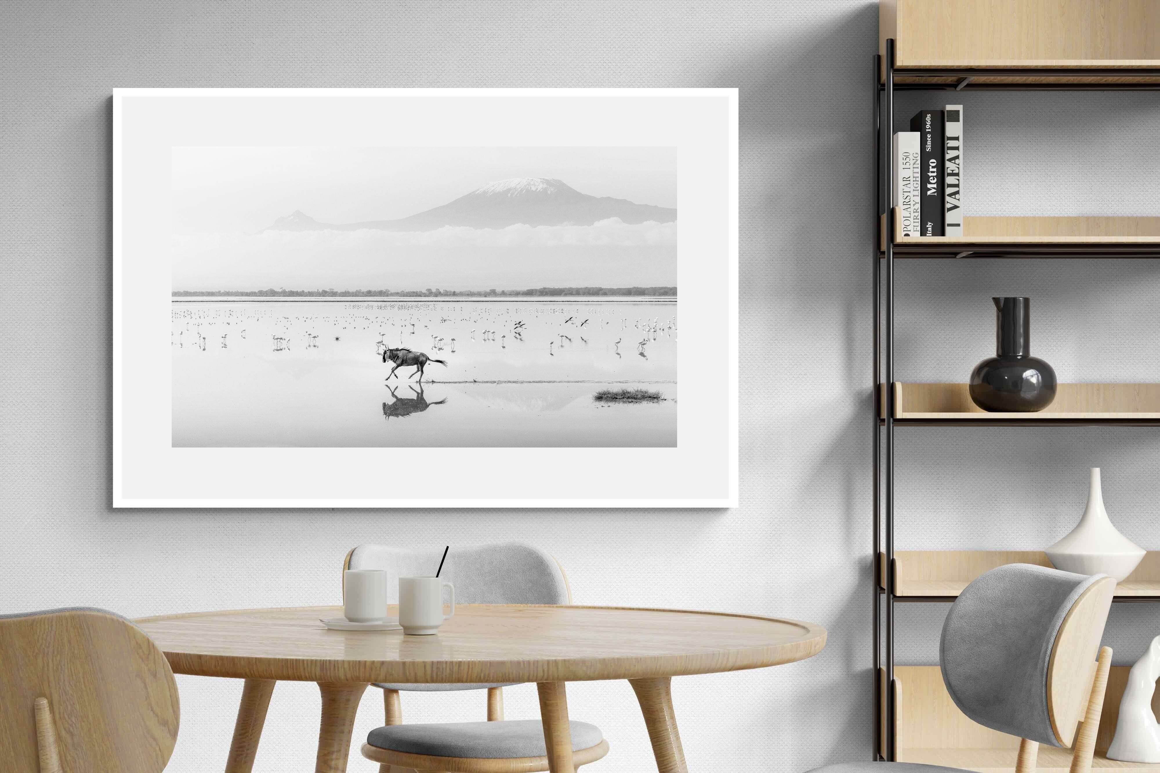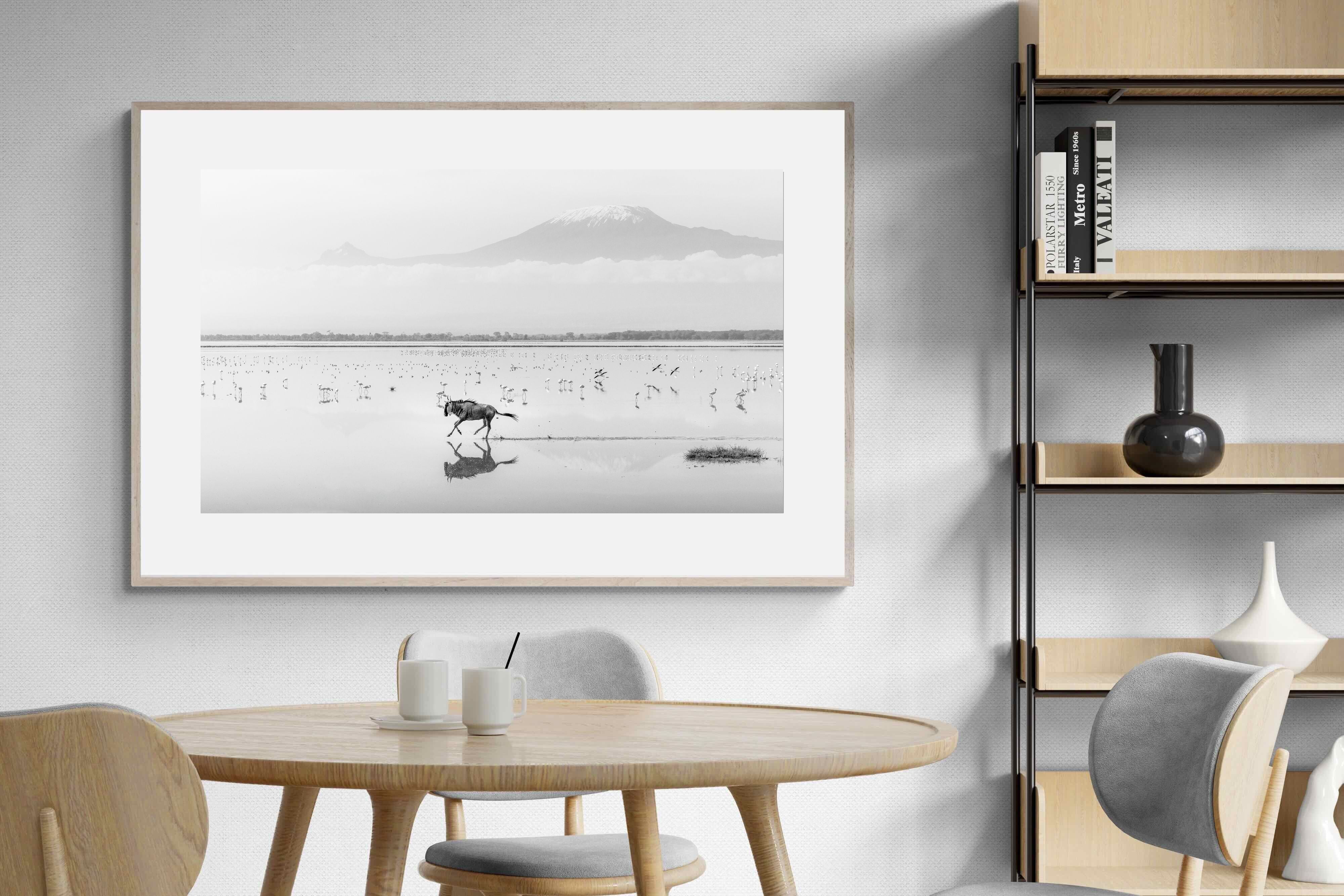 A lone wildebeest strides across a mirrored lake surrounded by flamingos, with the majestic Mount Kilimanjaro rising in the distance. Captured in black and white, the scene is both serene and powerful, blending stillness with motion. Perfect for contemporary spaces, this artwork offers a sense of scale, solitude, and wild beauty—ideal for minimalist interiors or calm statement walls.
