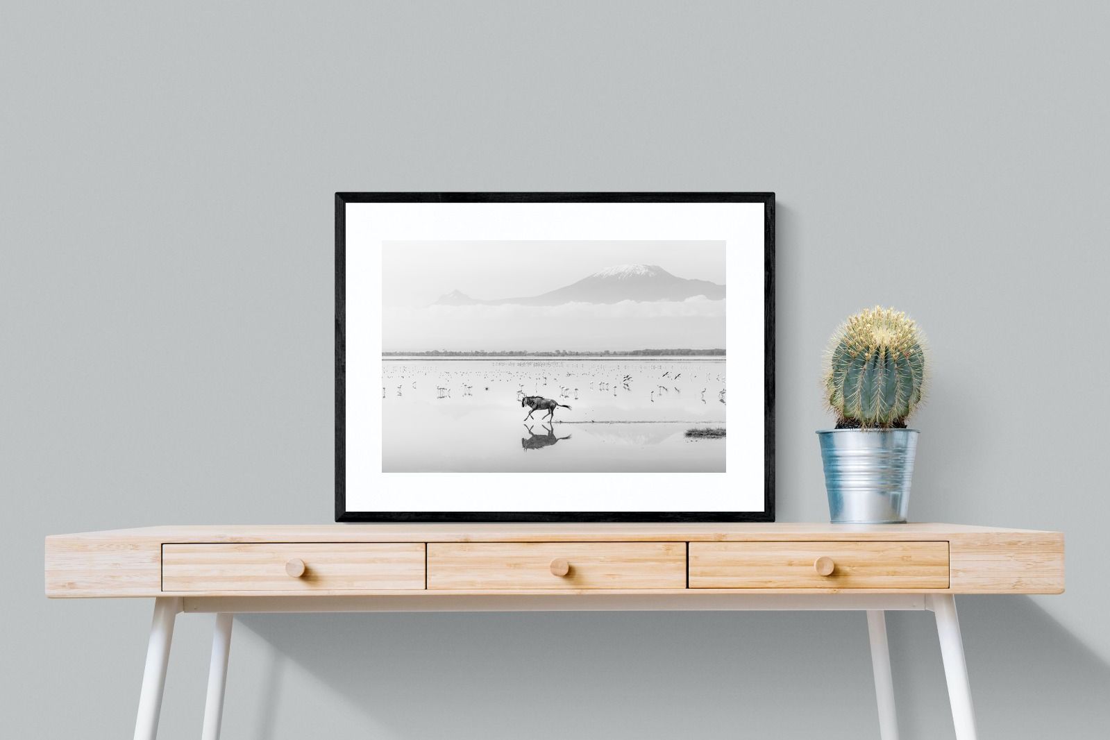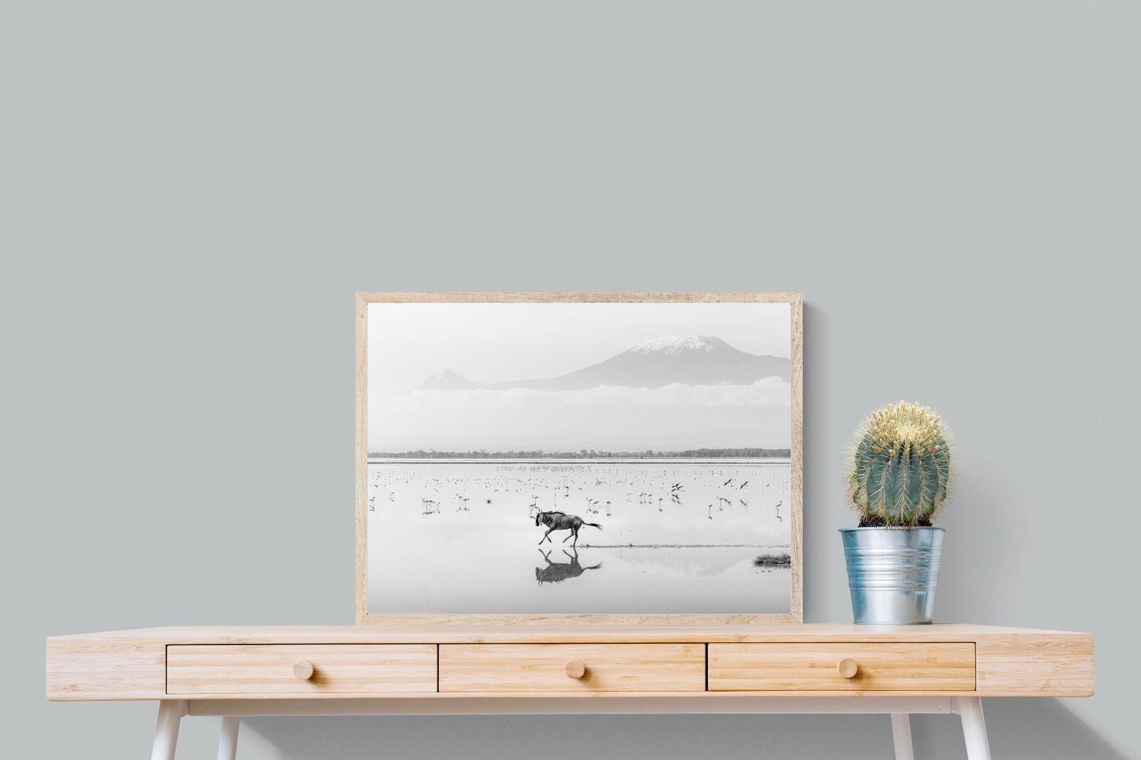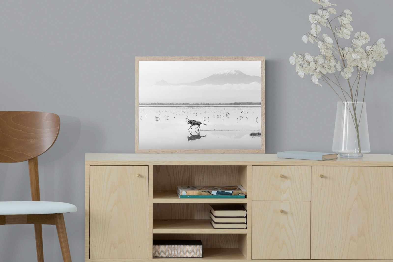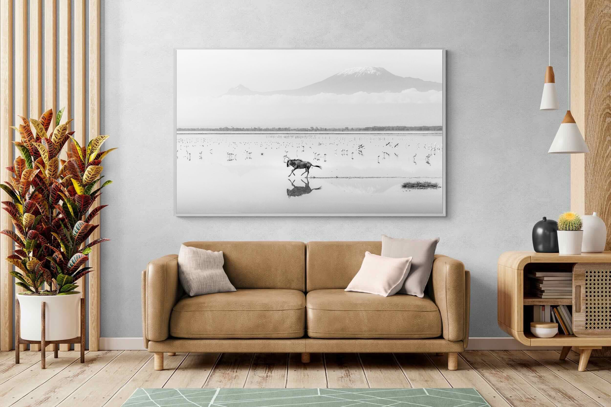A lone wildebeest strides across a mirrored lake surrounded by flamingos, with the majestic Mount Kilimanjaro rising in the distance. Captured in black and white, the scene is both serene and powerful, blending stillness with motion. Perfect for contemporary spaces, this artwork offers a sense of scale, solitude, and wild beauty—ideal for minimalist interiors or calm statement walls.
