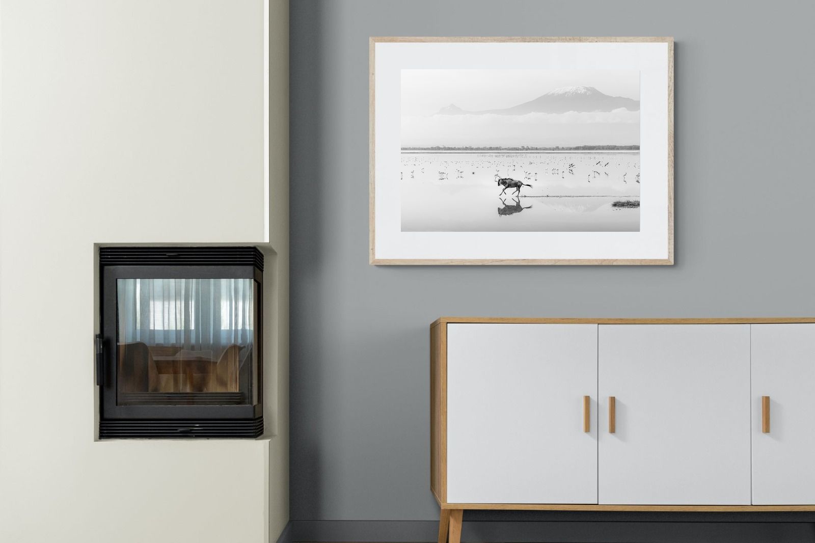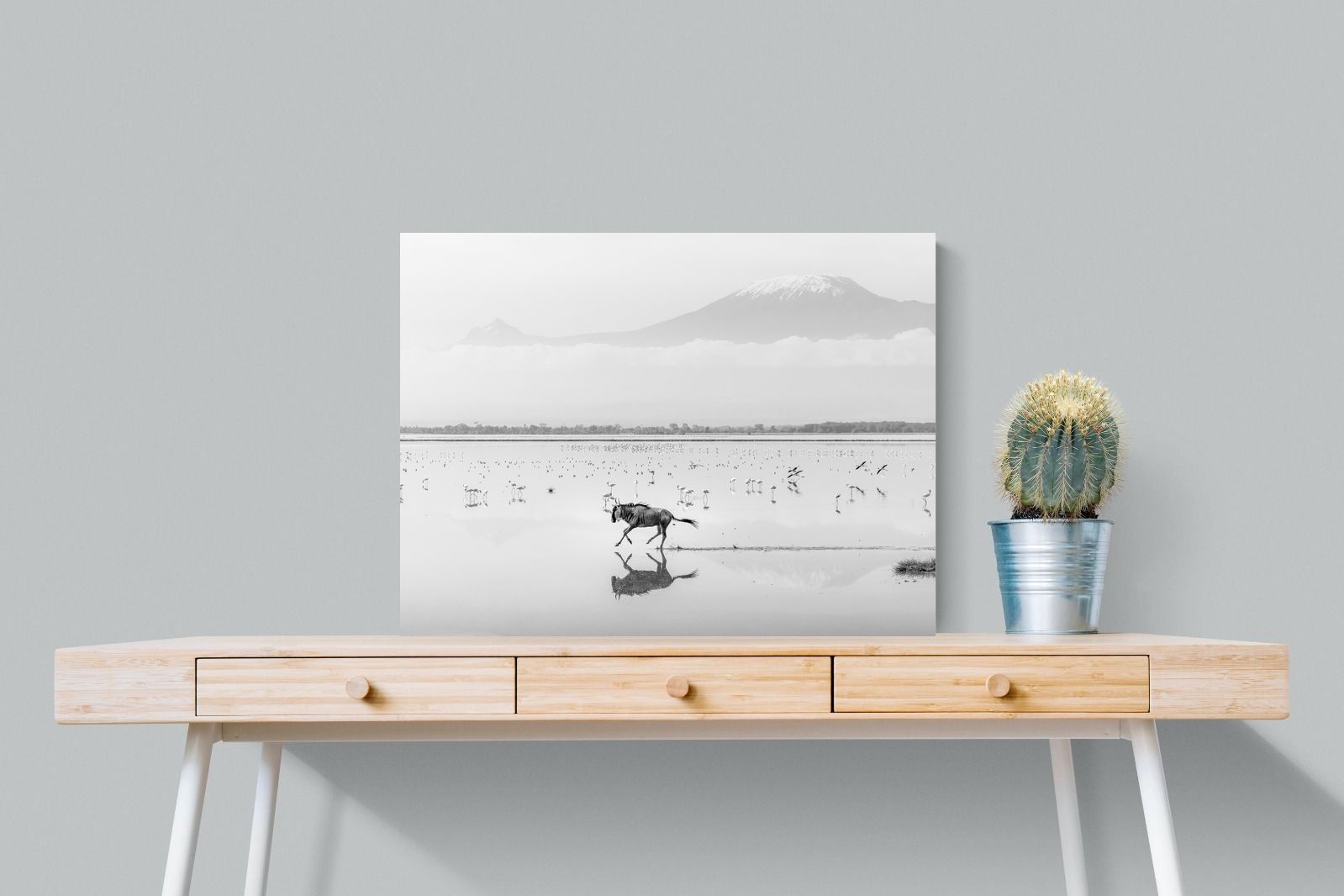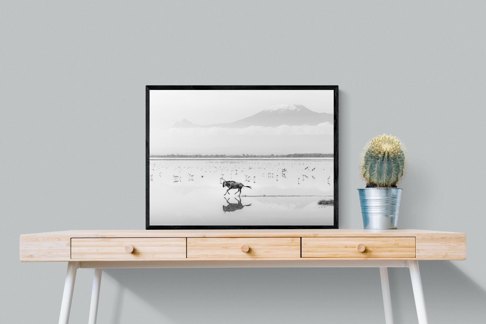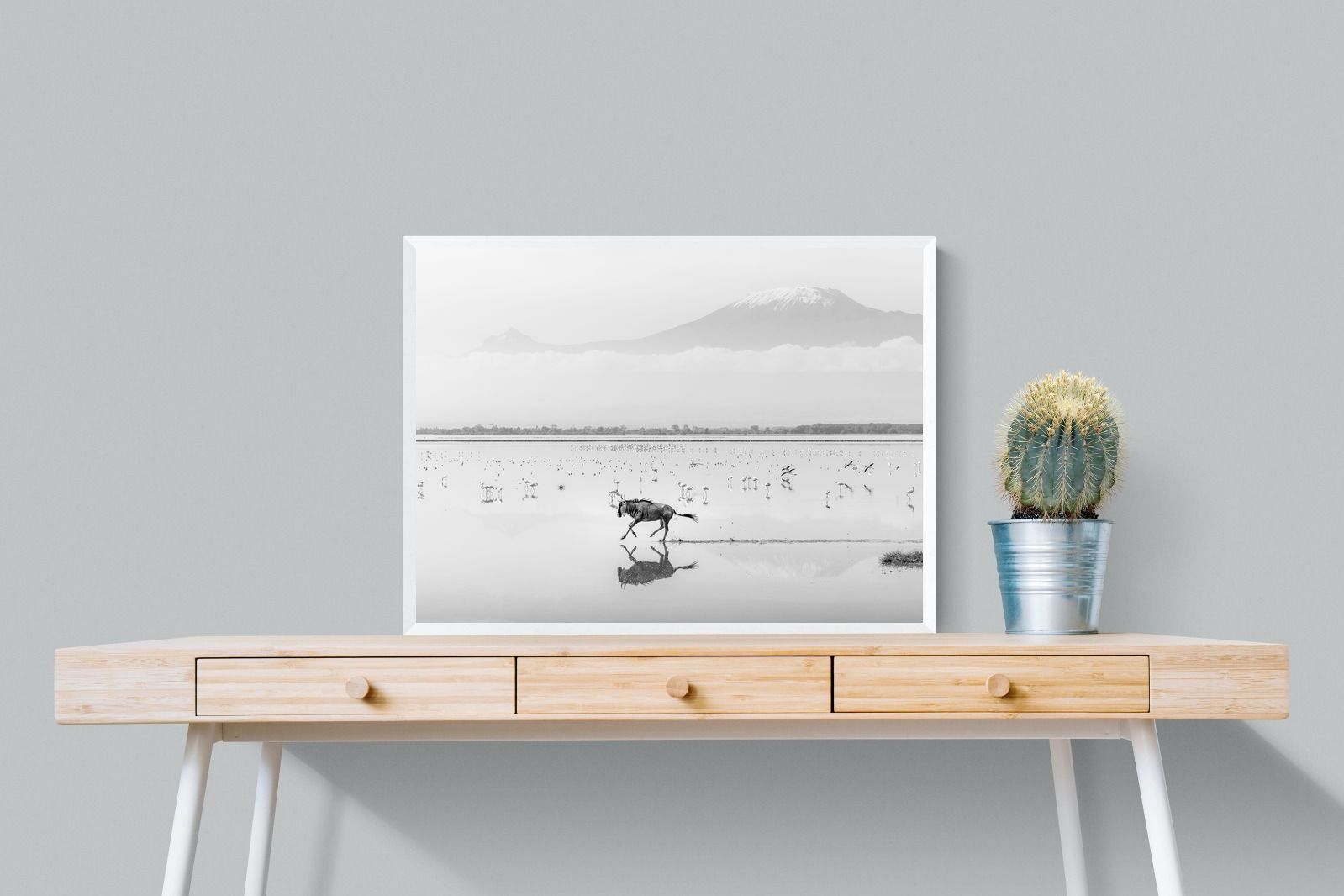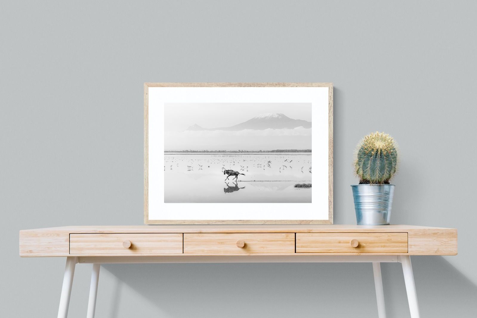 A lone wildebeest strides across a mirrored lake surrounded by flamingos, with the majestic Mount Kilimanjaro rising in the distance. Captured in black and white, the scene is both serene and powerful, blending stillness with motion. Perfect for contemporary spaces, this artwork offers a sense of scale, solitude, and wild beauty—ideal for minimalist interiors or calm statement walls.