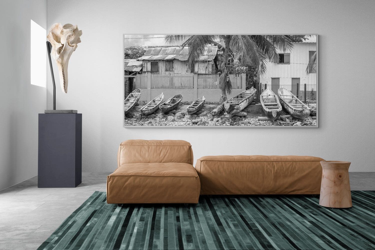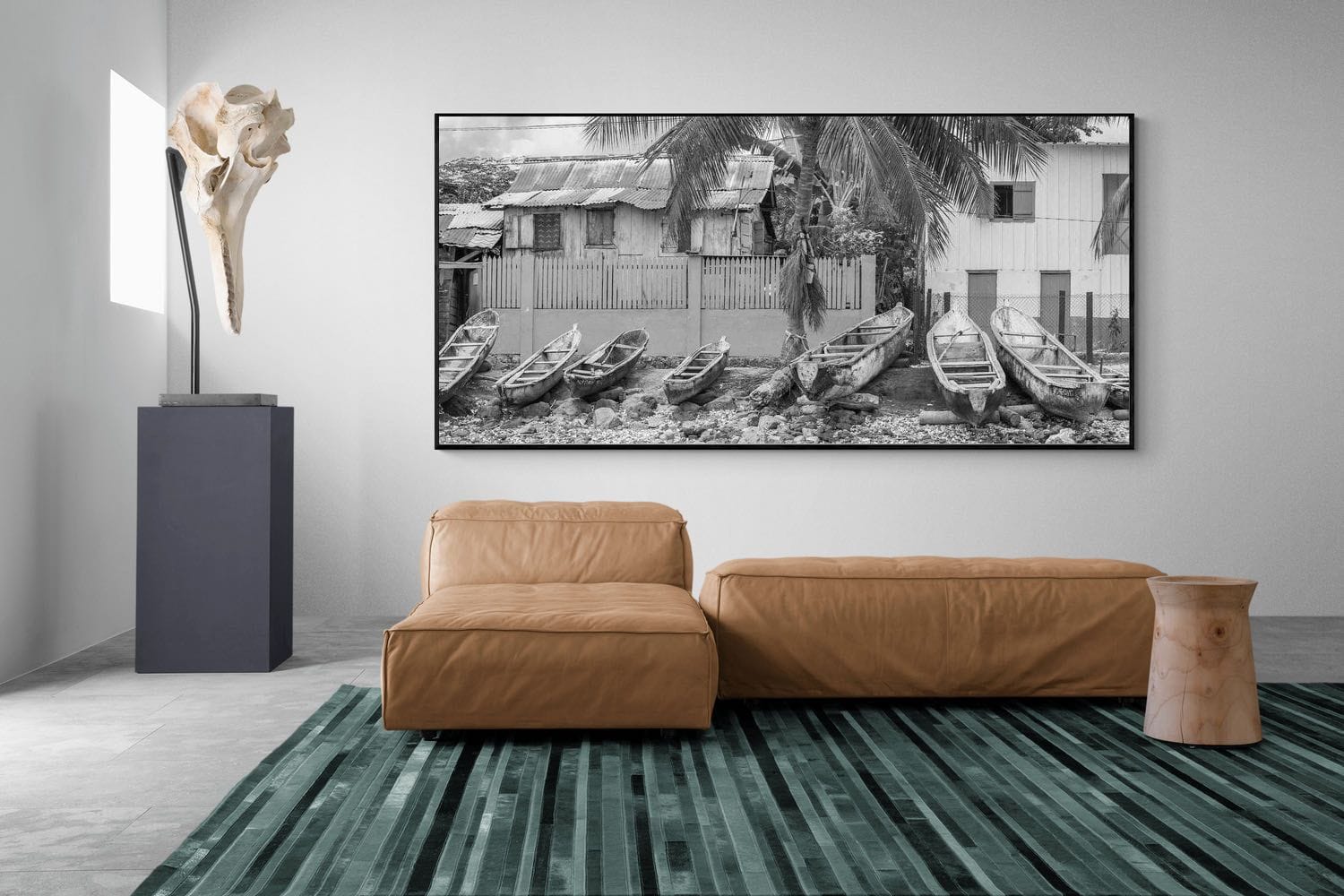 A row of weathered boats rests along a shoreline in front of simple coastal homes, captured in timeless black and white in São Tomé and Príncipe - a two-island nation in the Gulf of Guinea, Central Africa. The textures of wood, water, and palm fronds create a rich, layered composition. This piece evokes a sense of quiet coastal life and nostalgia, making it ideal for relaxed interiors. Perfect for adding character and understated detail to living spaces or beach-inspired settings.
