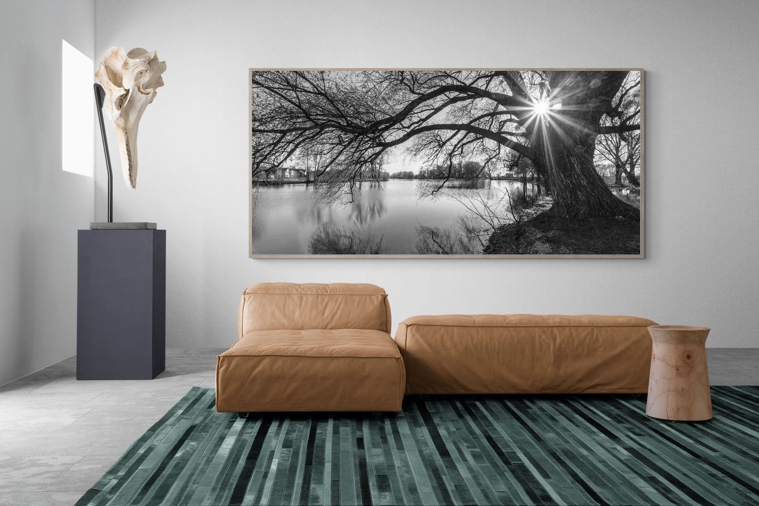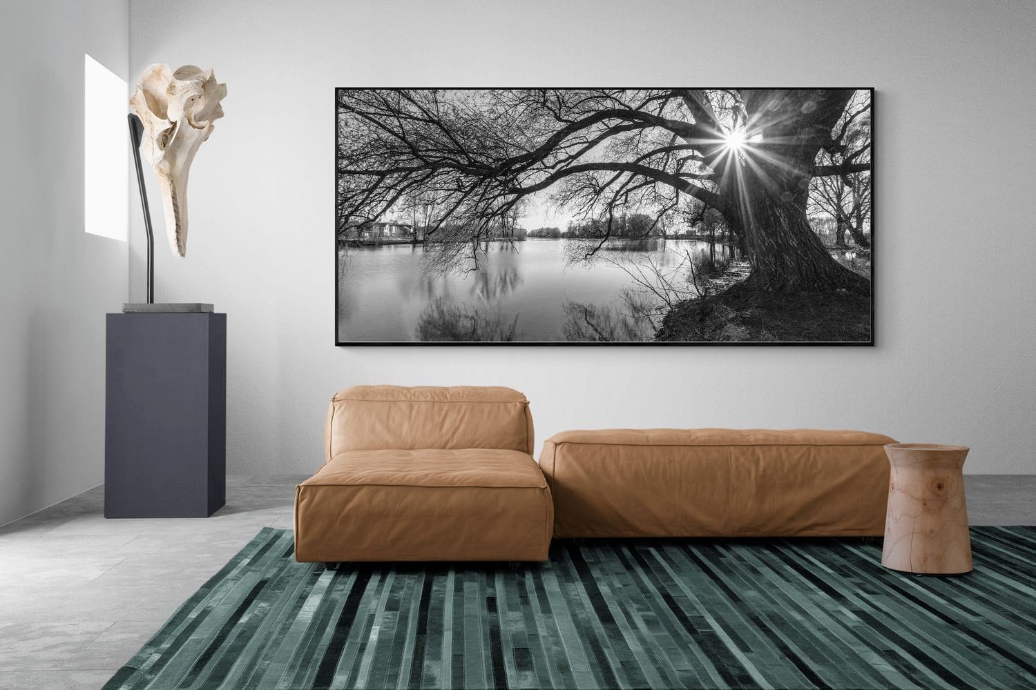 Sunlight bursts through the branches of a bare tree, casting dramatic rays across a calm waterside scene. The monochrome palette enhances contrast and detail, creating a striking interplay between light and shadow. Ideal for living rooms, offices, or gallery walls, this artwork brings depth and atmosphere without colour. Its natural composition and bold lighting make it a compelling focal point for interiors that favour timeless, high-contrast photography and quiet drama.