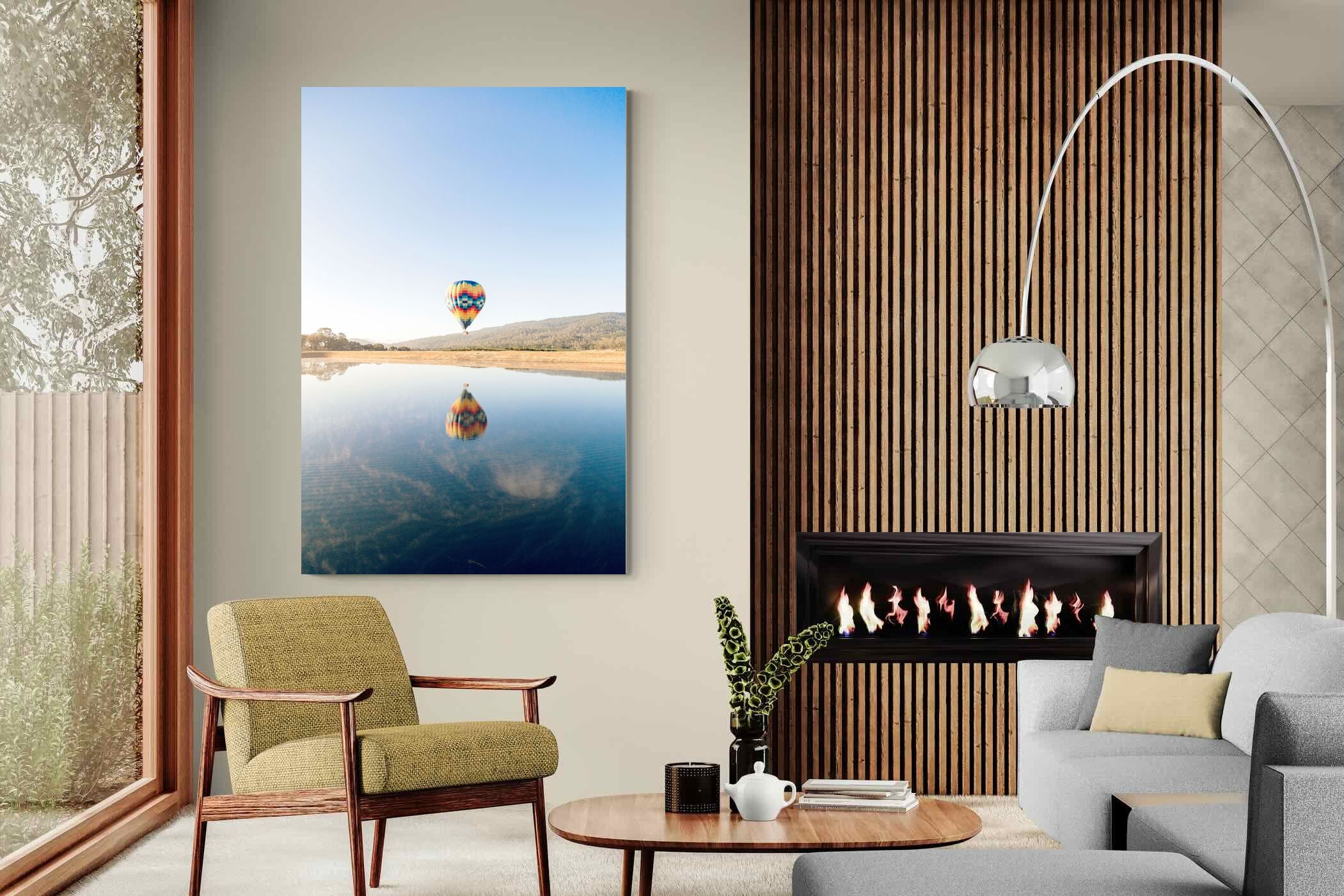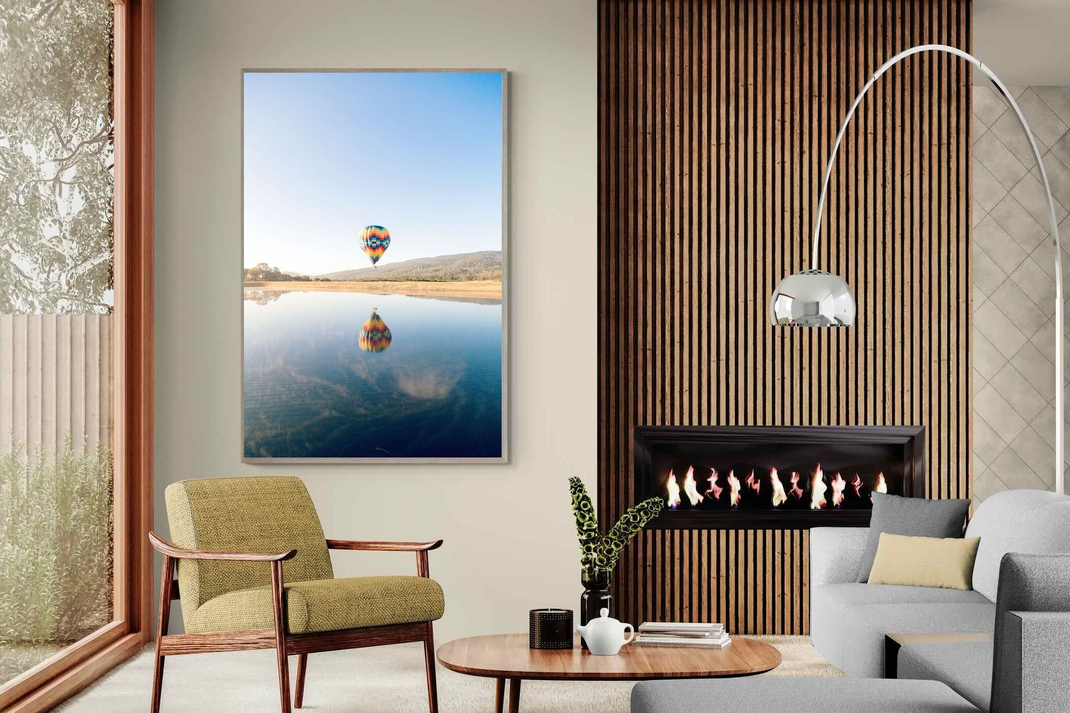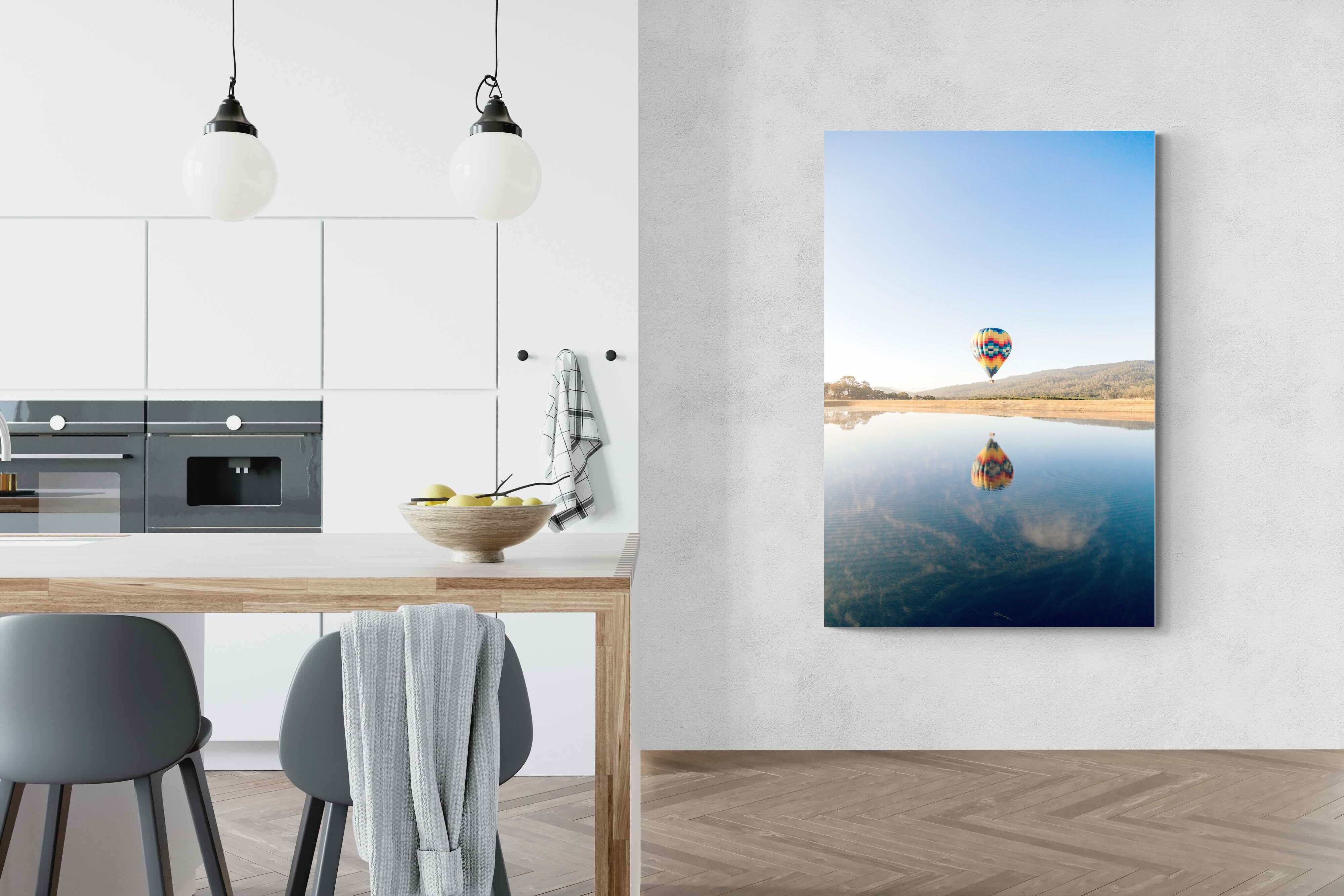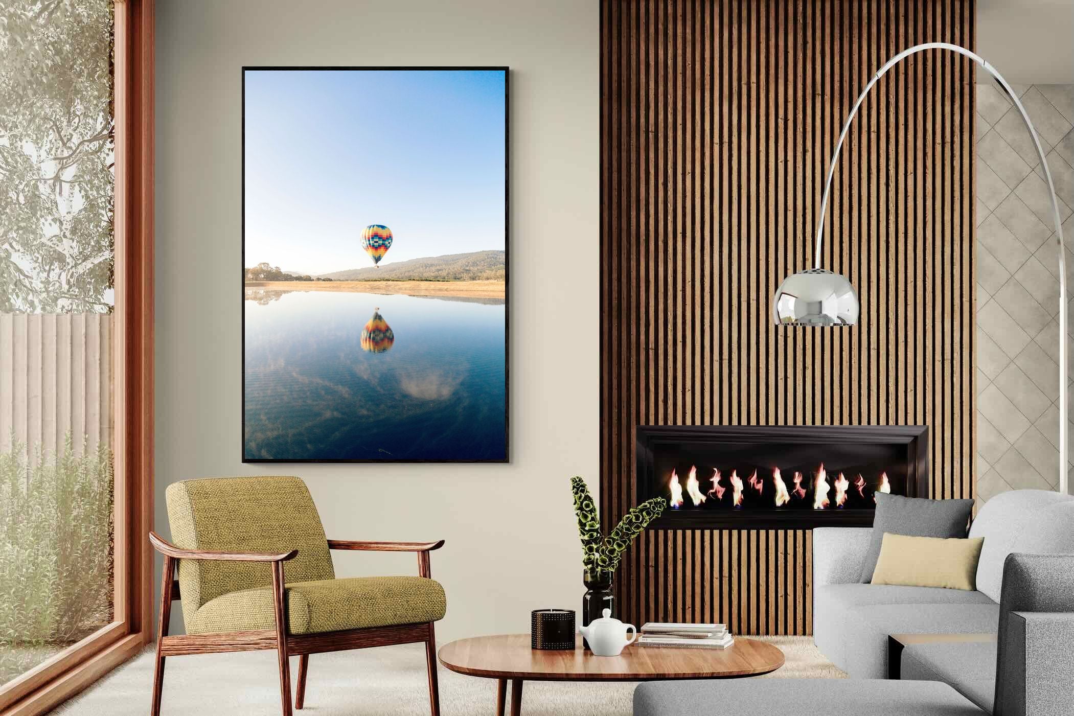 Captured at sunrise in the tranquil valleys of Napa Valley, California, this photograph shows a vibrant hot air balloon drifting above the still waters of a quiet lake. The striking colours of the balloon are mirrored perfectly on the surface, creating a serene and captivating image. The scene evokes a sense of peace and adventure. Ideal for contemporary homes, this piece will bring a touch of elegance, serenity, and vibrant energy to any living space.