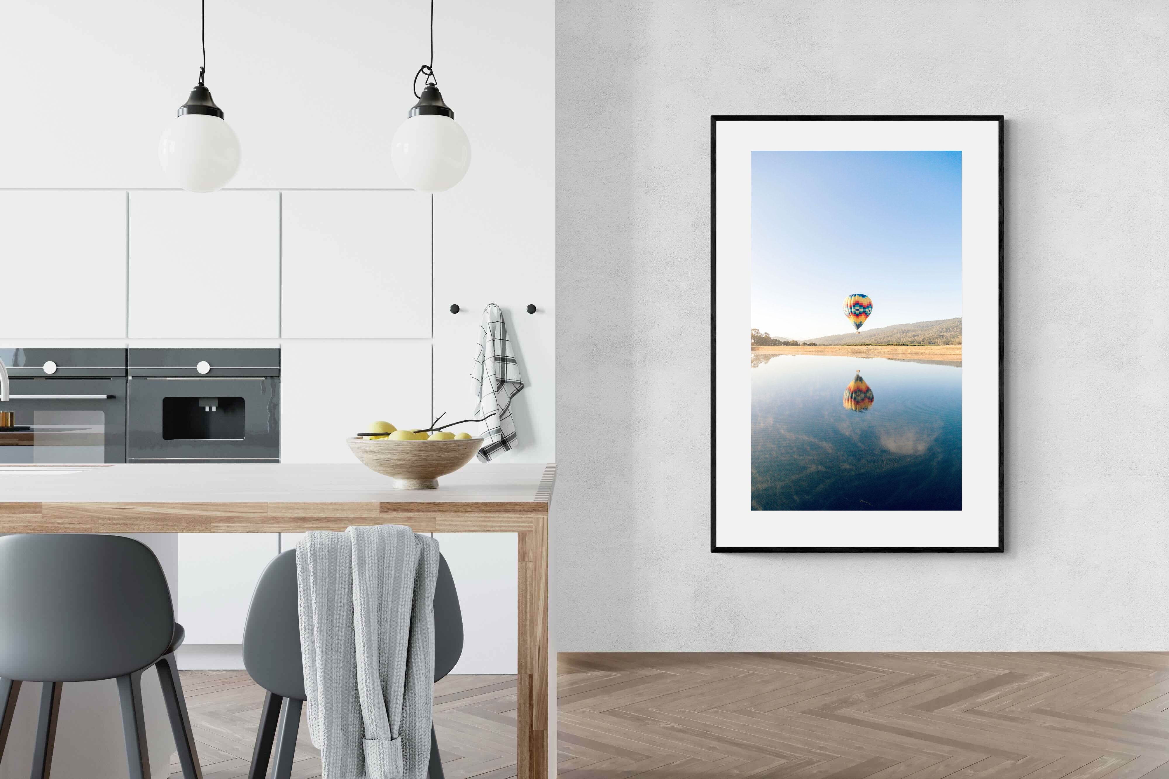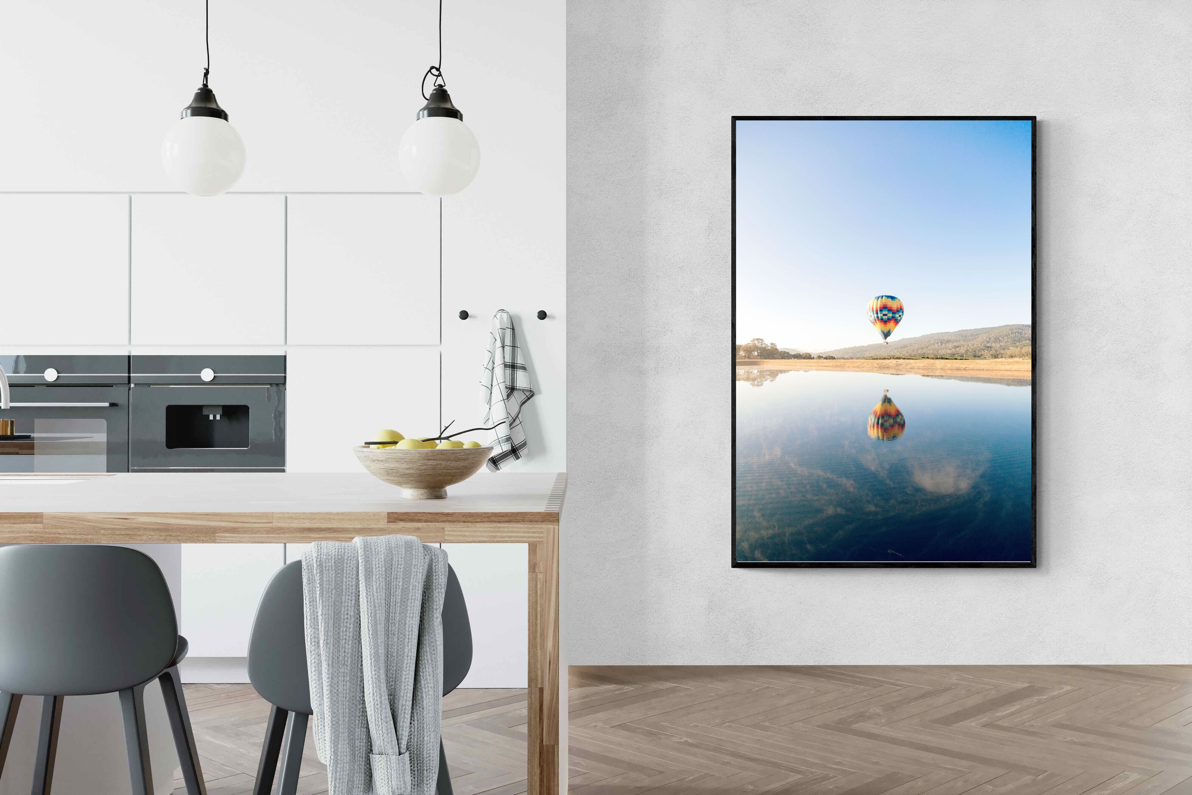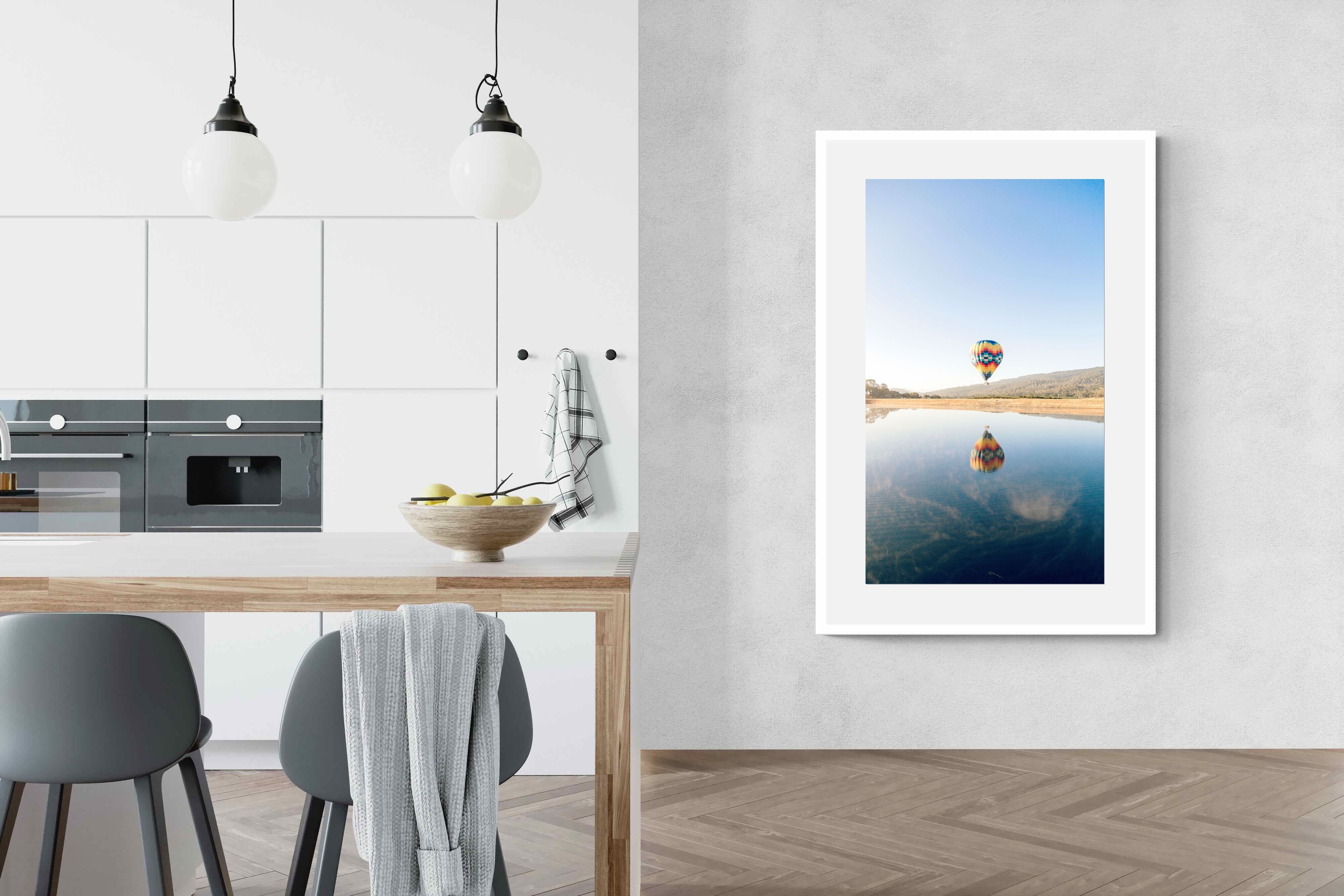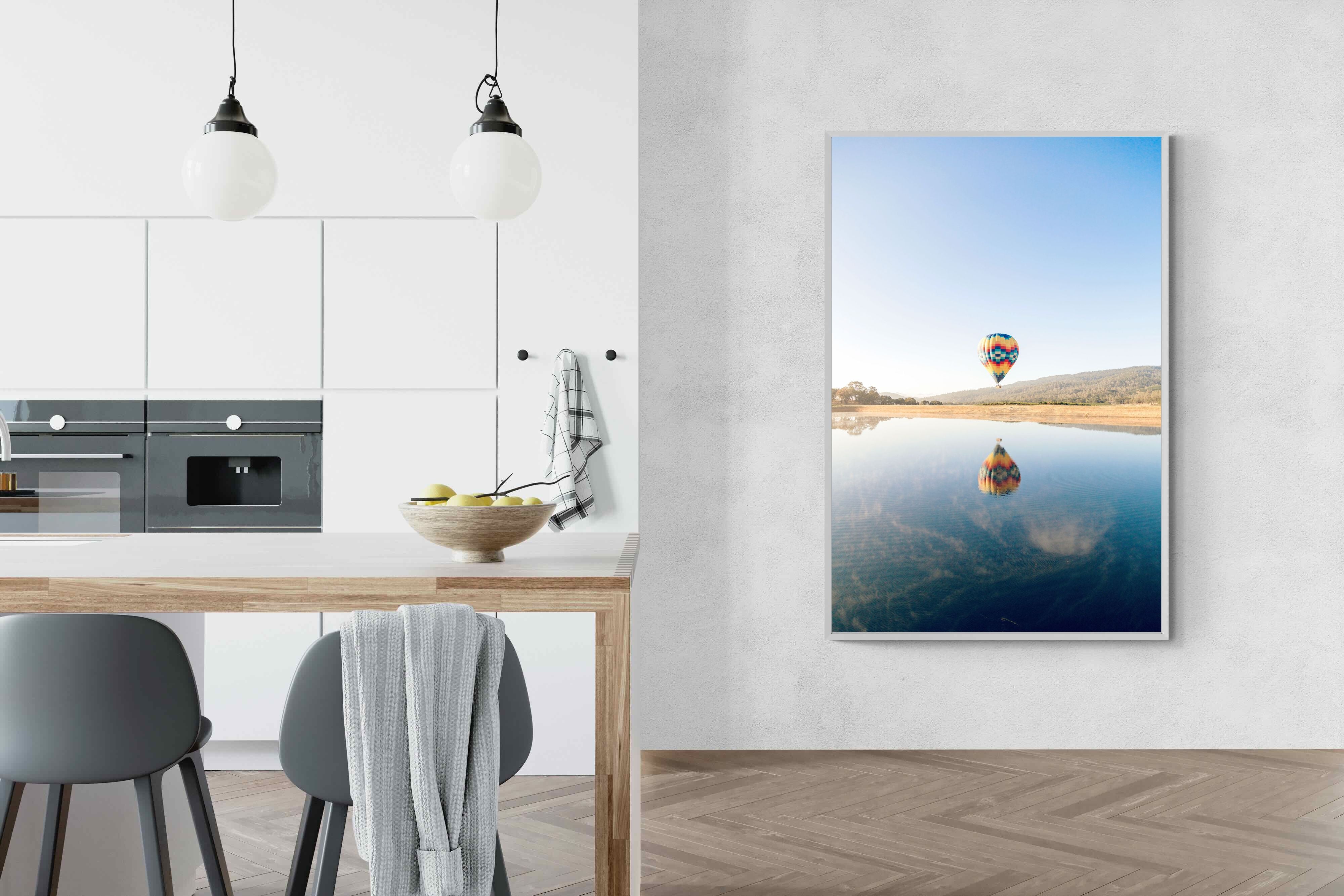 Captured at sunrise in the tranquil valleys of Napa Valley, California, this photograph shows a vibrant hot air balloon drifting above the still waters of a quiet lake. The striking colours of the balloon are mirrored perfectly on the surface, creating a serene and captivating image. The scene evokes a sense of peace and adventure. Ideal for contemporary homes, this piece will bring a touch of elegance, serenity, and vibrant energy to any living space.