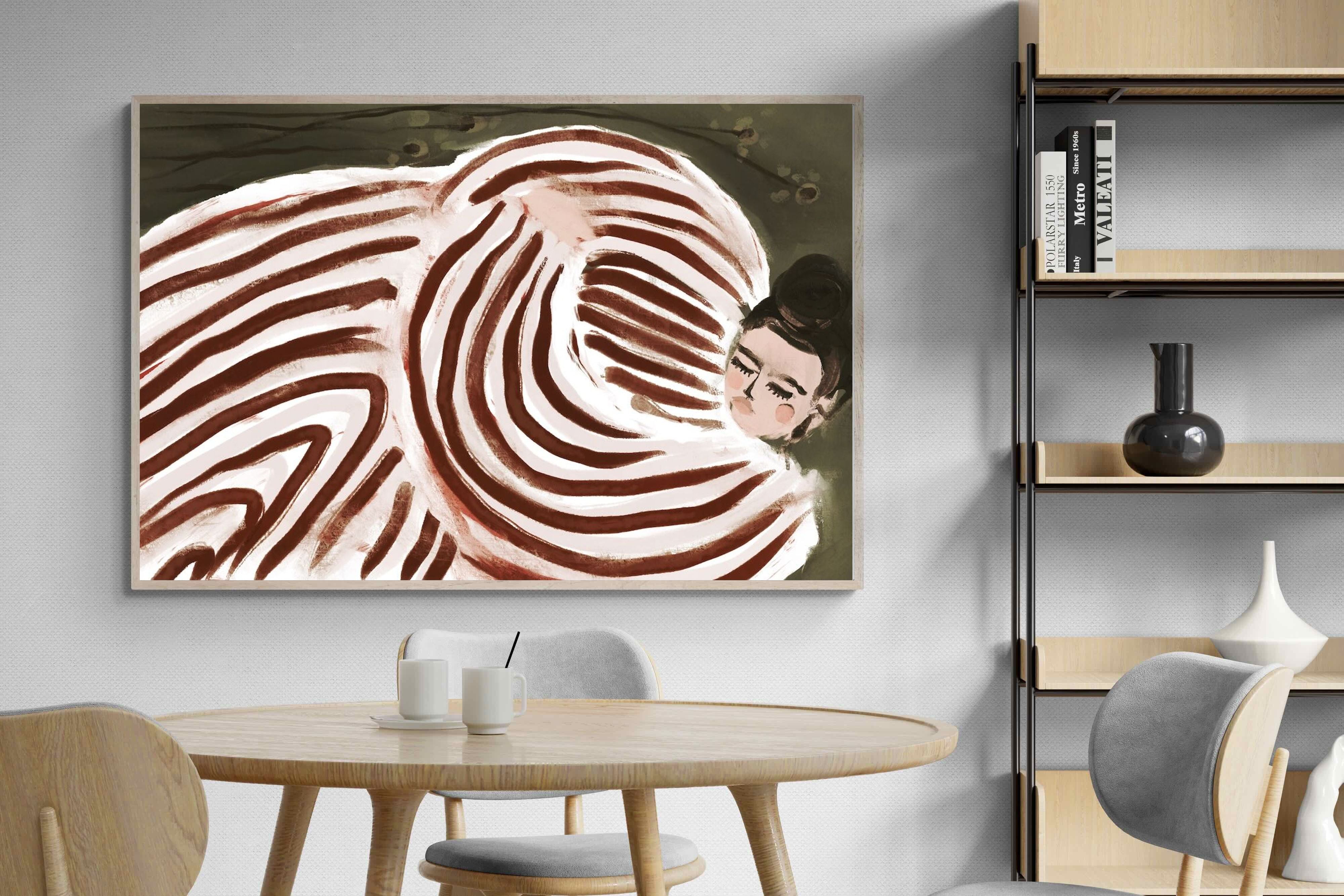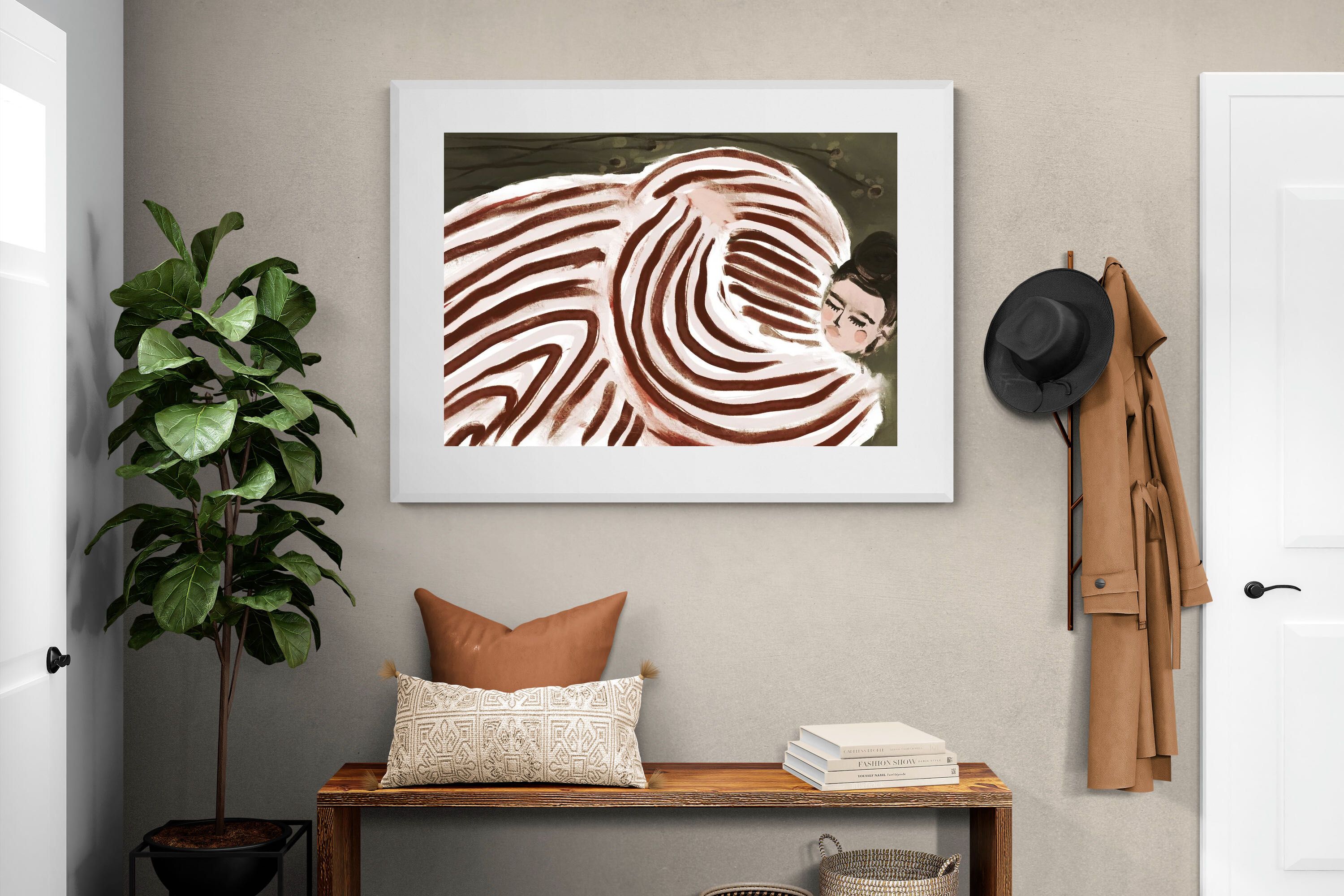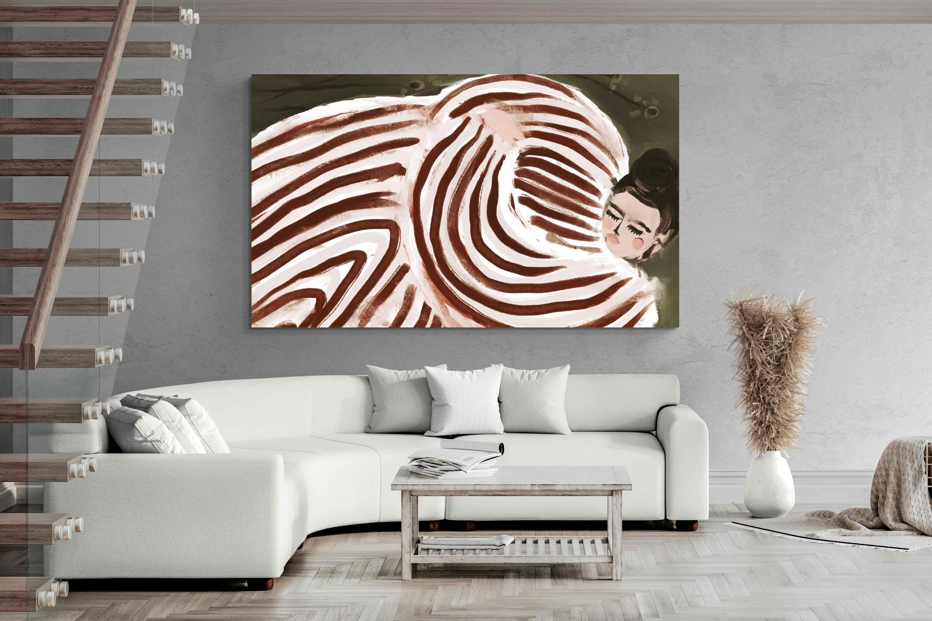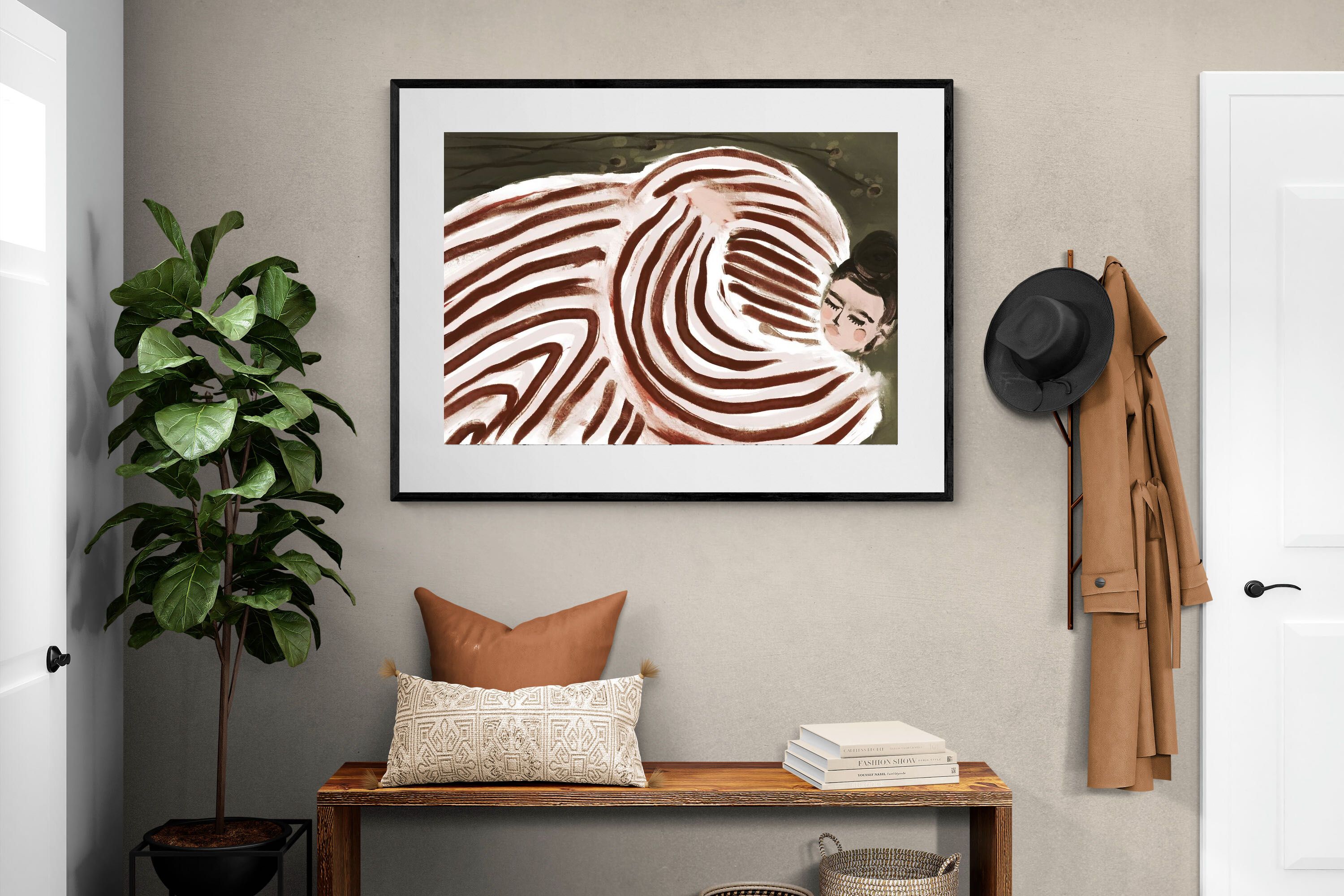 Depicting a serene figure wrapped in a striped blanket, this illustration exudes fun, tranquility and comfort. The soft, earthy tones and cozy composition create a soothing atmosphere, ideal for a relaxation space in a contemporary home. This artwork is a great choice for adding a touch of calm and introspection, making it a beautiful addition to bedrooms or quiet corners where peace and contemplation are desired.