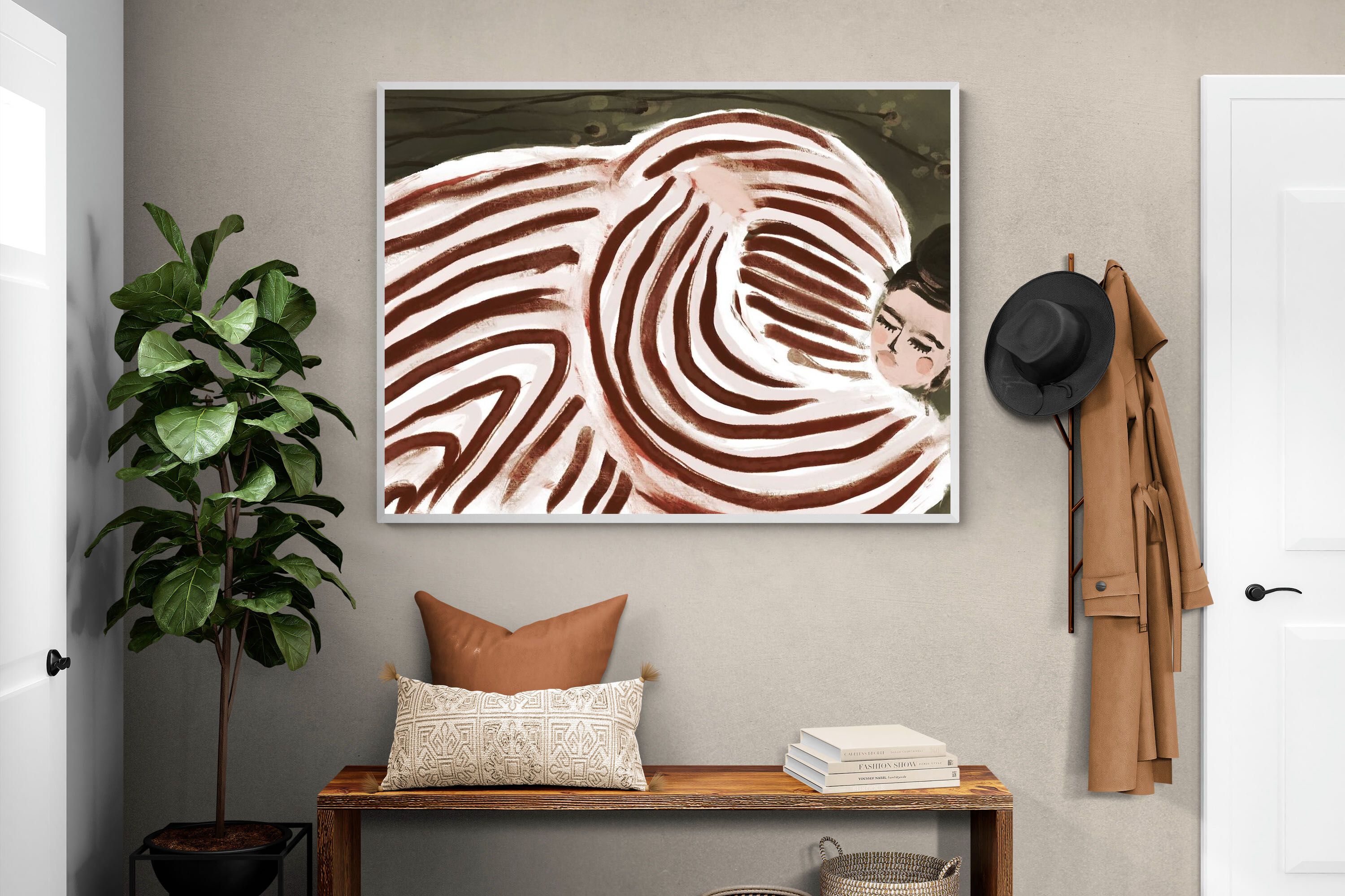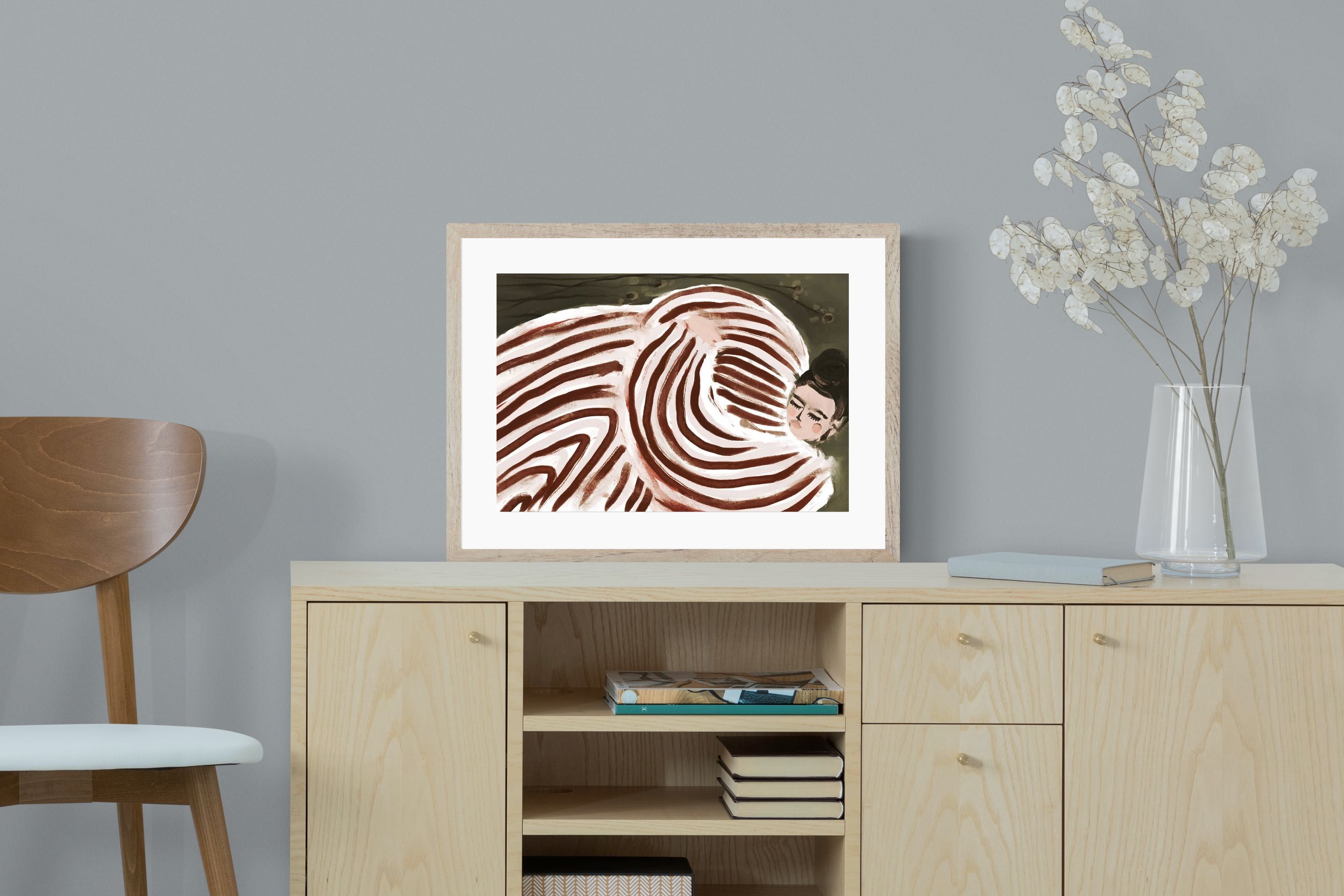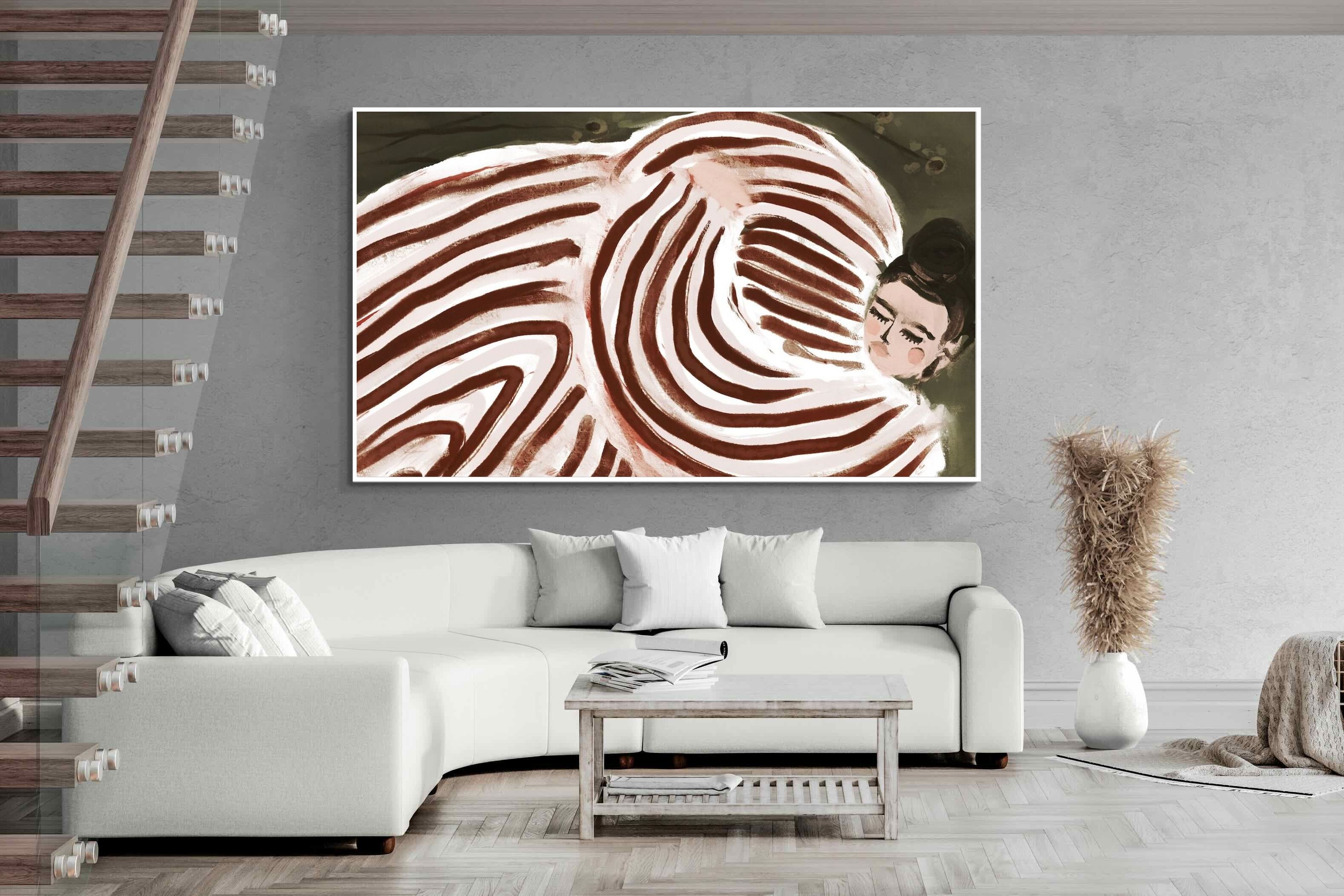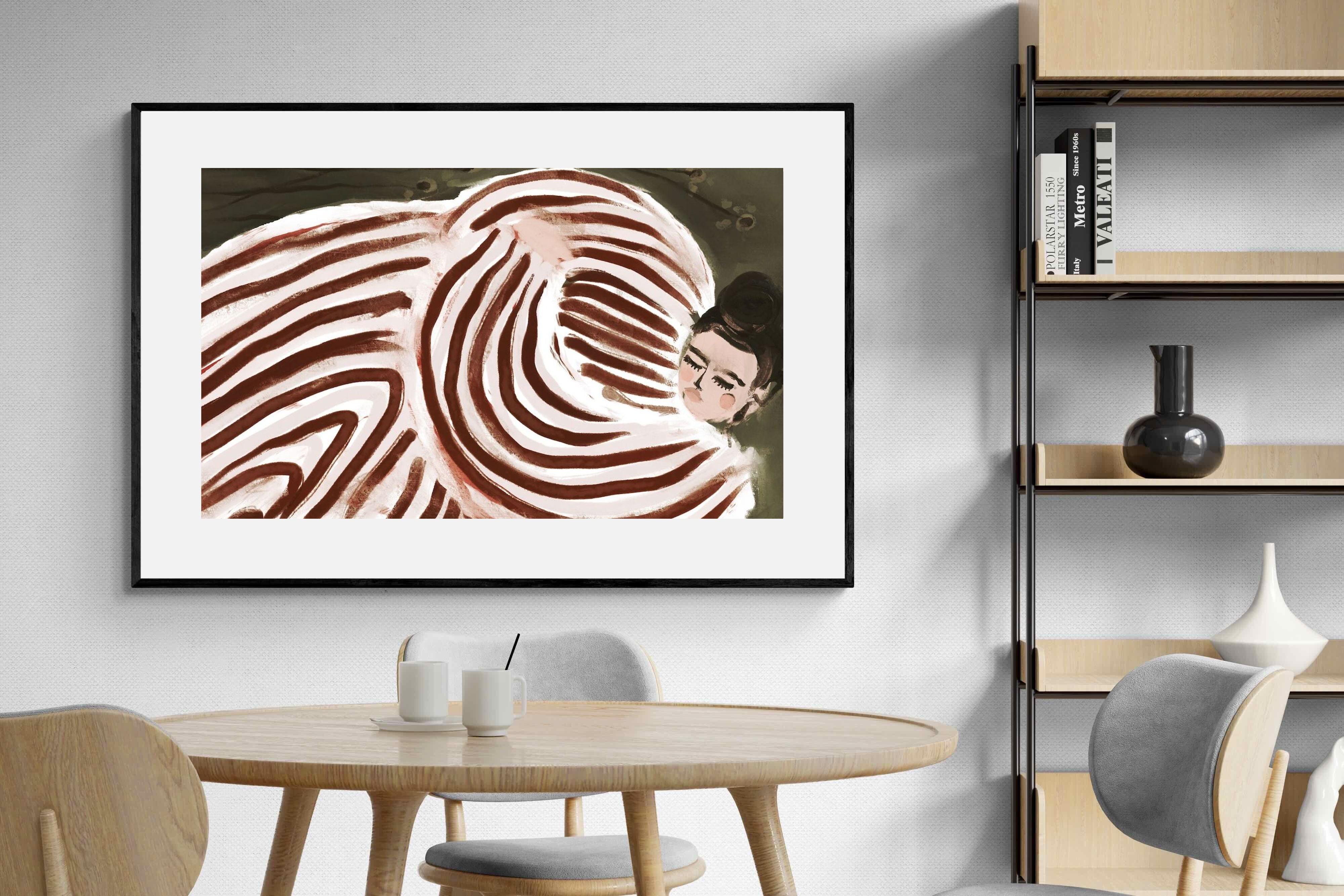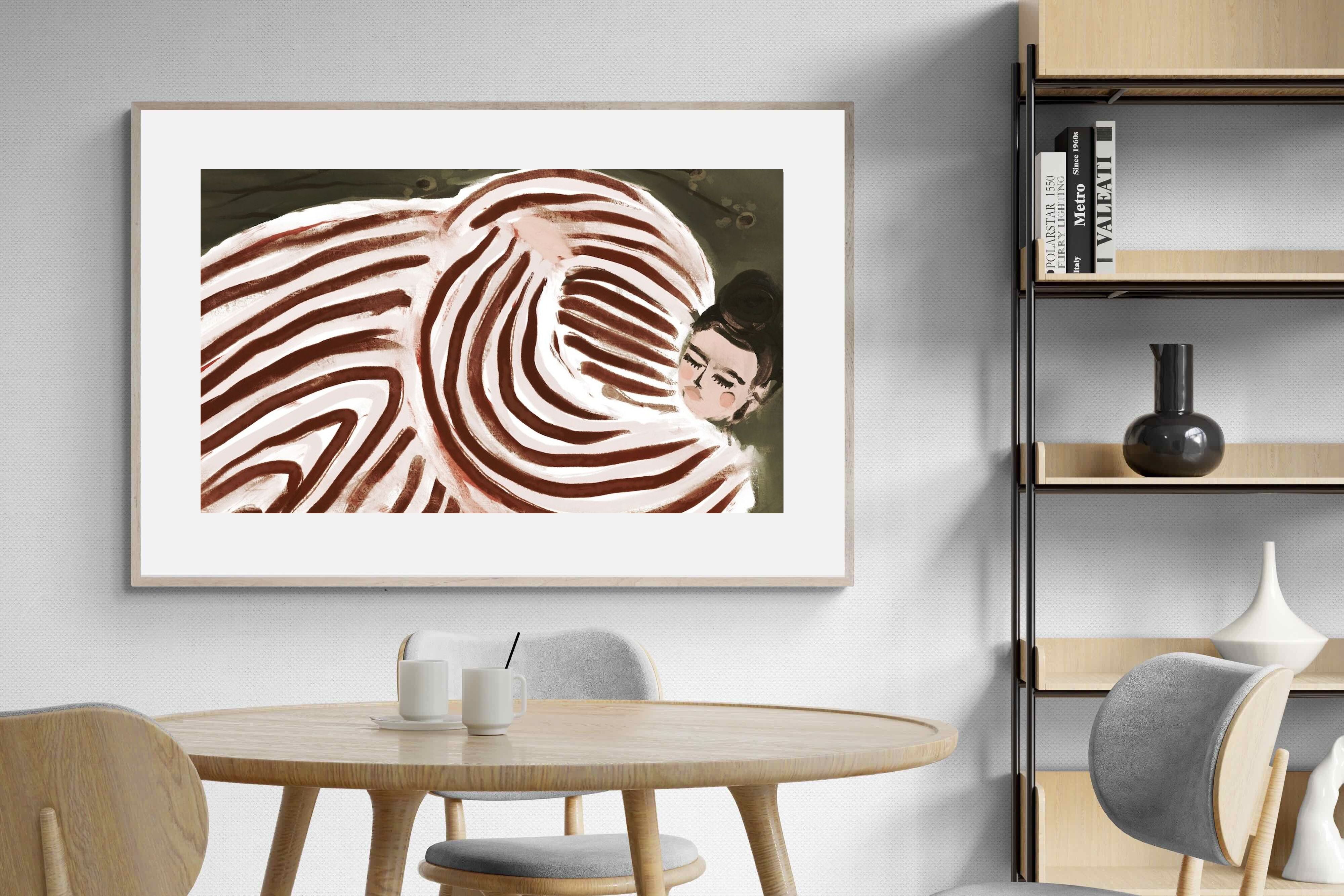 Depicting a serene figure wrapped in a striped blanket, this illustration exudes fun, tranquility and comfort. The soft, earthy tones and cozy composition create a soothing atmosphere, ideal for a relaxation space in a contemporary home. This artwork is a great choice for adding a touch of calm and introspection, making it a beautiful addition to bedrooms or quiet corners where peace and contemplation are desired.