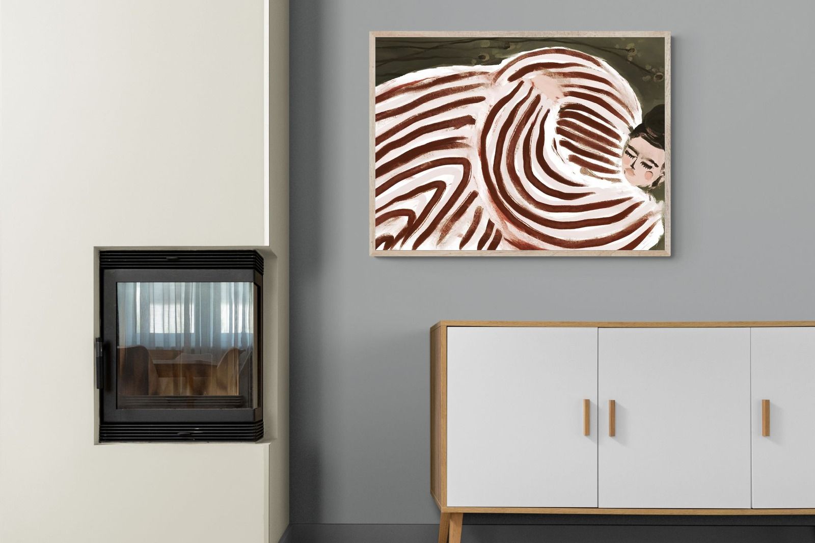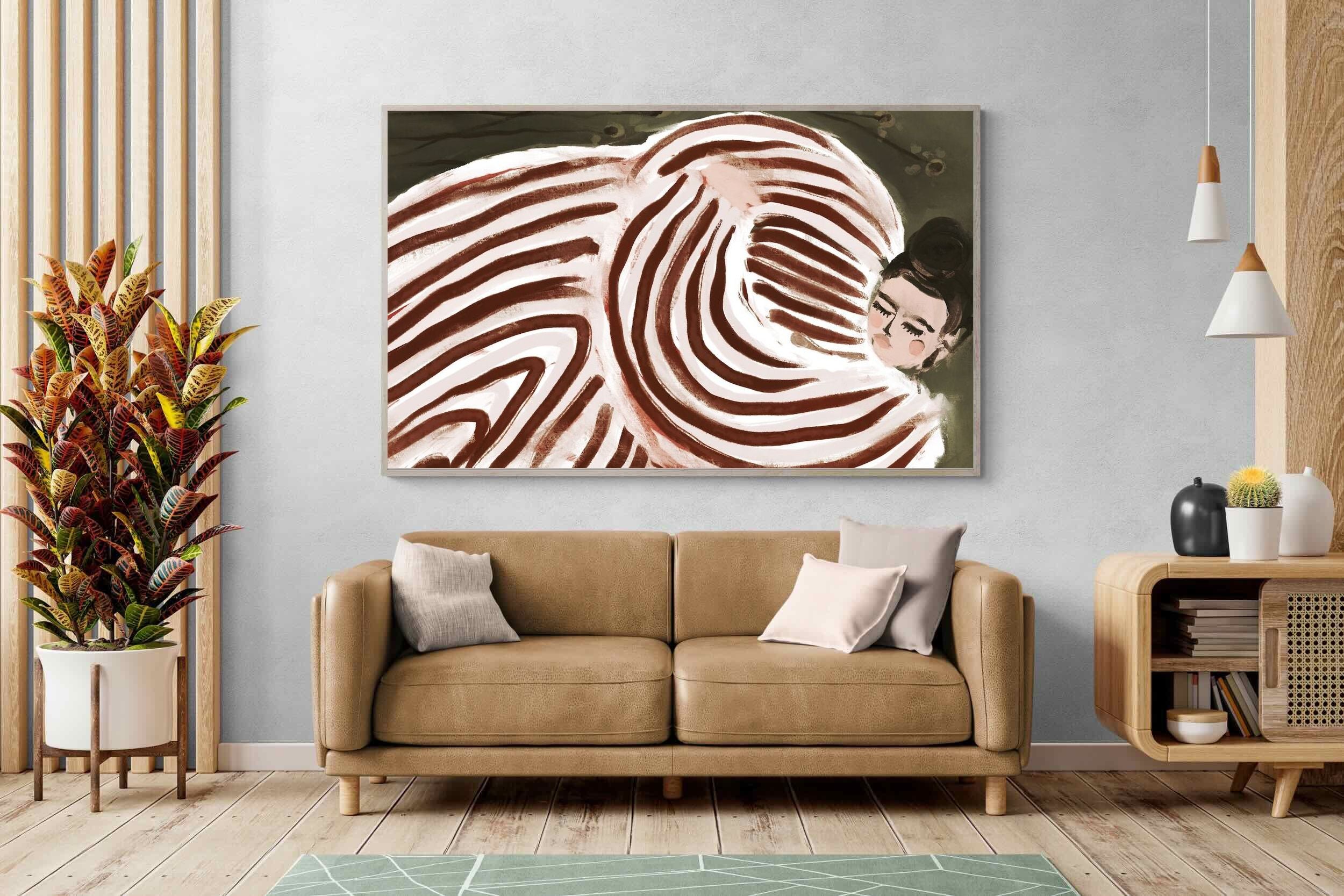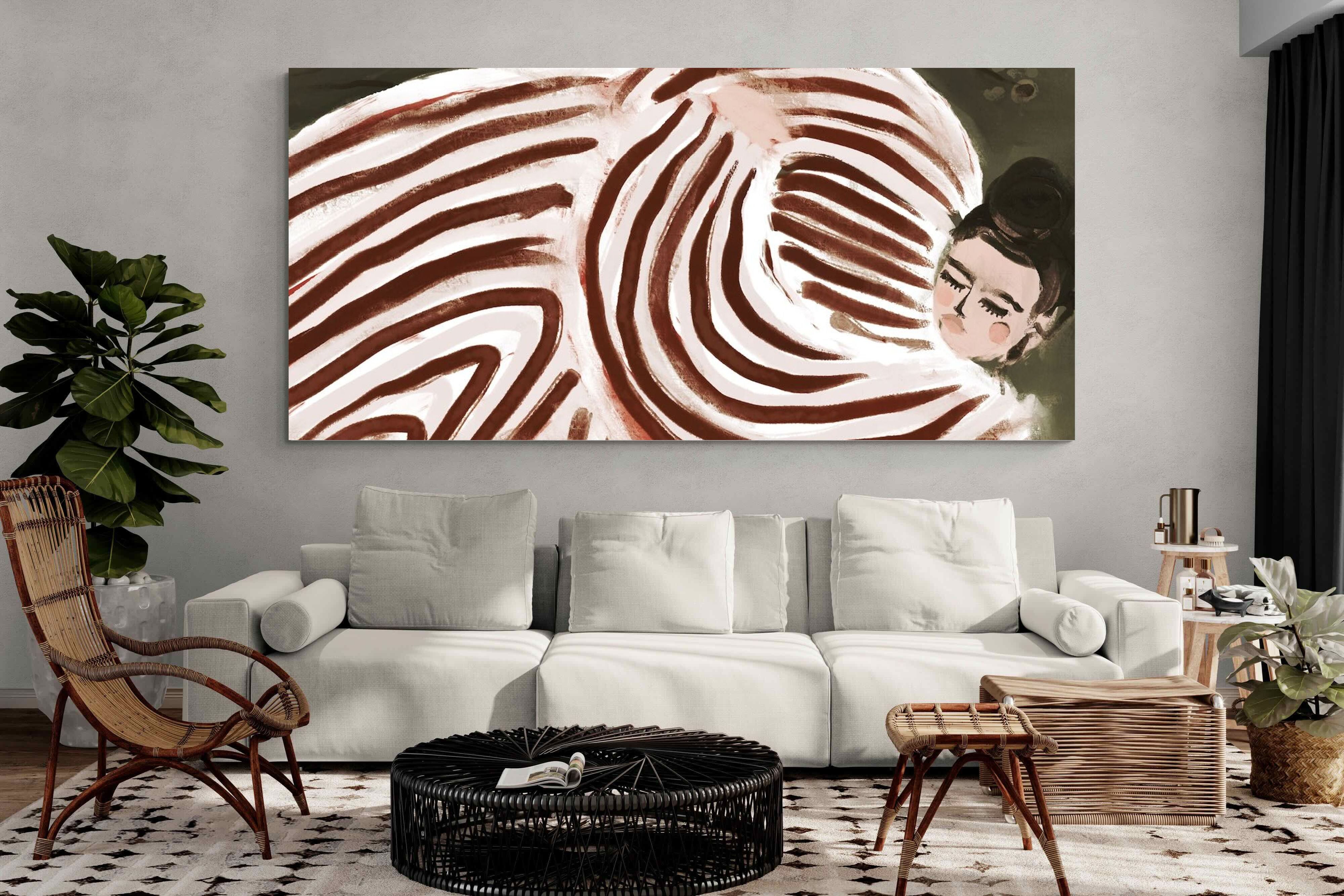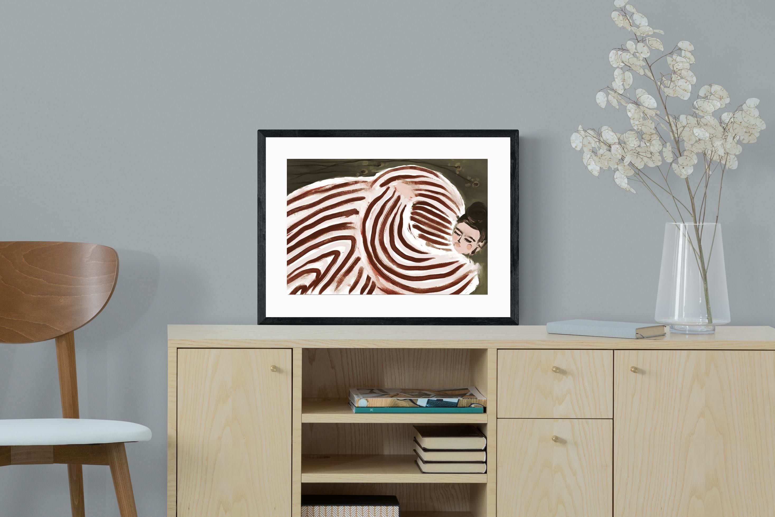 Depicting a serene figure wrapped in a striped blanket, this illustration exudes fun, tranquility and comfort. The soft, earthy tones and cozy composition create a soothing atmosphere, ideal for a relaxation space in a contemporary home. This artwork is a great choice for adding a touch of calm and introspection, making it a beautiful addition to bedrooms or quiet corners where peace and contemplation are desired.