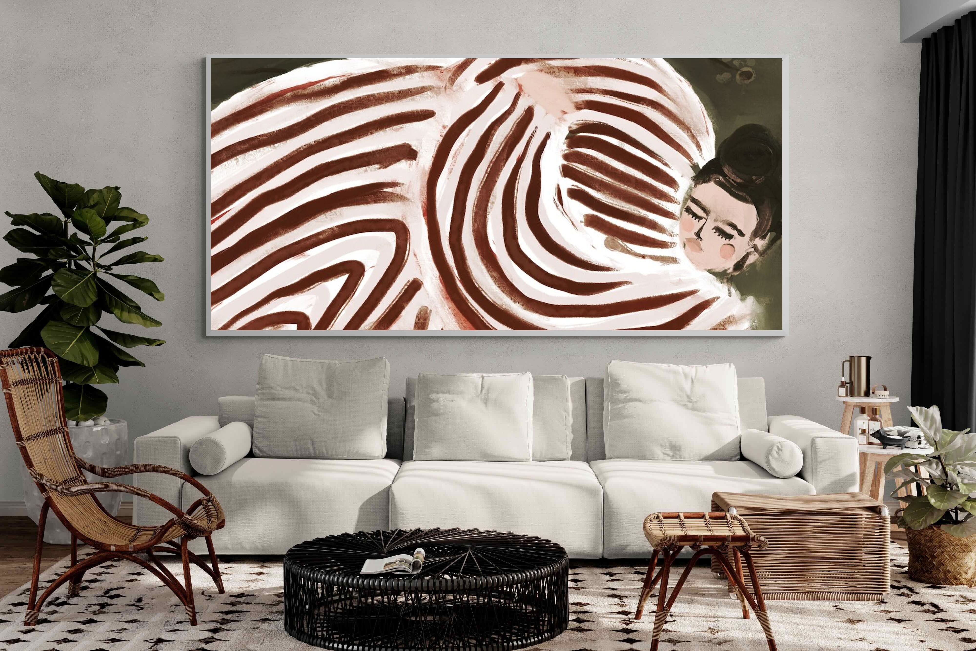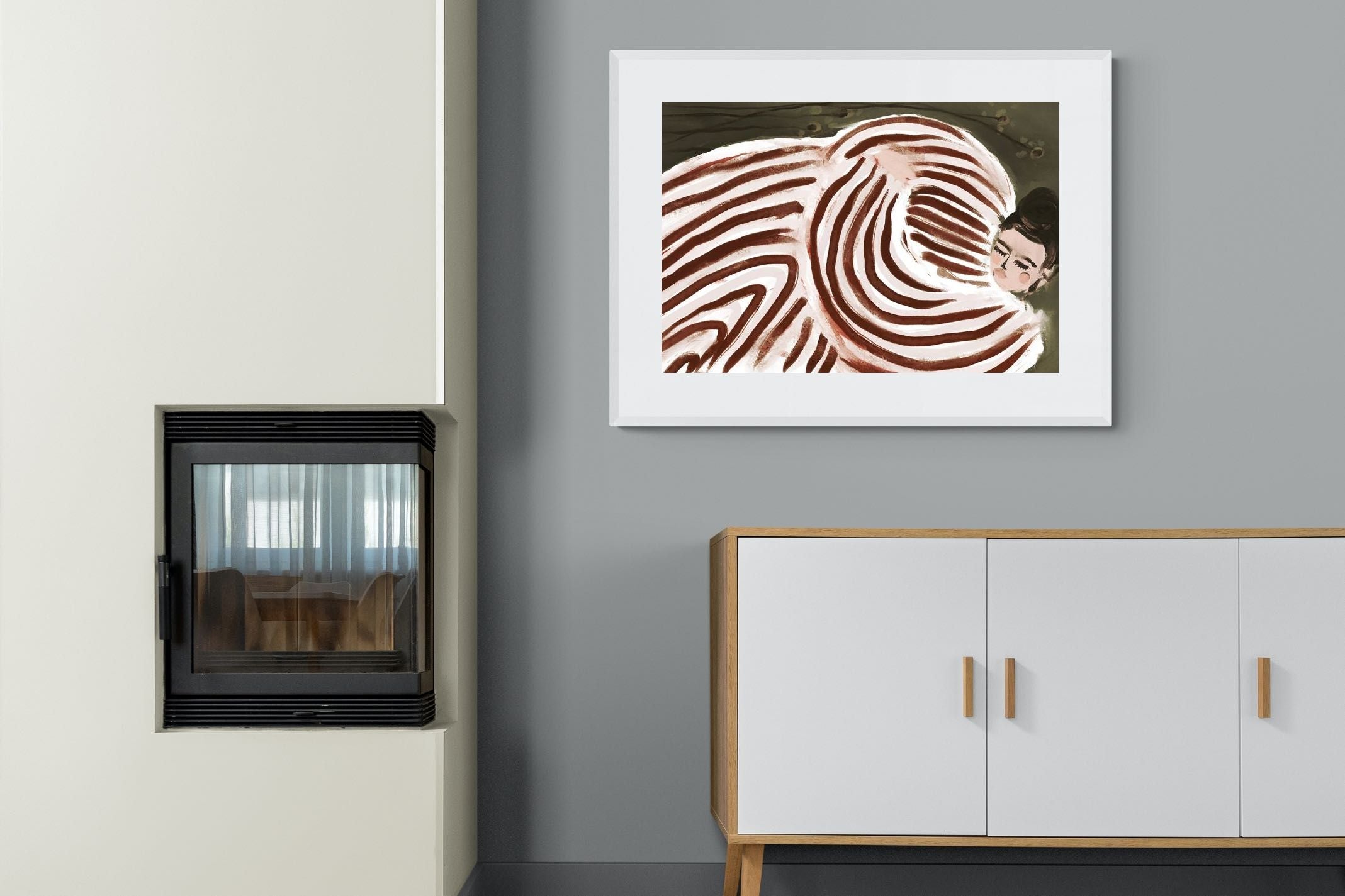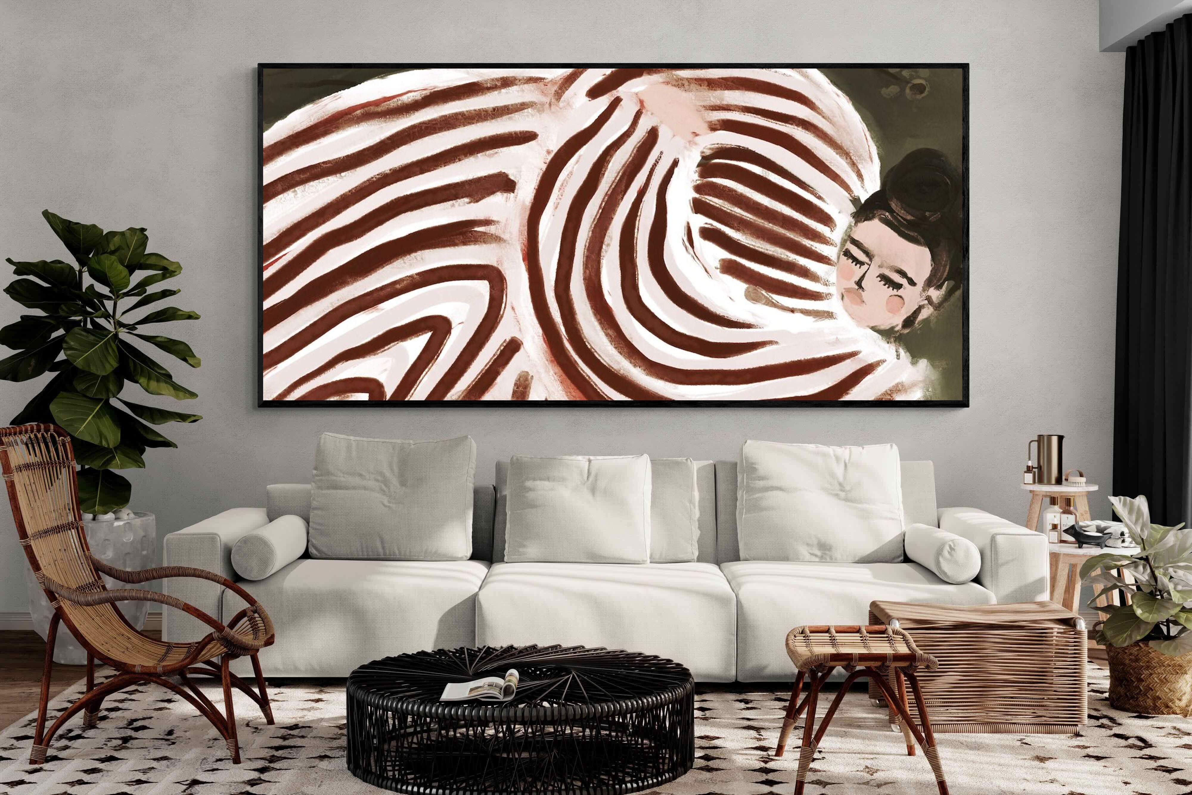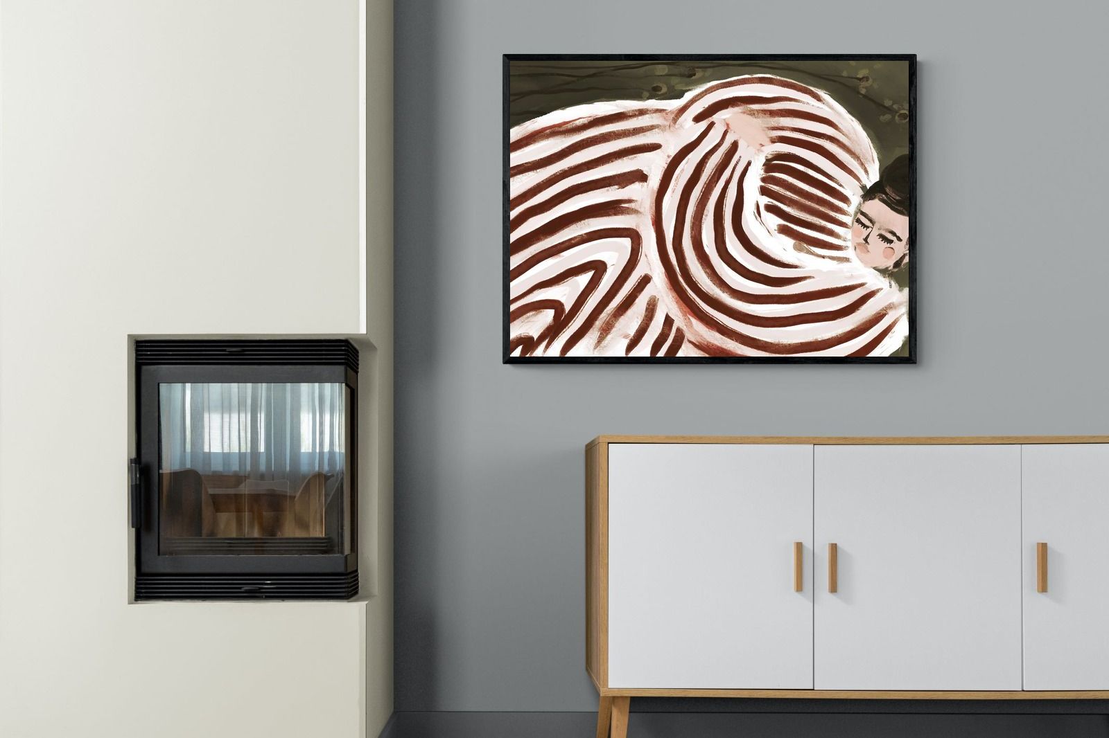 Depicting a serene figure wrapped in a striped blanket, this illustration exudes fun, tranquility and comfort. The soft, earthy tones and cozy composition create a soothing atmosphere, ideal for a relaxation space in a contemporary home. This artwork is a great choice for adding a touch of calm and introspection, making it a beautiful addition to bedrooms or quiet corners where peace and contemplation are desired.