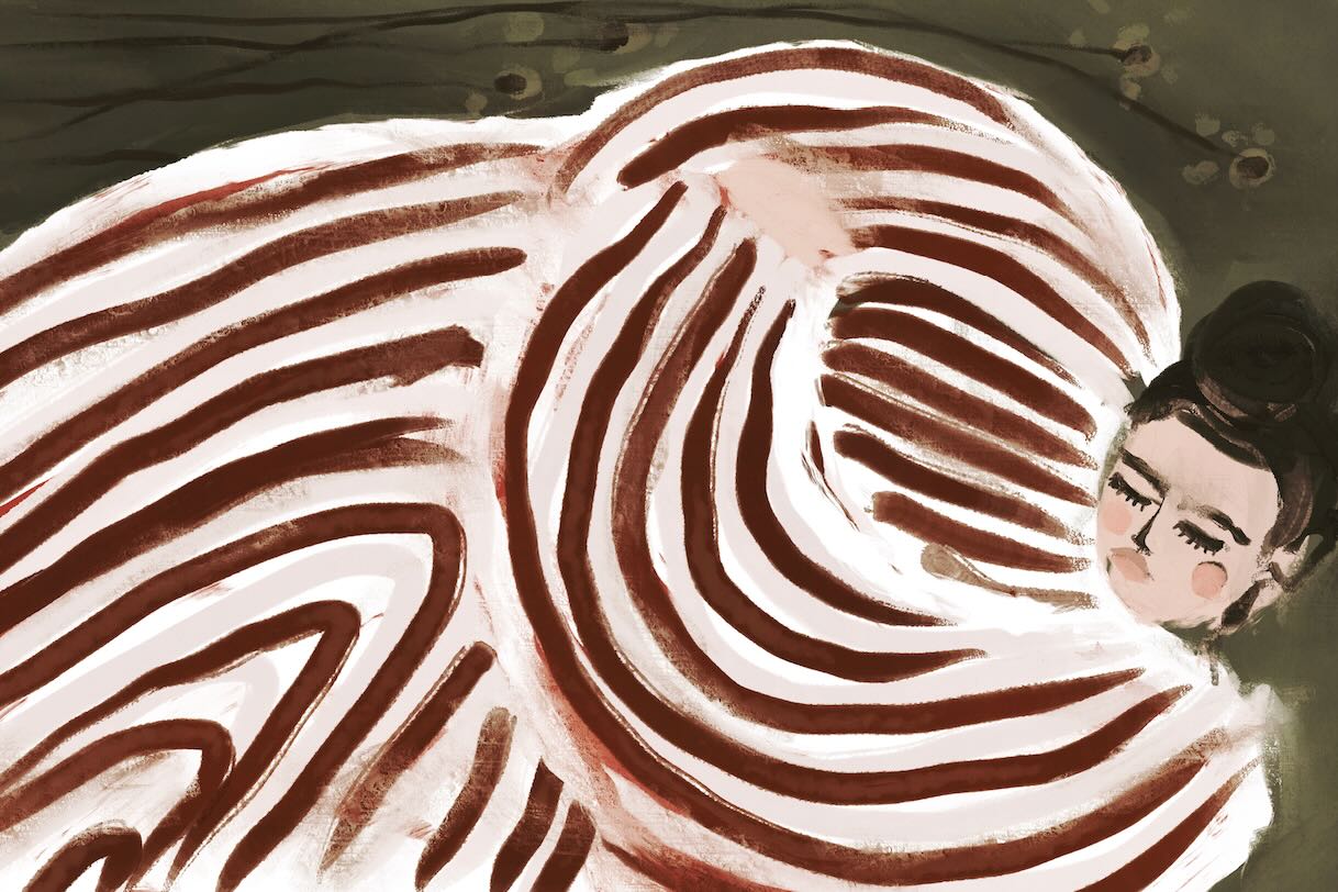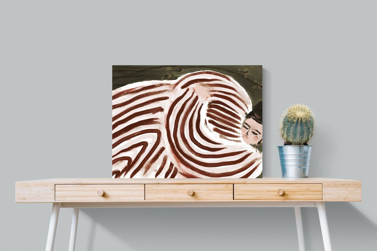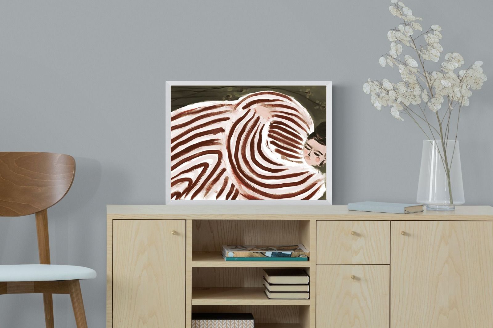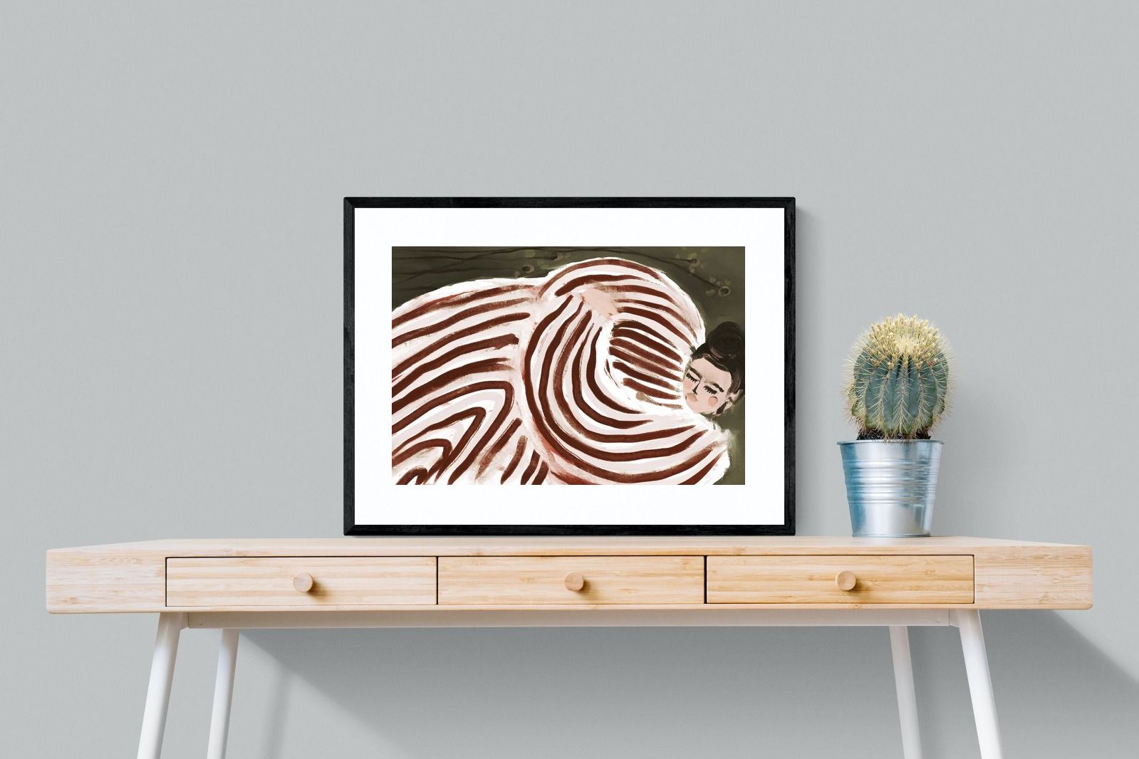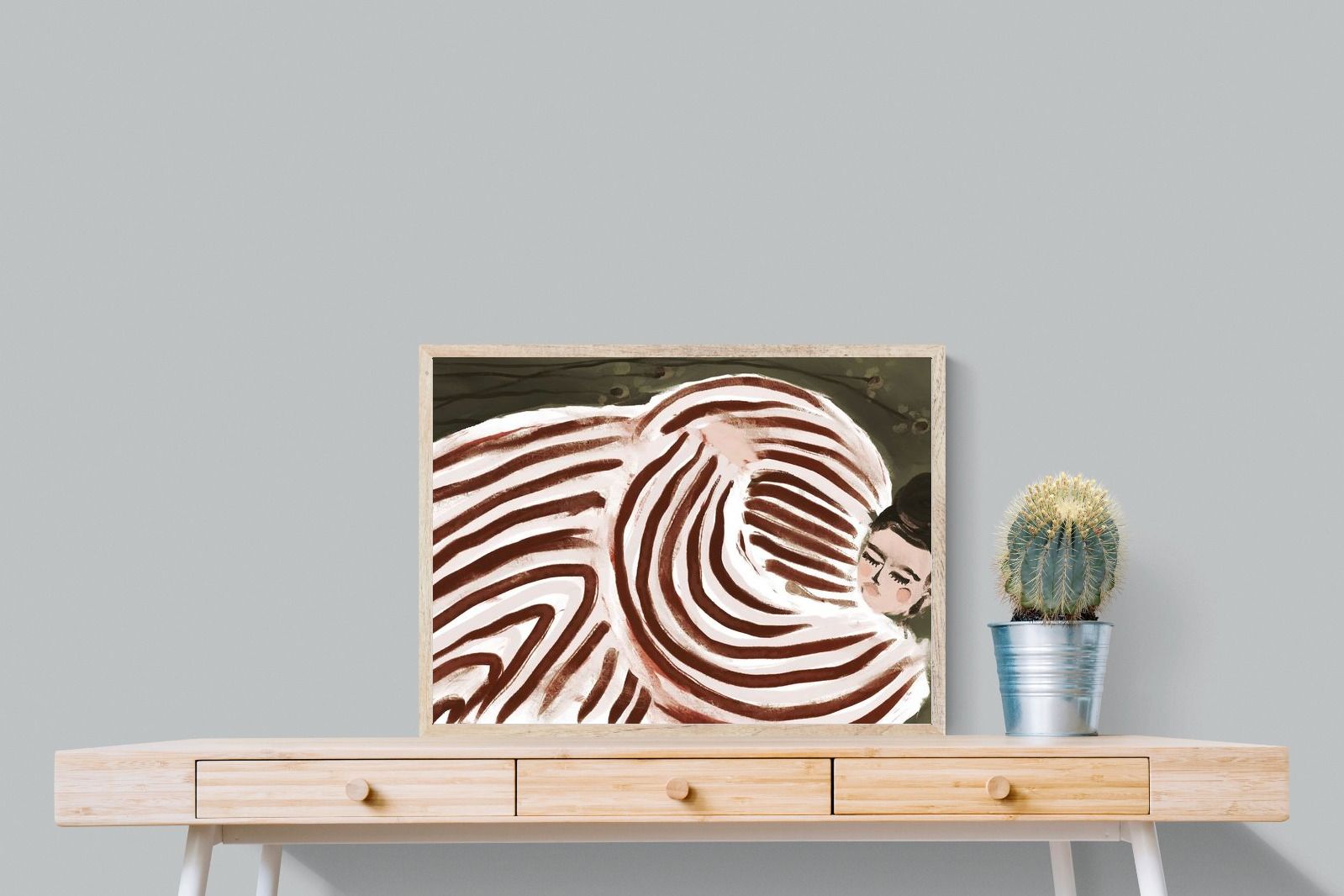 Depicting a serene figure wrapped in a striped blanket, this illustration exudes fun, tranquility and comfort. The soft, earthy tones and cozy composition create a soothing atmosphere, ideal for a relaxation space in a contemporary home. This artwork is a great choice for adding a touch of calm and introspection, making it a beautiful addition to bedrooms or quiet corners where peace and contemplation are desired.