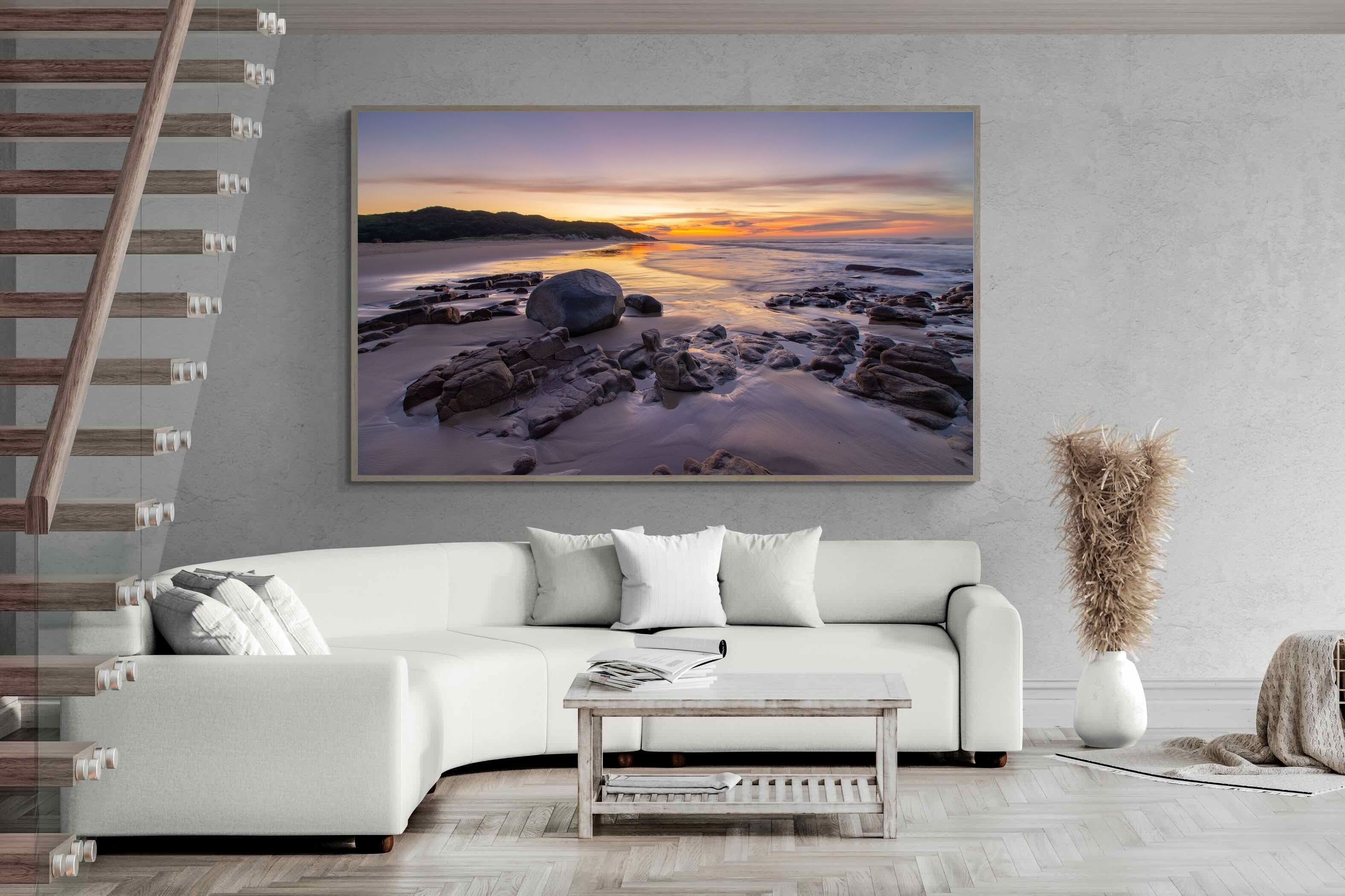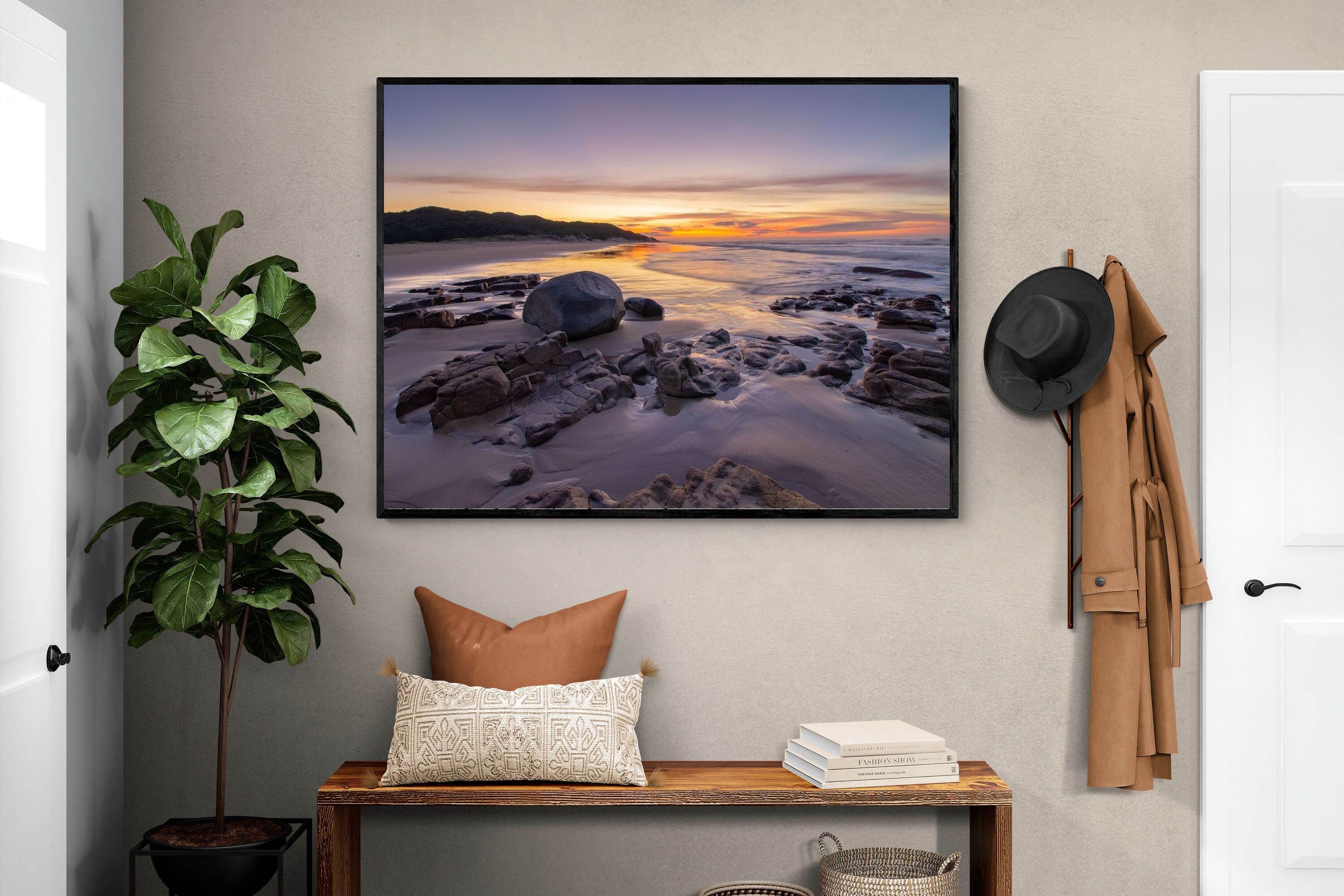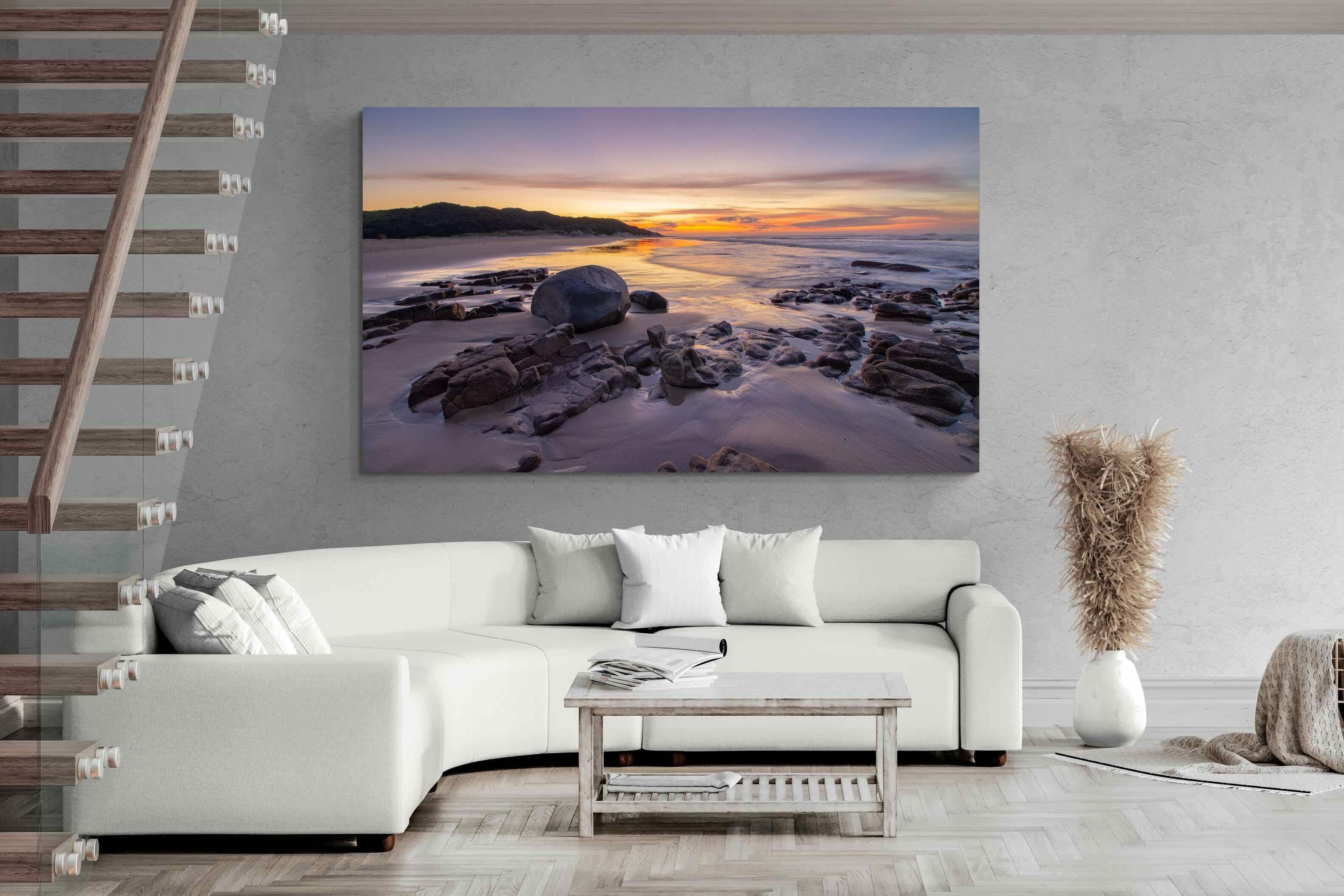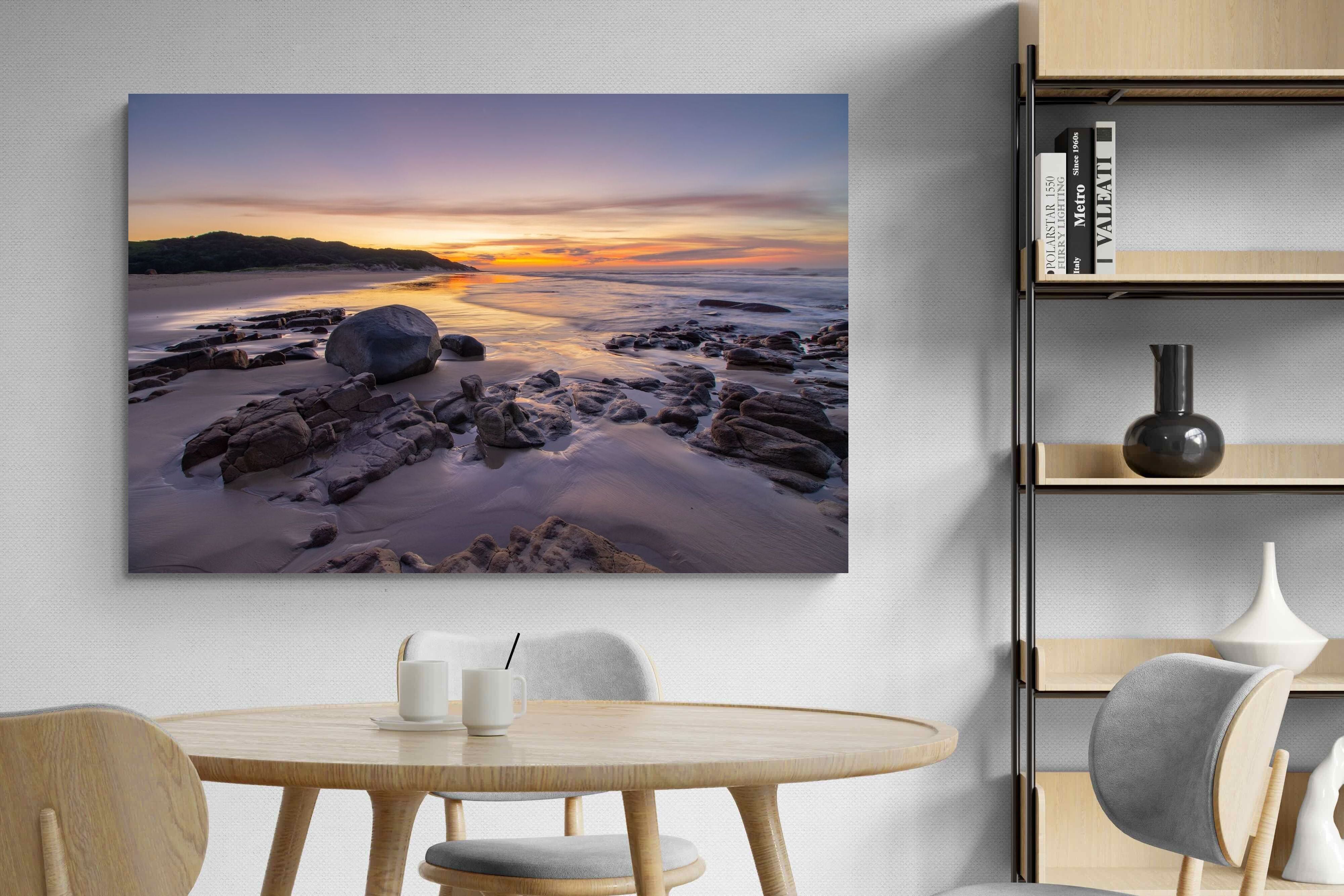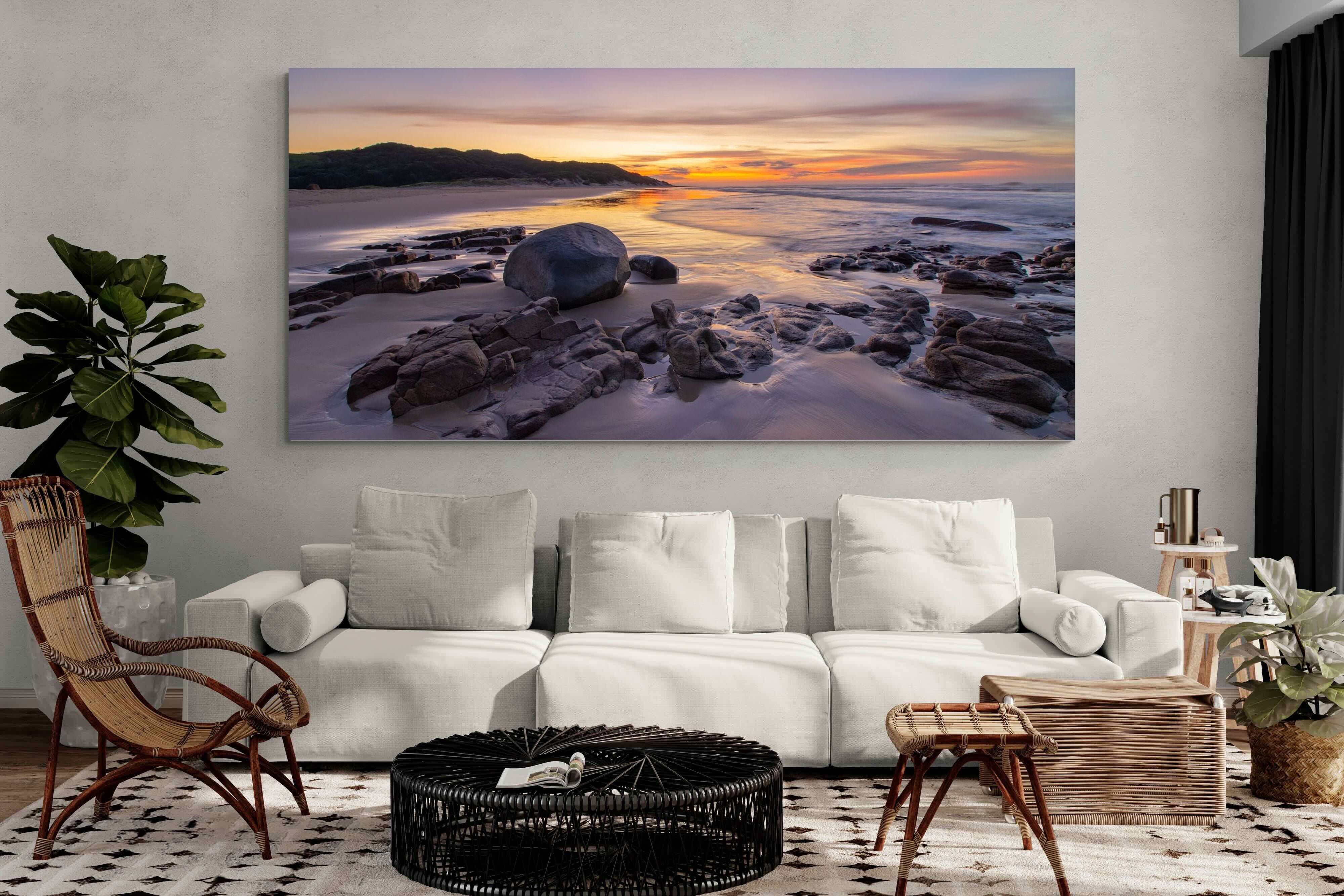 Soft dawn light washes over tidal rocks and smooth sands as the sun rises in gentle shades of apricot, lilac and gold. The foreground stones glisten with receding water, drawing the eye toward the glowing horizon and untouched Wild Coast shoreline. This calming seascape suits contemporary living rooms, minimalist interiors, coastal-themed bedrooms, or tranquil workspaces wanting a soothing, spacious artwork with natural colour harmony and quiet atmosphere.
