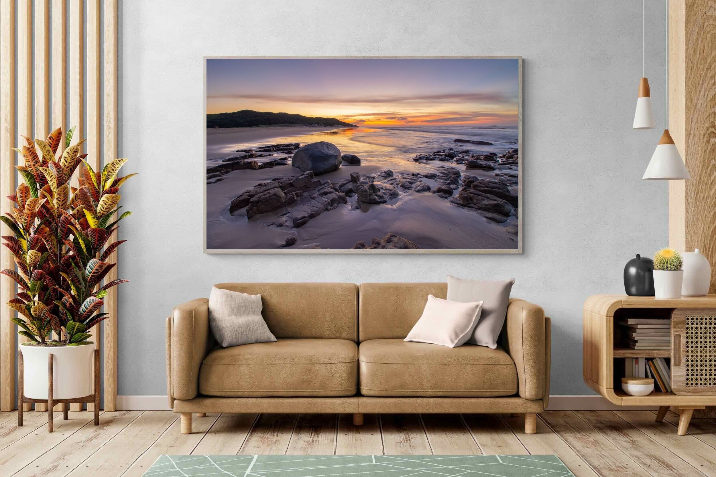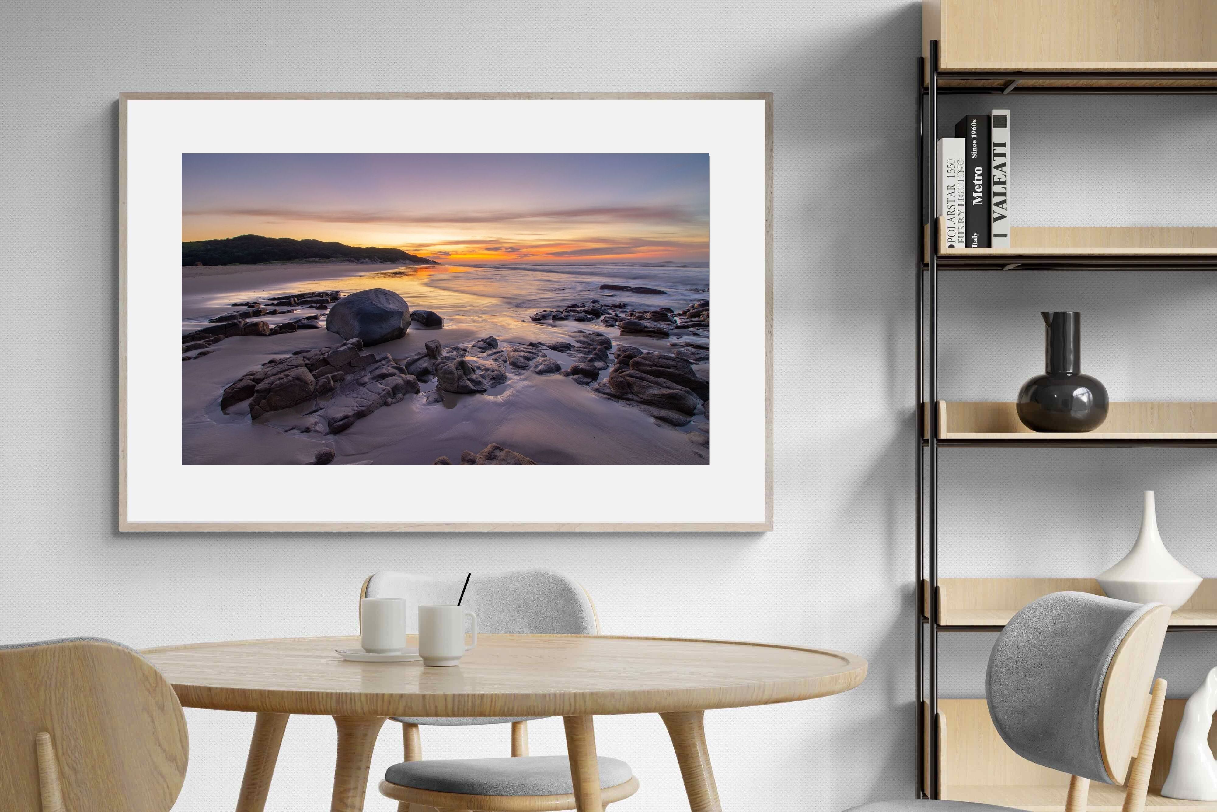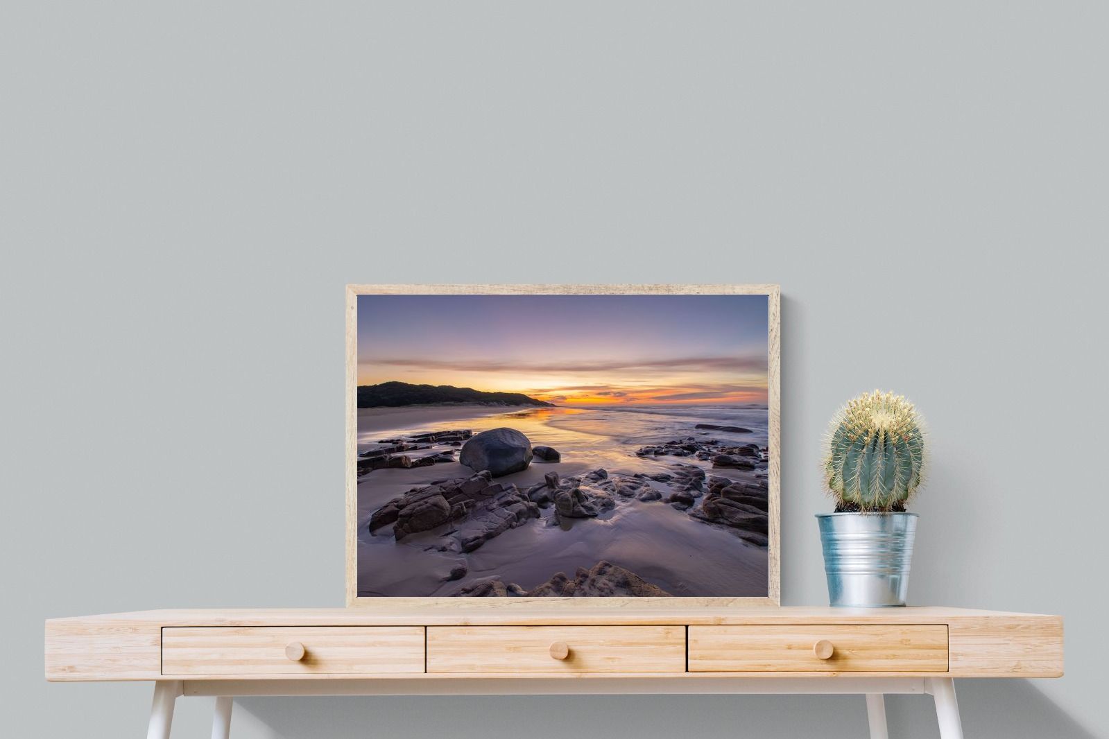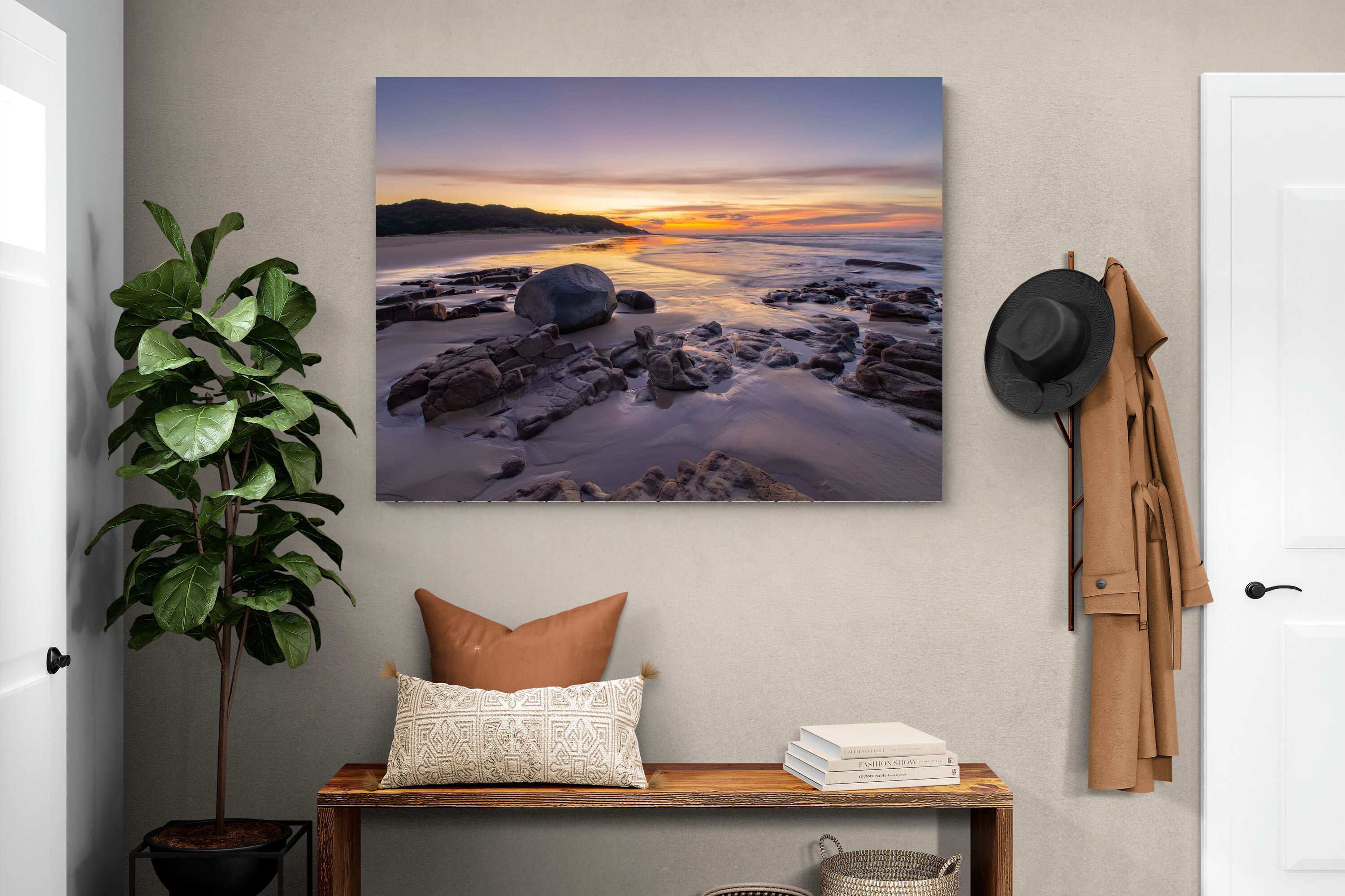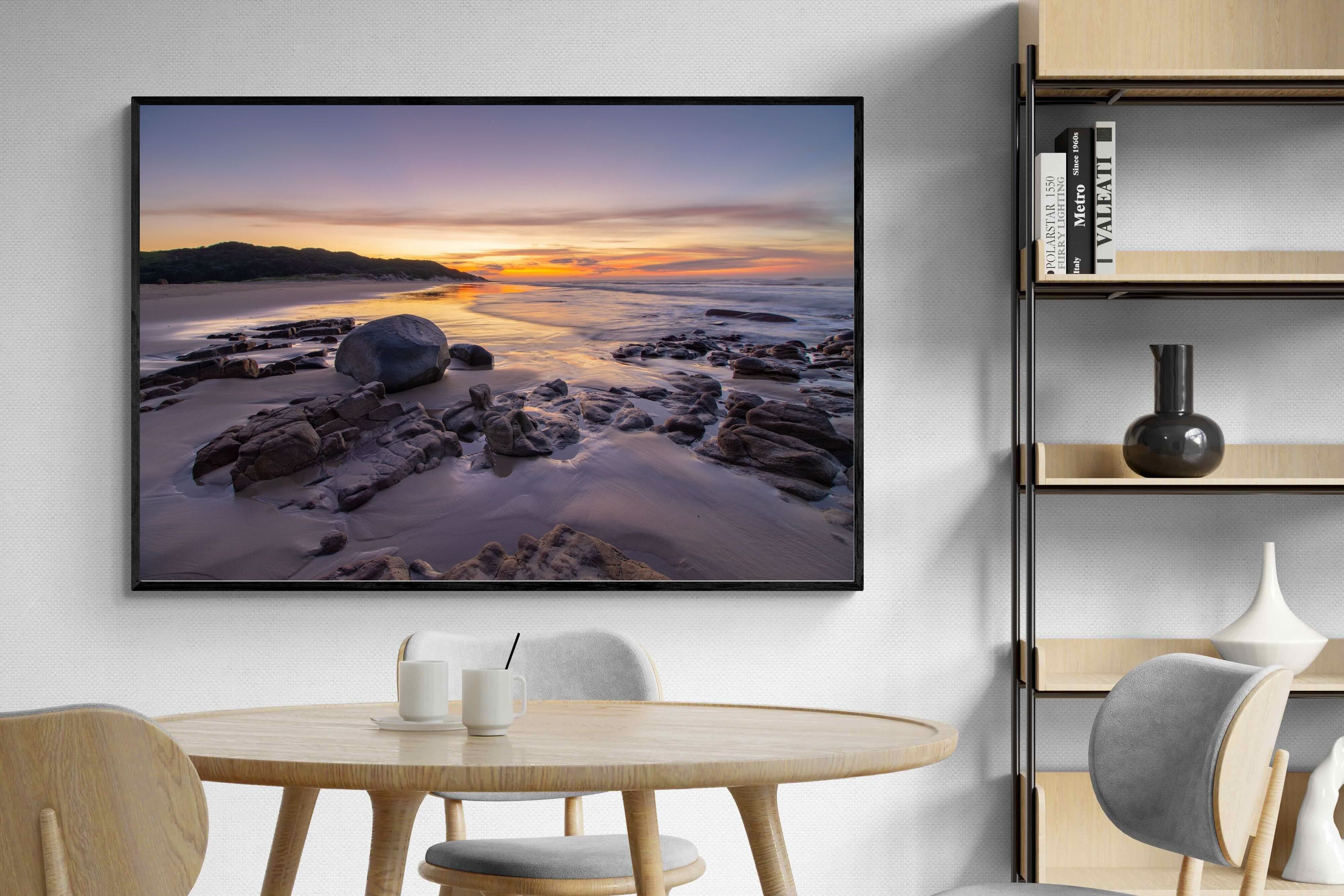 Soft dawn light washes over tidal rocks and smooth sands as the sun rises in gentle shades of apricot, lilac and gold. The foreground stones glisten with receding water, drawing the eye toward the glowing horizon and untouched Wild Coast shoreline. This calming seascape suits contemporary living rooms, minimalist interiors, coastal-themed bedrooms, or tranquil workspaces wanting a soothing, spacious artwork with natural colour harmony and quiet atmosphere.