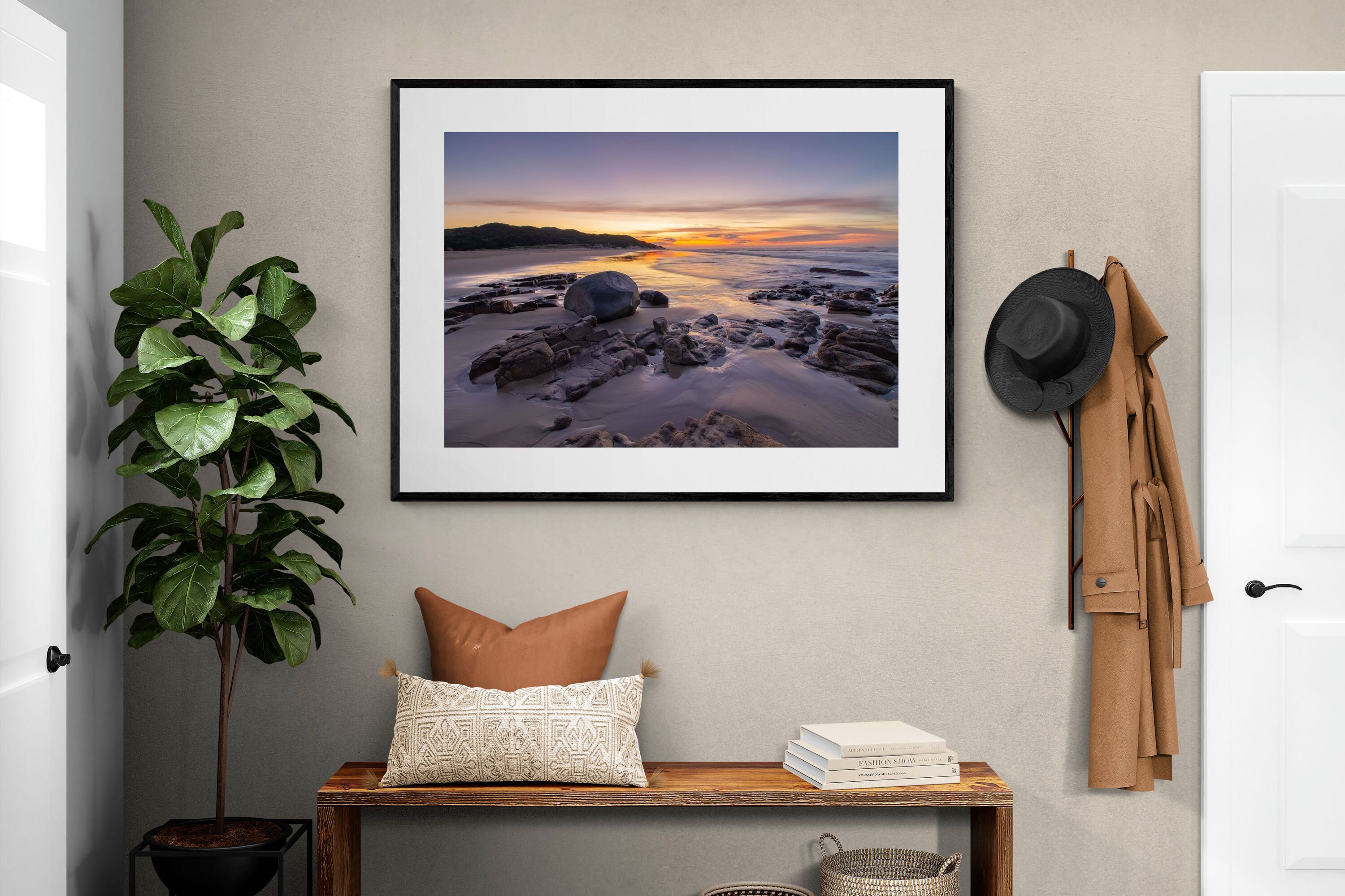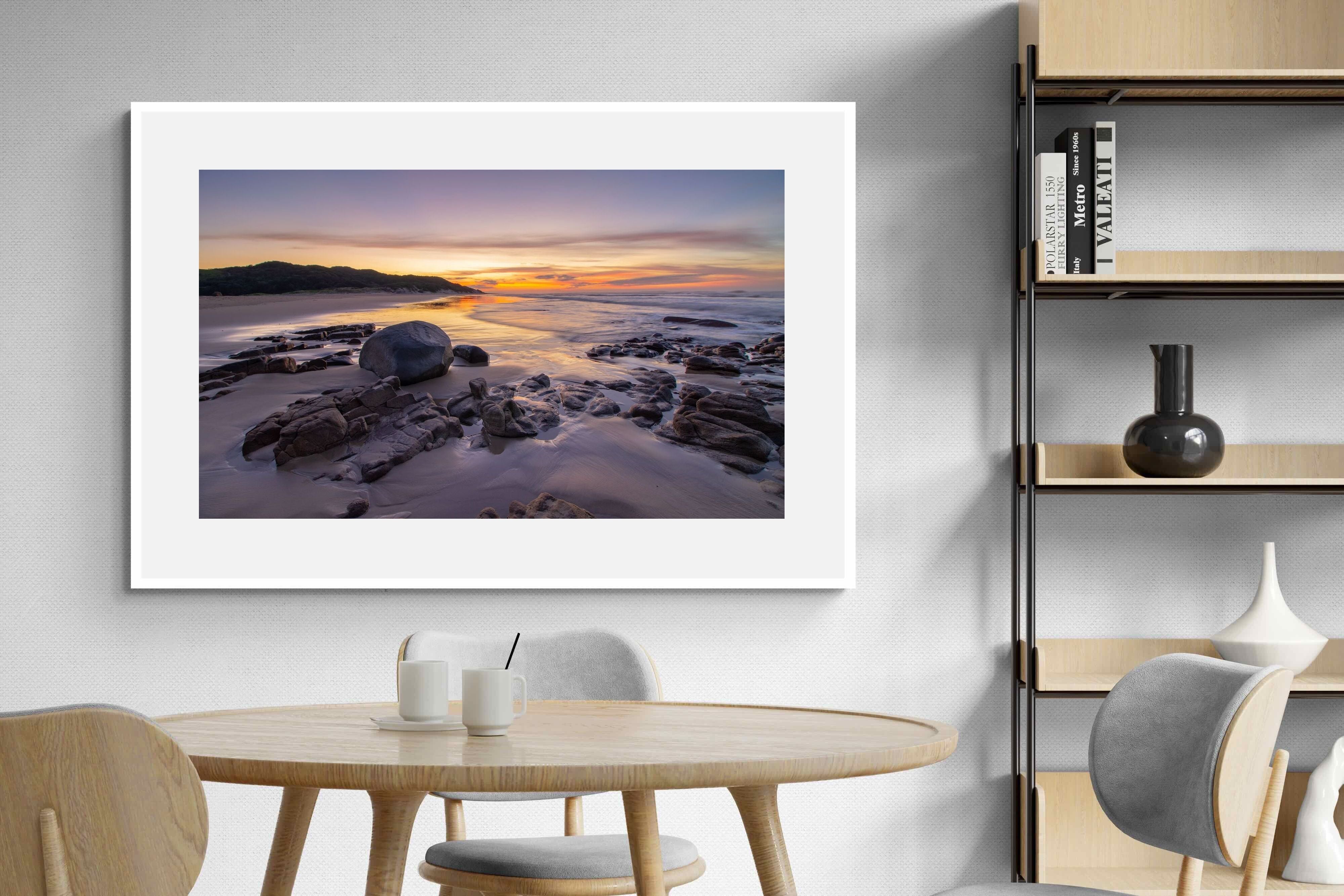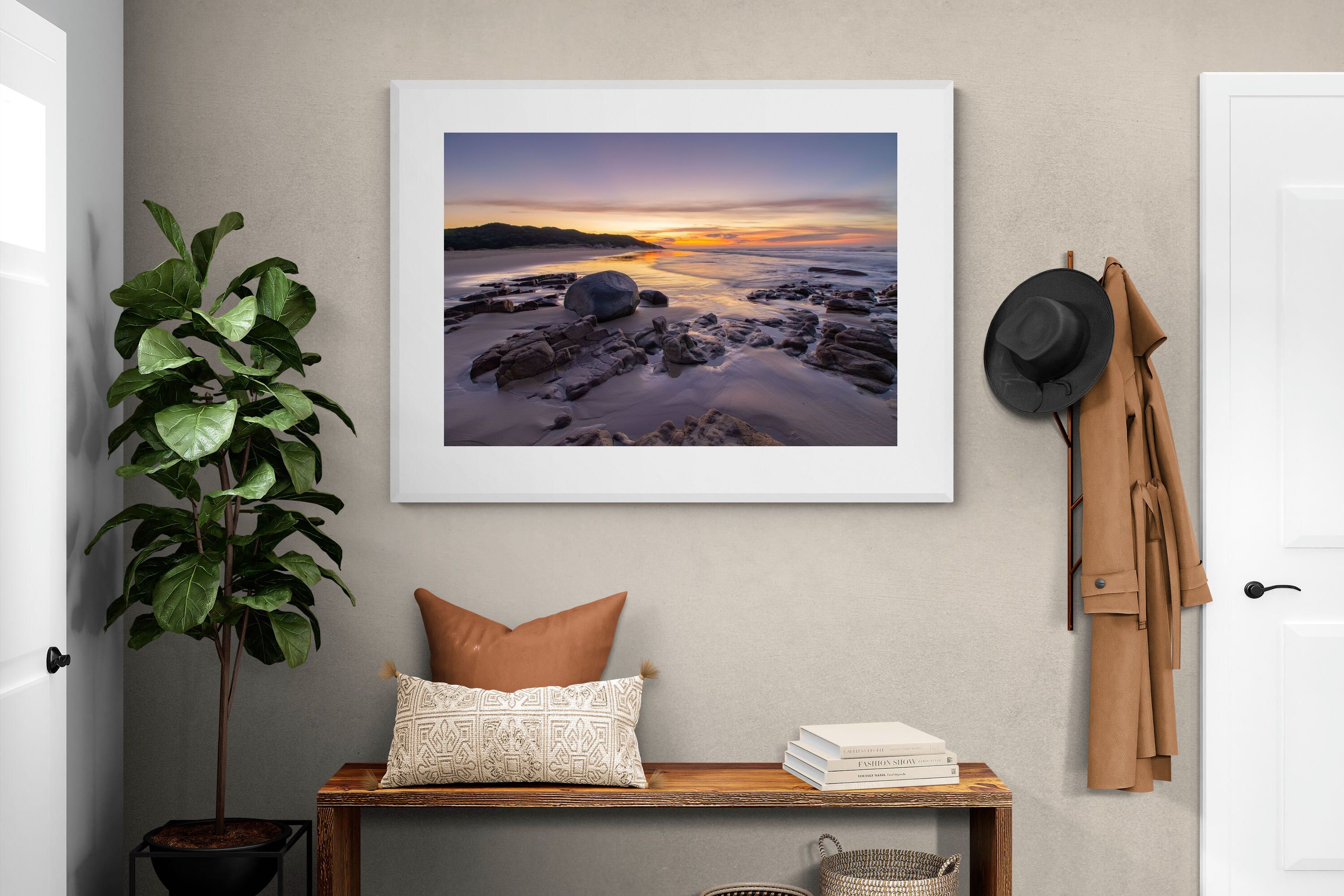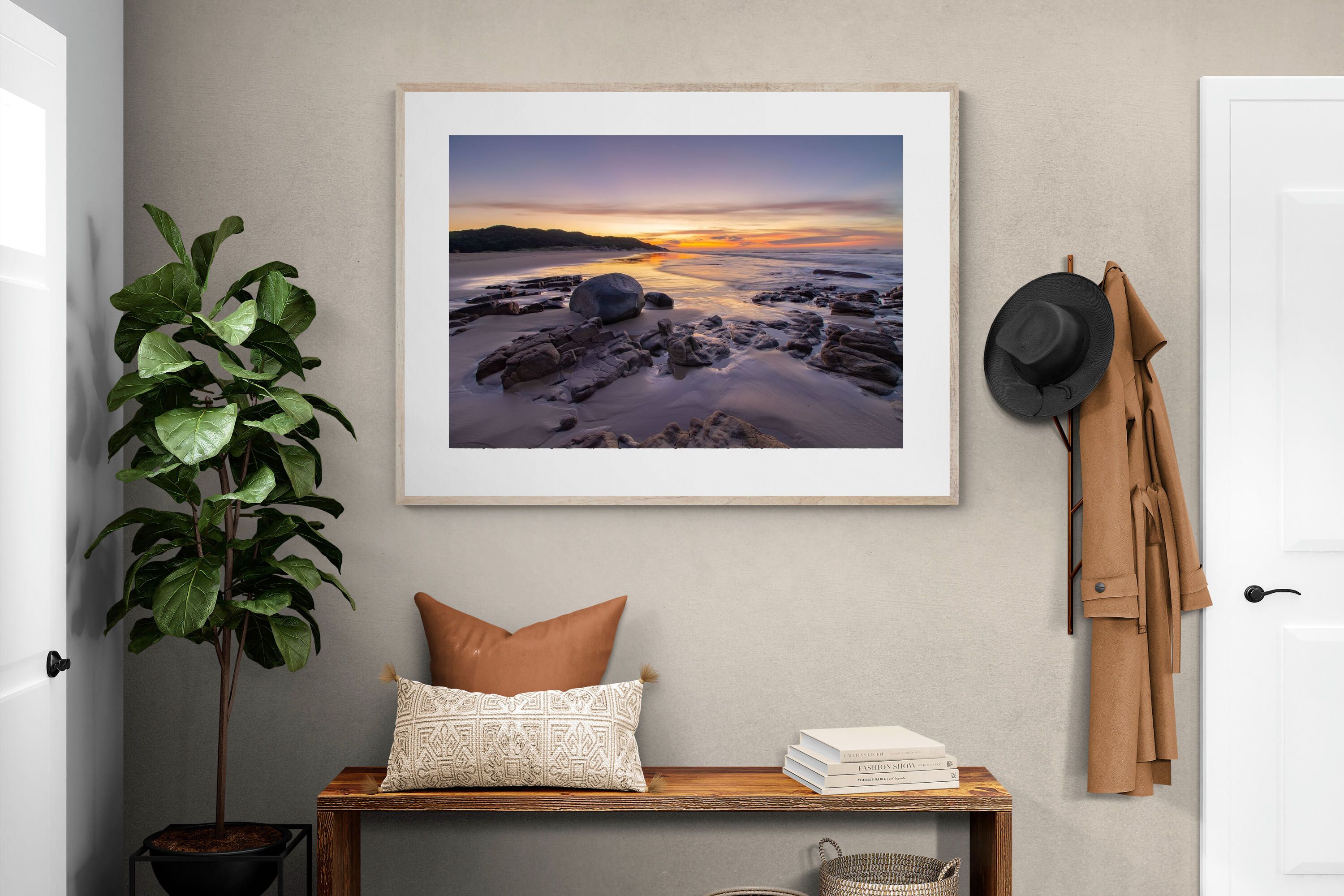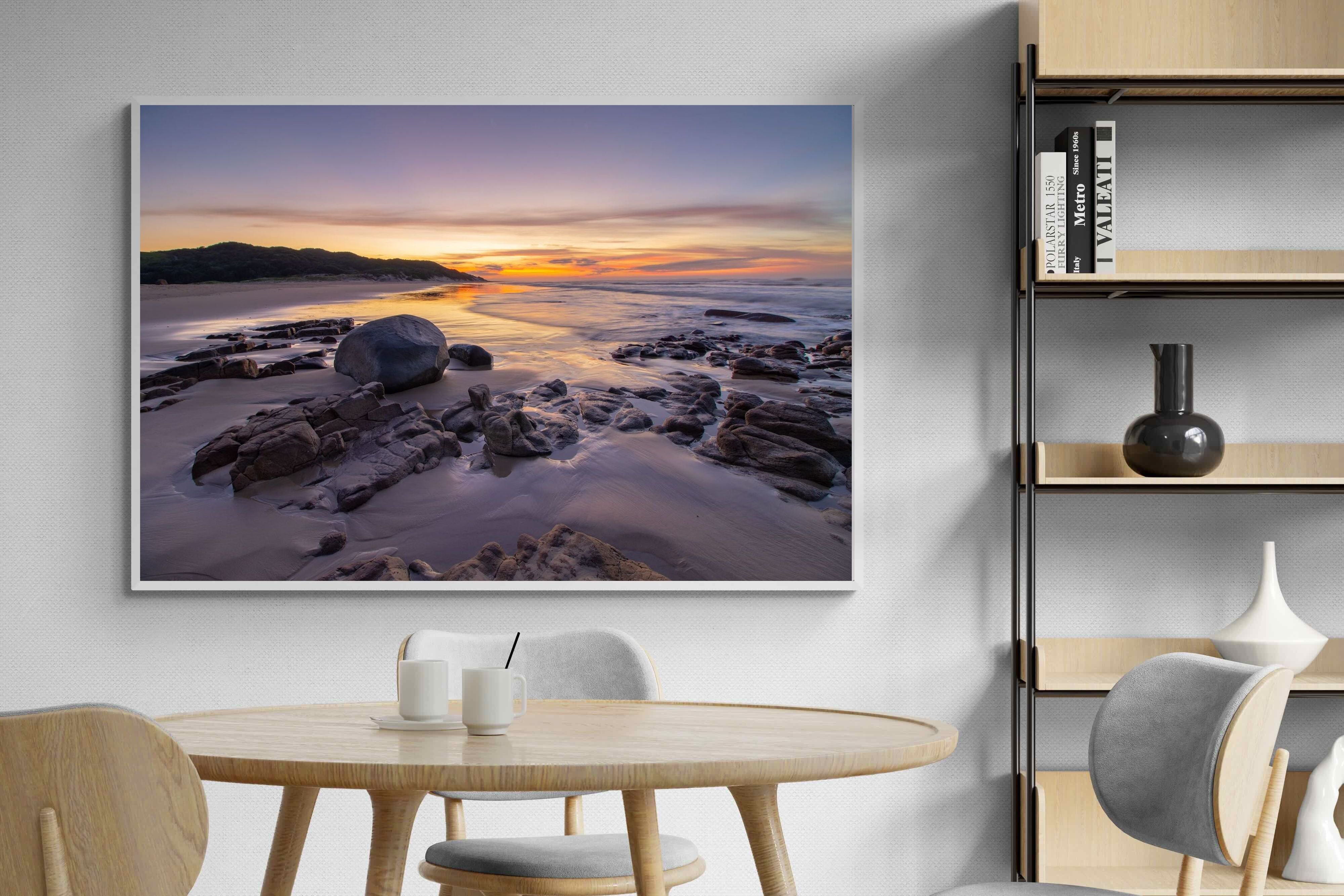 Soft dawn light washes over tidal rocks and smooth sands as the sun rises in gentle shades of apricot, lilac and gold. The foreground stones glisten with receding water, drawing the eye toward the glowing horizon and untouched Wild Coast shoreline. This calming seascape suits contemporary living rooms, minimalist interiors, coastal-themed bedrooms, or tranquil workspaces wanting a soothing, spacious artwork with natural colour harmony and quiet atmosphere.