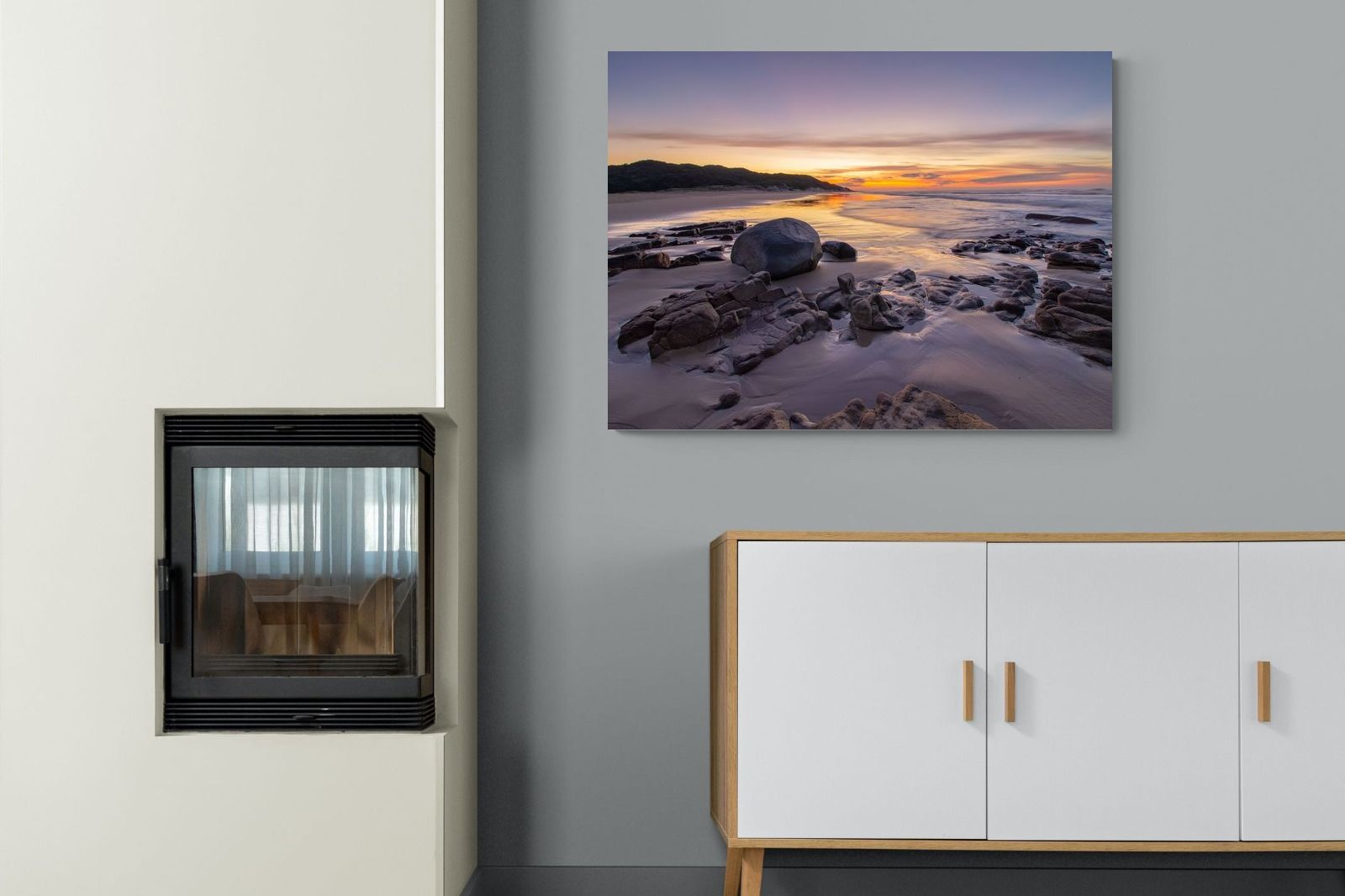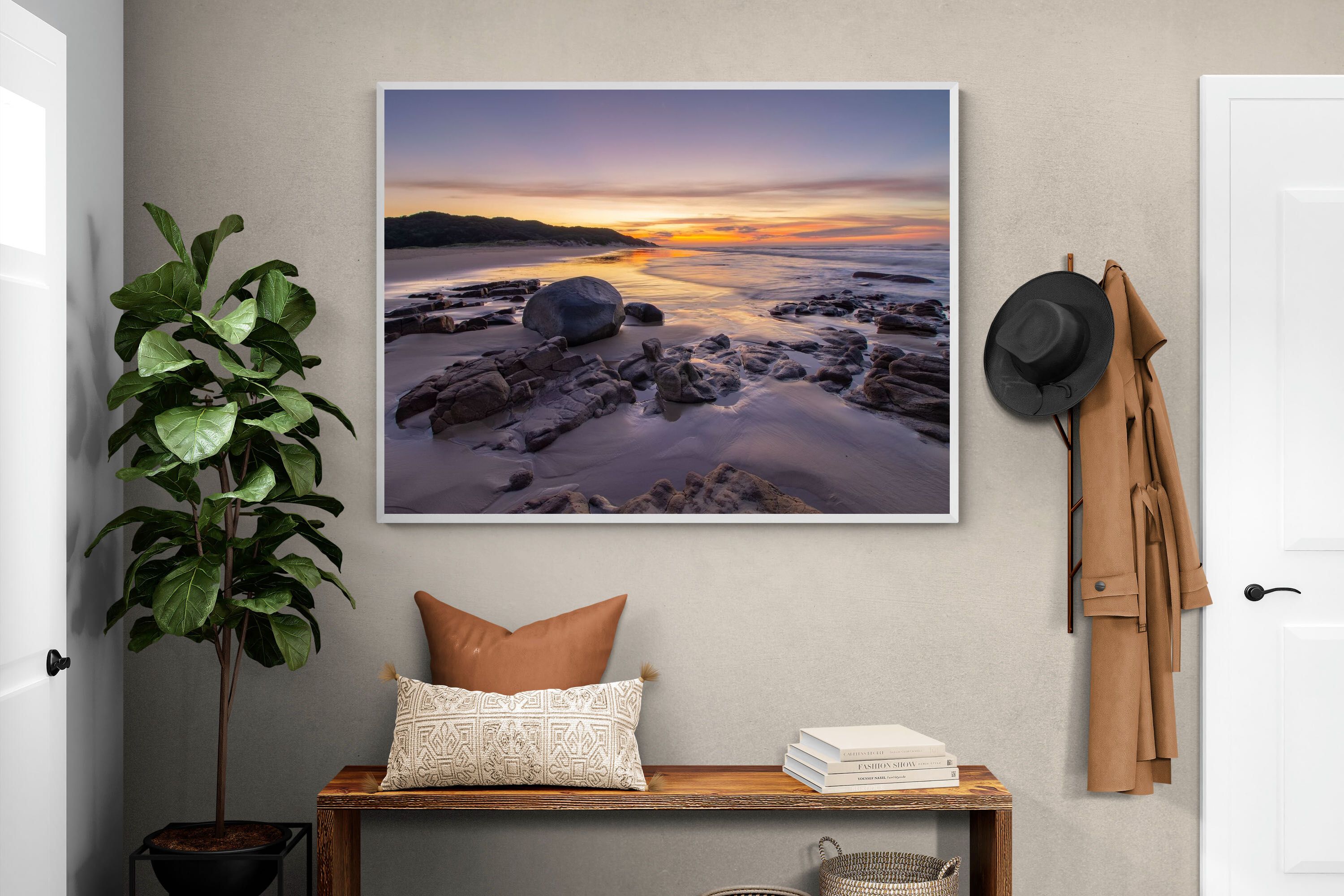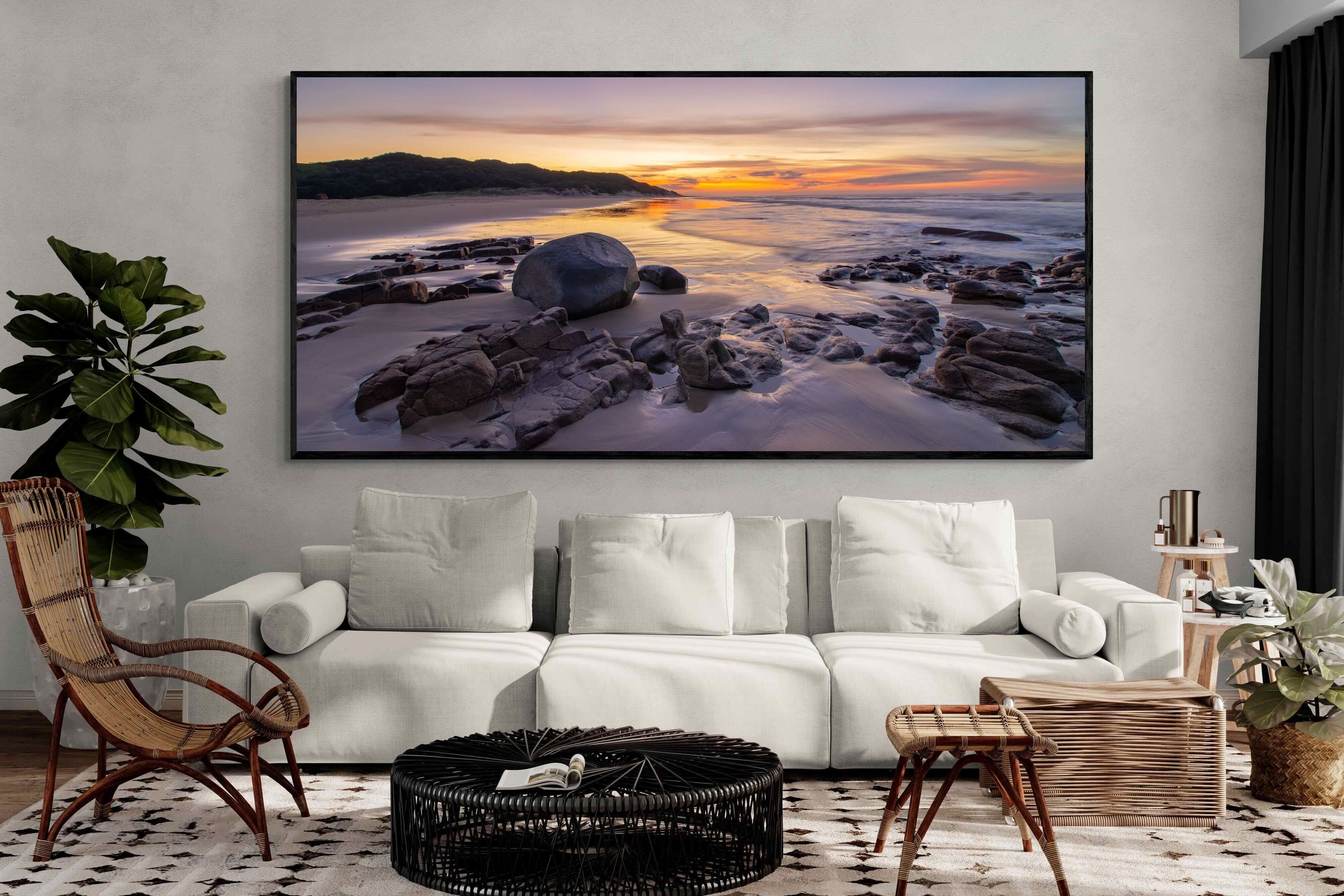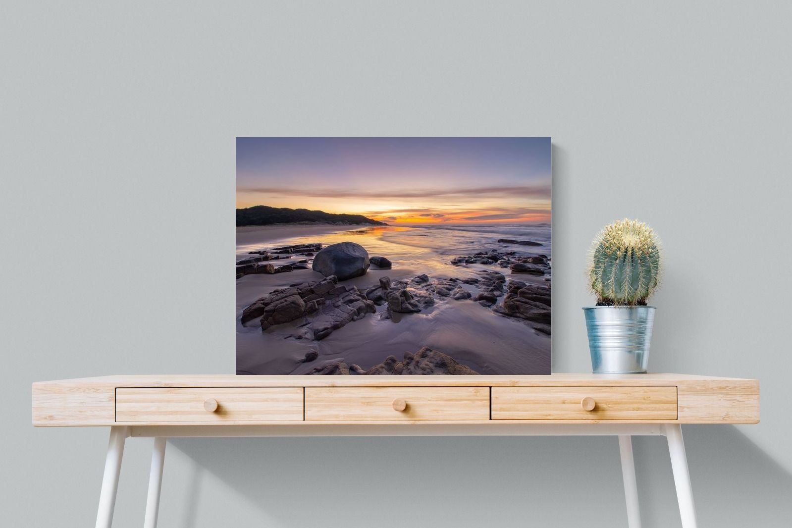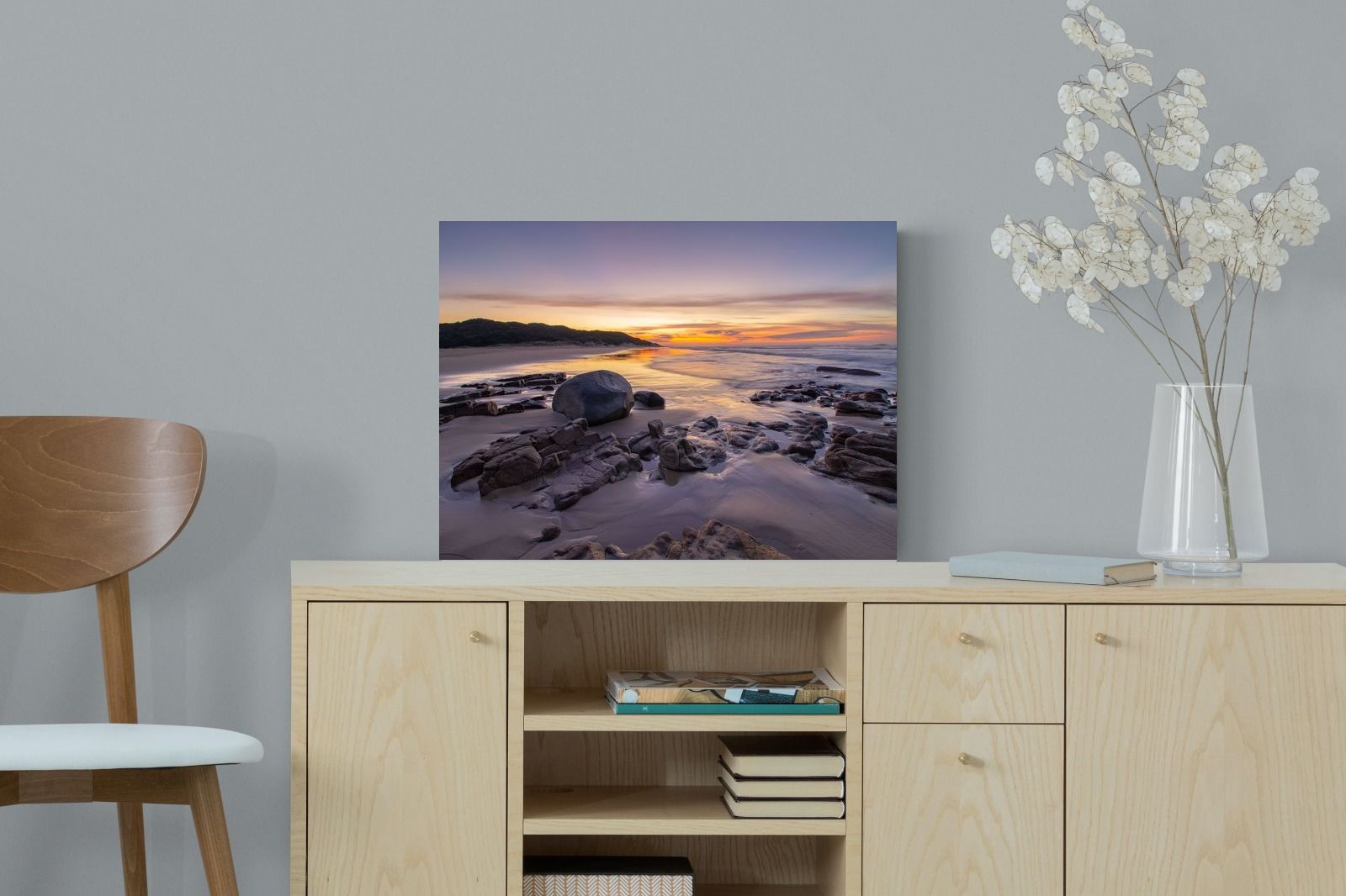 Soft dawn light washes over tidal rocks and smooth sands as the sun rises in gentle shades of apricot, lilac and gold. The foreground stones glisten with receding water, drawing the eye toward the glowing horizon and untouched Wild Coast shoreline. This calming seascape suits contemporary living rooms, minimalist interiors, coastal-themed bedrooms, or tranquil workspaces wanting a soothing, spacious artwork with natural colour harmony and quiet atmosphere.
