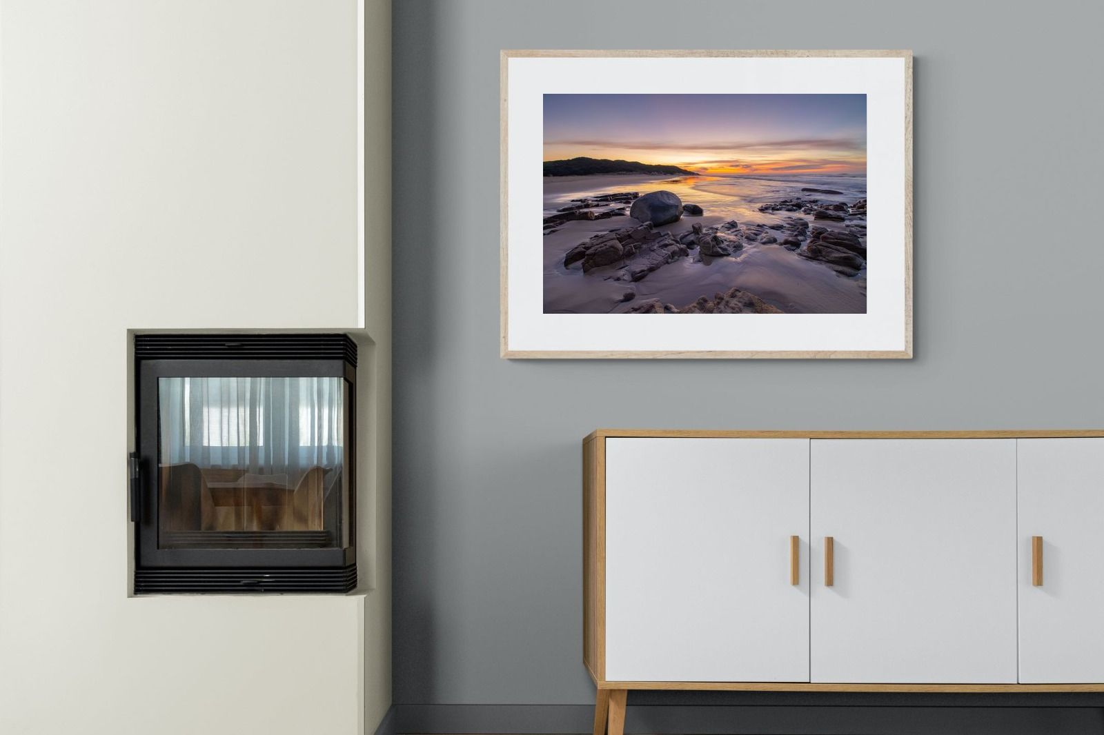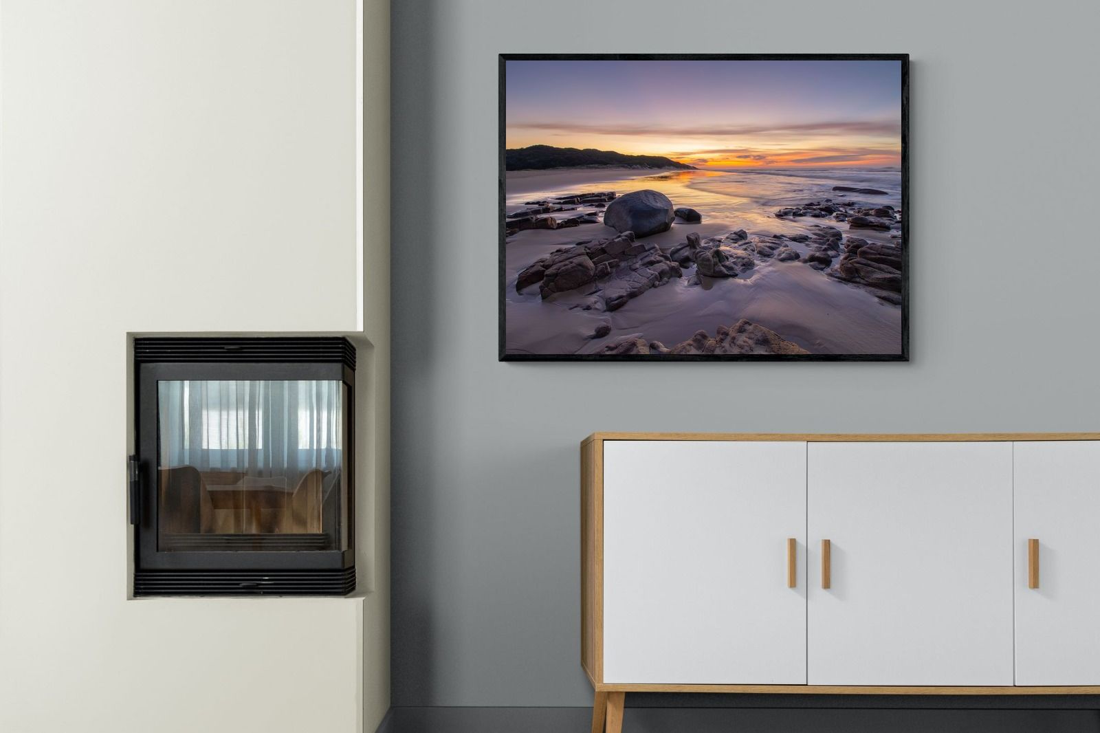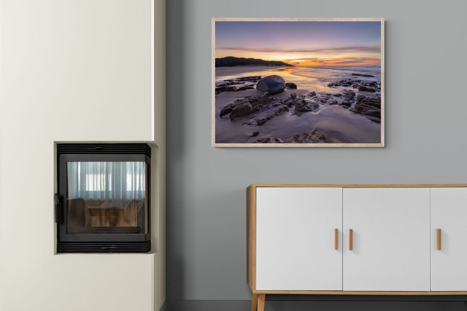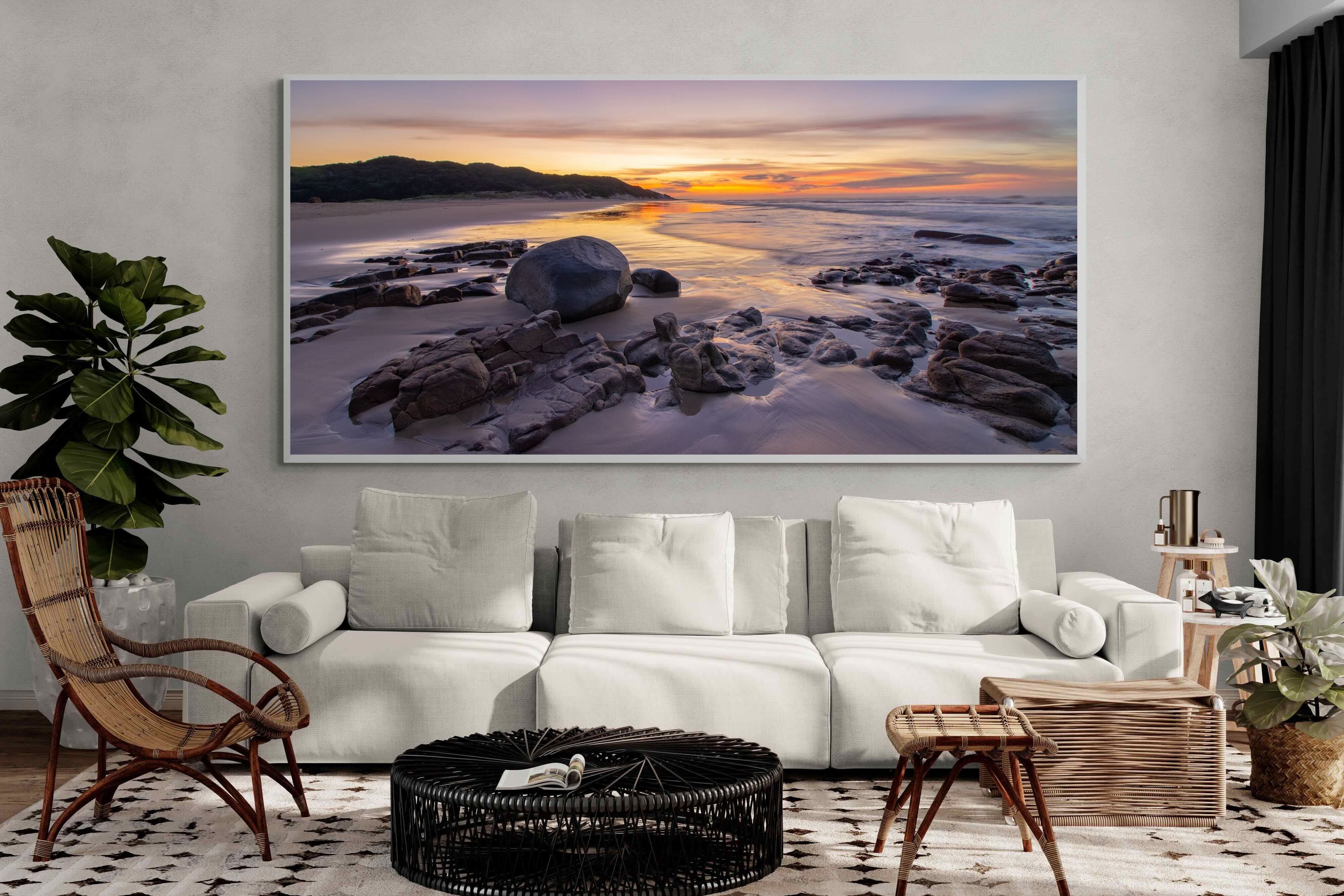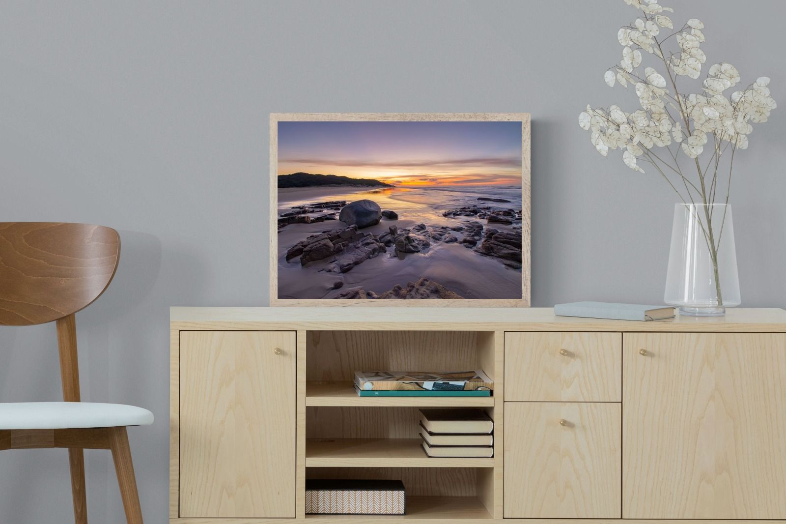 Soft dawn light washes over tidal rocks and smooth sands as the sun rises in gentle shades of apricot, lilac and gold. The foreground stones glisten with receding water, drawing the eye toward the glowing horizon and untouched Wild Coast shoreline. This calming seascape suits contemporary living rooms, minimalist interiors, coastal-themed bedrooms, or tranquil workspaces wanting a soothing, spacious artwork with natural colour harmony and quiet atmosphere.