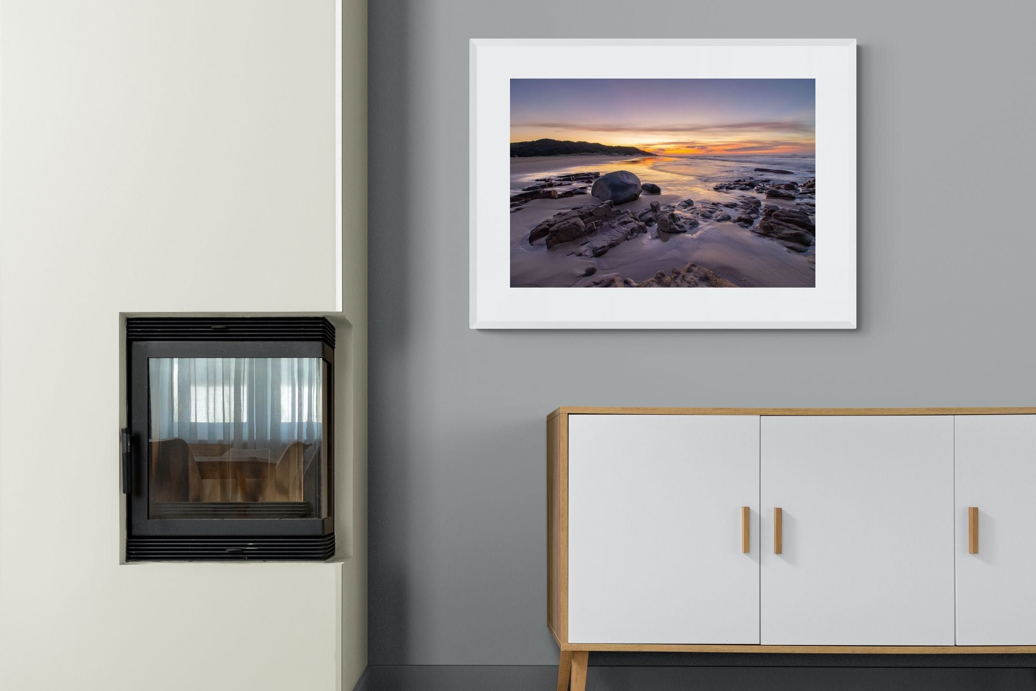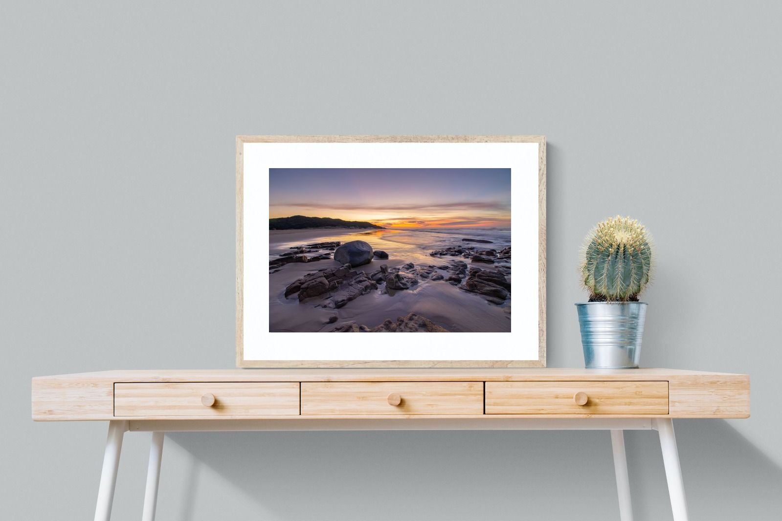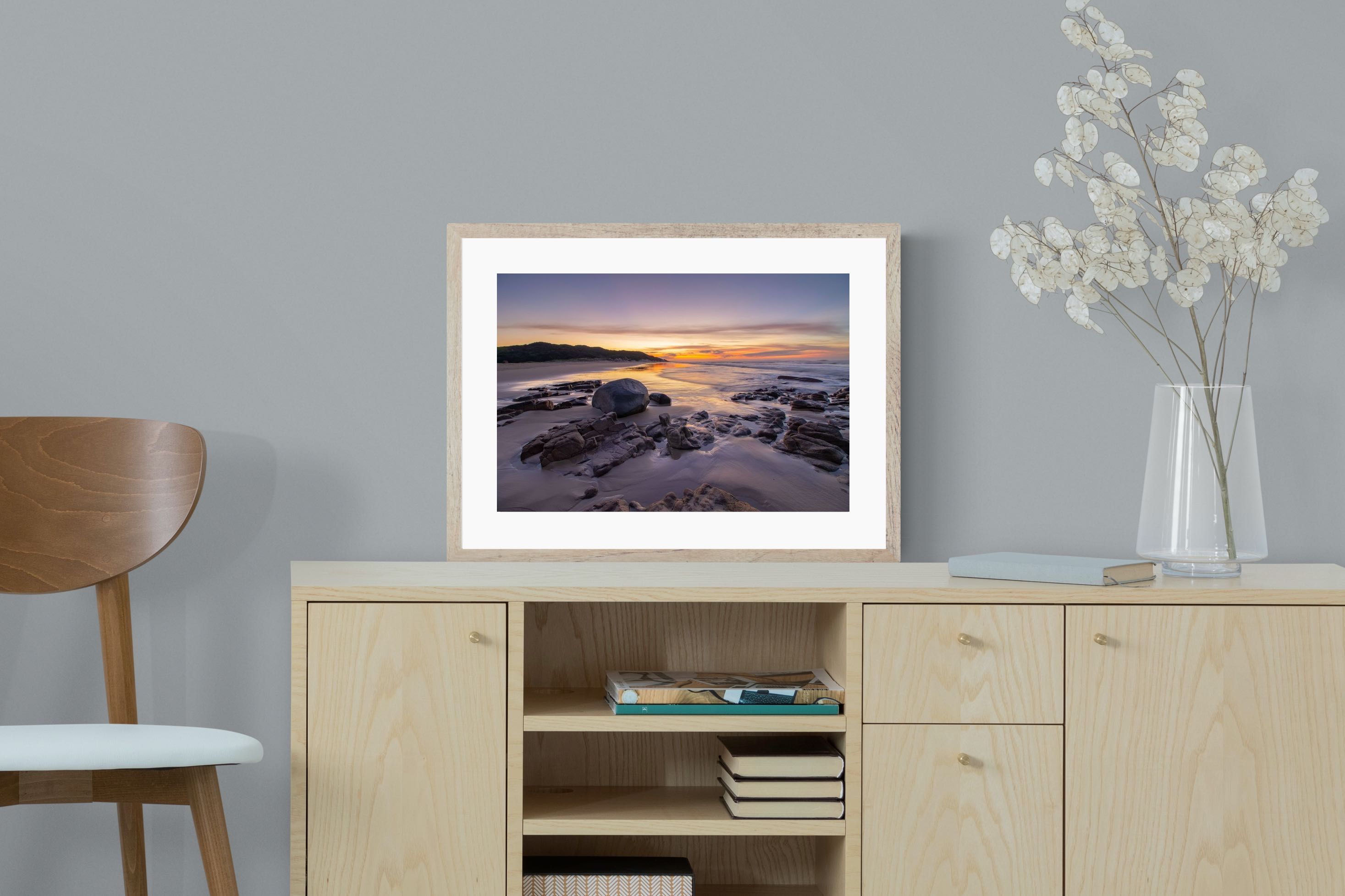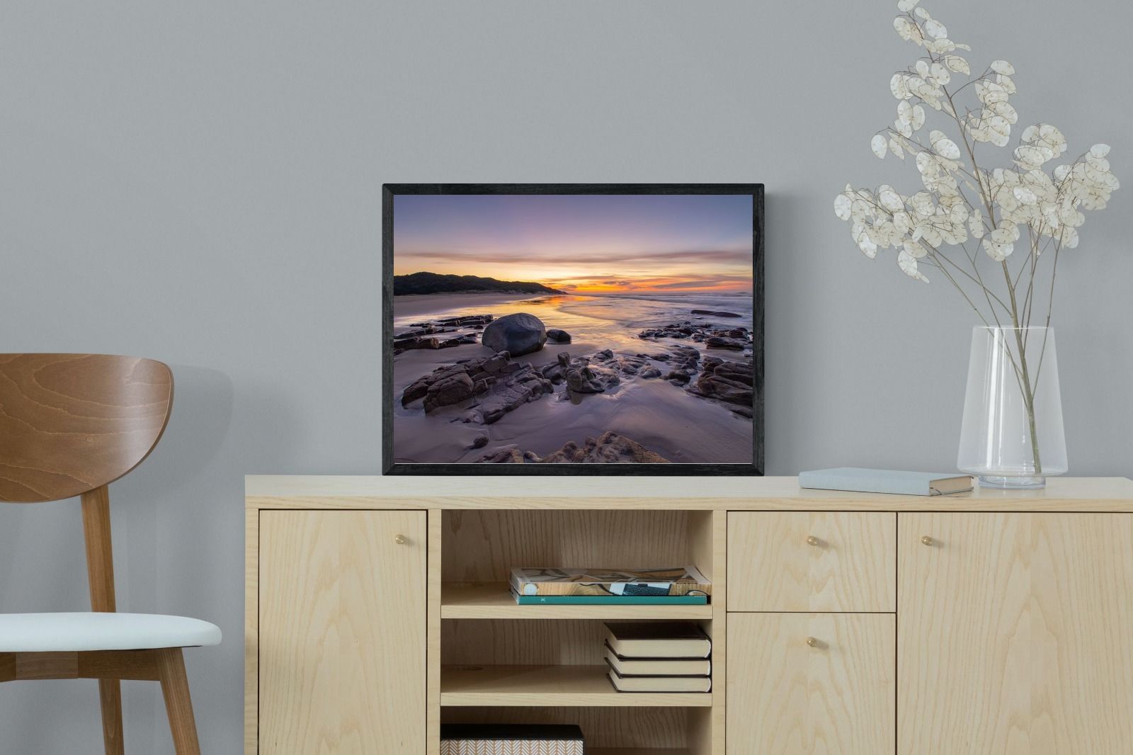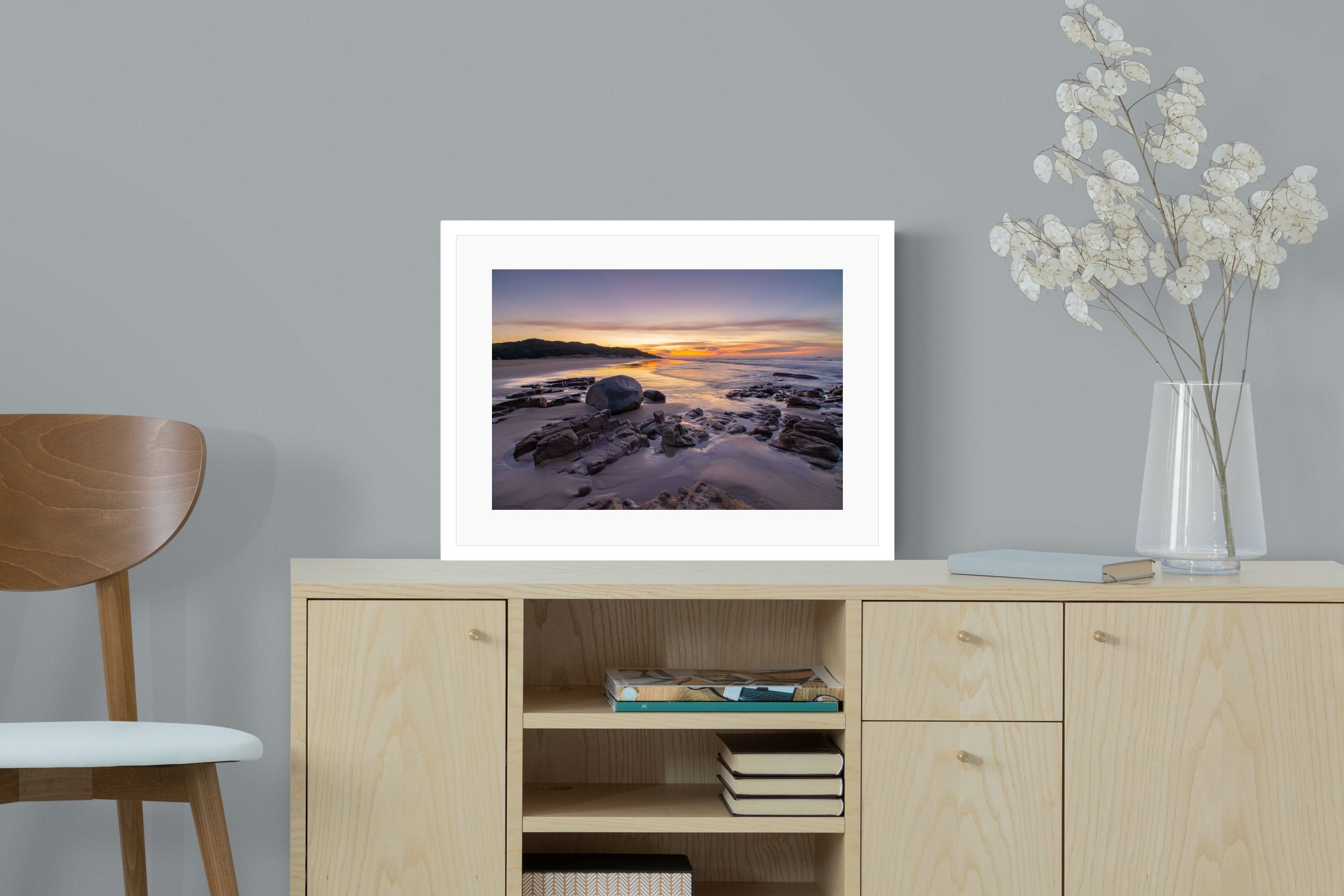 Soft dawn light washes over tidal rocks and smooth sands as the sun rises in gentle shades of apricot, lilac and gold. The foreground stones glisten with receding water, drawing the eye toward the glowing horizon and untouched Wild Coast shoreline. This calming seascape suits contemporary living rooms, minimalist interiors, coastal-themed bedrooms, or tranquil workspaces wanting a soothing, spacious artwork with natural colour harmony and quiet atmosphere.