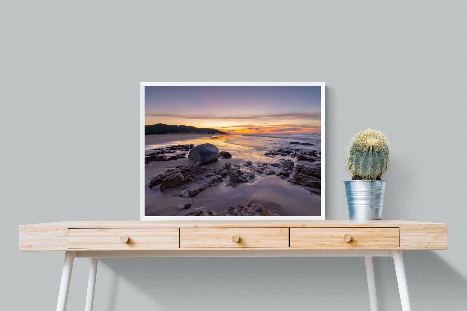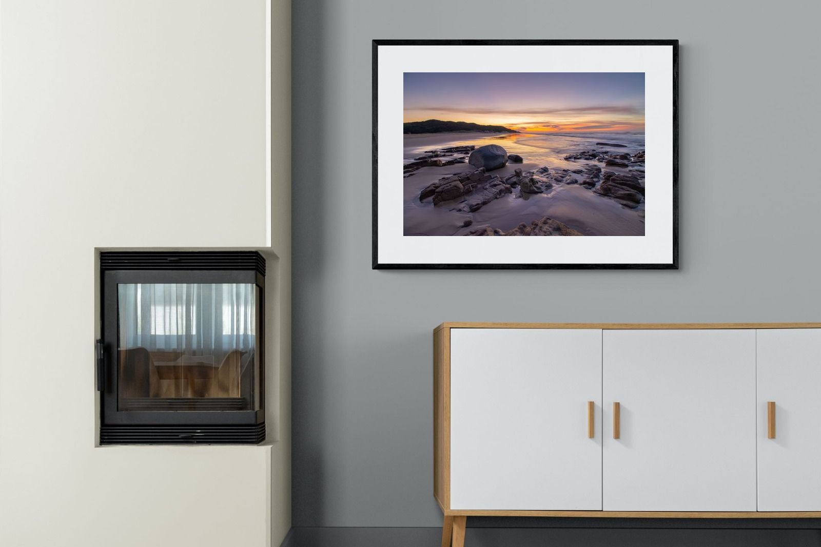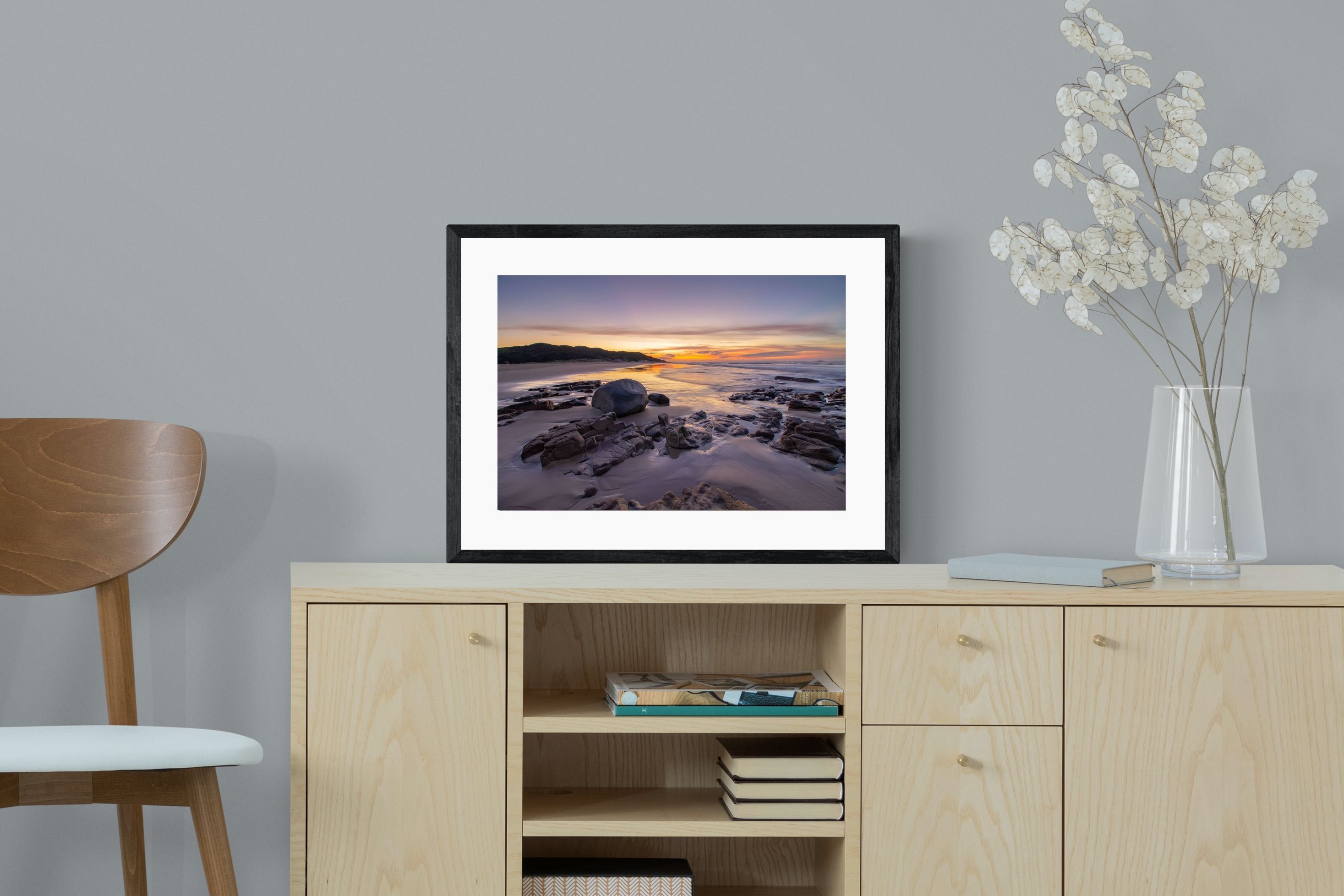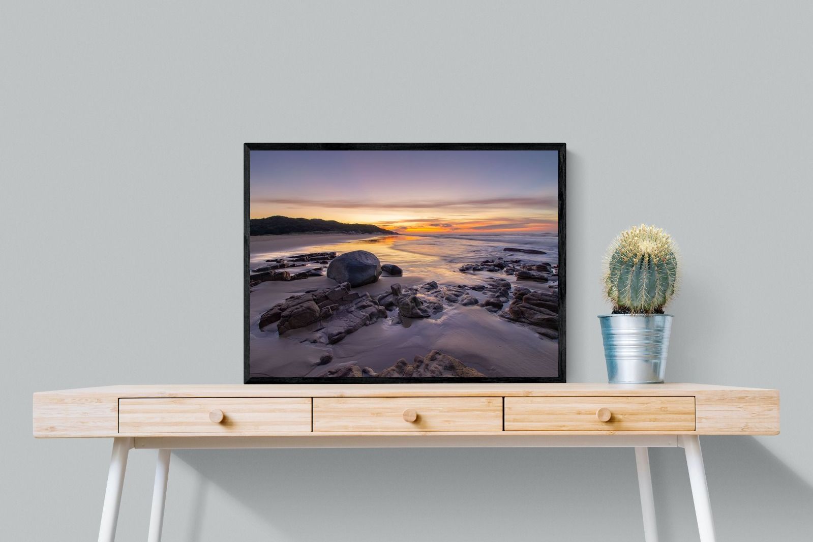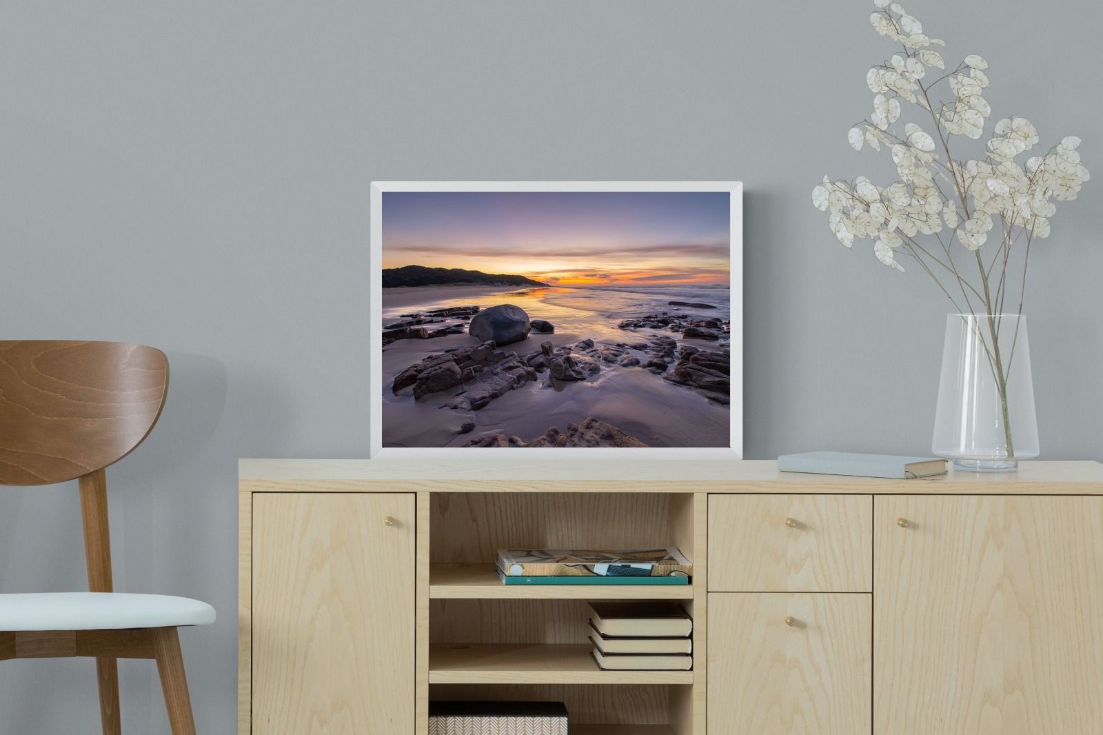 Soft dawn light washes over tidal rocks and smooth sands as the sun rises in gentle shades of apricot, lilac and gold. The foreground stones glisten with receding water, drawing the eye toward the glowing horizon and untouched Wild Coast shoreline. This calming seascape suits contemporary living rooms, minimalist interiors, coastal-themed bedrooms, or tranquil workspaces wanting a soothing, spacious artwork with natural colour harmony and quiet atmosphere.