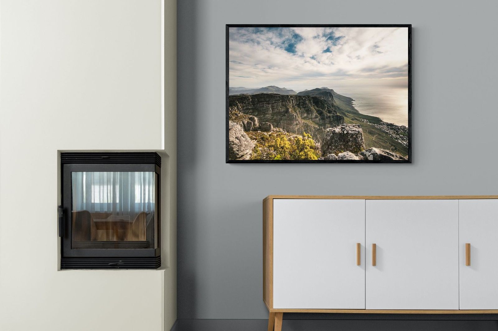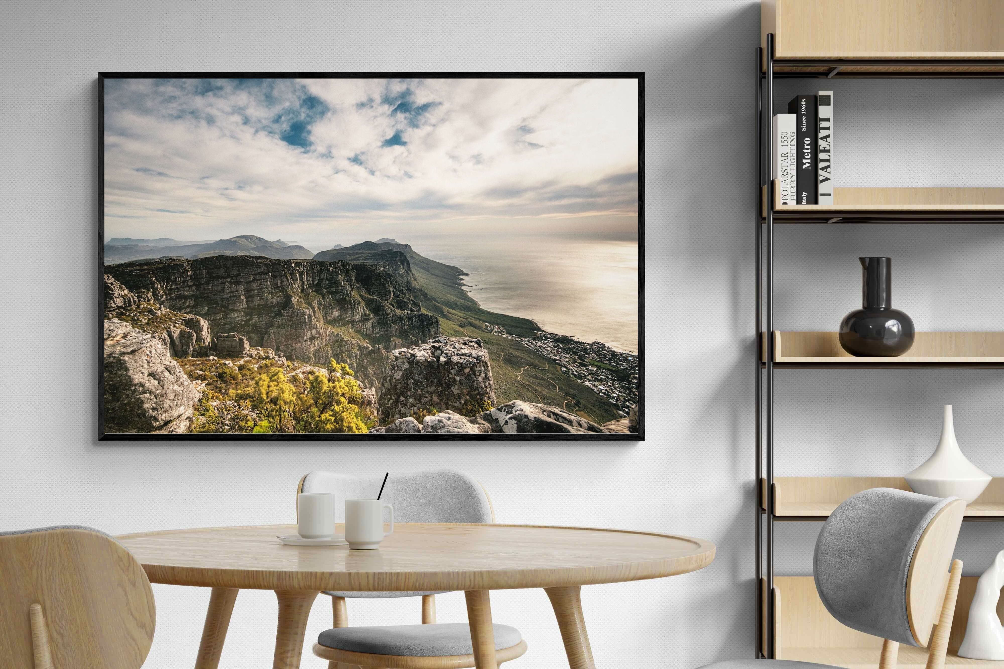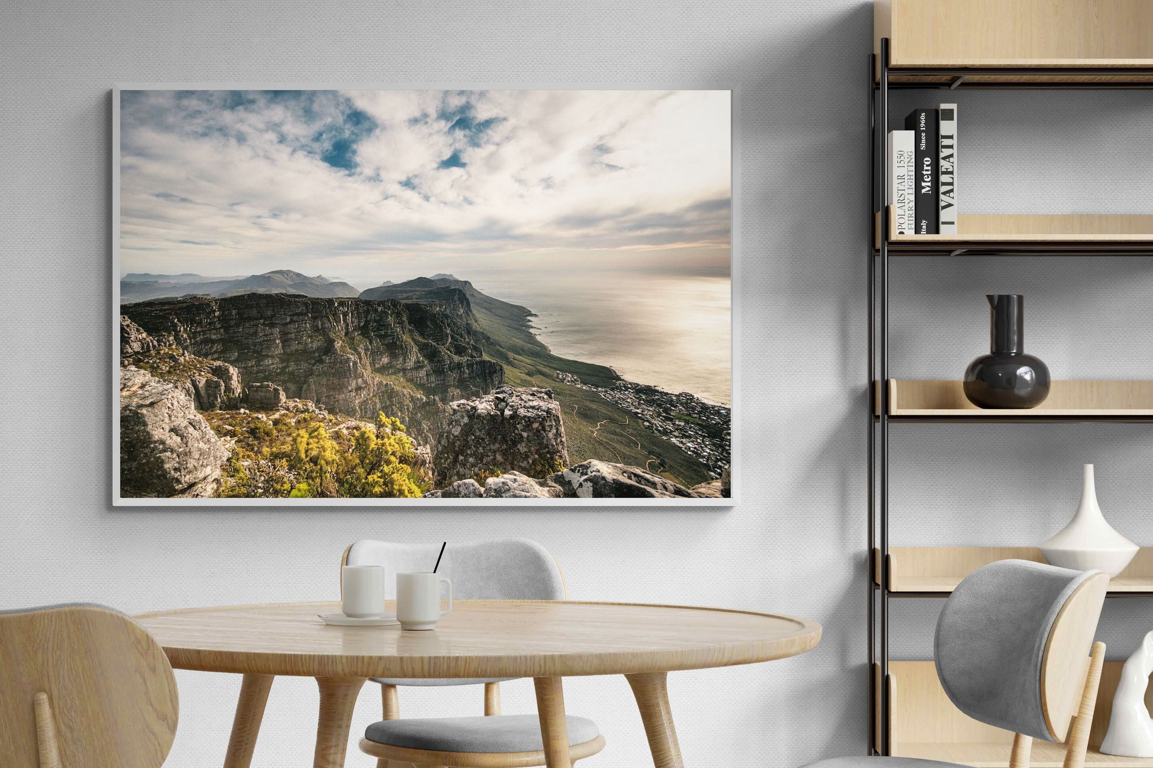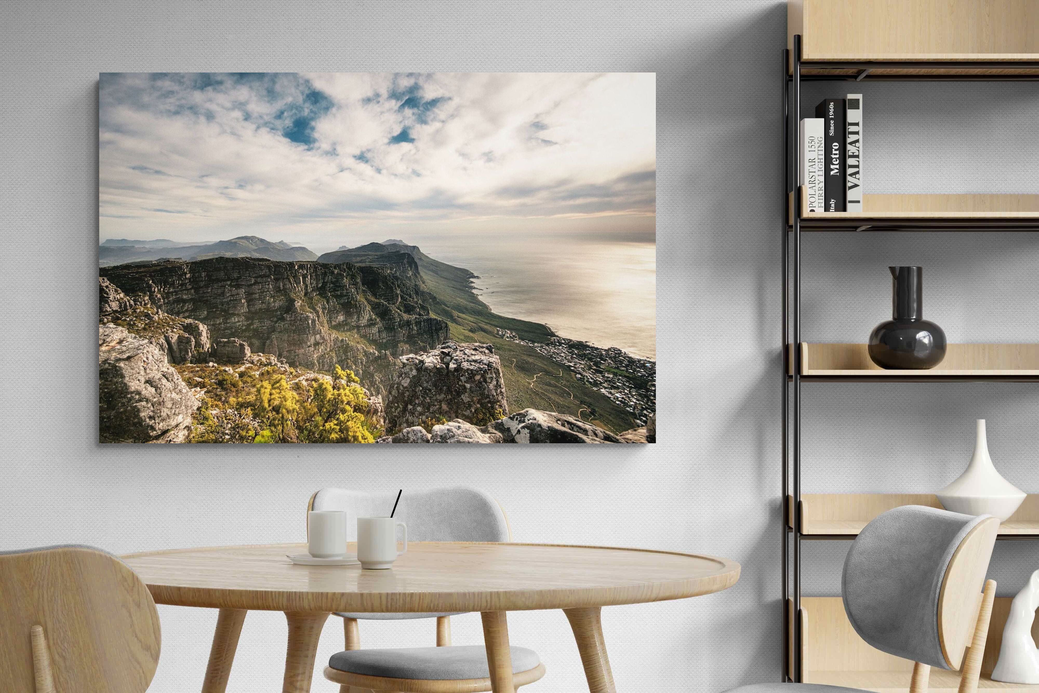 Showcasing the iconic cliffs of Cape Town’s Twelve Apostles, this sweeping aerial landscape is a tribute to South Africa’s rugged coast. Bathed in natural light with rolling hills and ocean below, it brings a sense of vastness and freedom. Ideal for living rooms or offices, this print inspires adventure and appreciation for dramatic scenery. A perfect choice for nature lovers or Cape Town enthusiasts.
