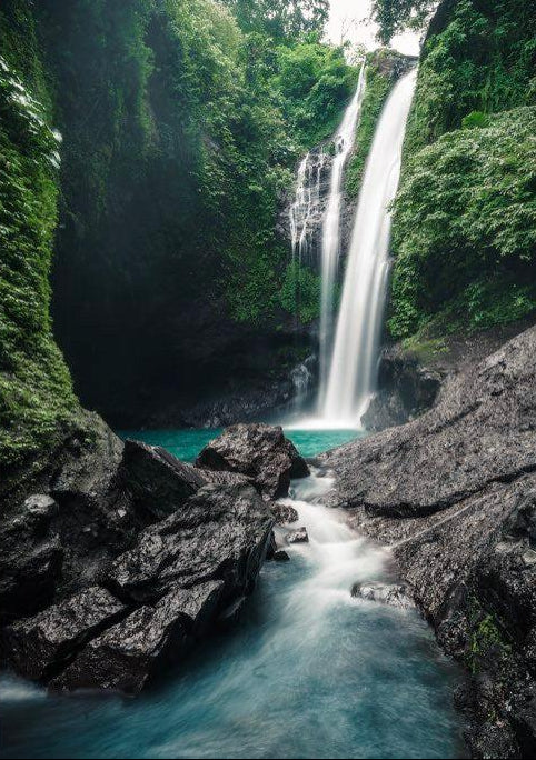 A secluded waterfall cascades into a clear pool surrounded by dense greenery and dark rock formations. The contrast between flowing water and rugged terrain creates a powerful yet calming composition. Ideal for bedrooms, bathrooms, or nature-inspired interiors, it brings a sense of depth and escape. Its rich tones and natural movement make it a compelling piece for spaces that favour organic textures and a connection to untouched landscapes.