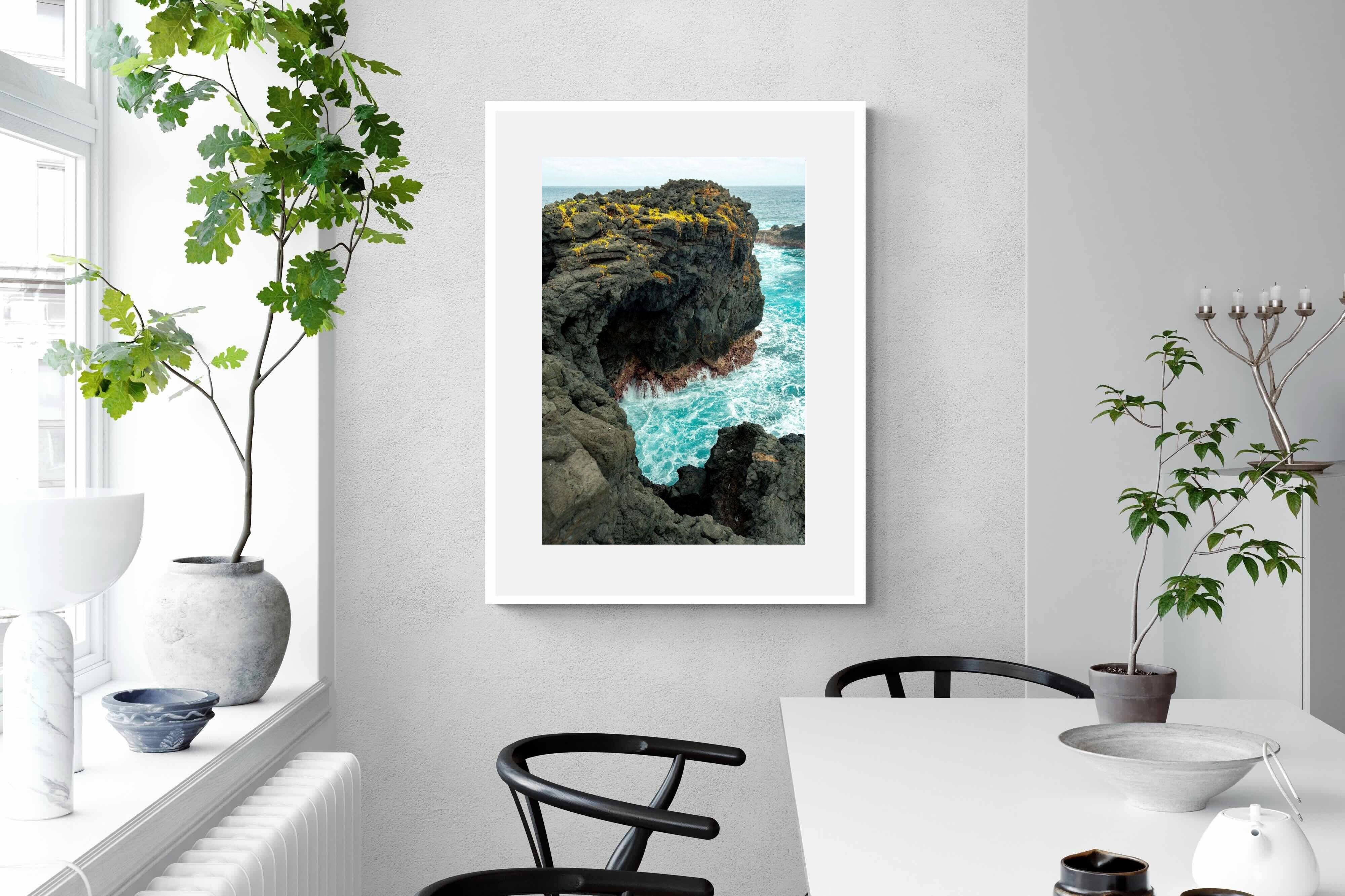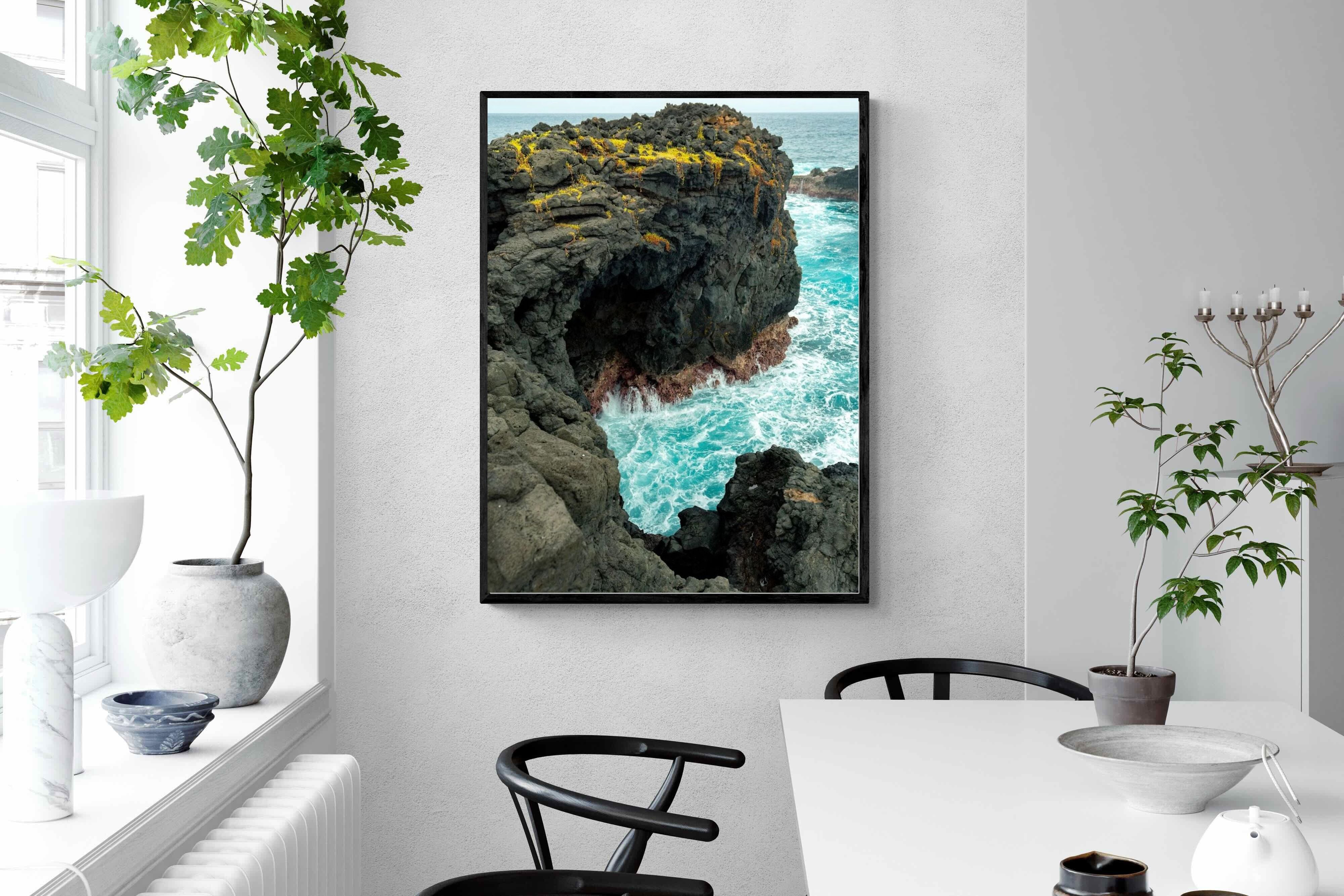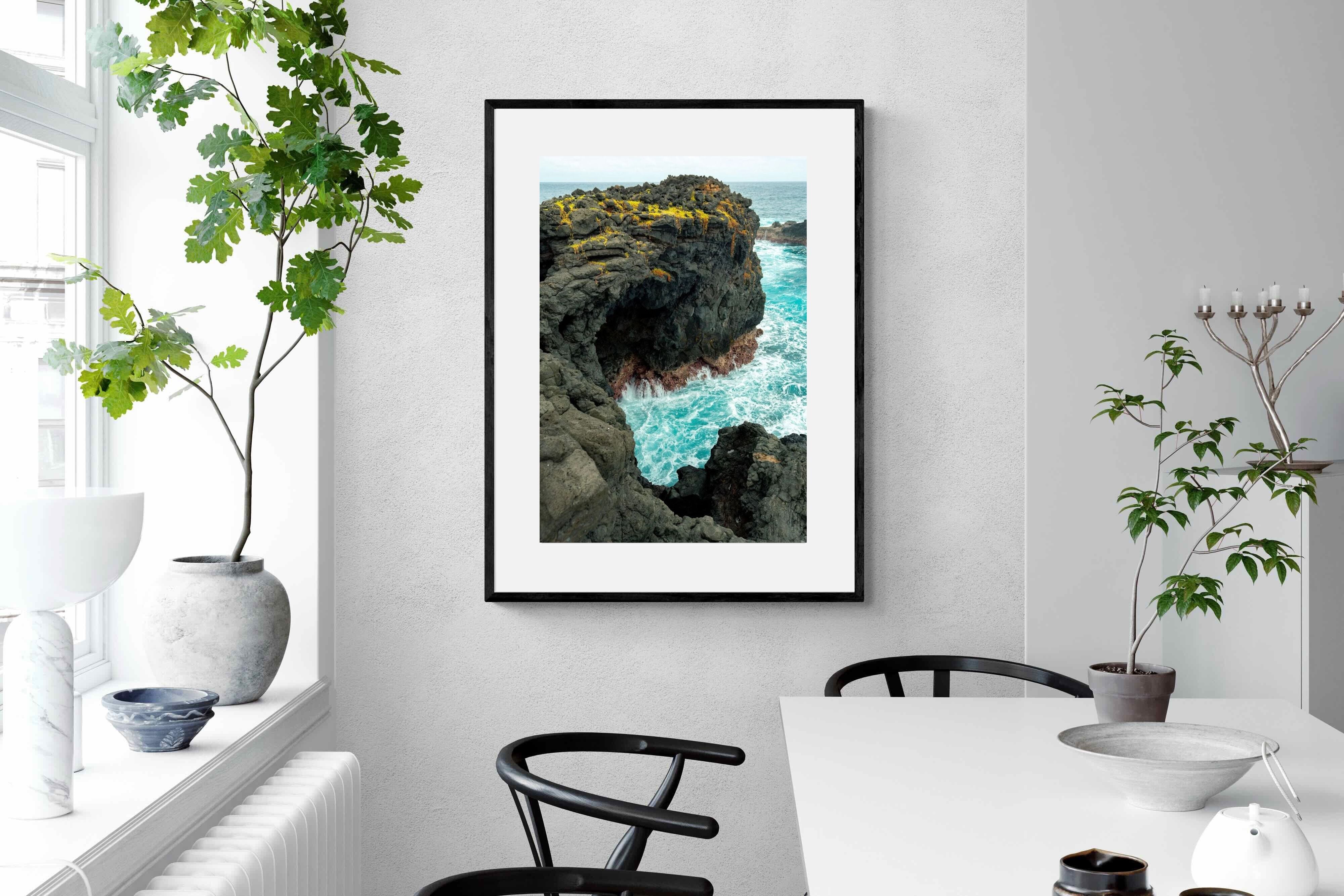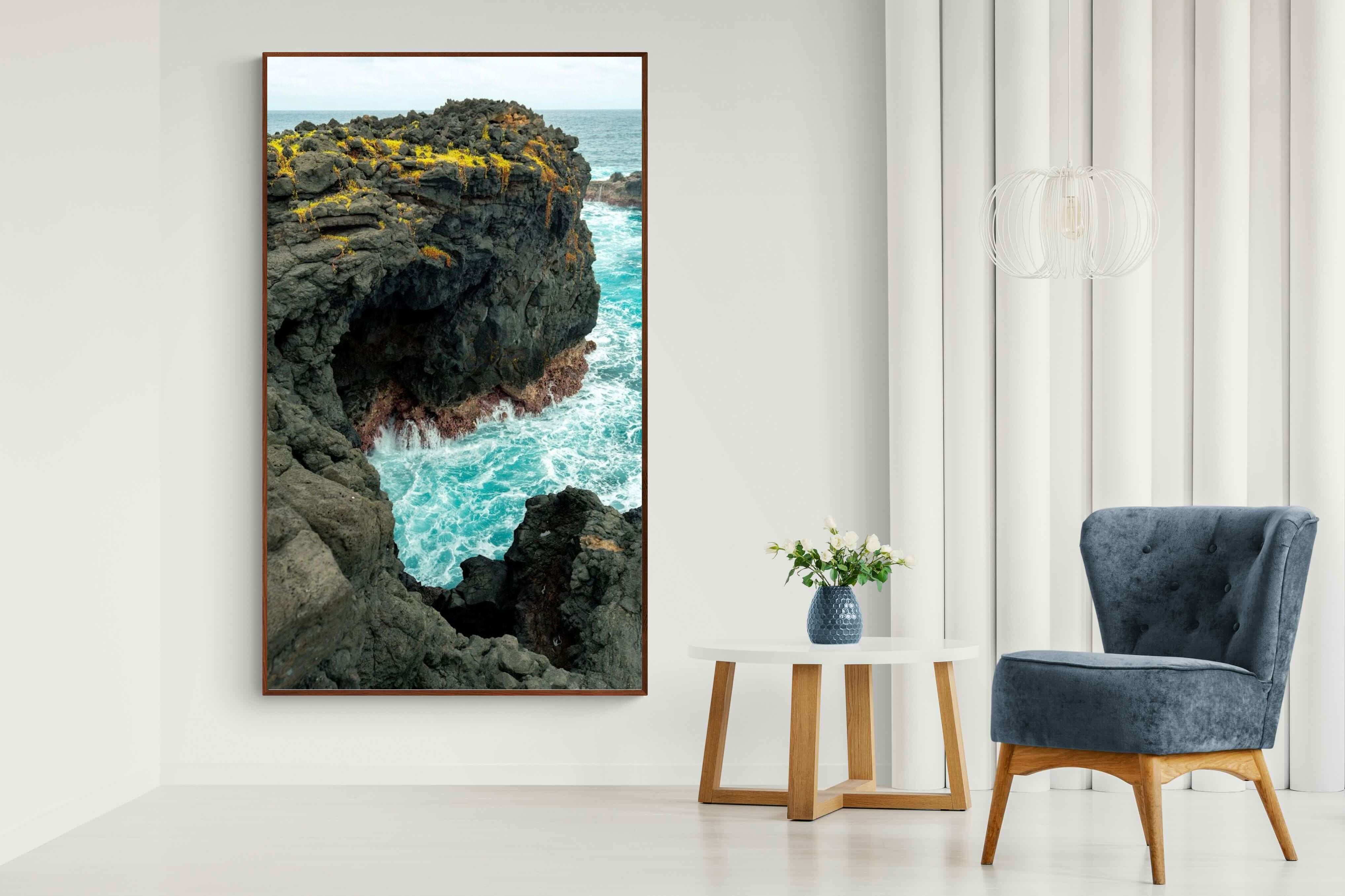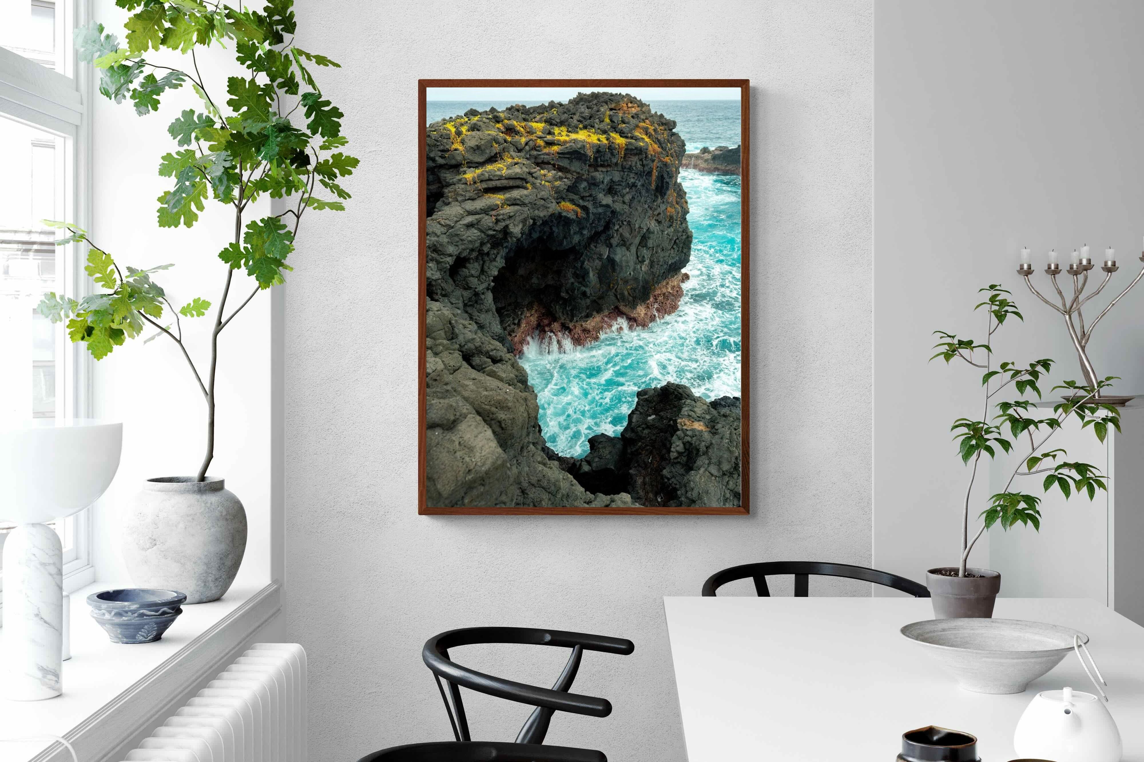 Powerful turquoise waves crash against rugged volcanic cliffs along the wild coastline of São Tomé and Príncipe. Dark rock formations rise sharply above the Atlantic while bright coastal vegetation clings to the stone, adding vivid contrast to the scene. The photograph captures the raw beauty and geological drama of this remote island landscape. A striking wall art piece that brings natural energy and adventurous coastal character to contemporary interiors.
